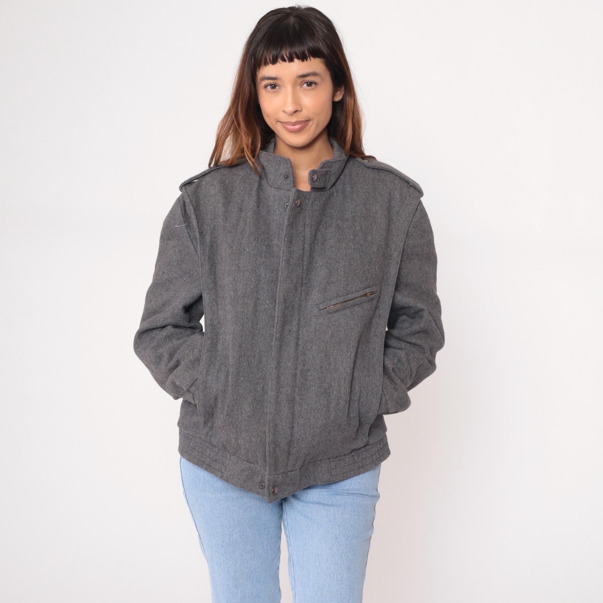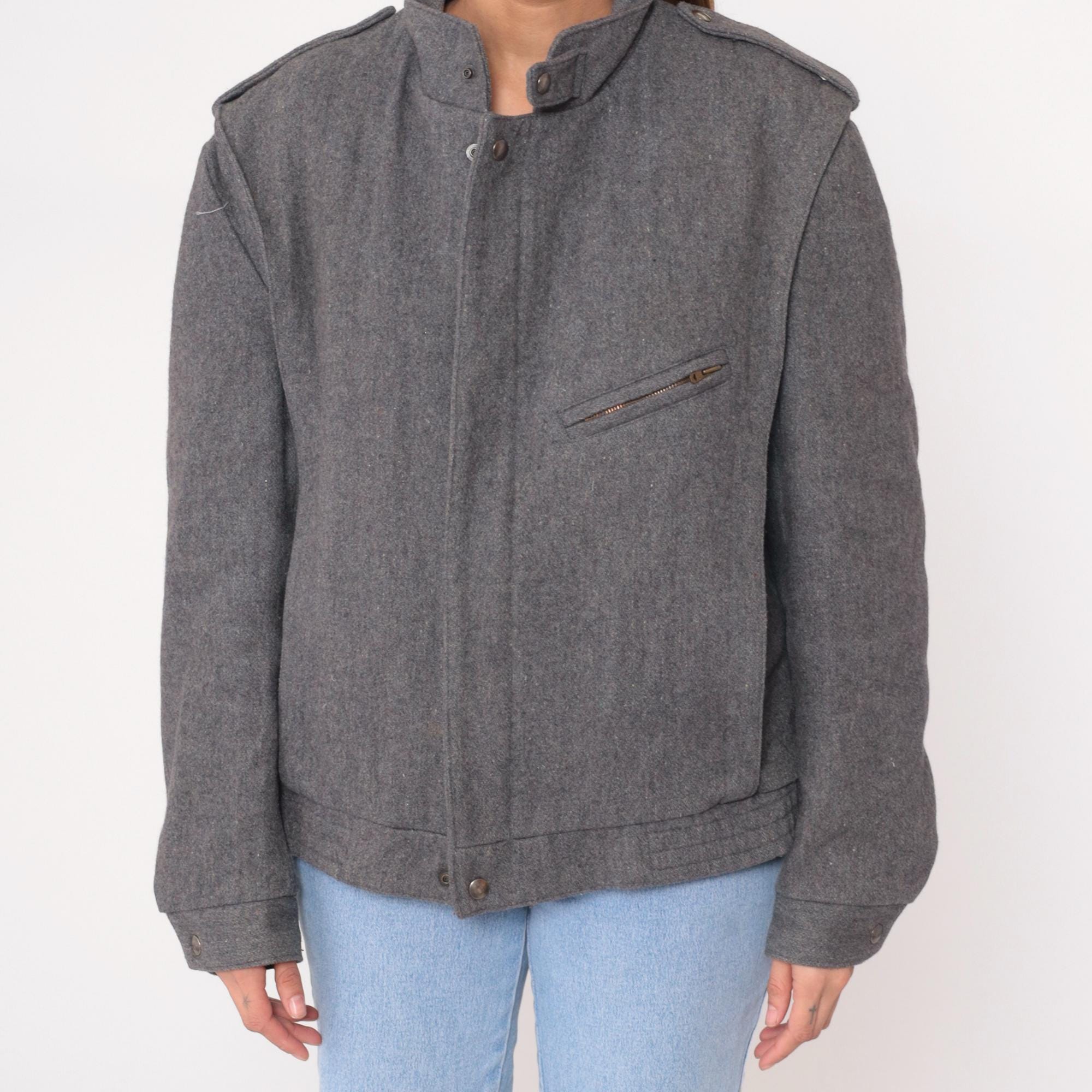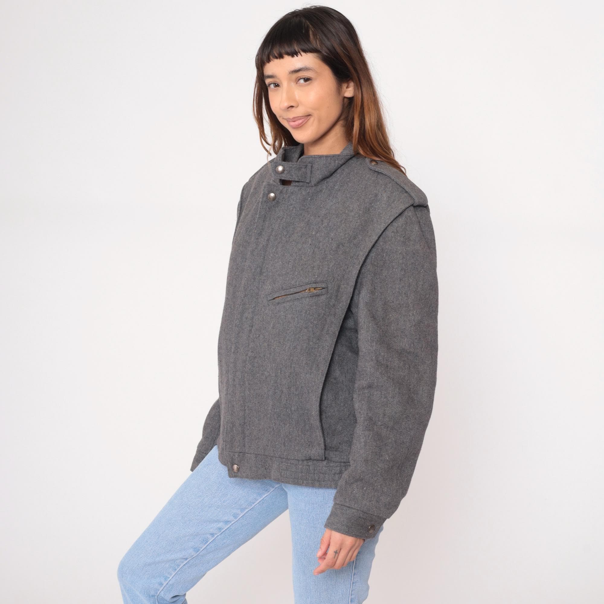 80s gray jacket from Leather Tigre with standing snap collar, front zipper closure concealed by snap button placket, and shoulder epaulettes. Diagonal zippered chest pocket, long sleeves, boxy hip-length cut. Wool outer with quilted lining.