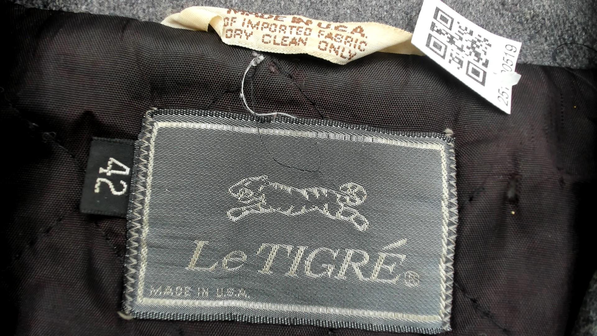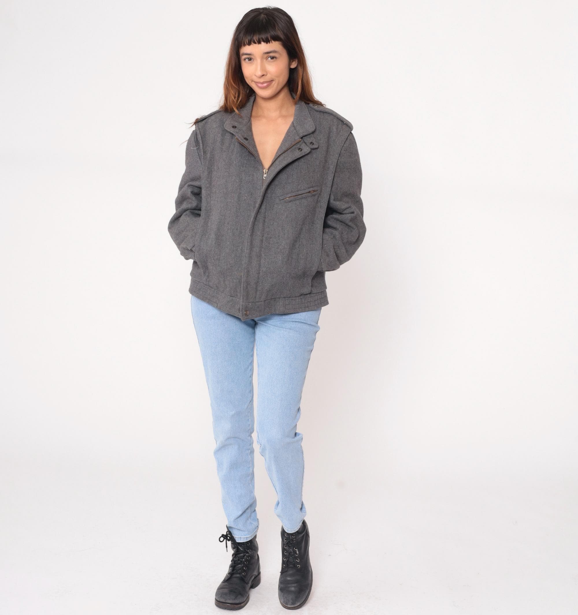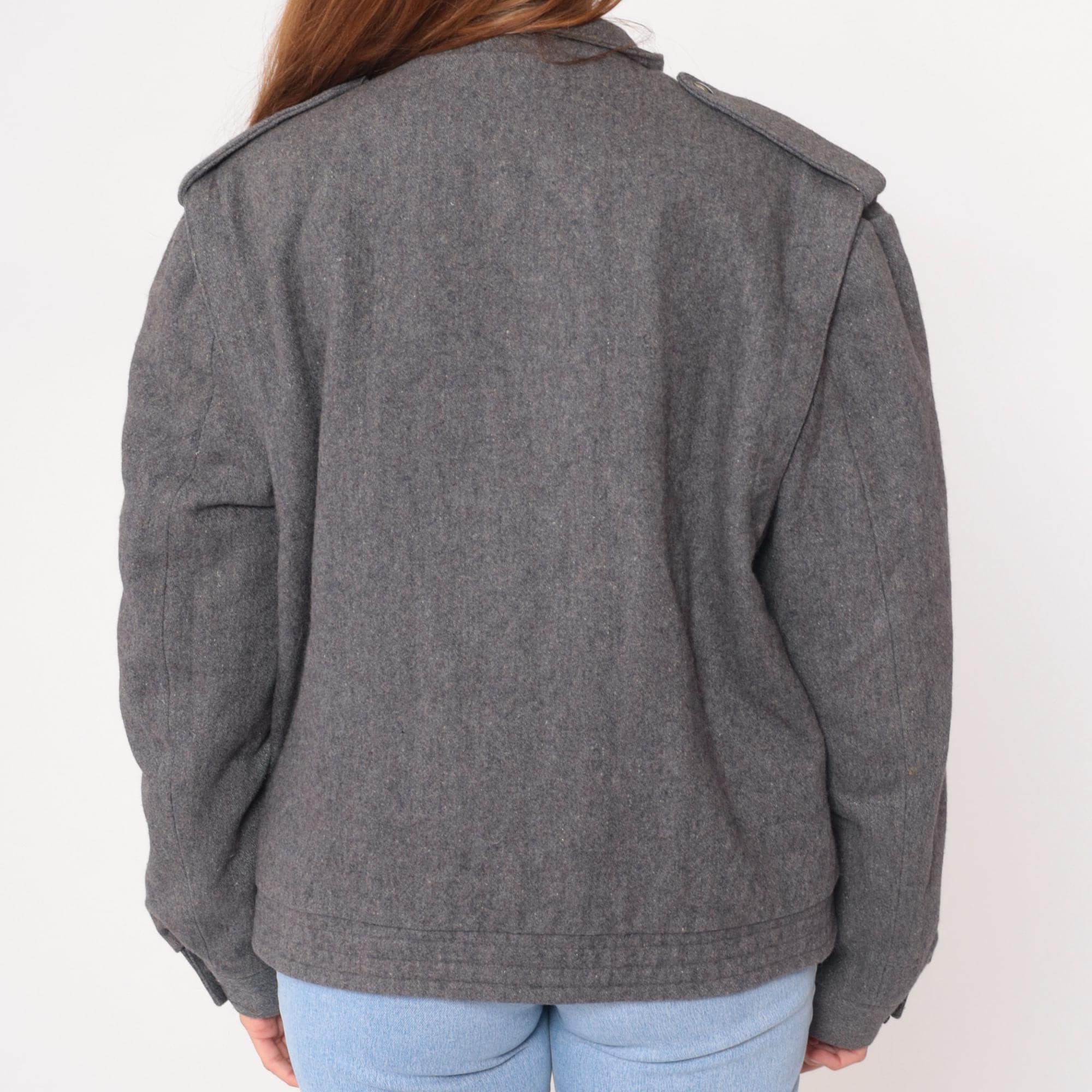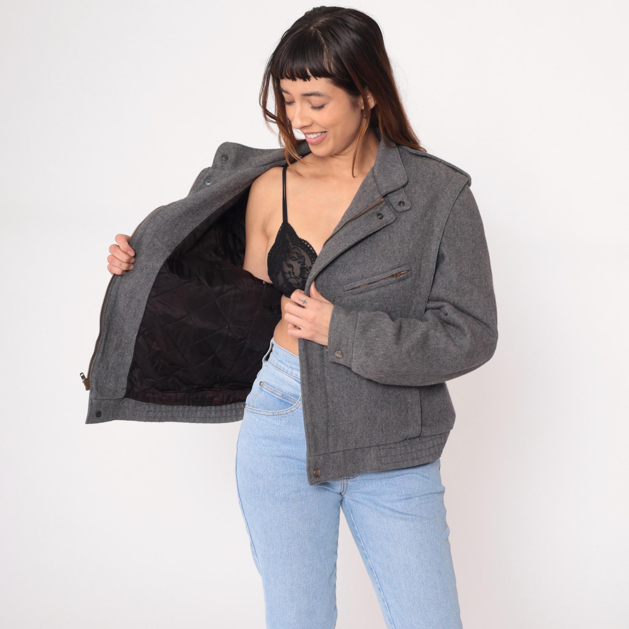 80s gray jacket from Leather Tigre with standing snap collar, front zipper closure concealed by snap button placket, and shoulder epaulettes. Diagonal zippered chest pocket, long sleeves, boxy hip-length cut. Wool outer with quilted lining.