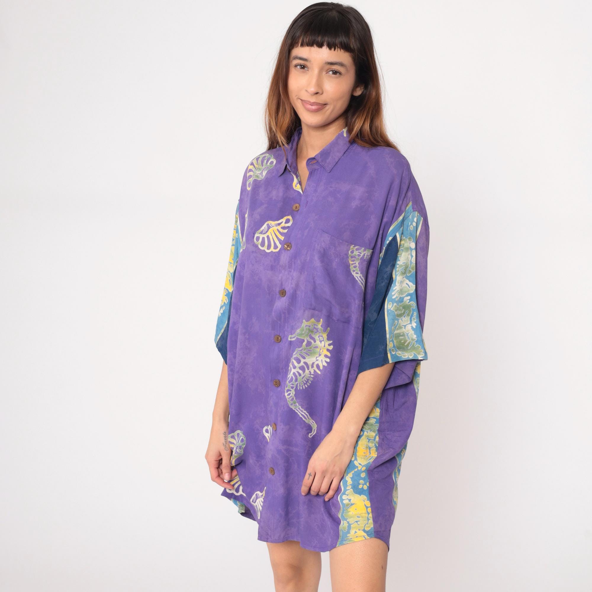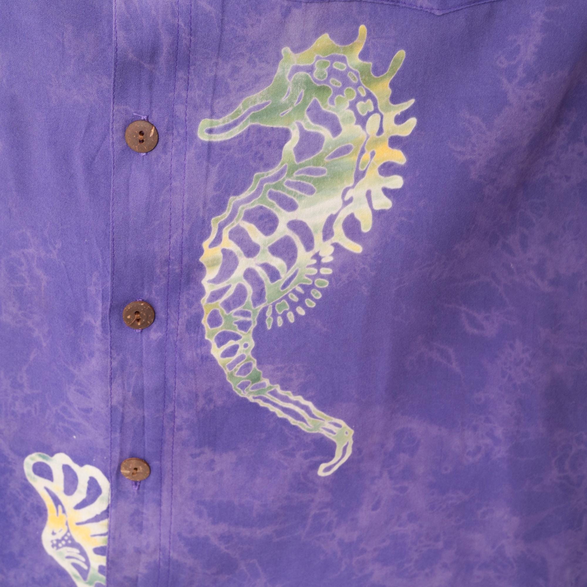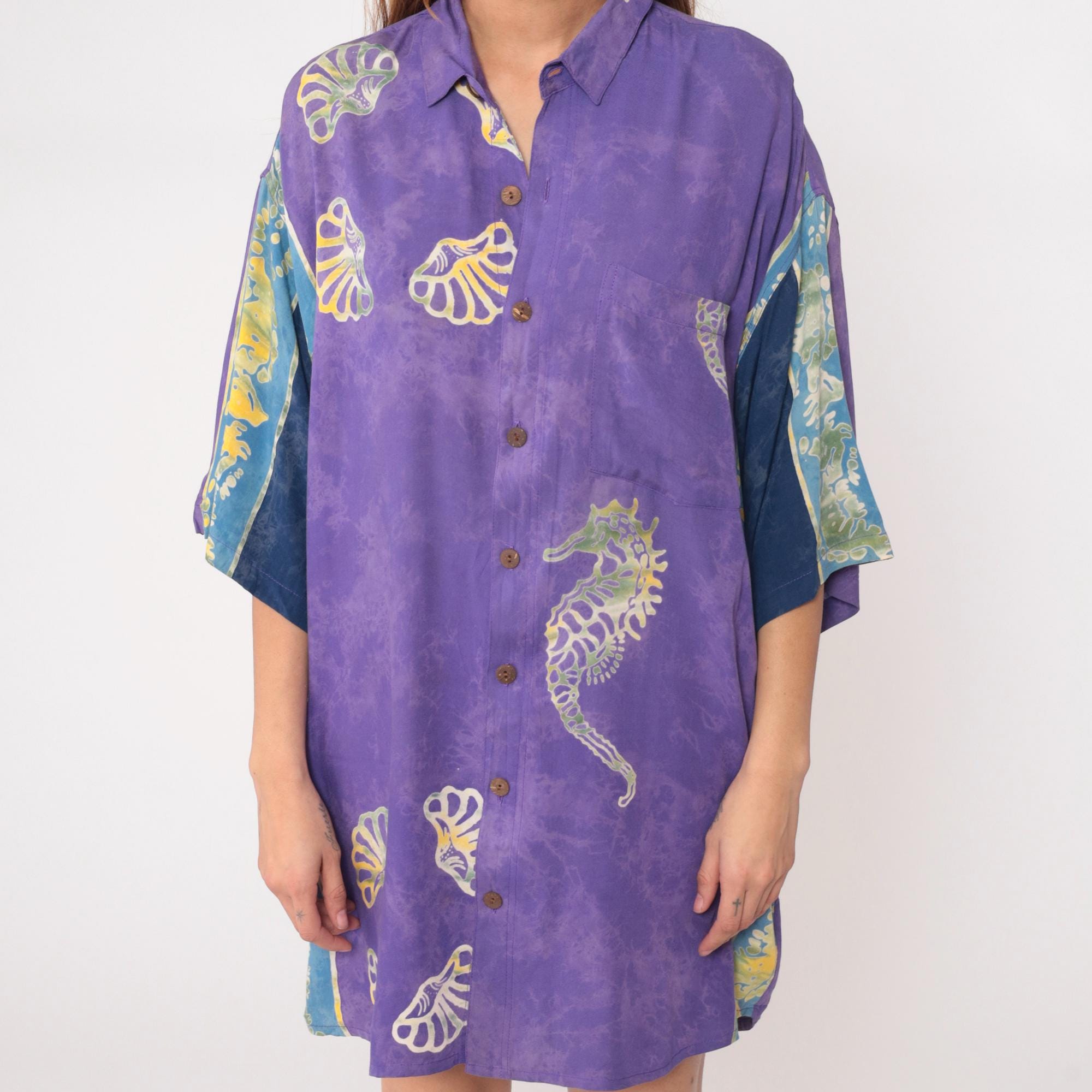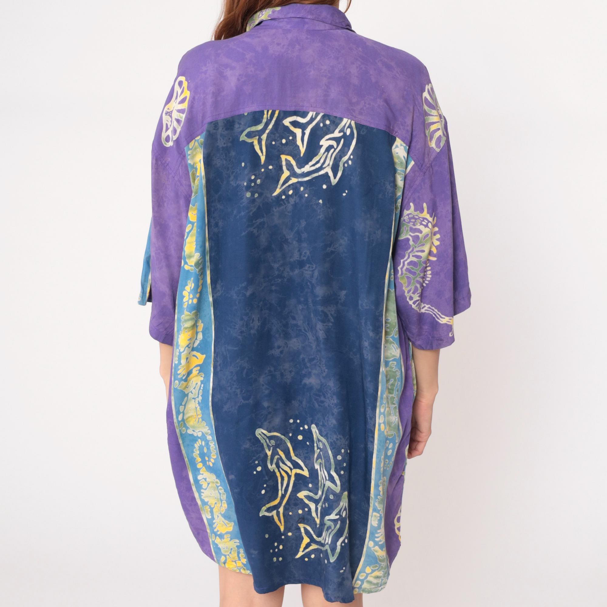 Y2K purple and navy tunic shirt from Palm Hawaii with batik-style sea life print across the fabric, including dolphins, seahorse, and shells in yellow and pale blue. Button front closure with collar and short kimono-style sleeves. Colorblock construction with purple front panel and navy side and back panels.