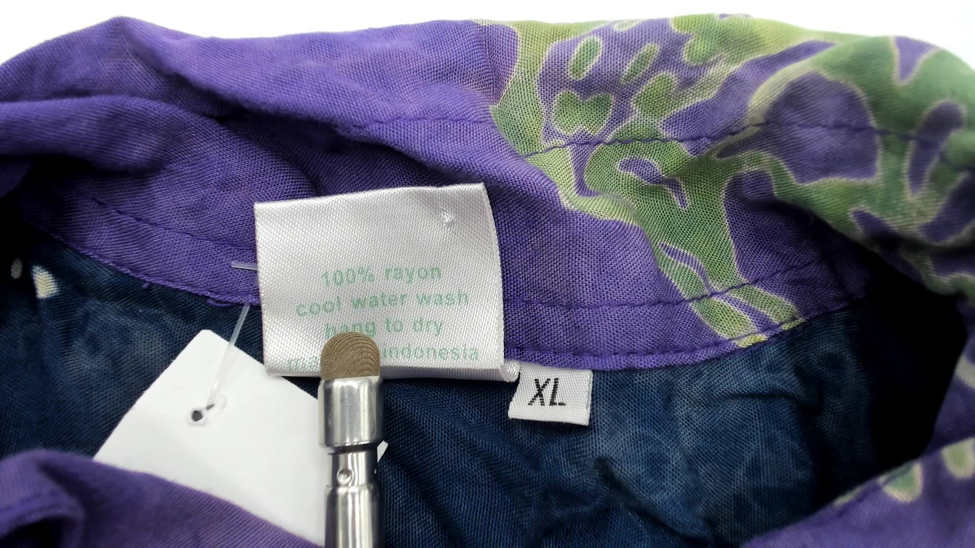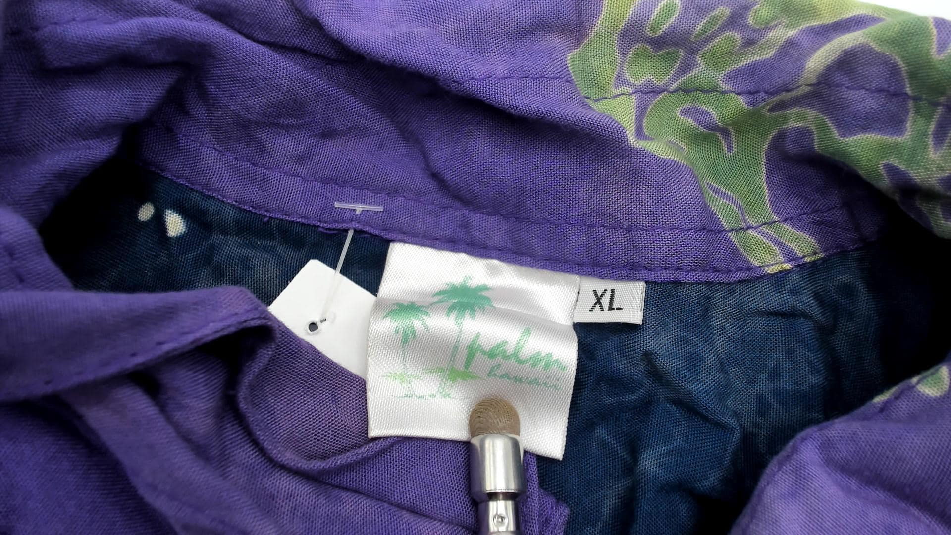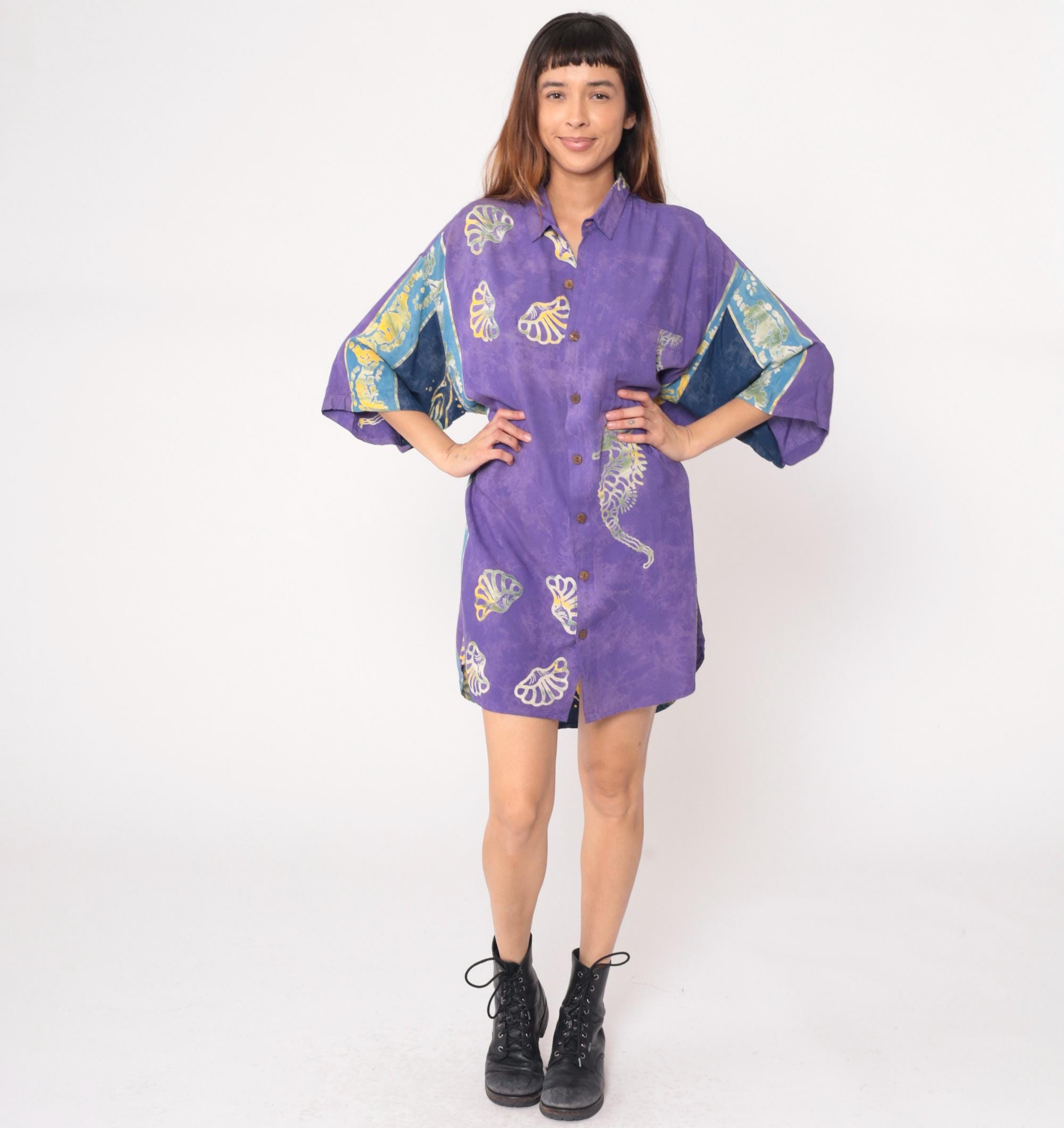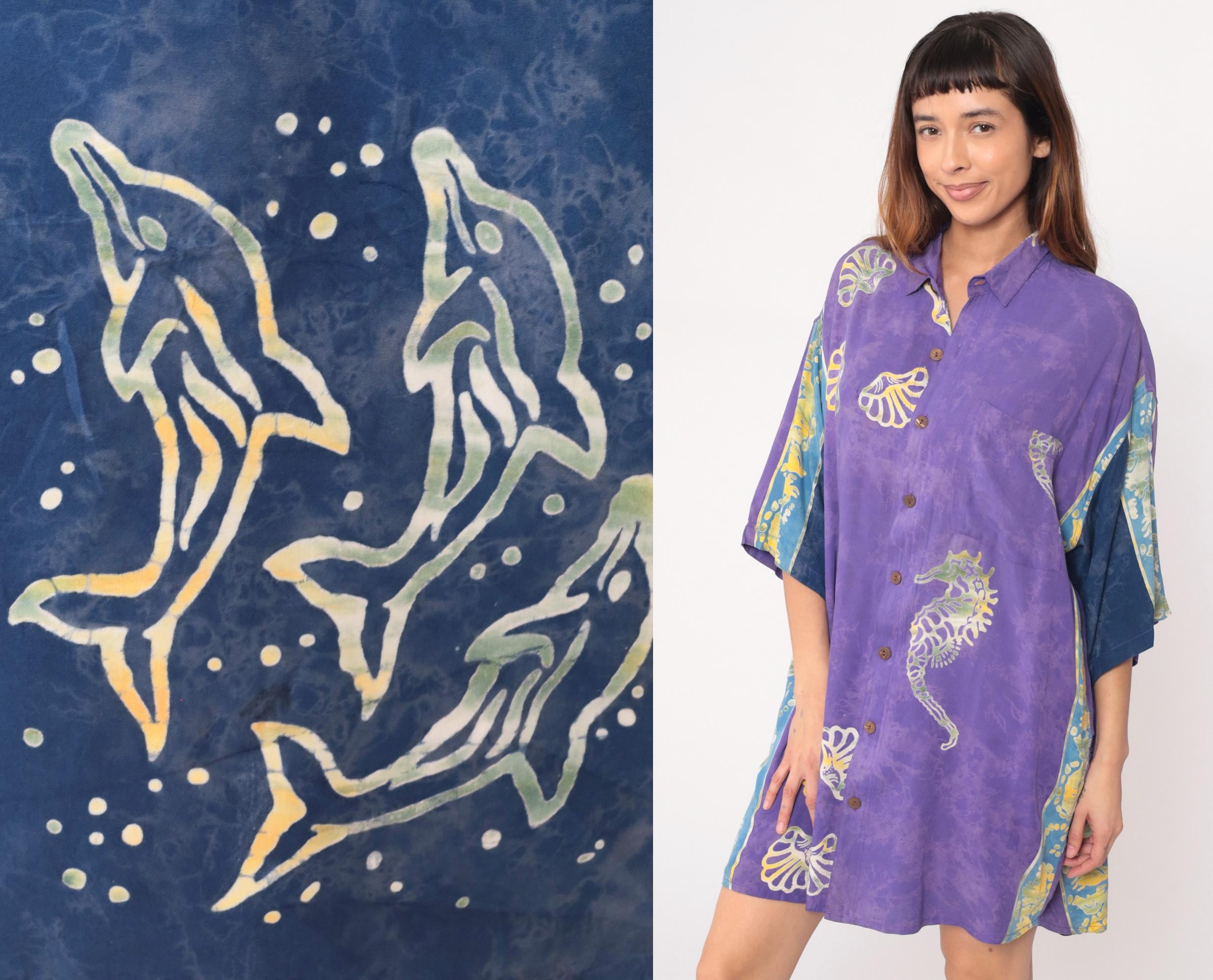 Y2K purple and navy tunic shirt from Palm Hawaii with batik-style sea life print across the fabric, including dolphins, seahorse, and shells in yellow and pale blue. Button front closure with collar and short kimono-style sleeves. Colorblock construction with purple front panel and navy side and back panels.