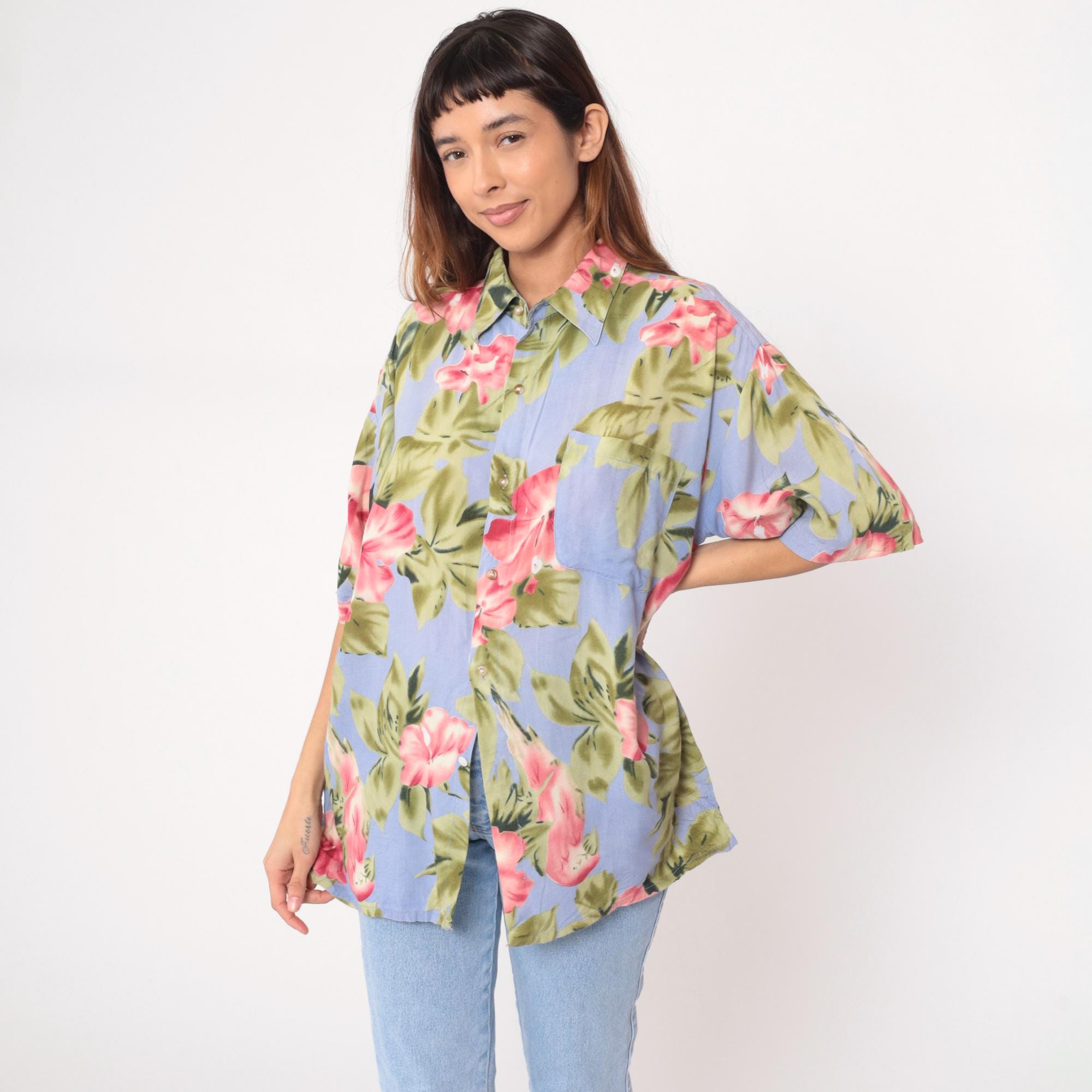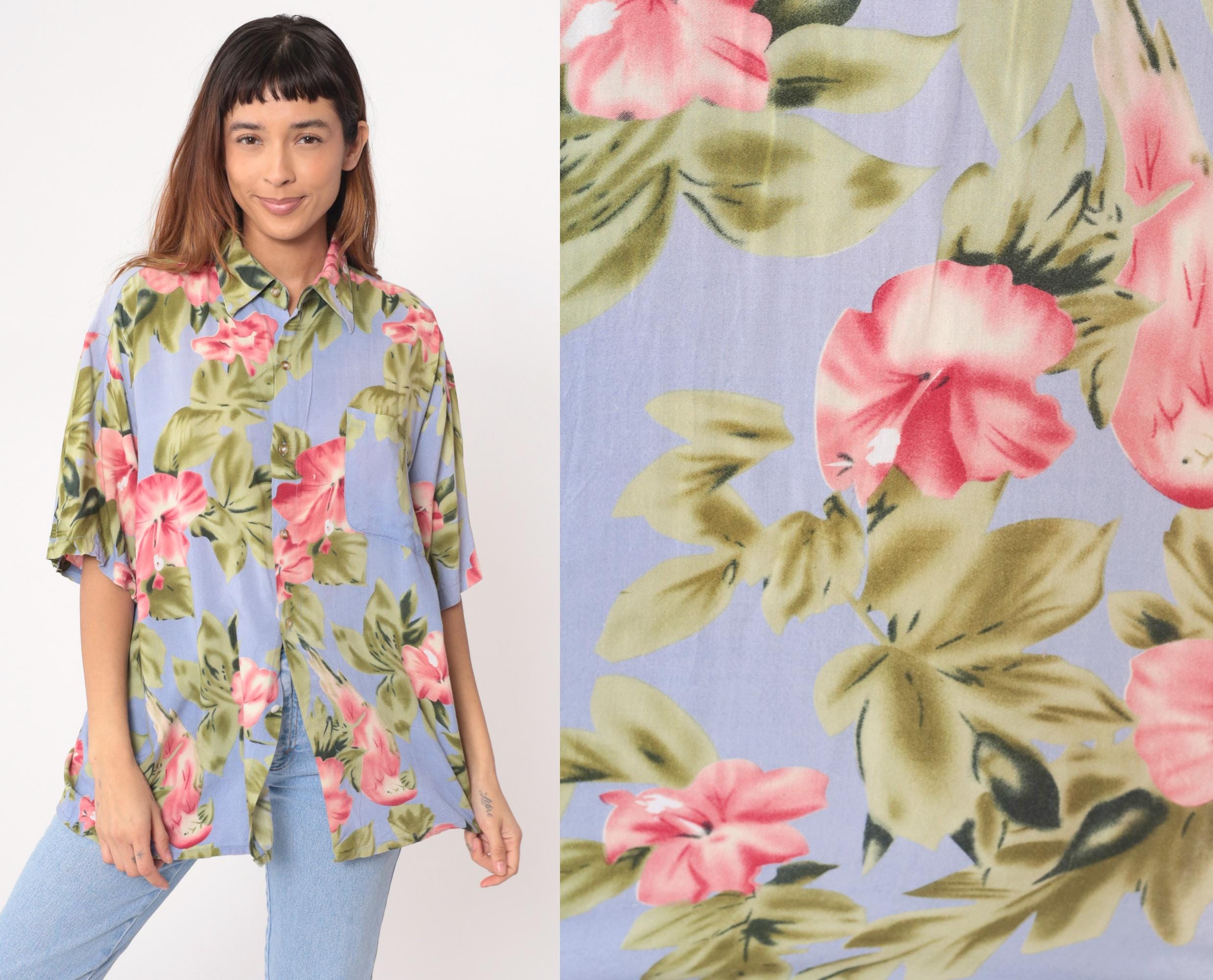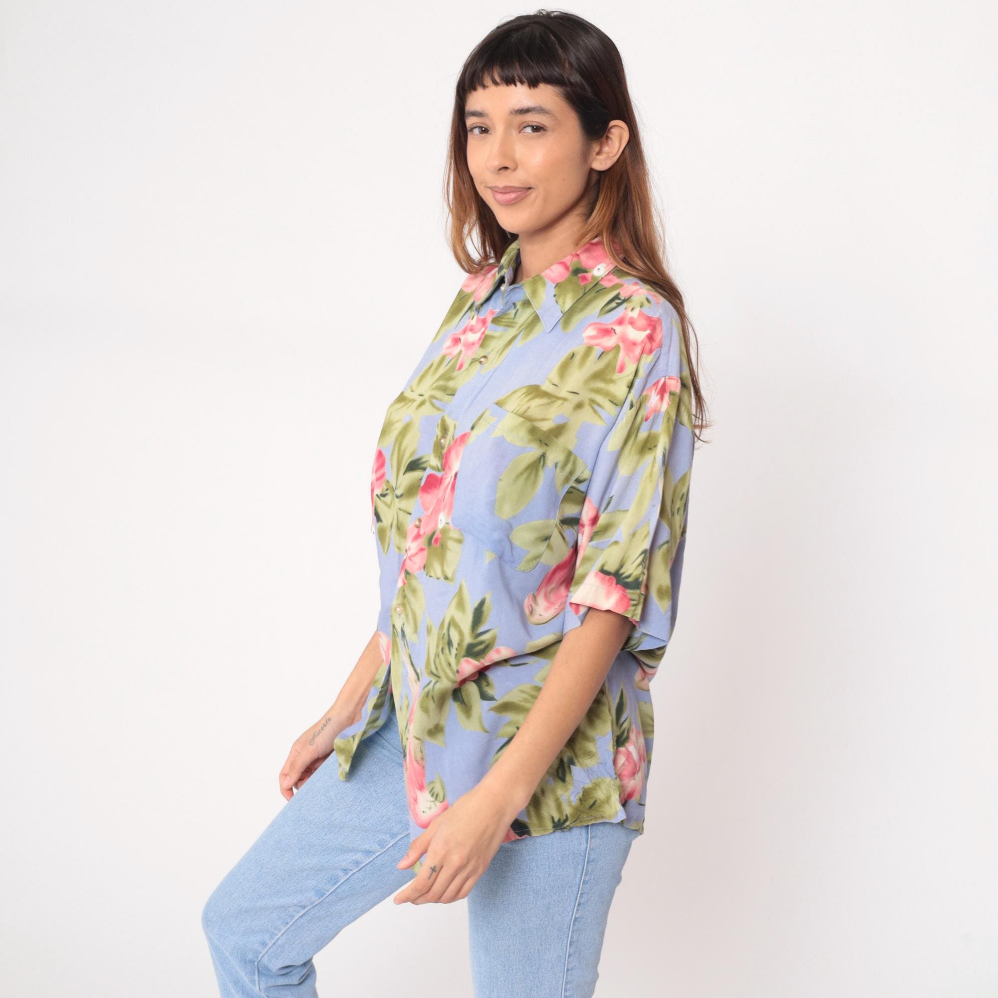 Y2K short sleeve button-up shirt from everest collection with all-over floral print in pink flowers and olive green leaves on a light blue background. Pointed collar, white button front closure, and short sleeves with a relaxed, relaxed fit.