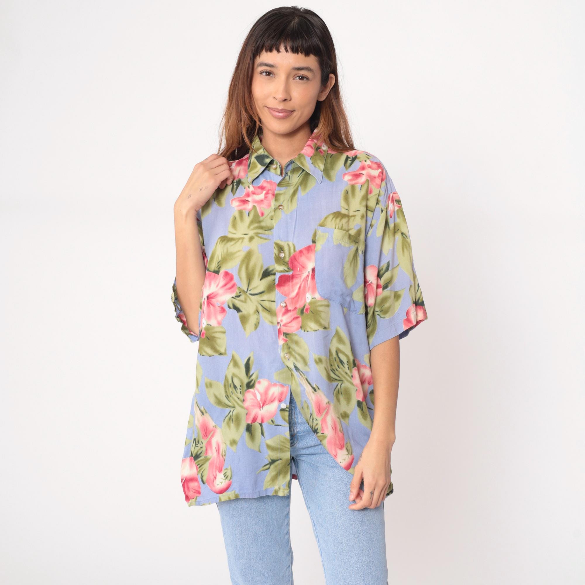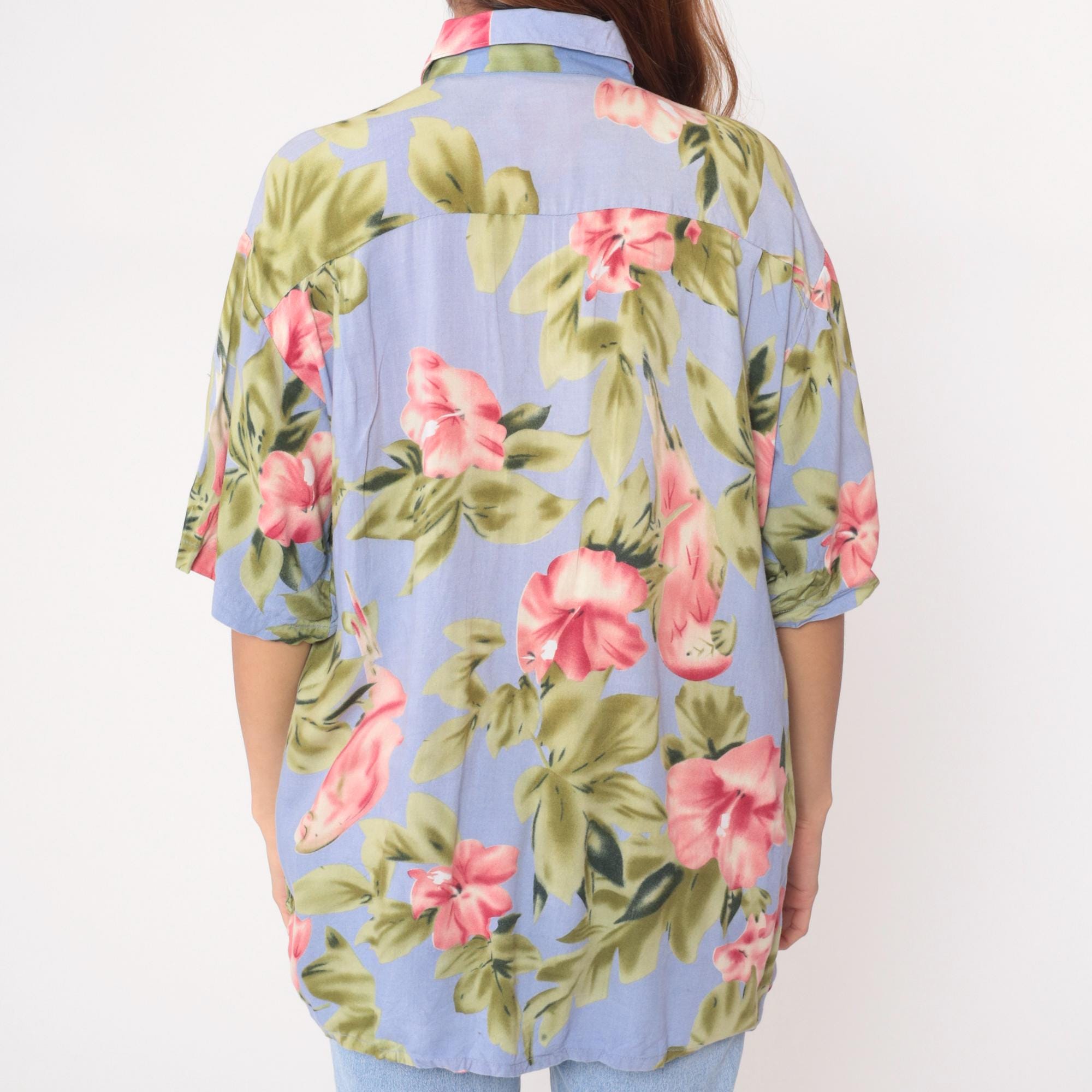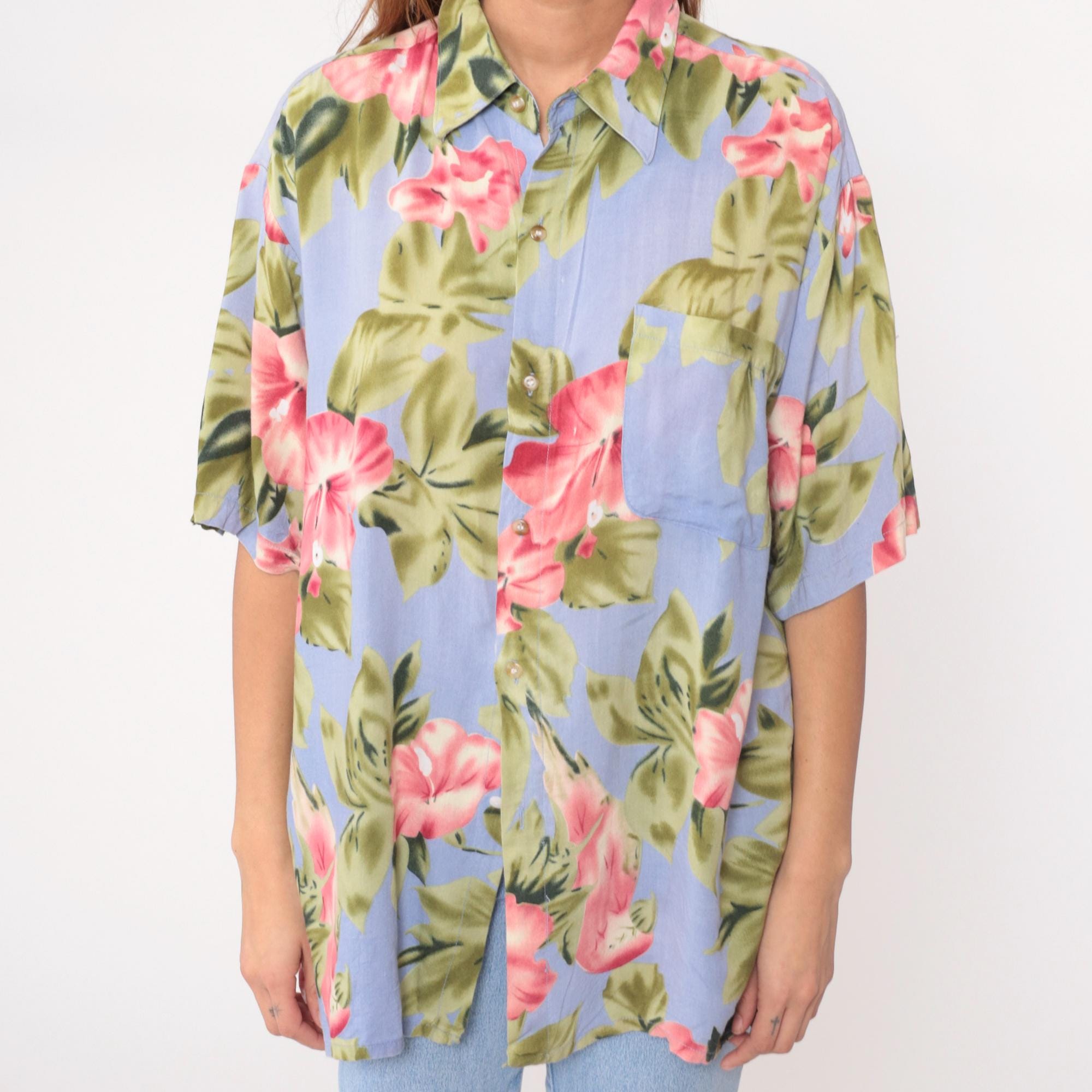 Y2K short sleeve button-up shirt from everest collection with all-over floral print in pink flowers and olive green leaves on a light blue background. Pointed collar, white button front closure, and short sleeves with a relaxed, relaxed fit.