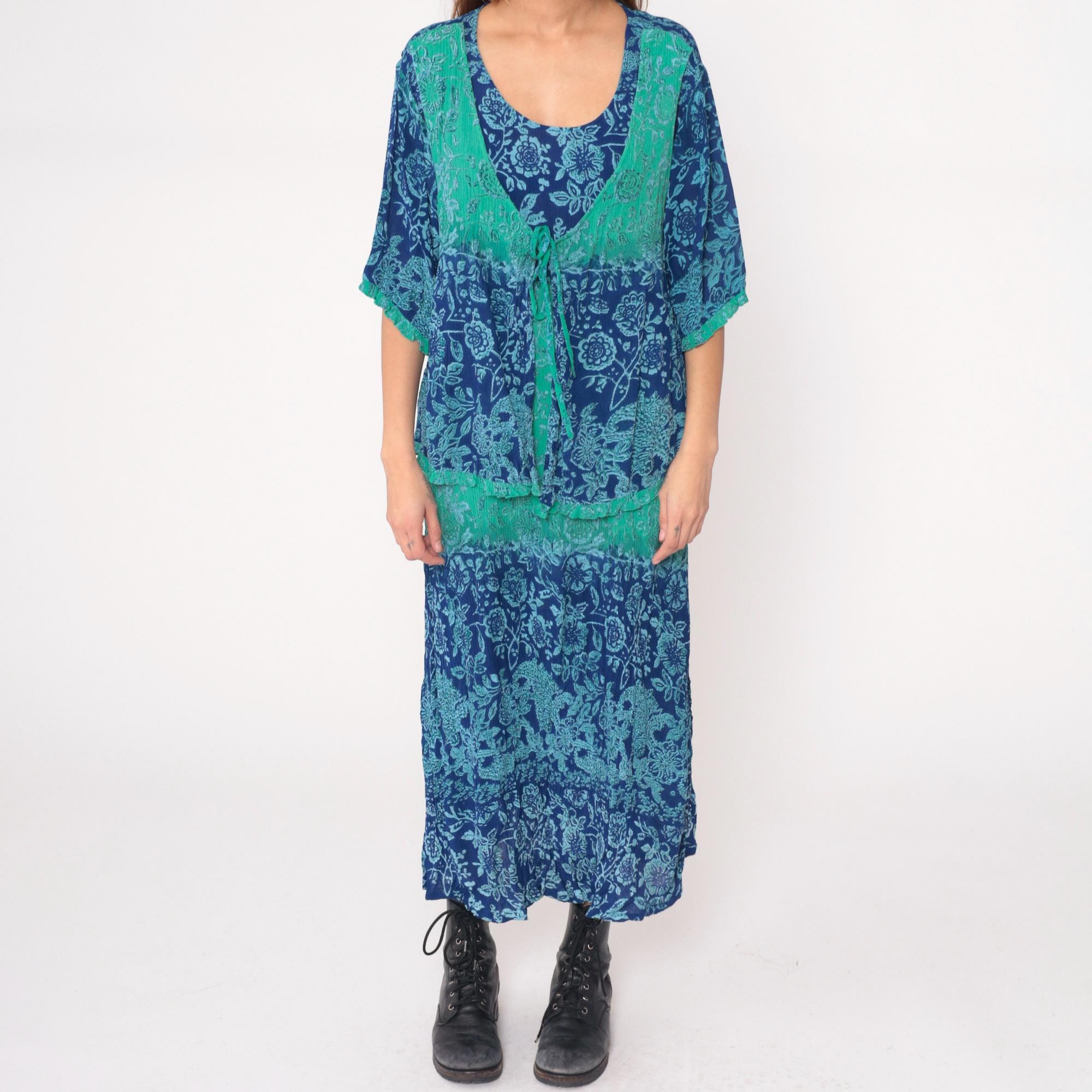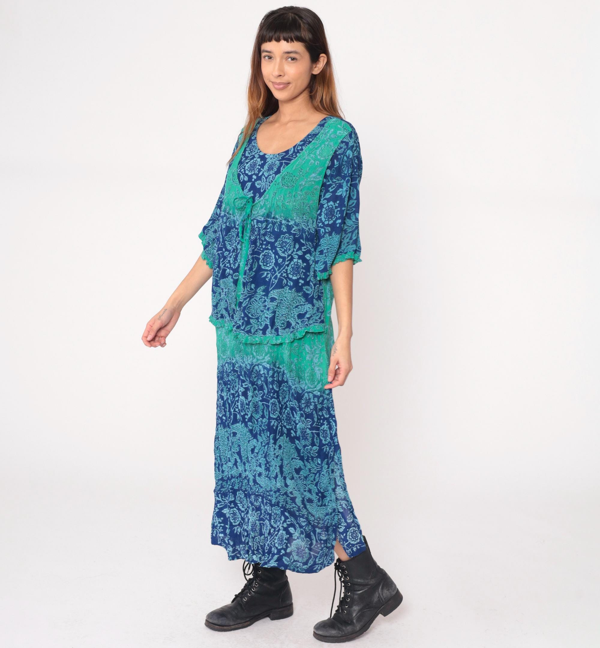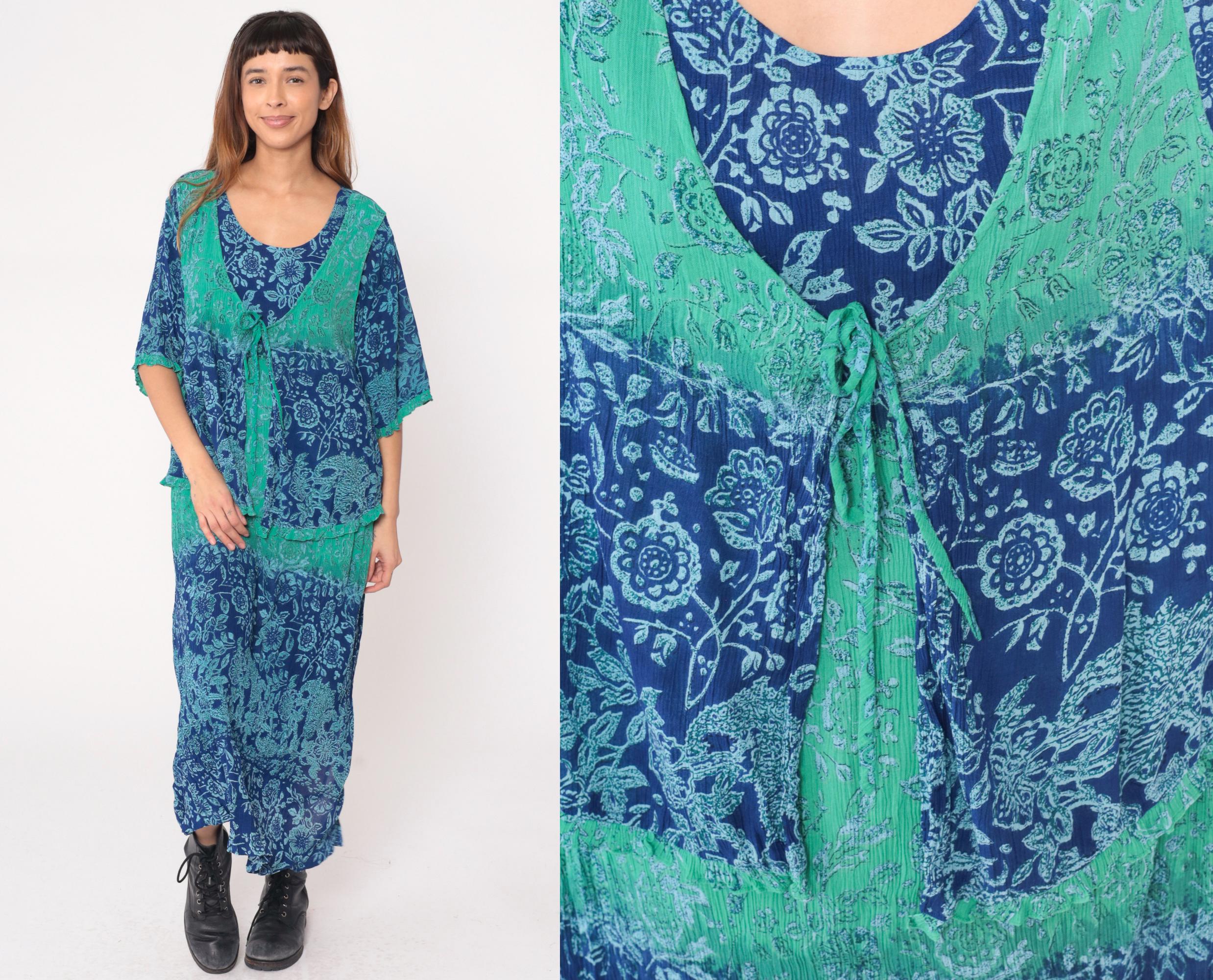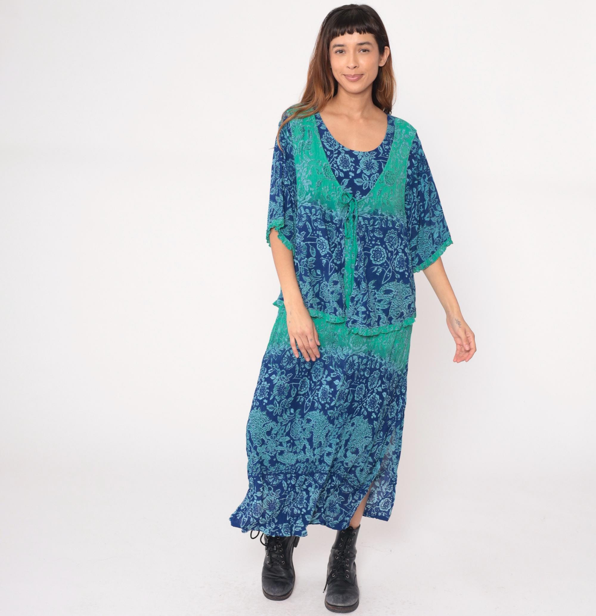 90s two-piece set from La cera in navy blue and seafoam green with floral batik print throughout. Oversized vest-style top with wide three-quarter sleeves, V-neckline, and center front tie closure. Coordinating maxi skirt with elastic waist.