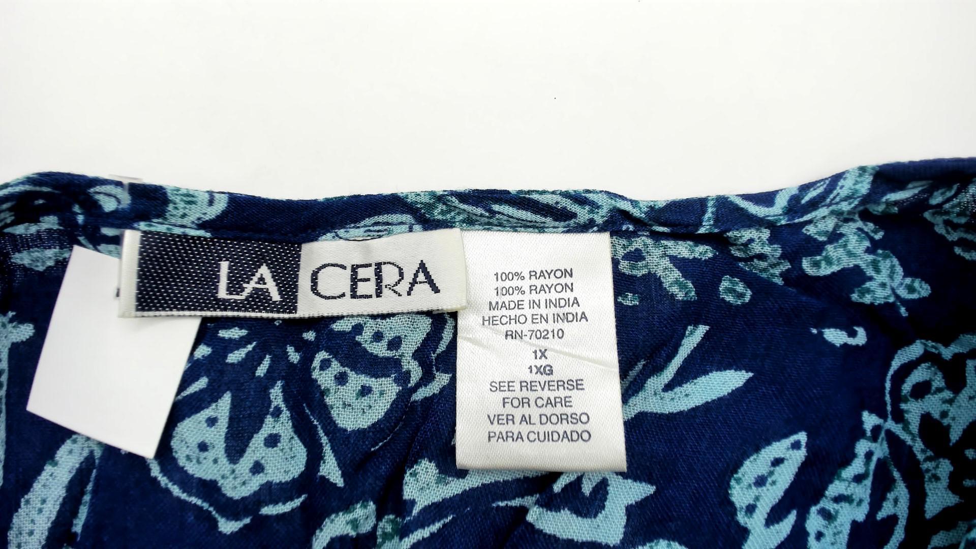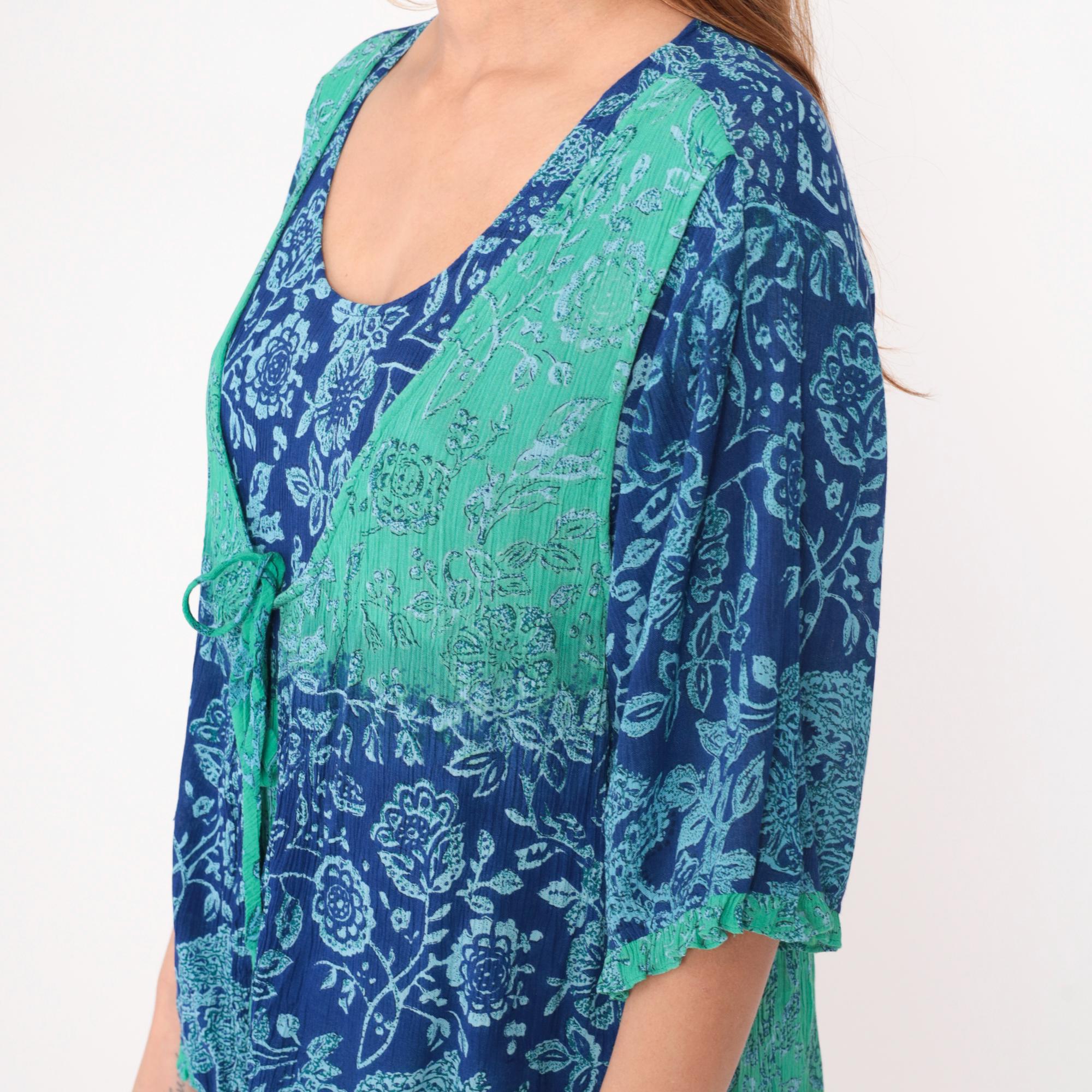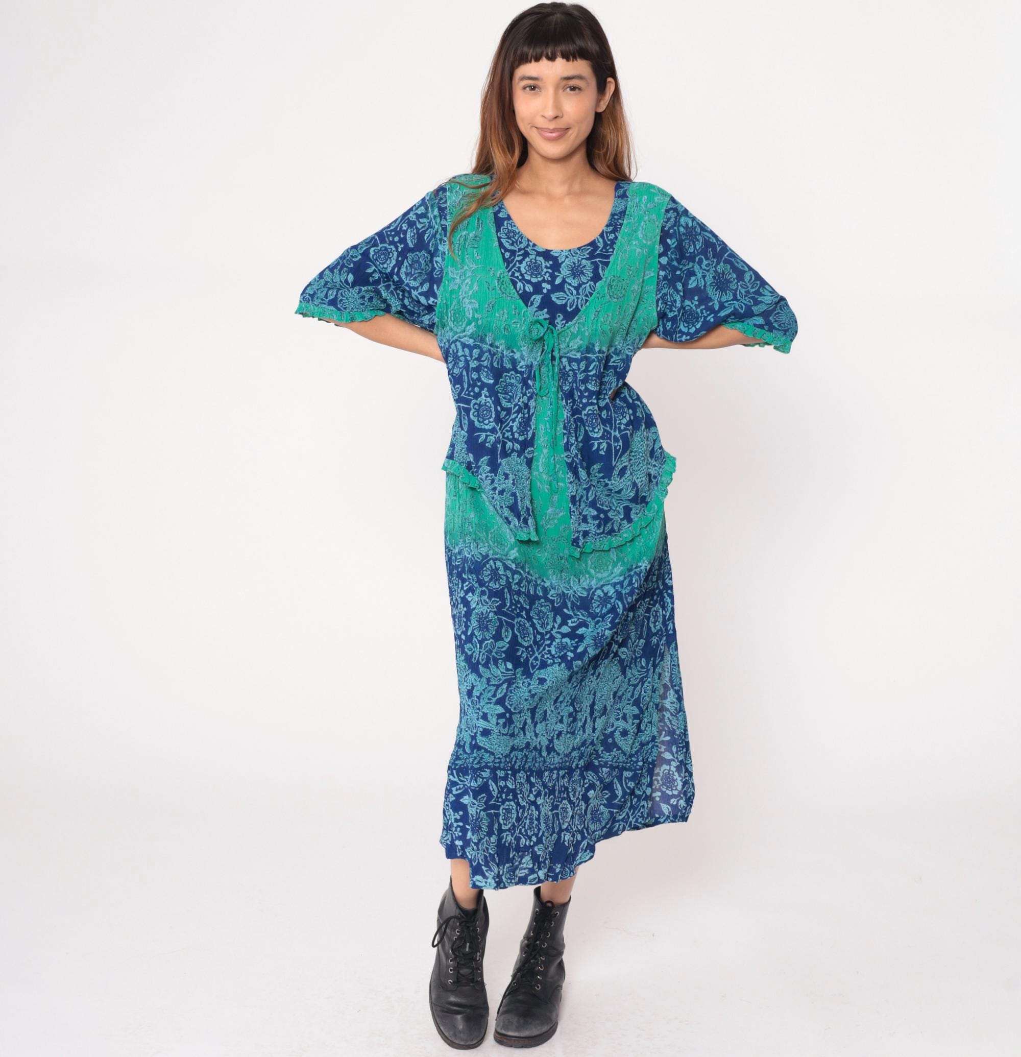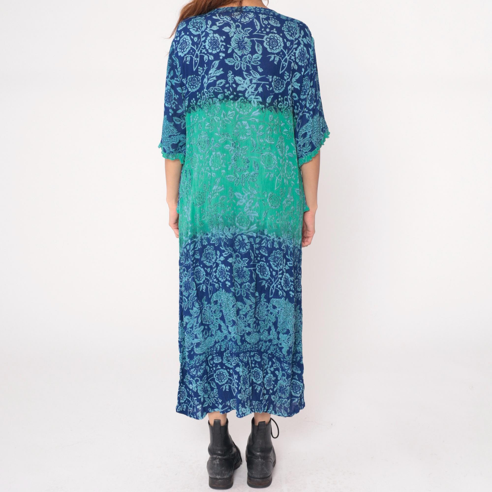90s two-piece set from La cera in navy blue and seafoam green with floral batik print throughout. Oversized vest-style top with wide three-quarter sleeves, V-neckline, and center front tie closure. Coordinating maxi skirt with elastic waist.