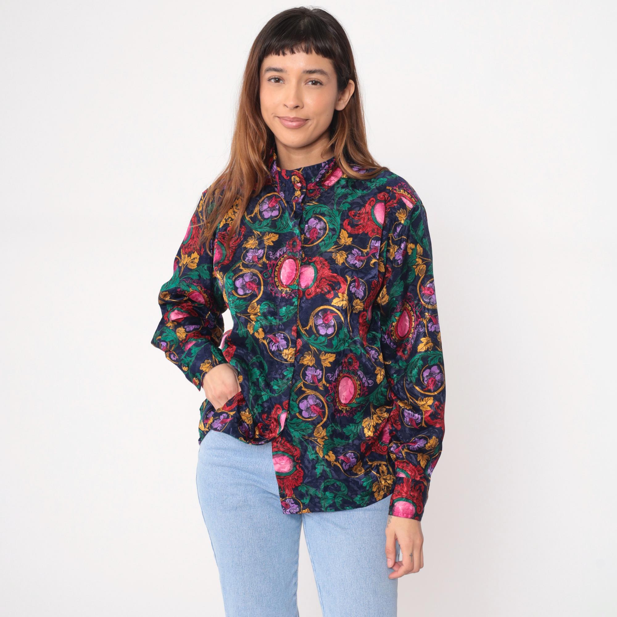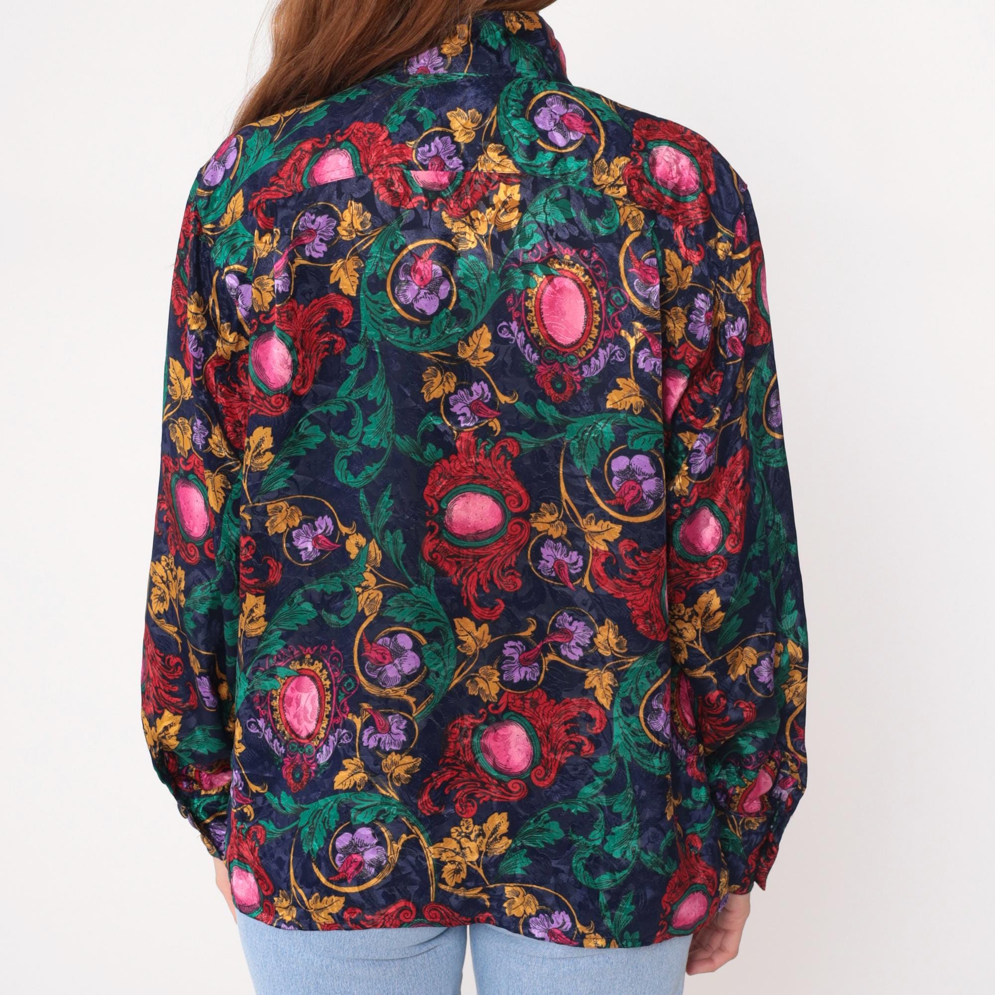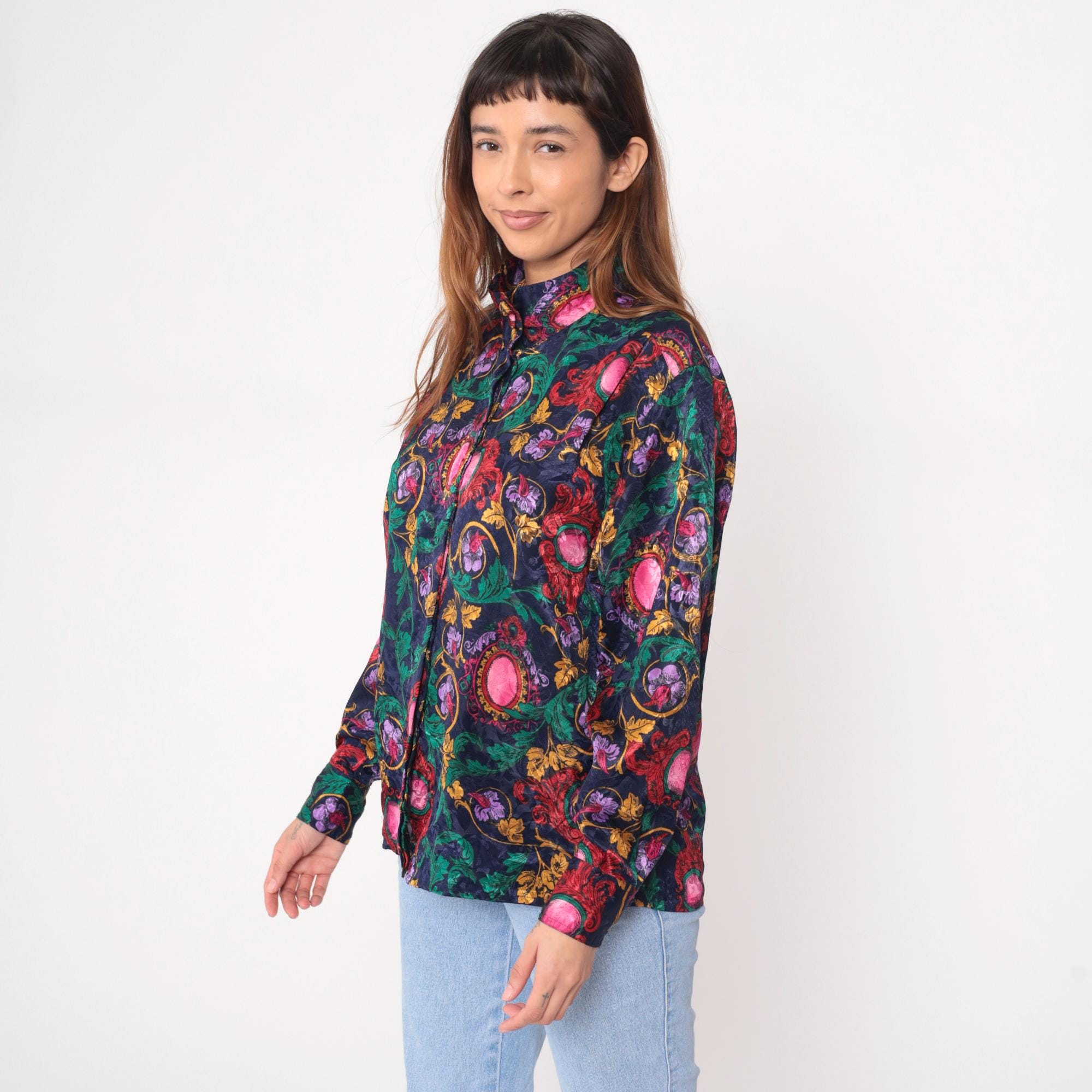 90s navy baroque print shirt from tess with pink oval cameos surrounded by ornate red, green, gold, and purple scrollwork and floral motifs across the fabric. Long sleeves, button front closure, pointed collar.