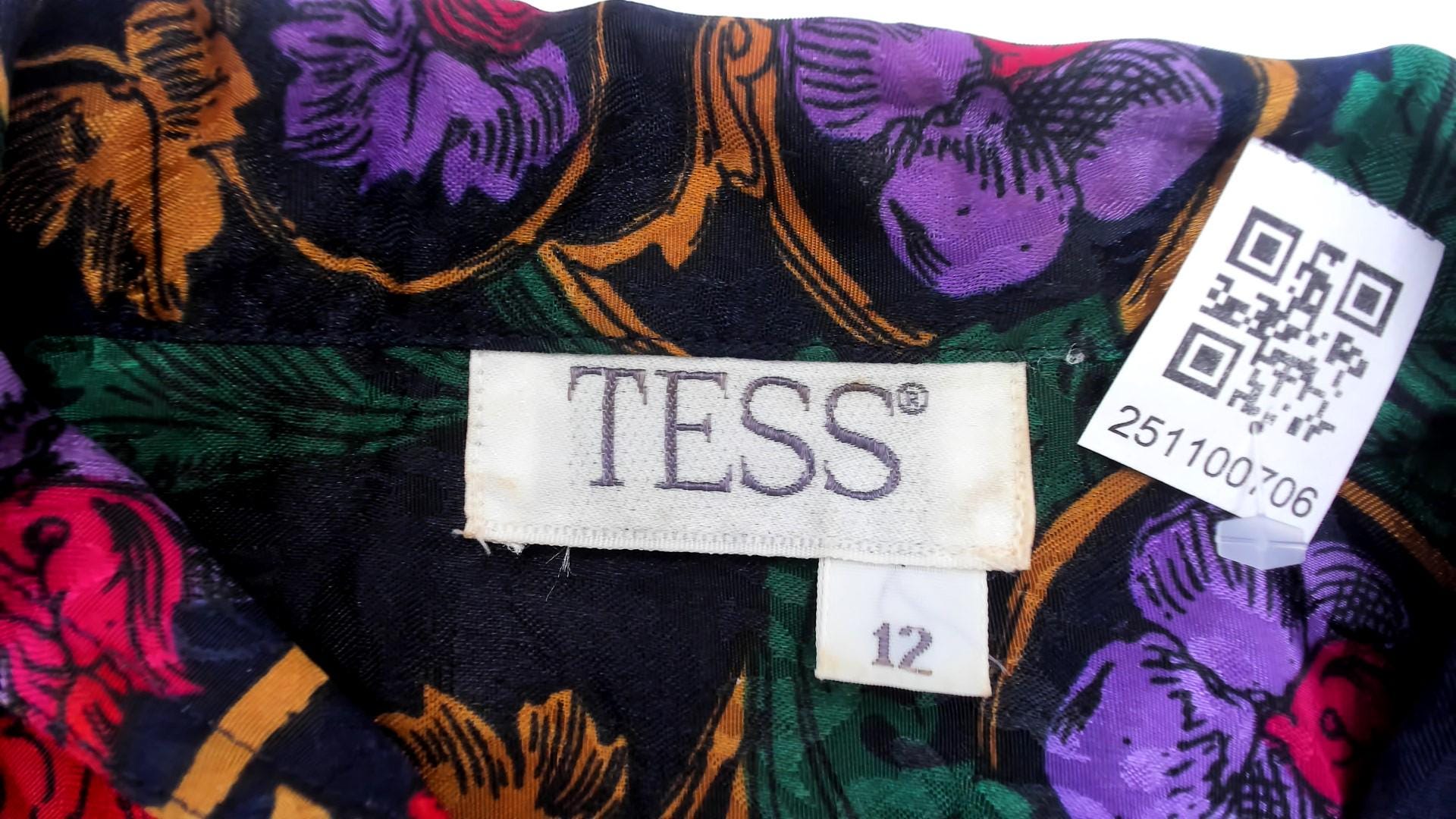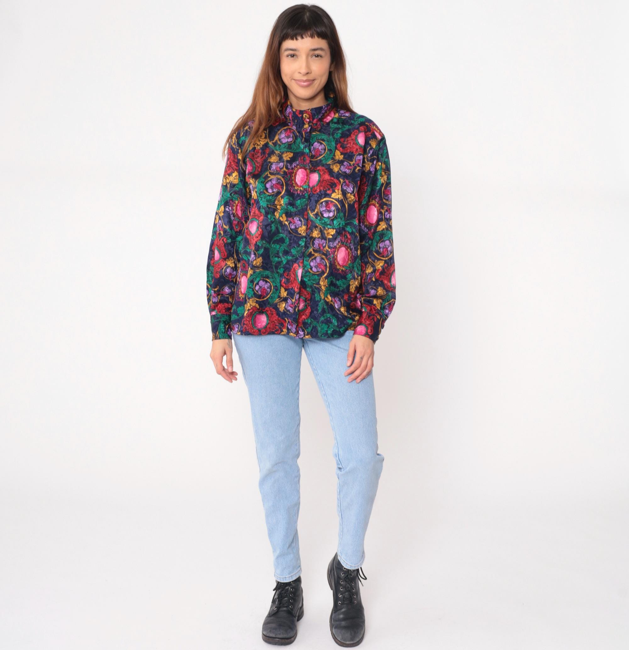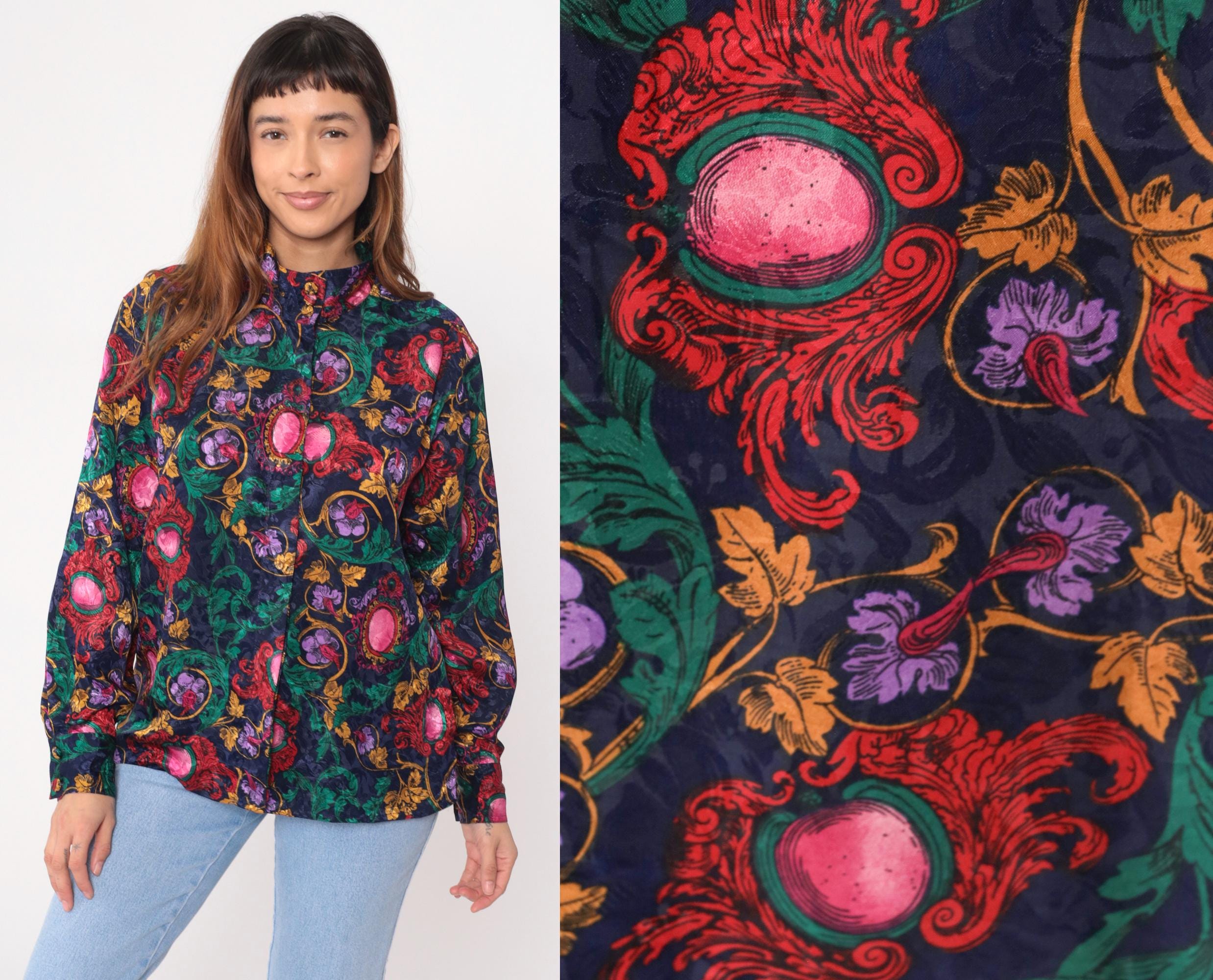 90s navy baroque print shirt from tess with pink oval cameos surrounded by ornate red, green, gold, and purple scrollwork and floral motifs across the fabric. Long sleeves, button front closure, pointed collar.