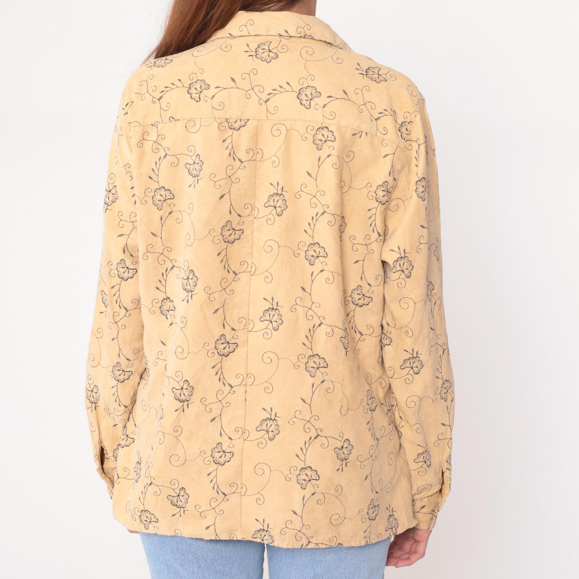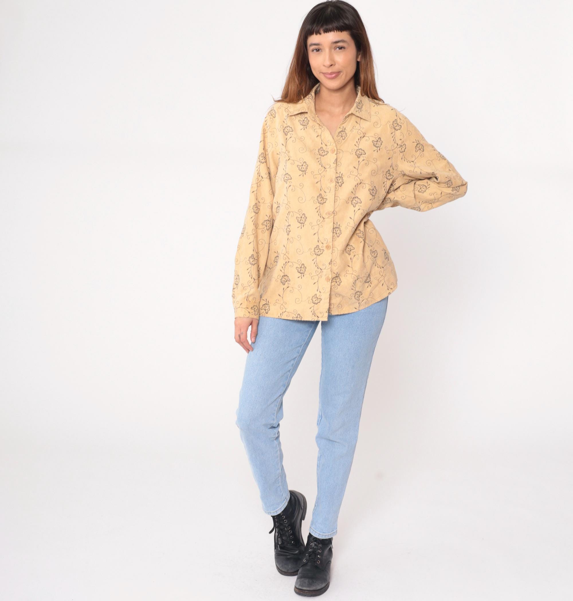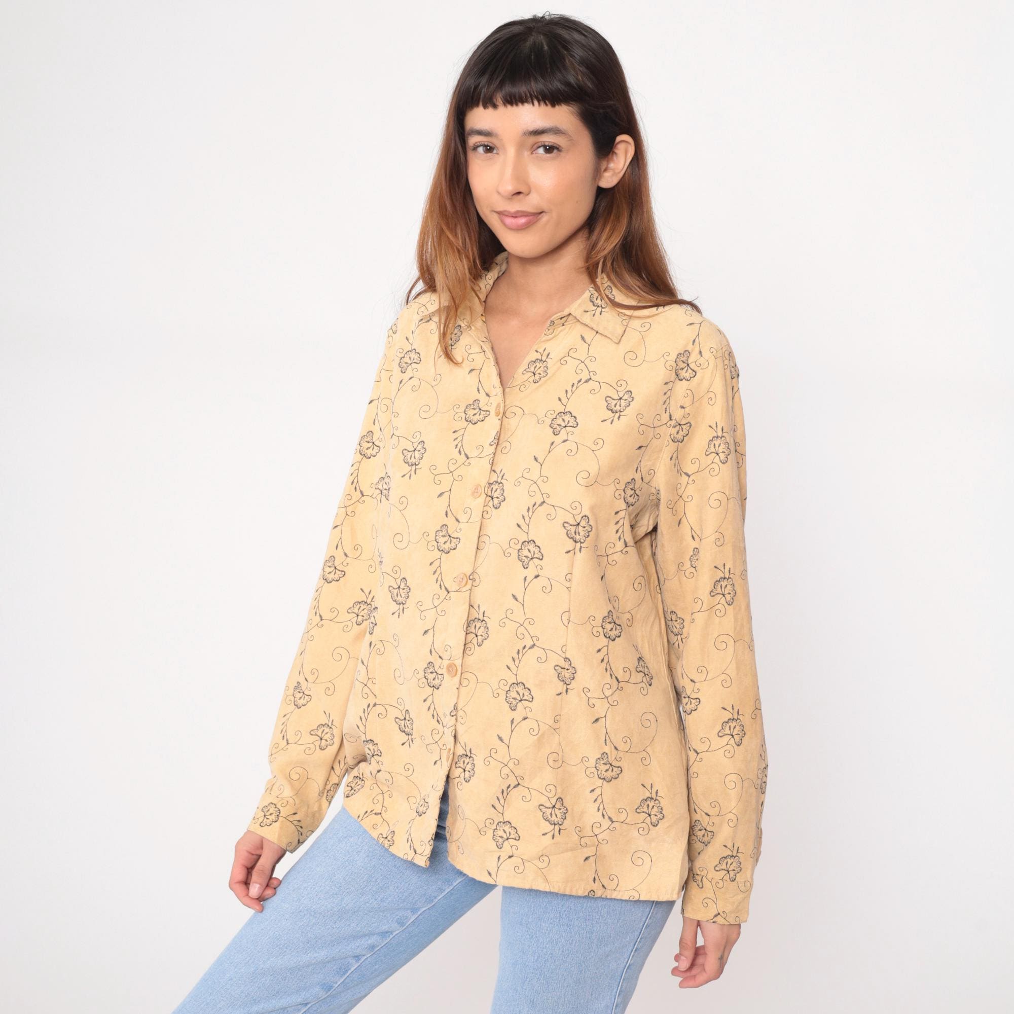 90s pale yellow button-front shirt from sag harbor with embroidered floral pattern throughout. Gray and black embroidered flowers and scrolling vines across the fabric, standard collar, long sleeves.