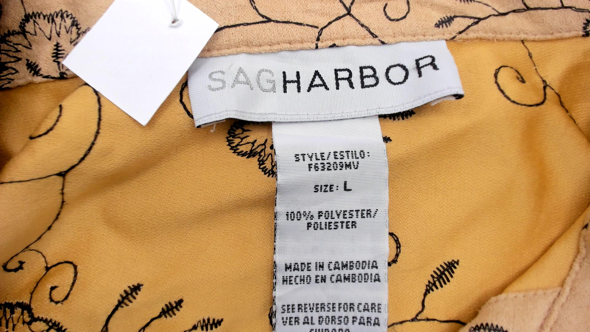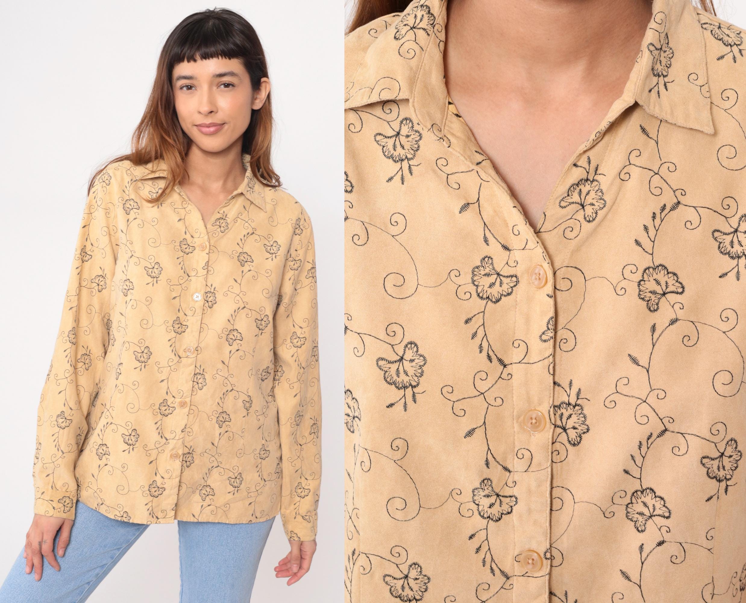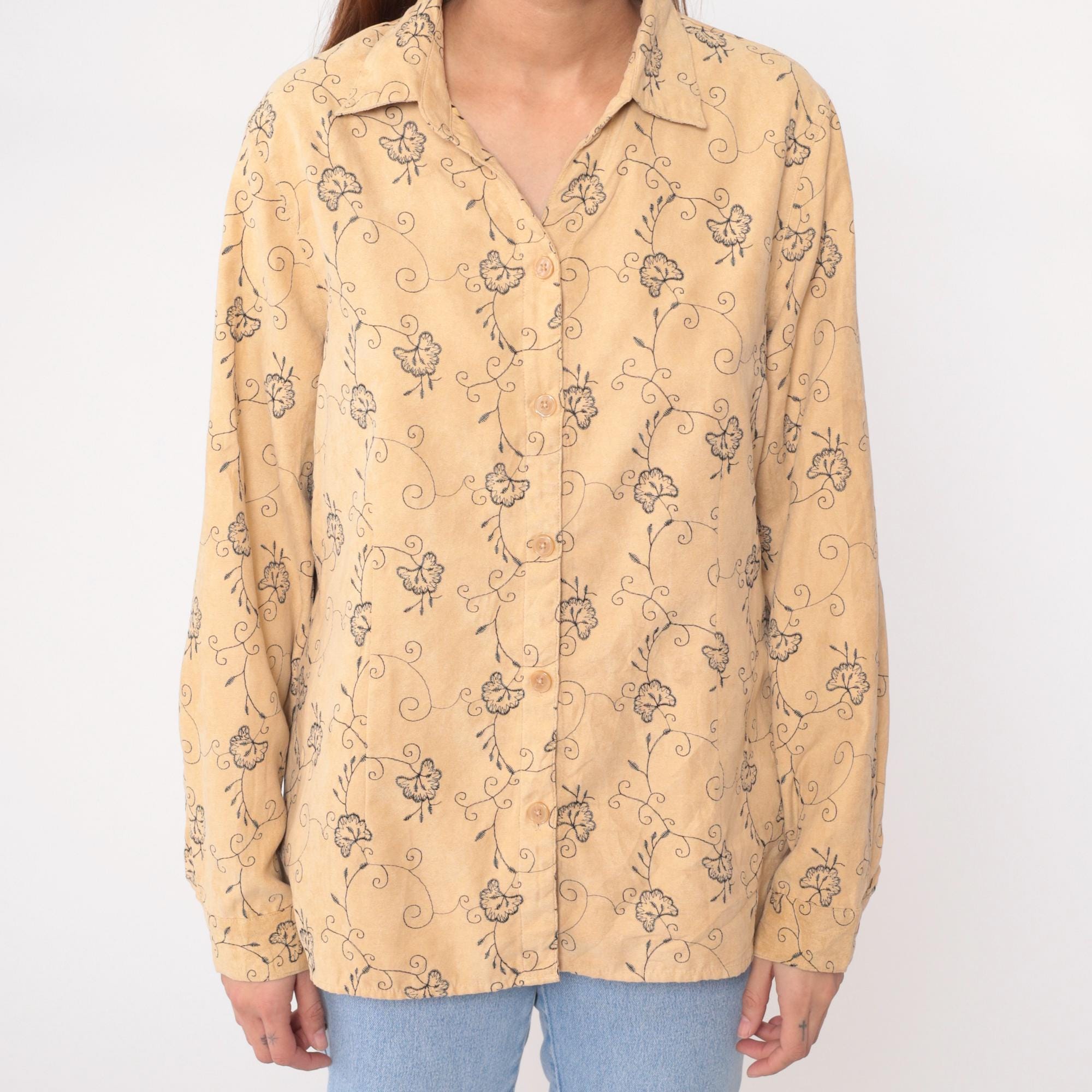 90s pale yellow button-front shirt from sag harbor with embroidered floral pattern throughout. Gray and black embroidered flowers and scrolling vines across the fabric, standard collar, long sleeves.