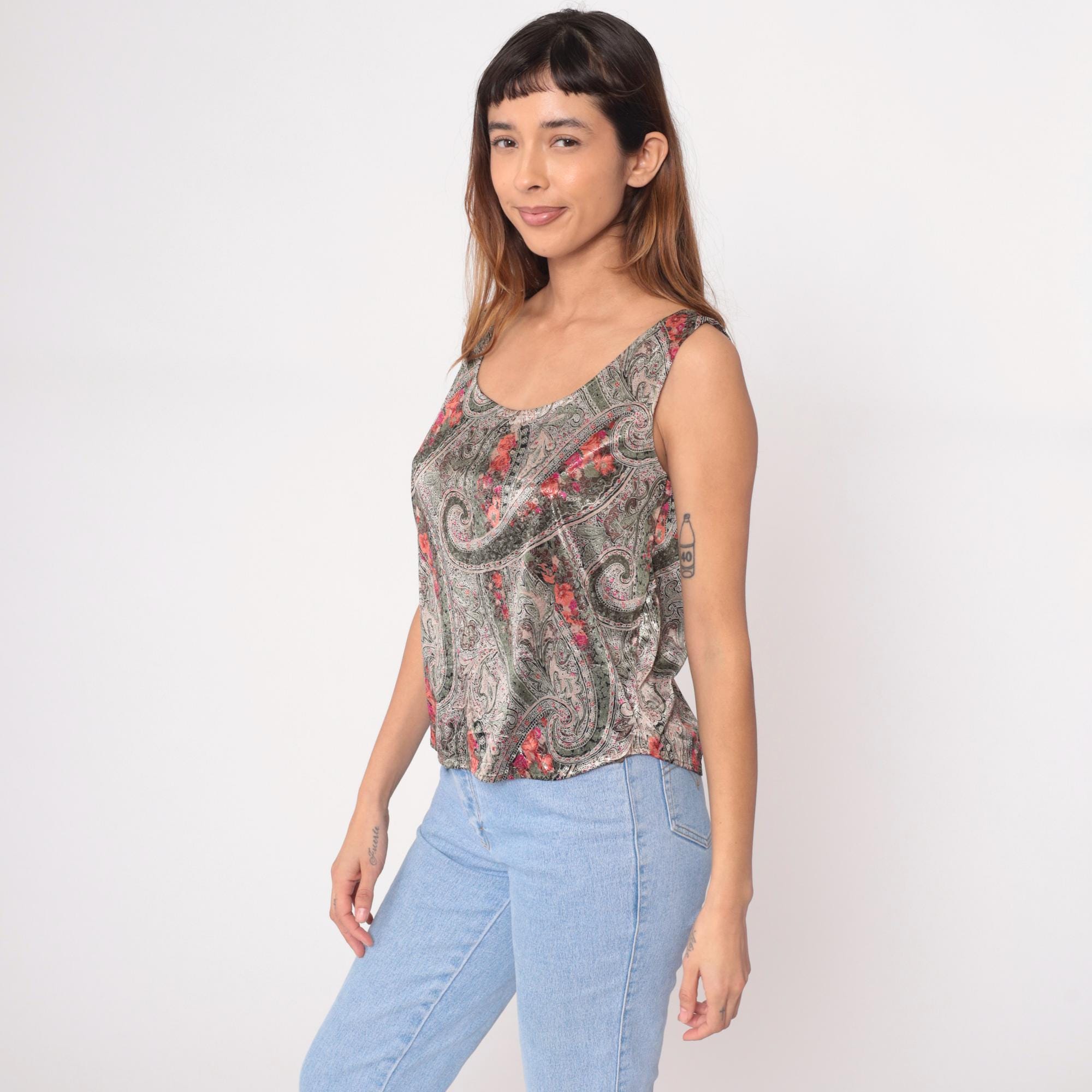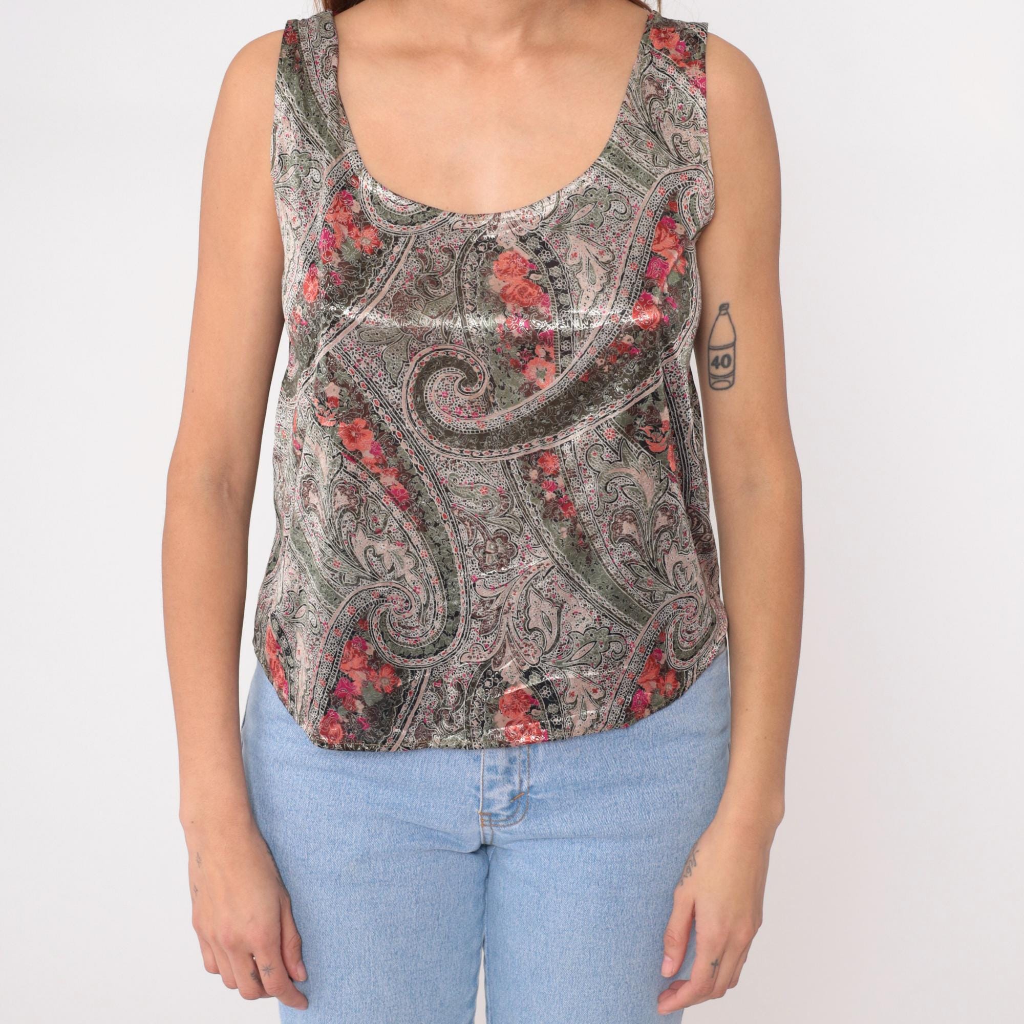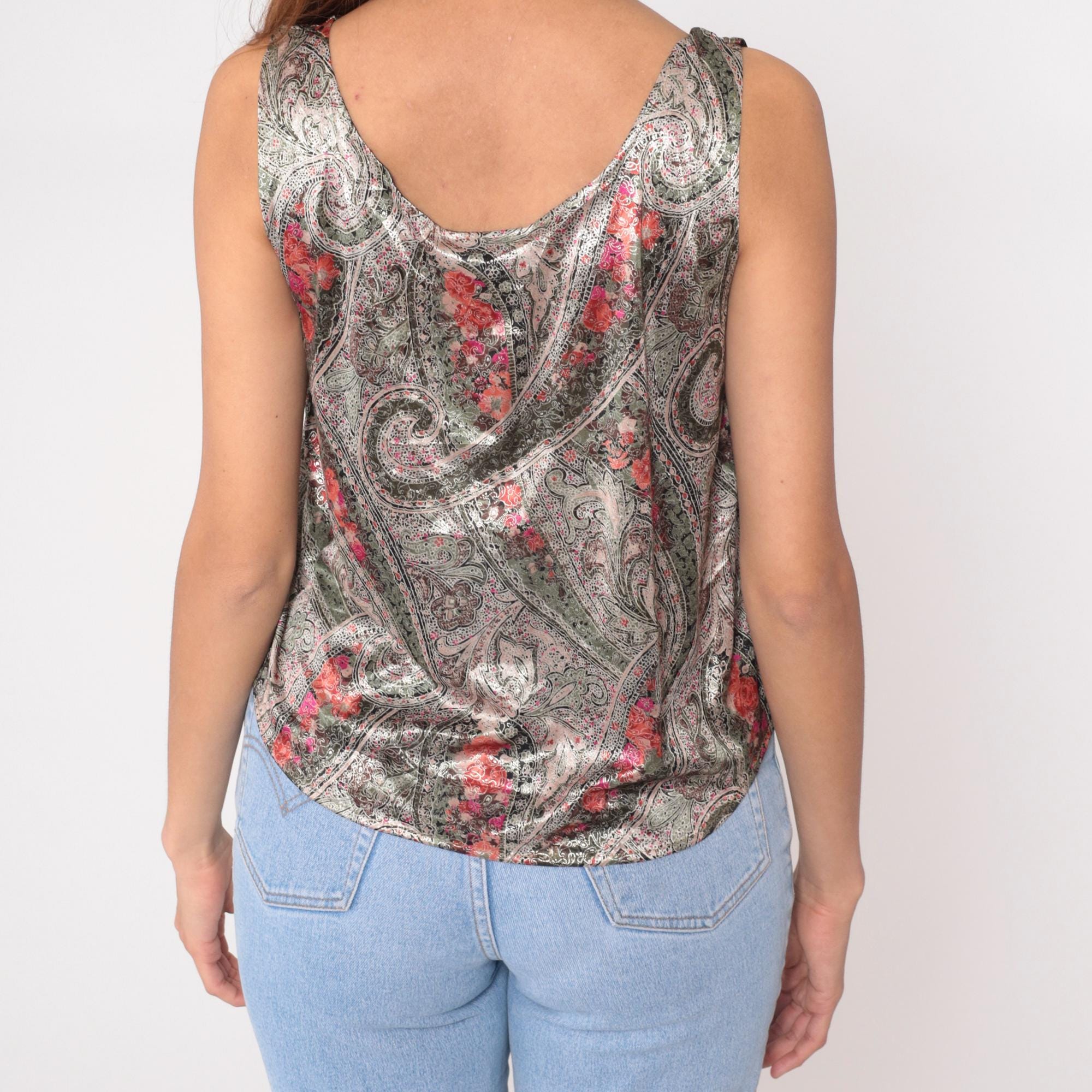 90s taupe paisley tank top from hot stuff with metallic sheen across the fabric. Olive green swirling paisley pattern overlaid with pink and coral floral accents throughout. Scoop neckline front and back, sleeveless with standard armholes.