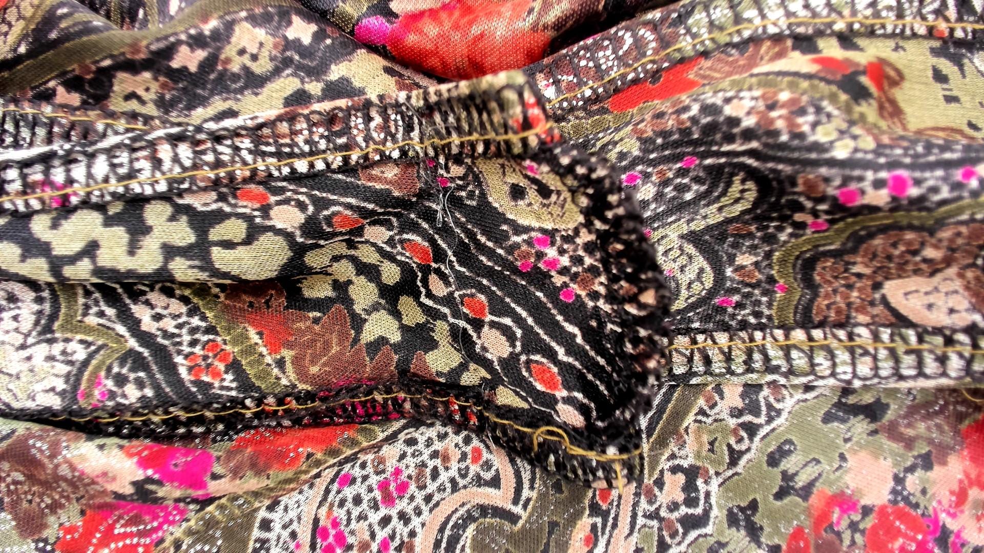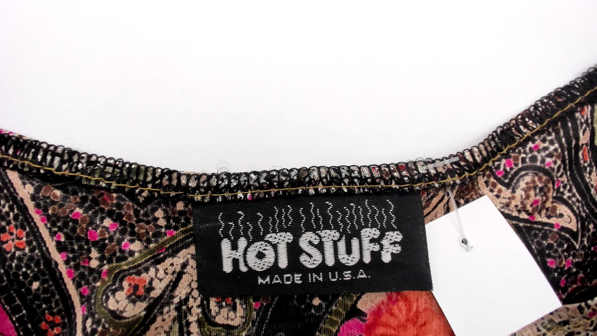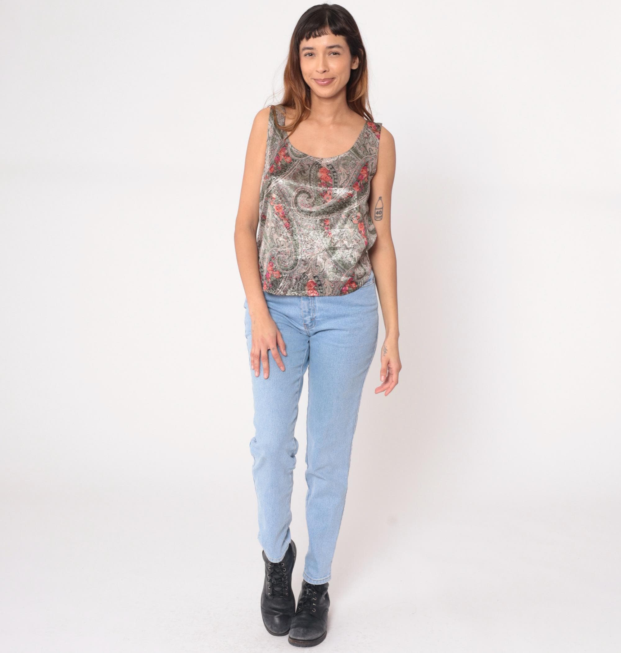 90s taupe paisley tank top from hot stuff with metallic sheen across the fabric. Olive green swirling paisley pattern overlaid with pink and coral floral accents throughout. Scoop neckline front and back, sleeveless with standard armholes.