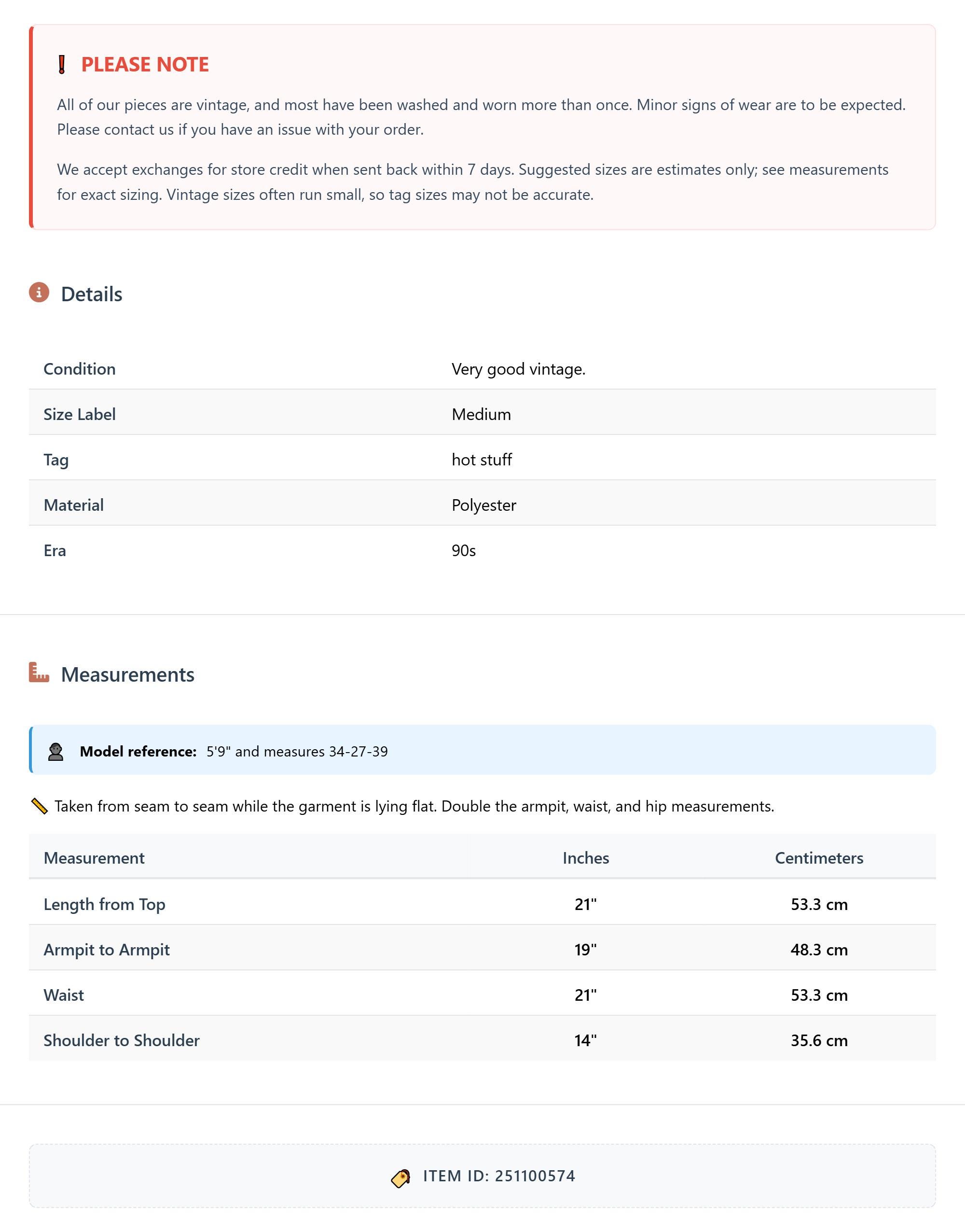 All of our pieces are vintage, and most have been washed and worn more than once. Minor signs of wear are to be expected. Please contact us if you have an issue with your order. We accept exchanges for store credit when sent back within 7 days.