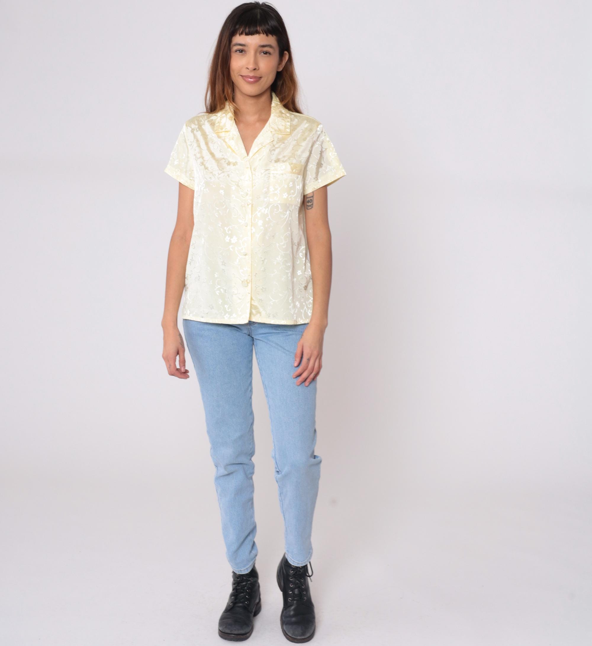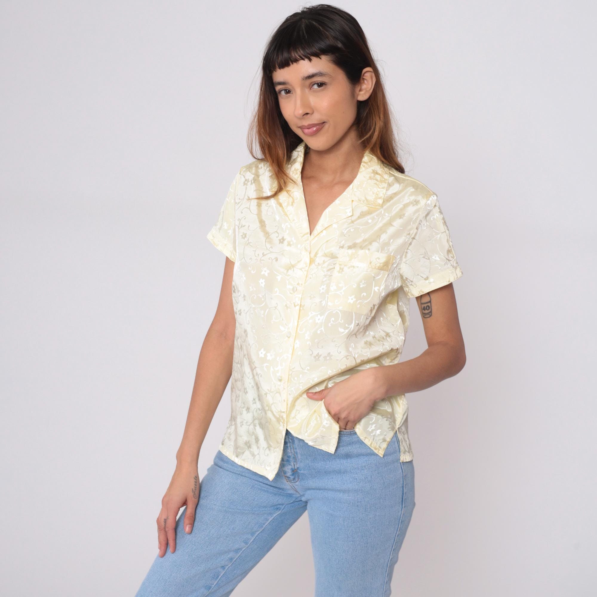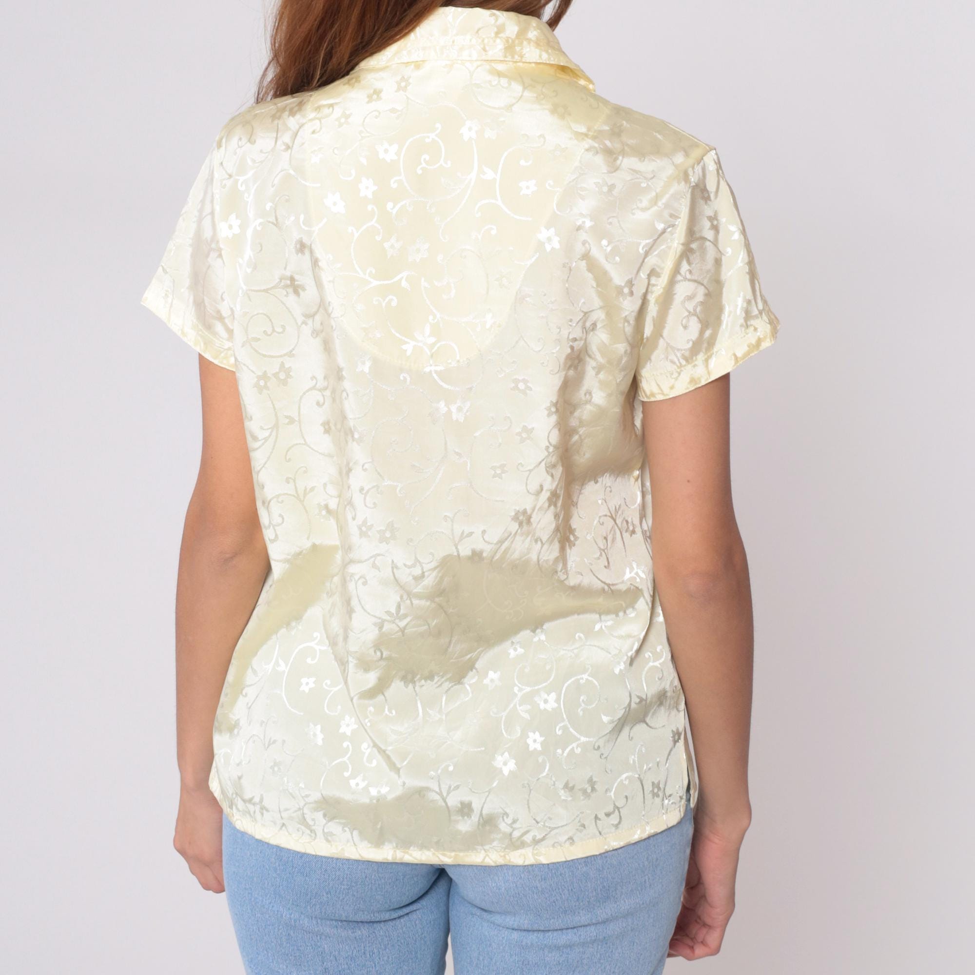 90s pale yellow button front shirt from cinema etoile with allover jacquard floral and scroll pattern. Collared neckline, short sleeves, front button closure with matching buttons.