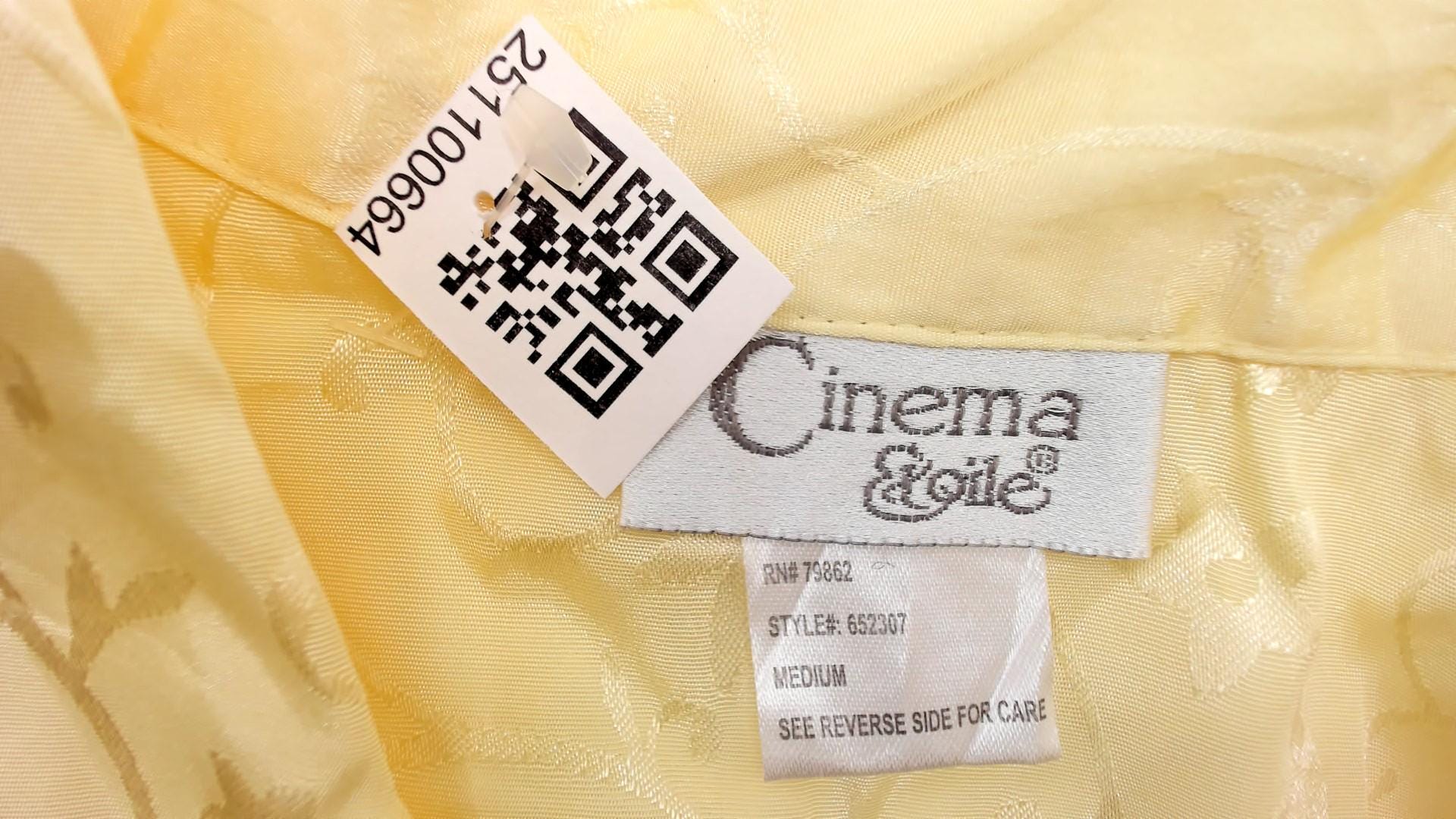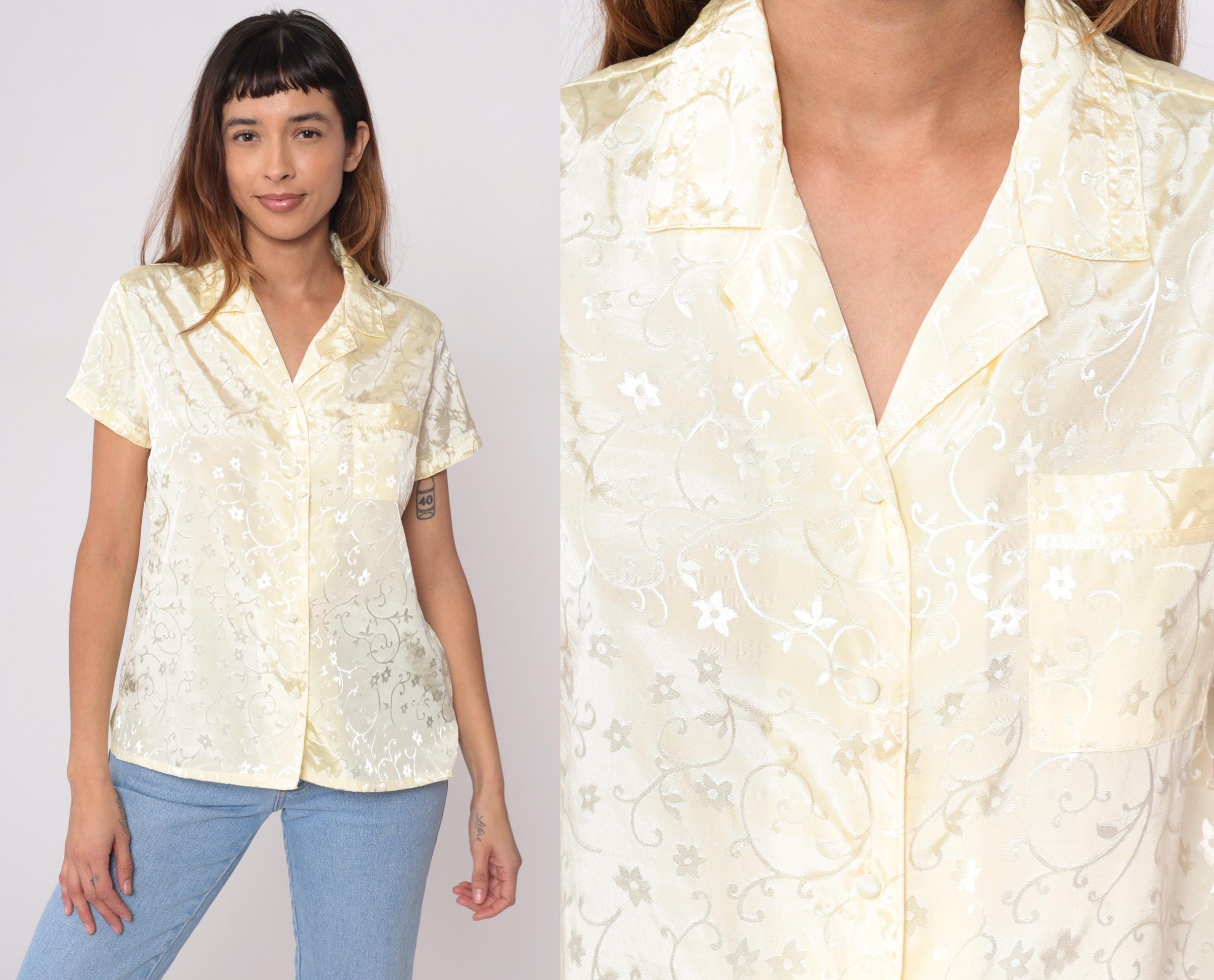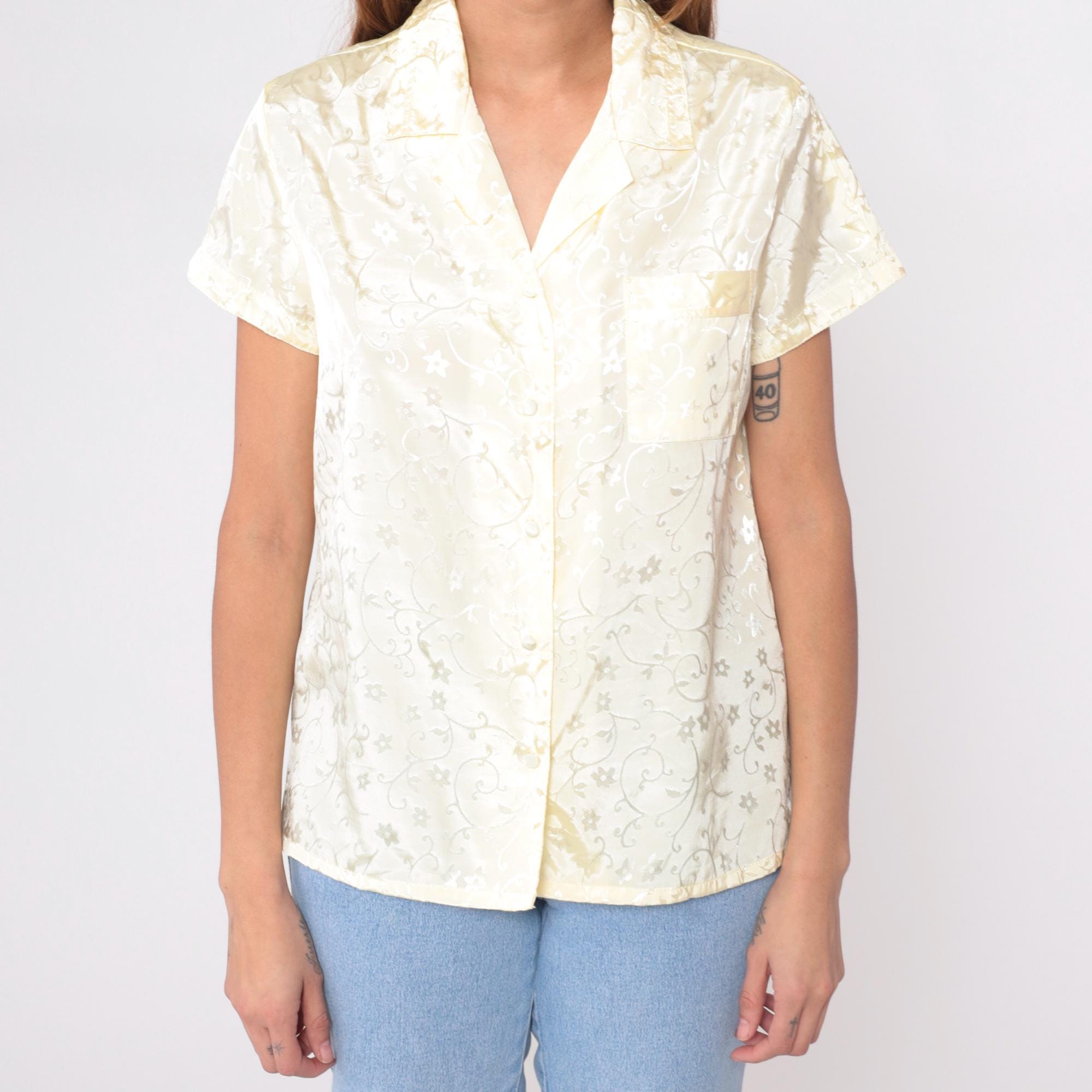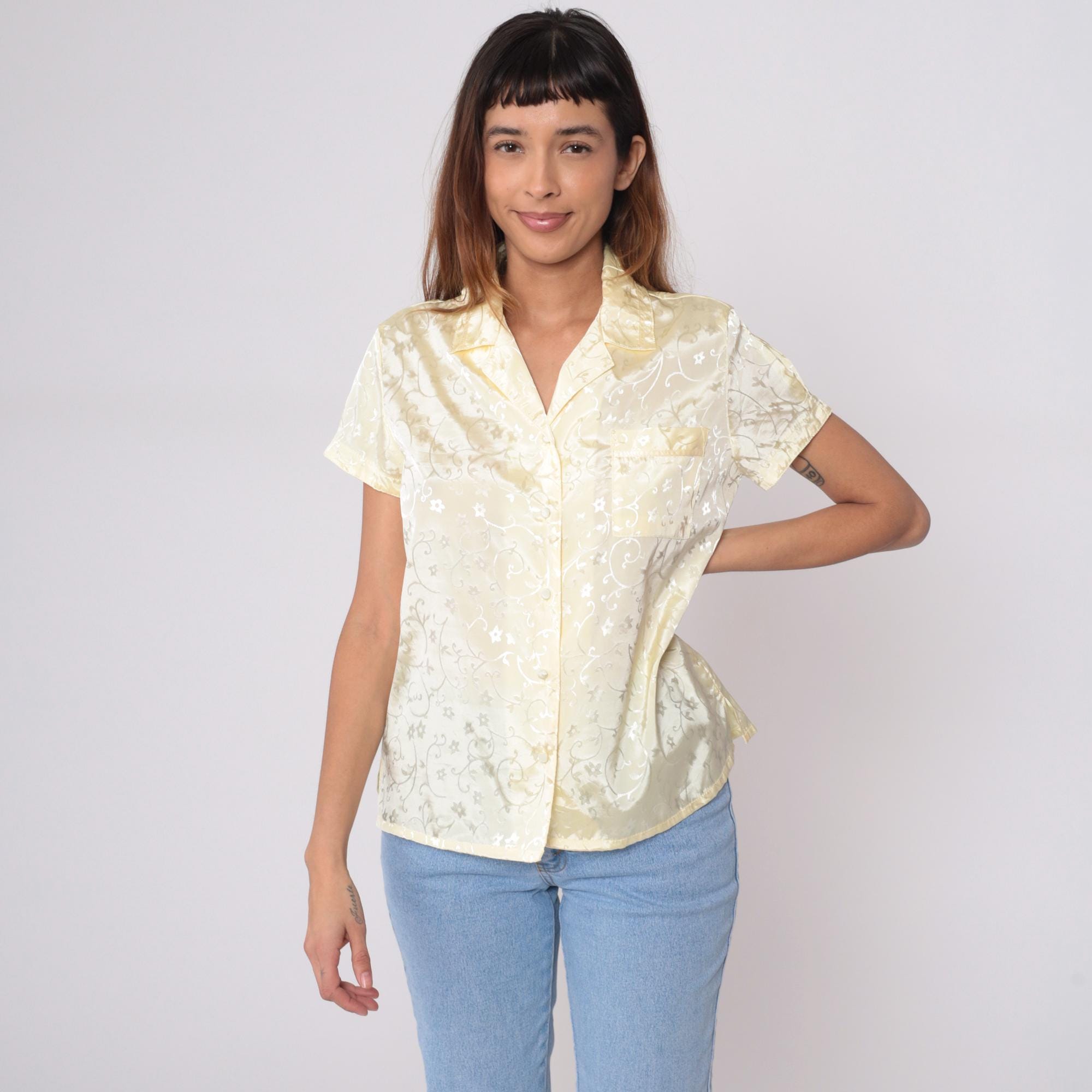 90s pale yellow button front shirt from cinema etoile with allover jacquard floral and scroll pattern. Collared neckline, short sleeves, front button closure with matching buttons.