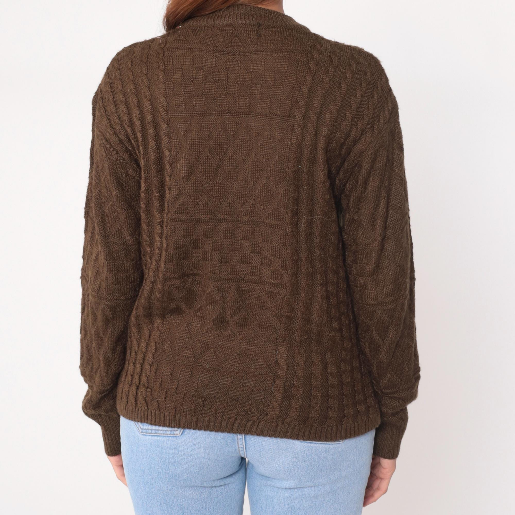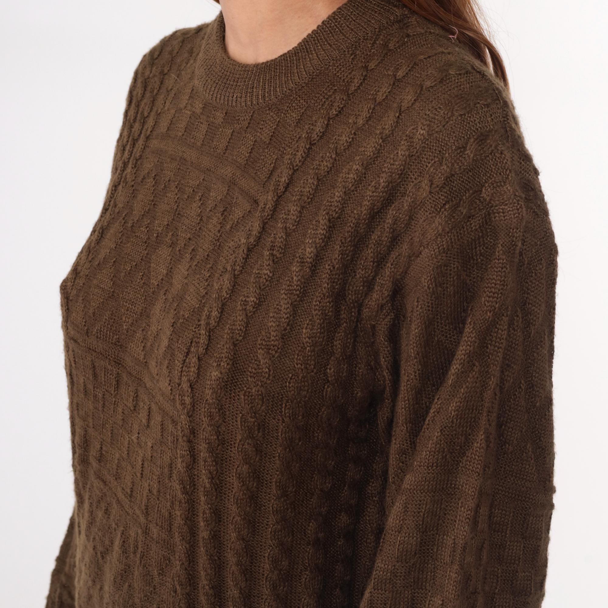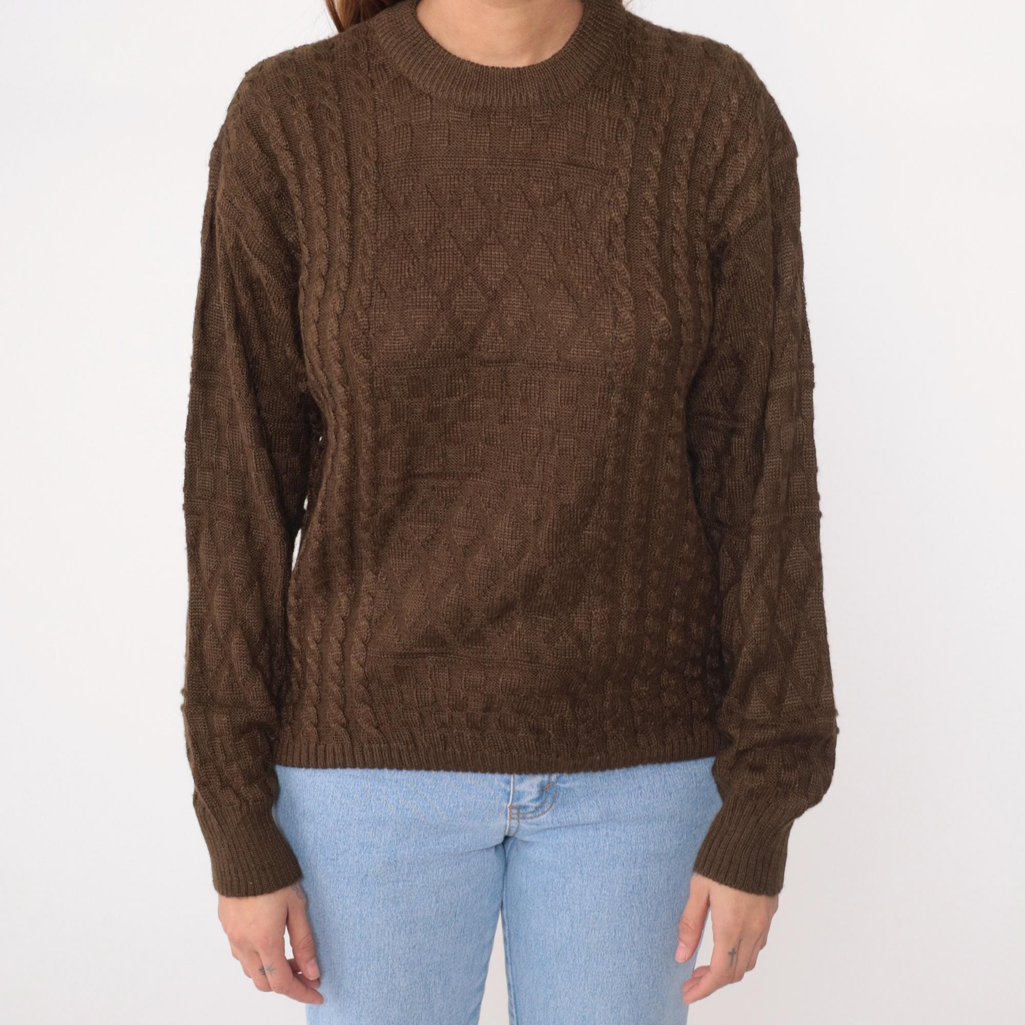 90s brown cable knit sweater from wei wah with crew neckline and ribbed trim at collar, cuffs, and hem. Textured cable knit pattern across front, back, and sleeves creates vertical detailing throughout the garment.