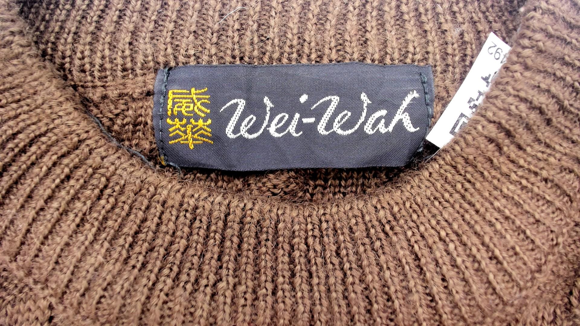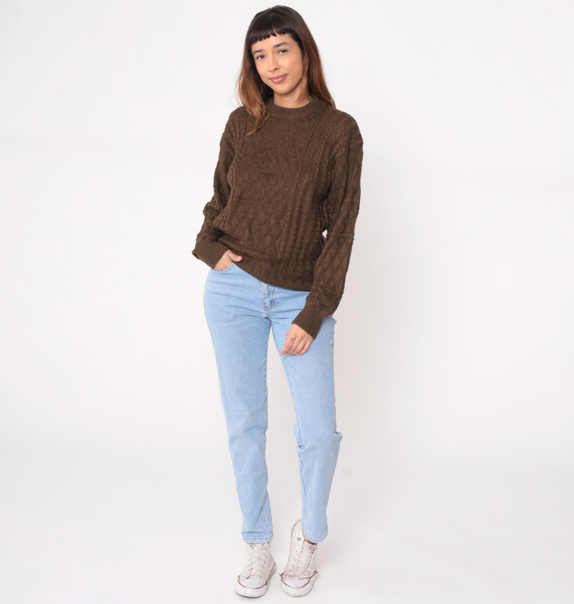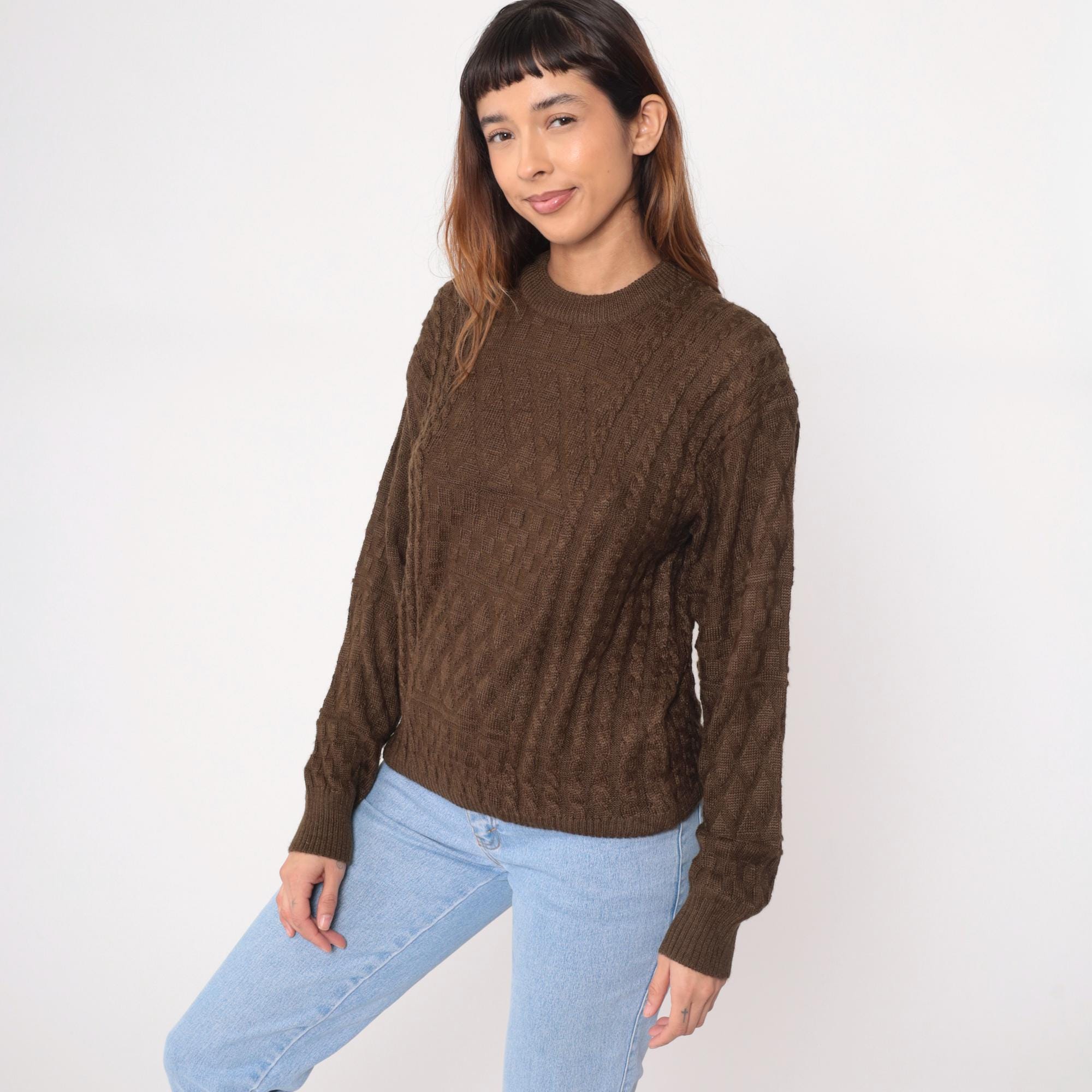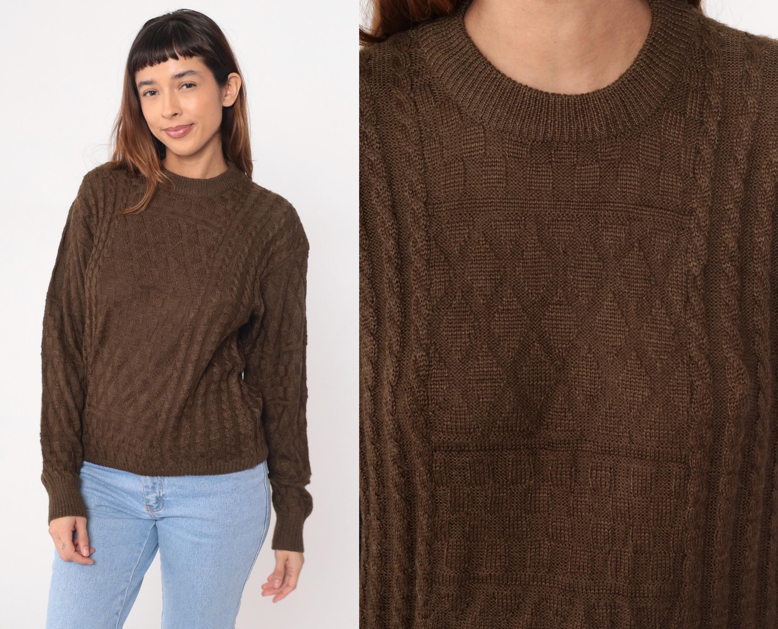 90s brown cable knit sweater from wei wah with crew neckline and ribbed trim at collar, cuffs, and hem. Textured cable knit pattern across front, back, and sleeves creates vertical detailing throughout the garment.
