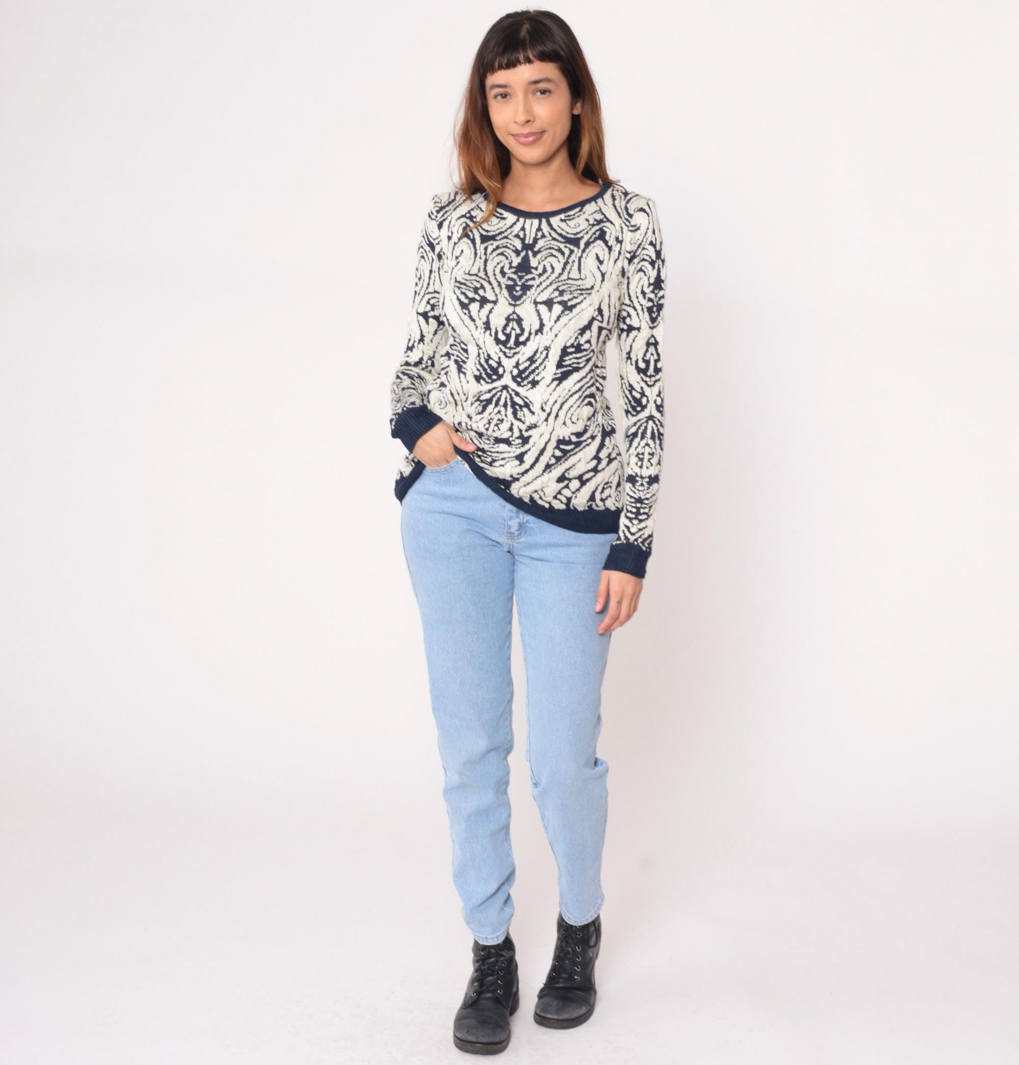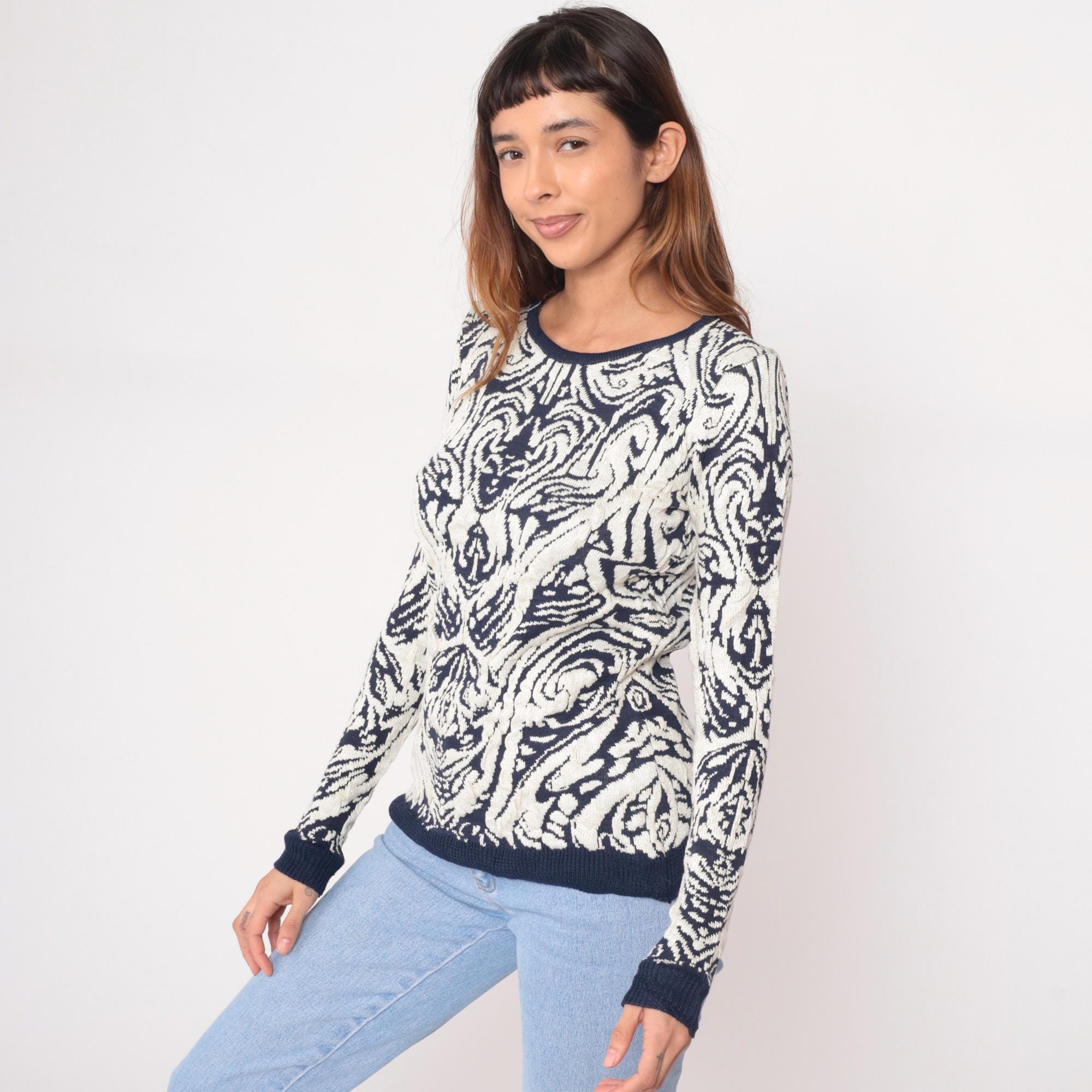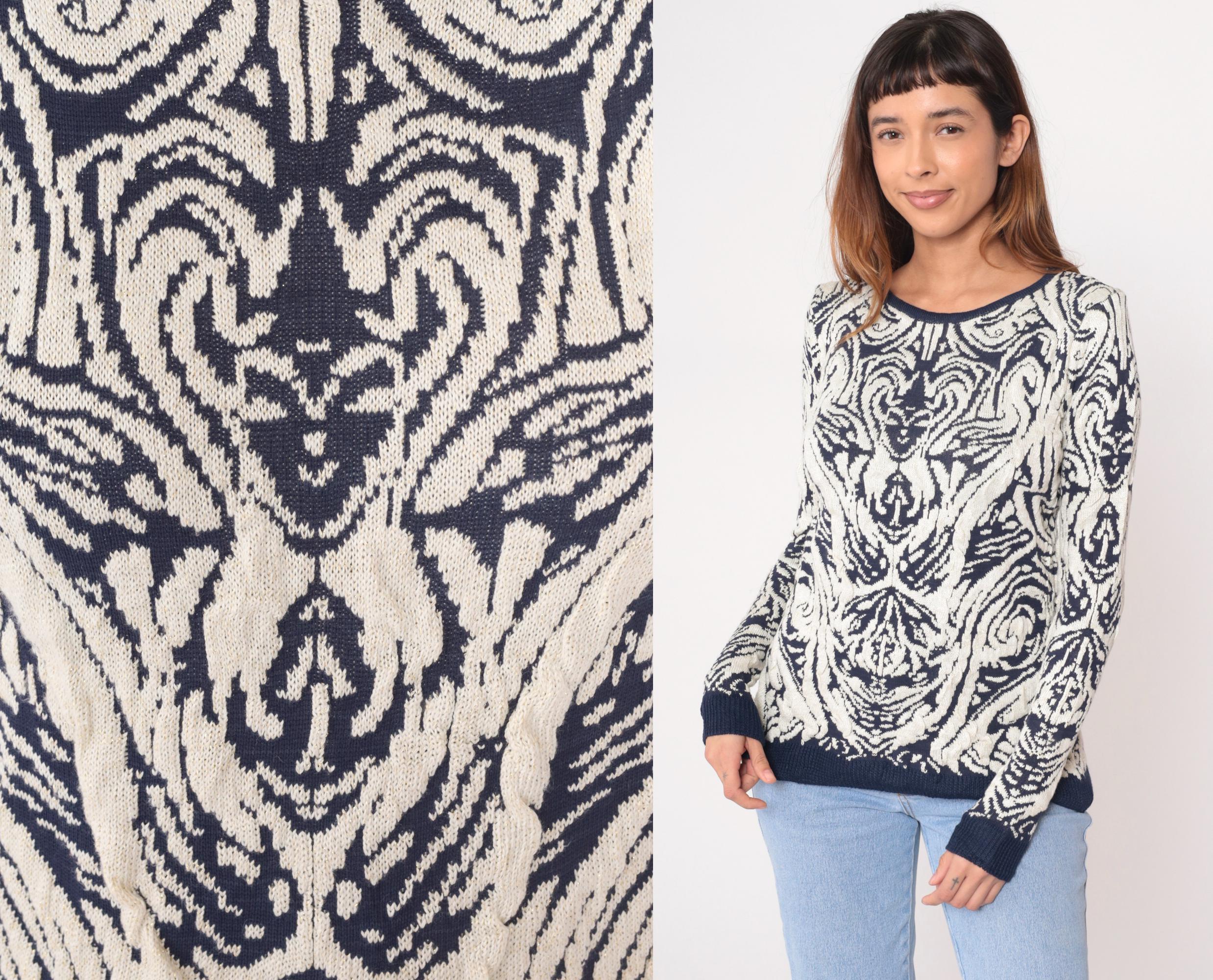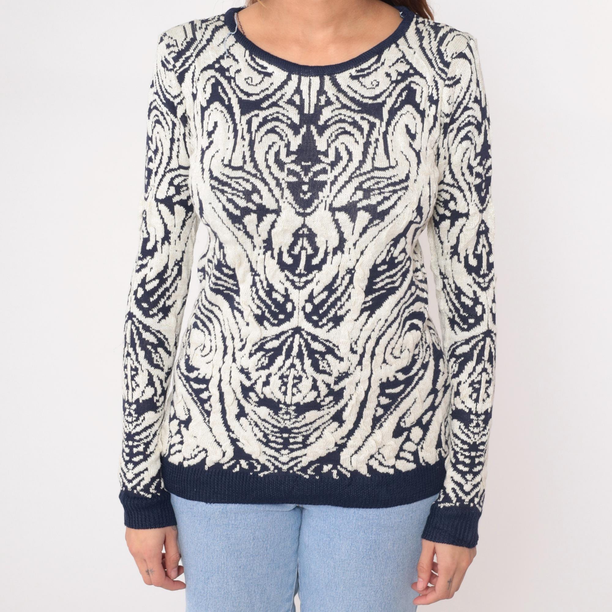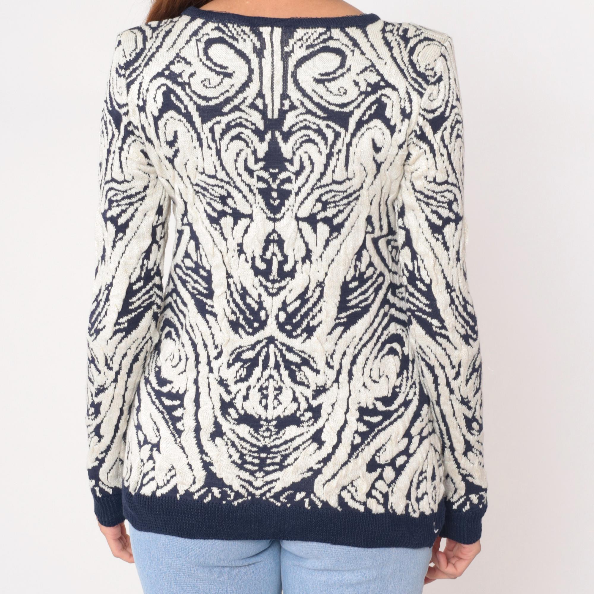 90s navy and cream knit sweater with baroque-style decorative pattern throughout. Crew neckline, long sleeves, ribbed trim at neck, cuffs, and hem. Symmetrical ornamental design with swirls and scrollwork across the body and sleeves.