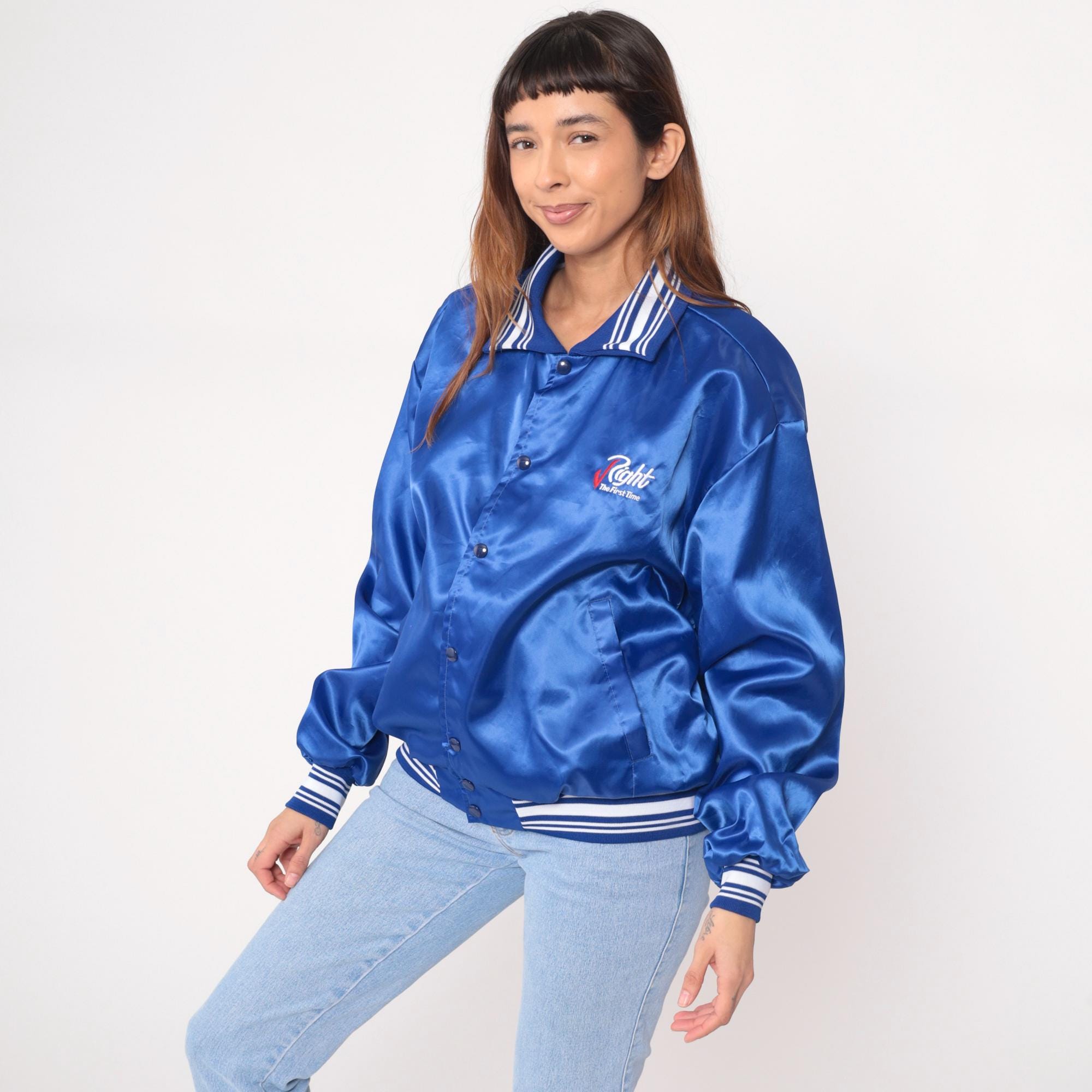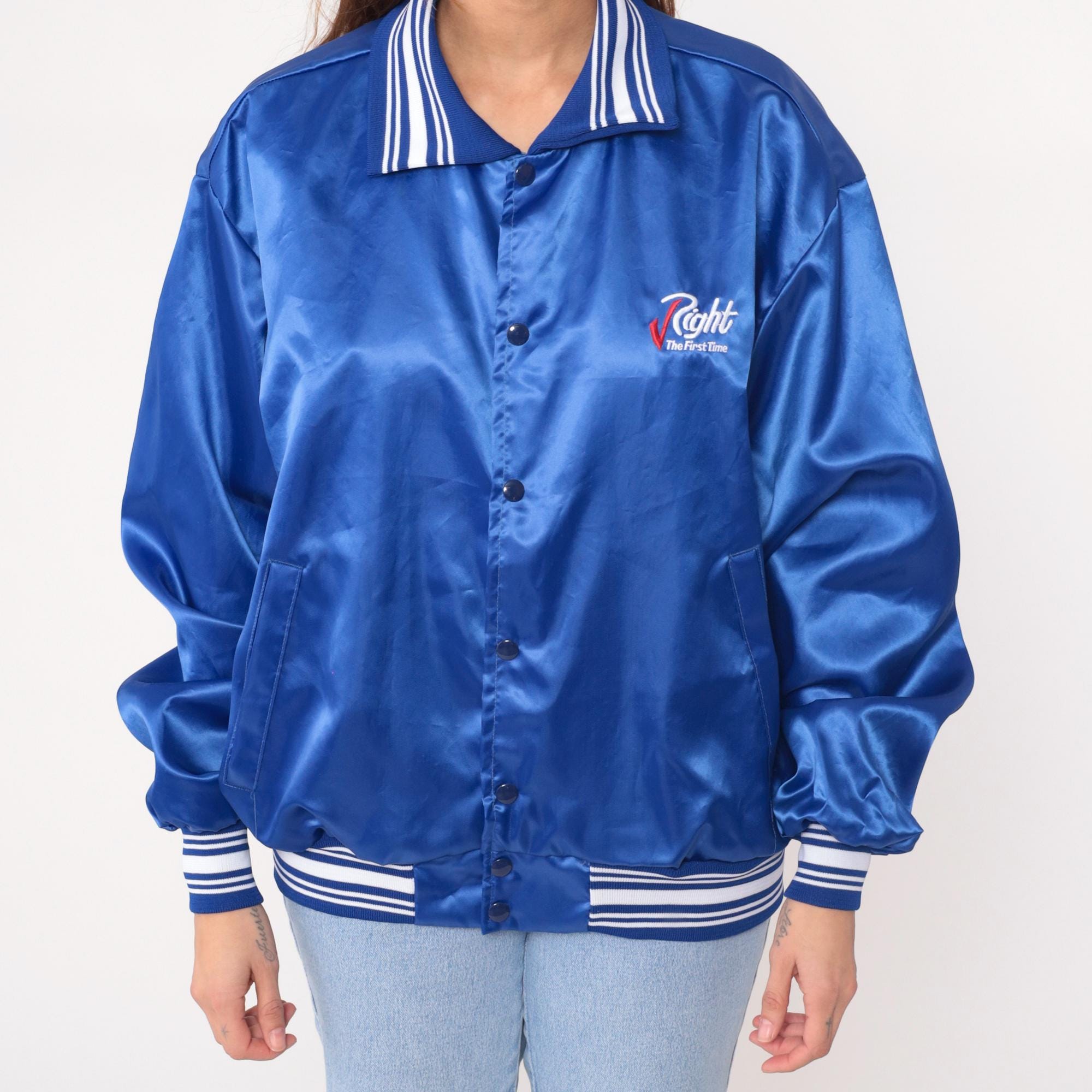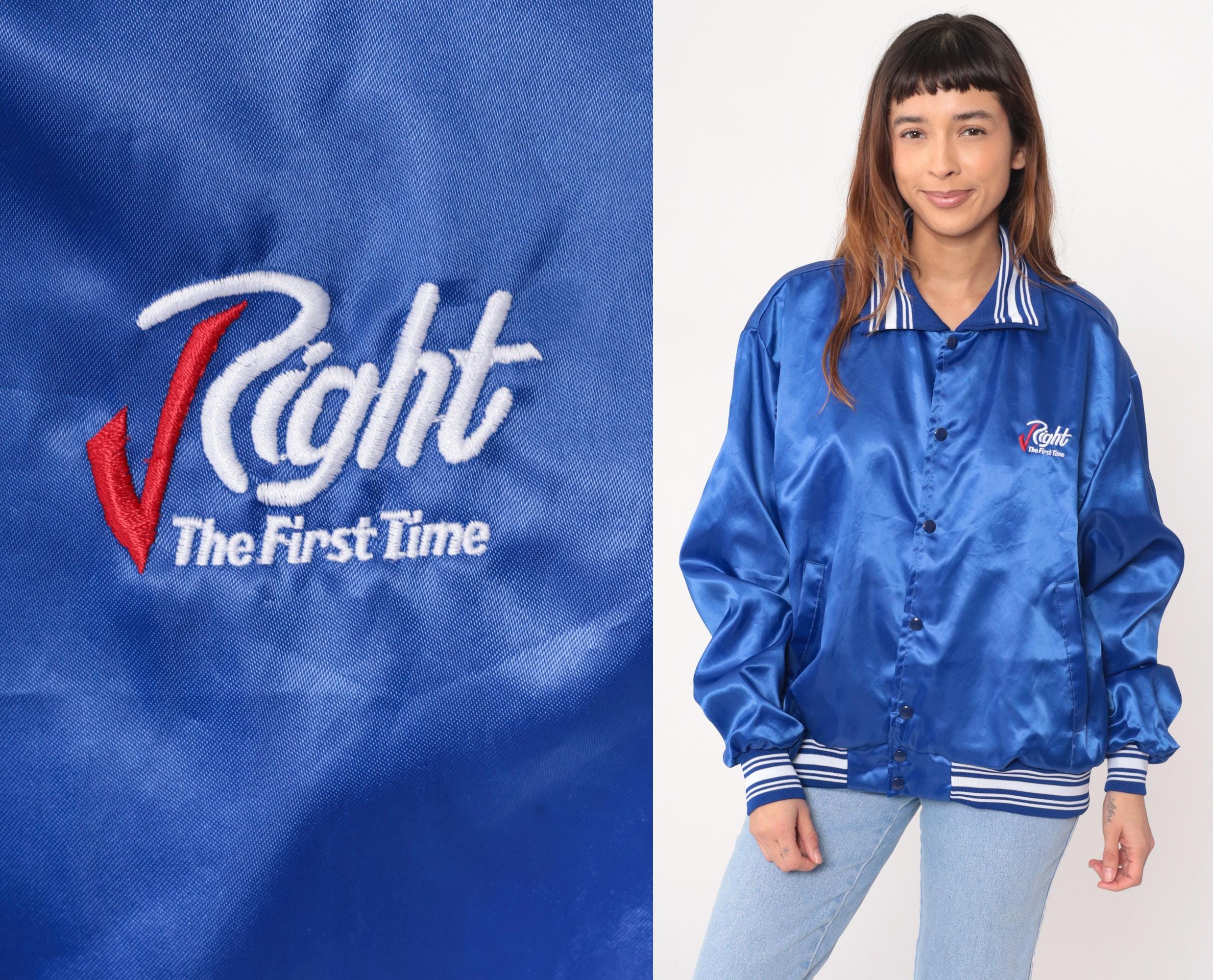 90s royal blue satin jacket with white striped ribbed collar, cuffs, and hem. Snap button front closure with "Right The First Time" embroidered logo on left chest. Side pockets and relaxed fit silhouette.