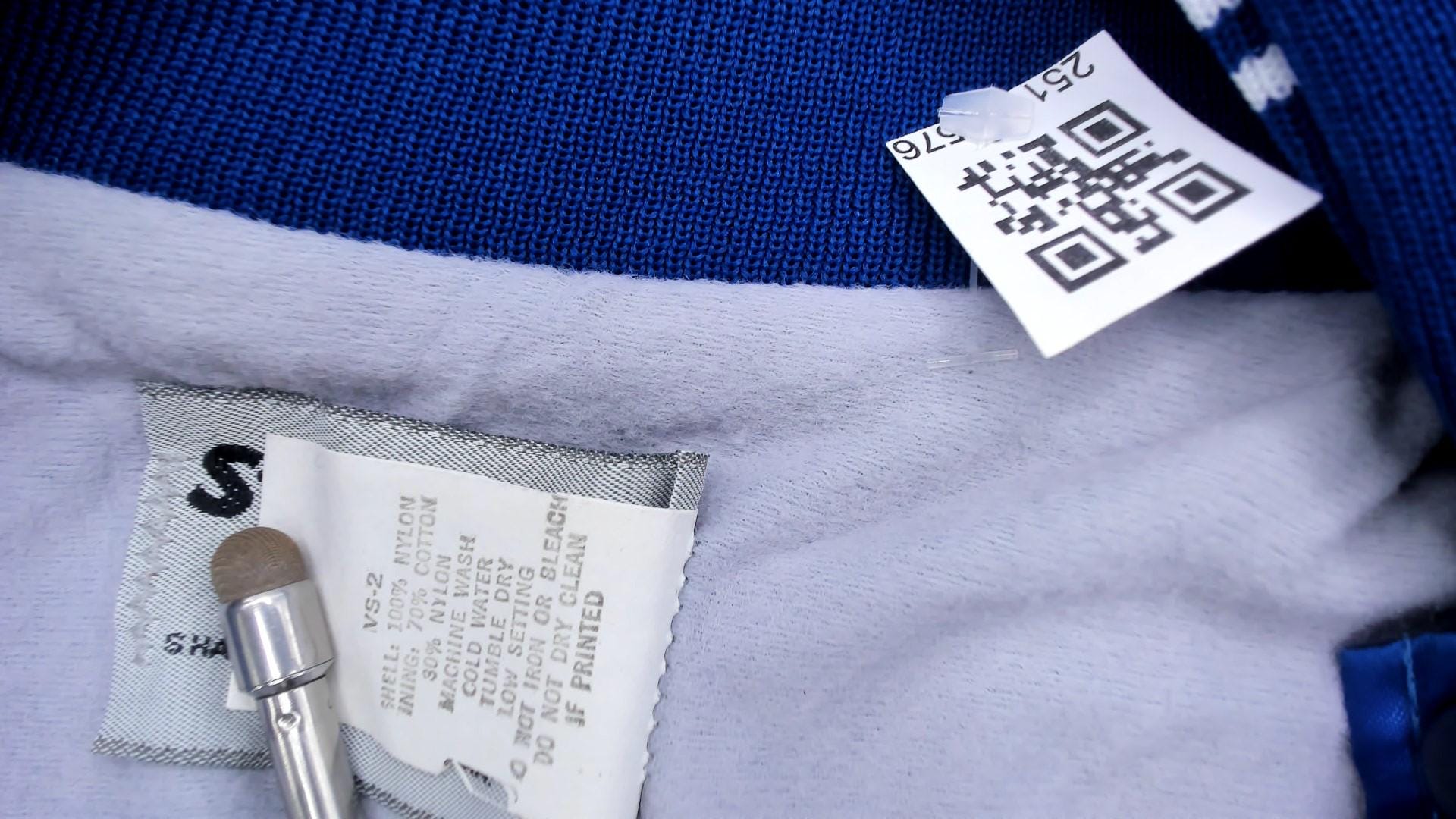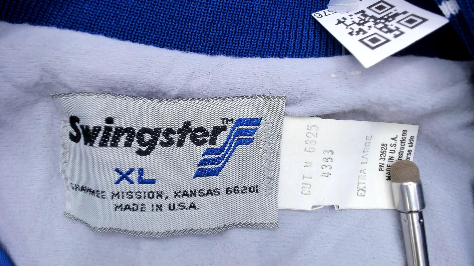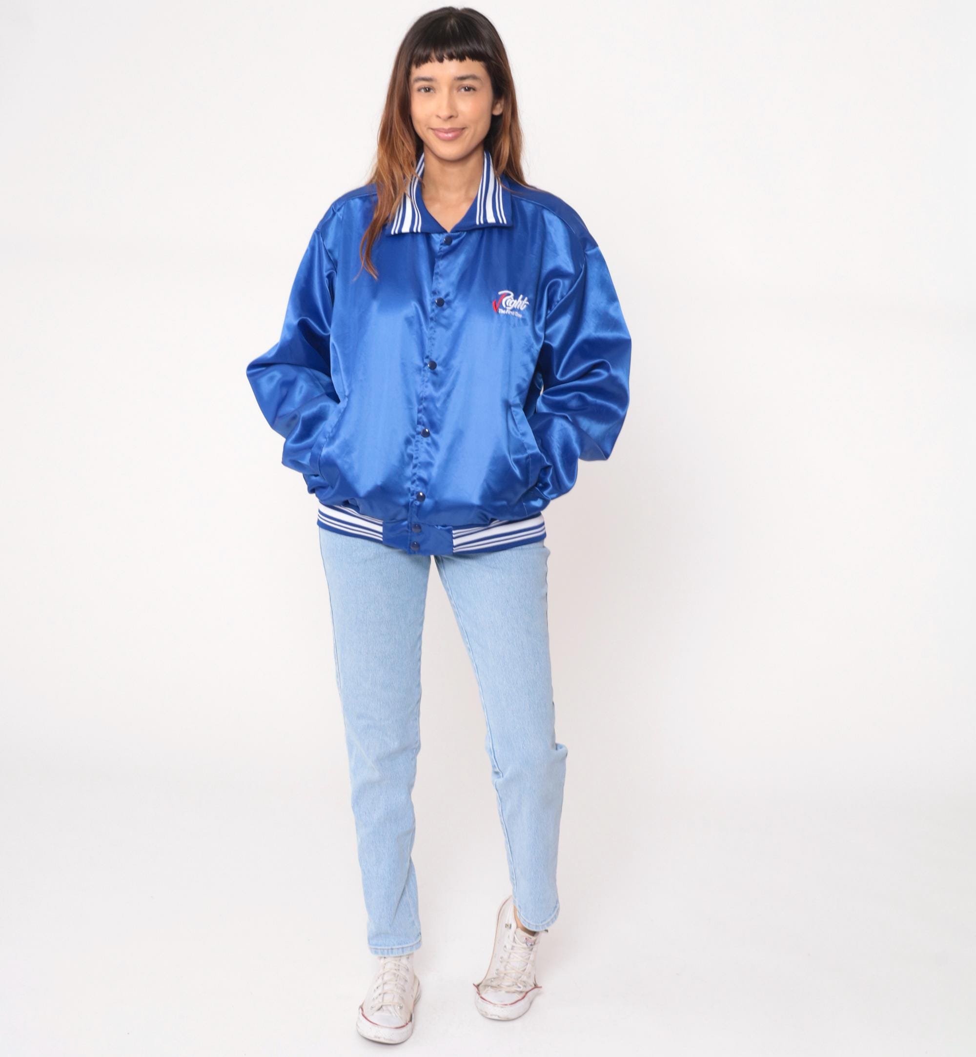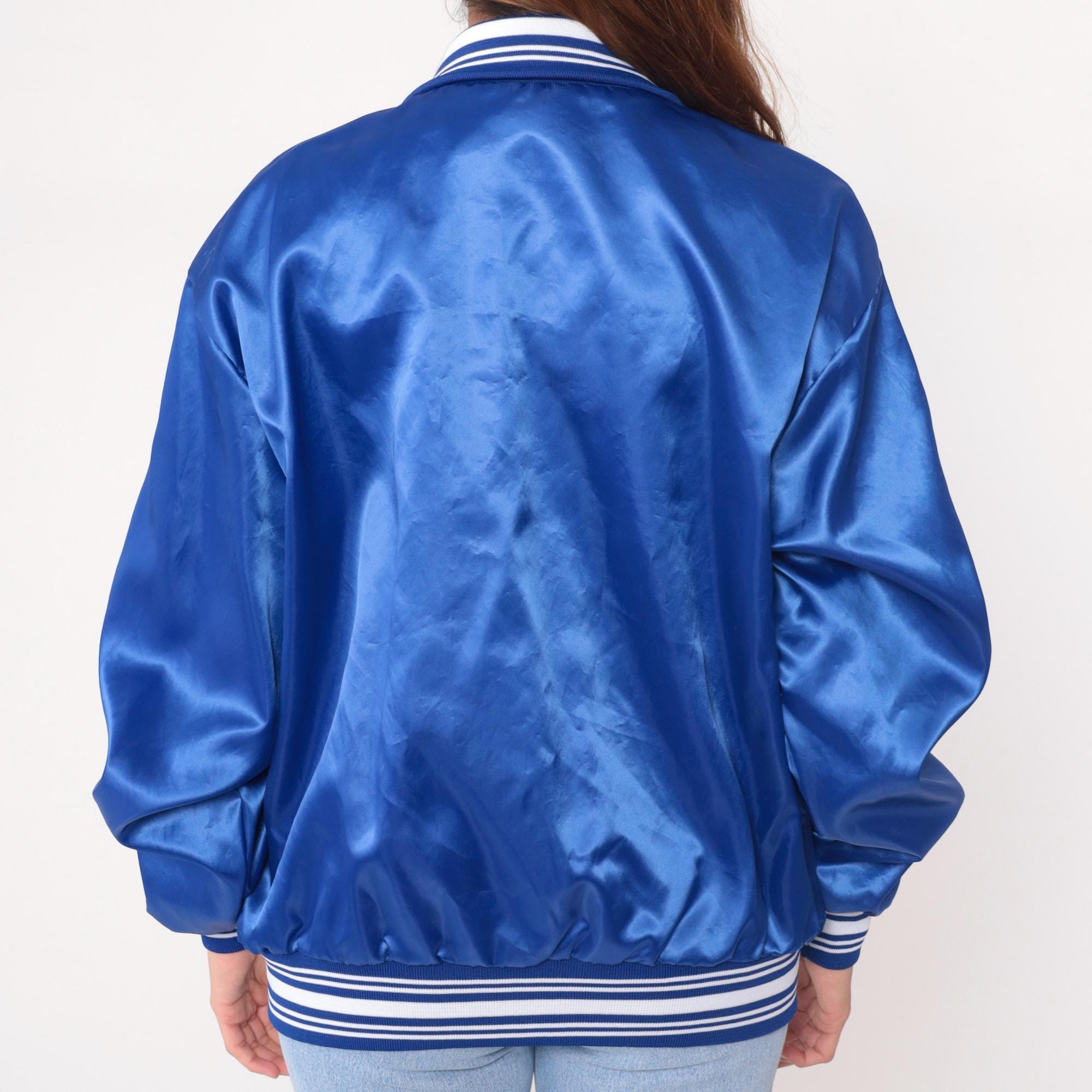 90s royal blue satin jacket with white striped ribbed collar, cuffs, and hem. Snap button front closure with "Right The First Time" embroidered logo on left chest. Side pockets and relaxed fit silhouette.