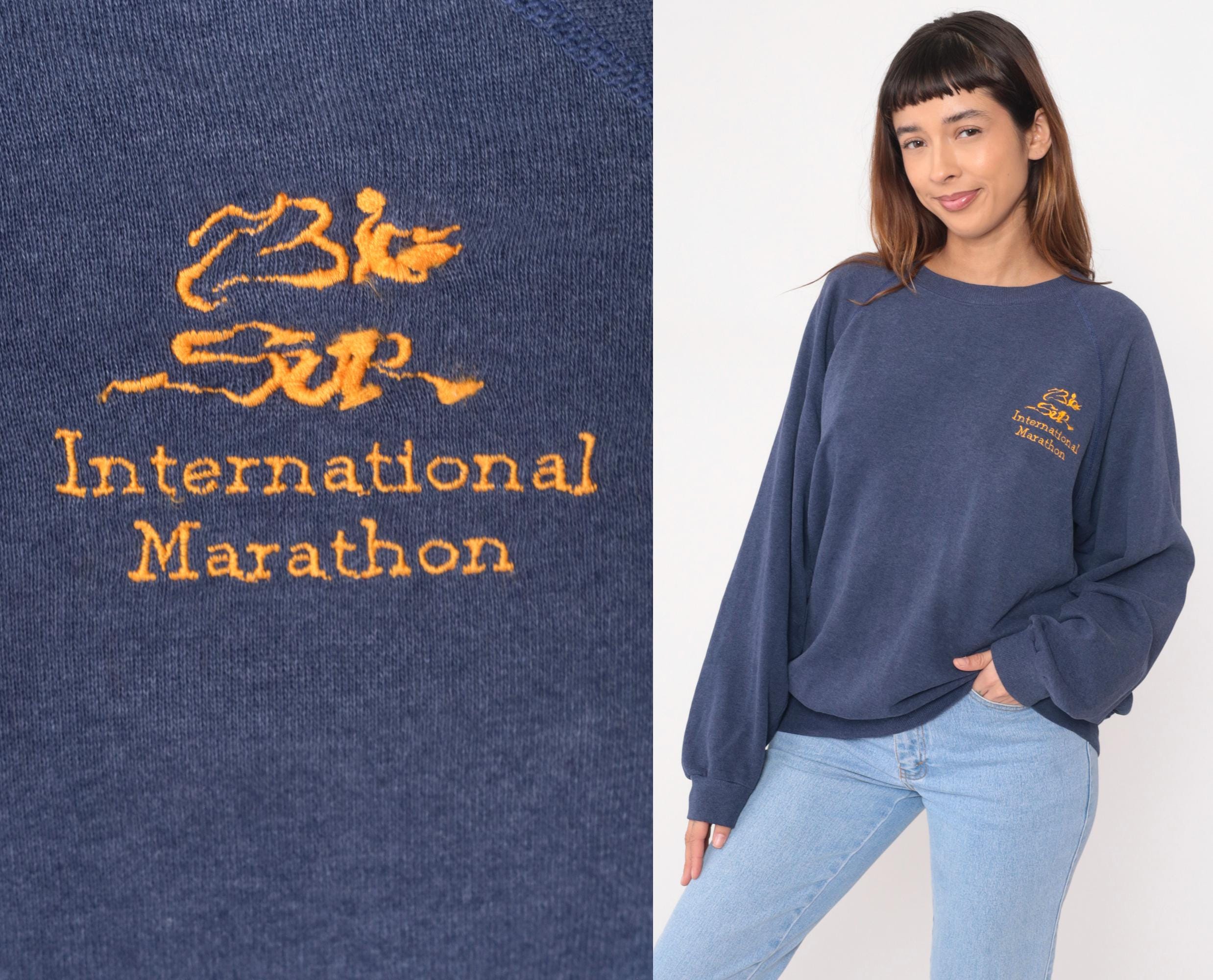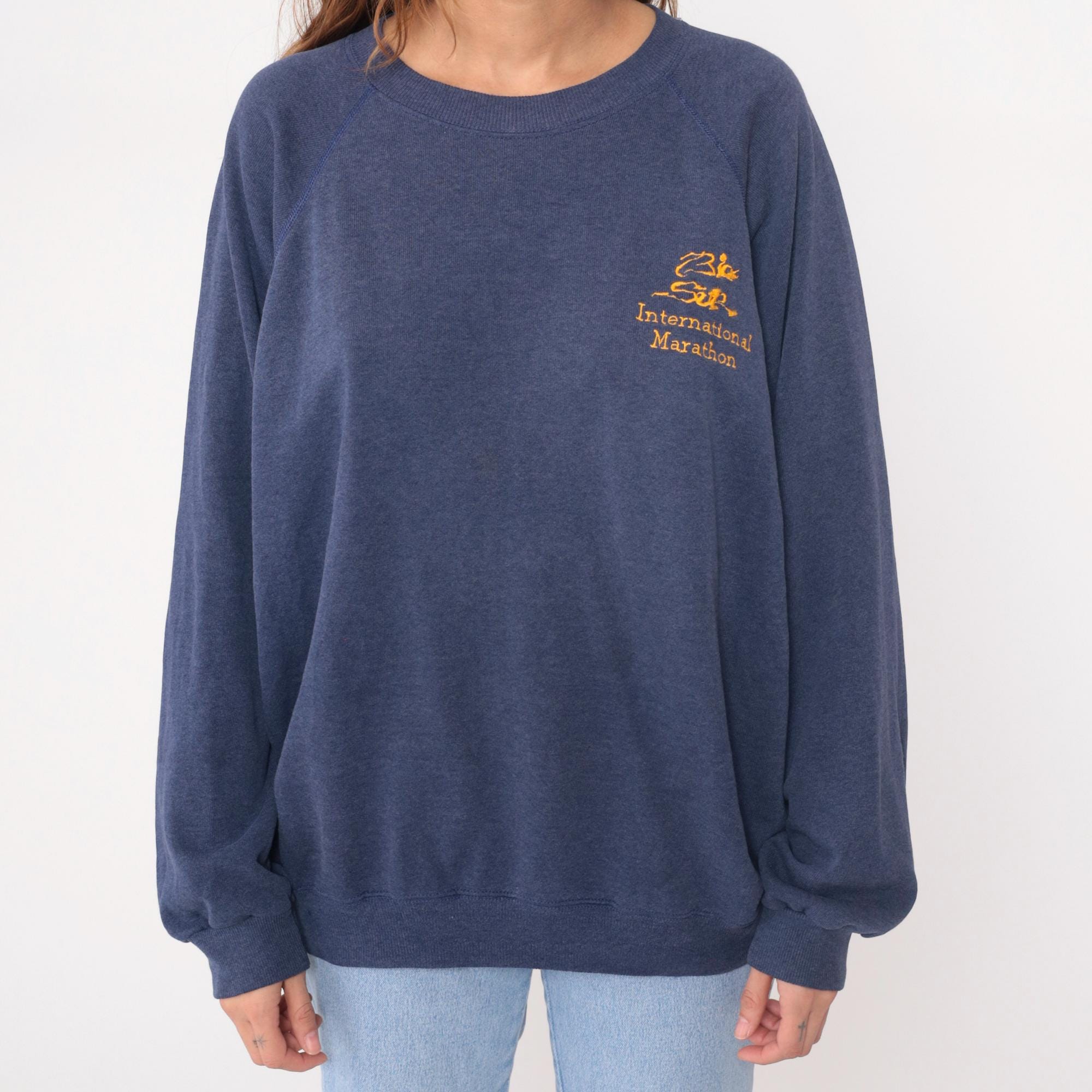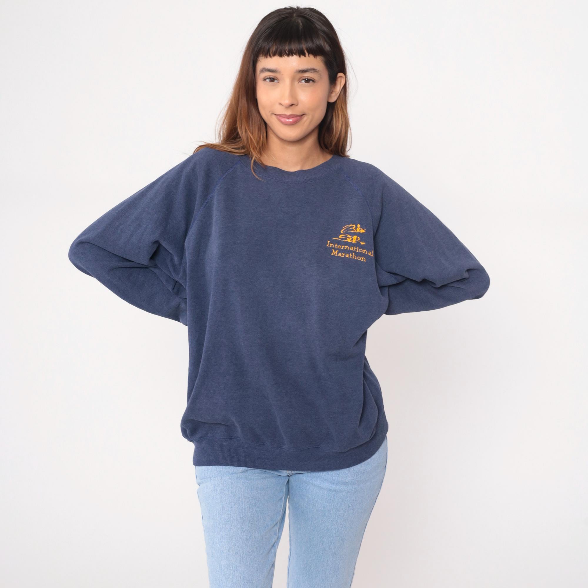 90s navy blue heathered sweatshirt from Hanes with embroidered Big Sur International Marathon design on the left chest in gold thread, featuring two runner figures. Raglan sleeves, crew neckline with ribbed collar, ribbed cuffs and hem.