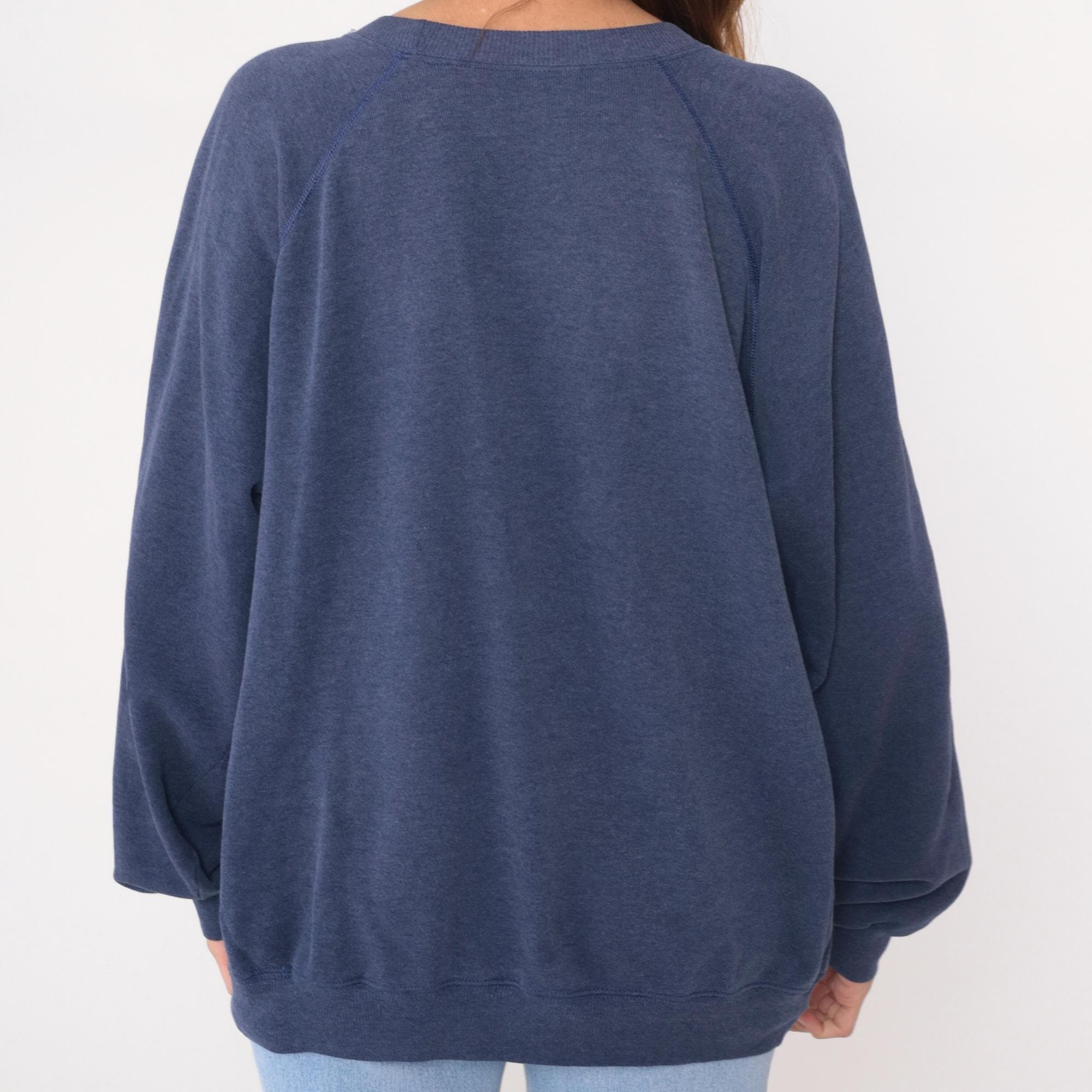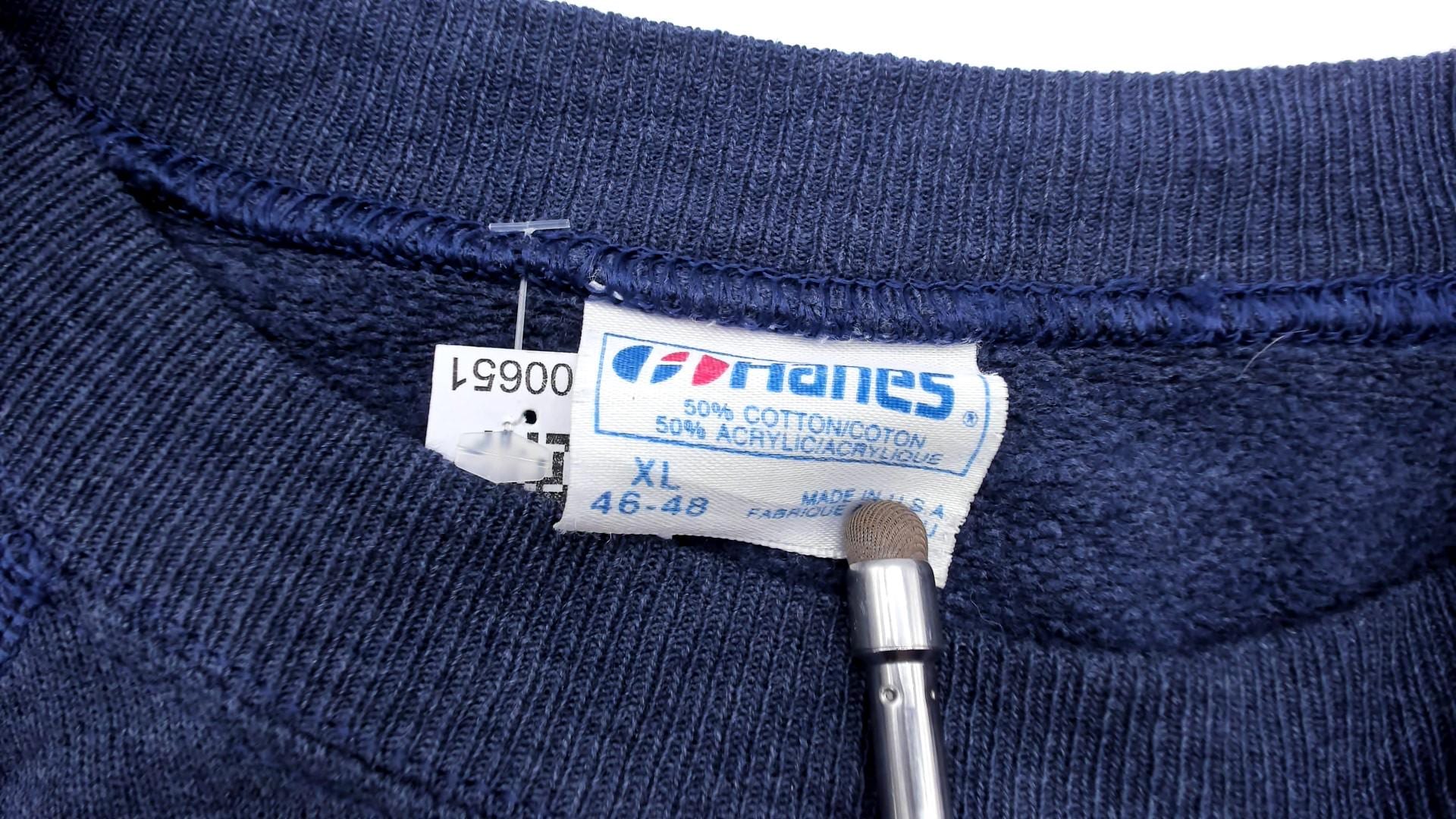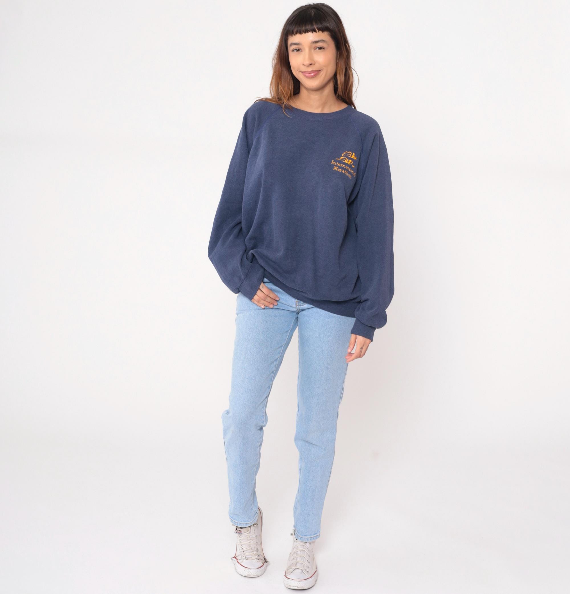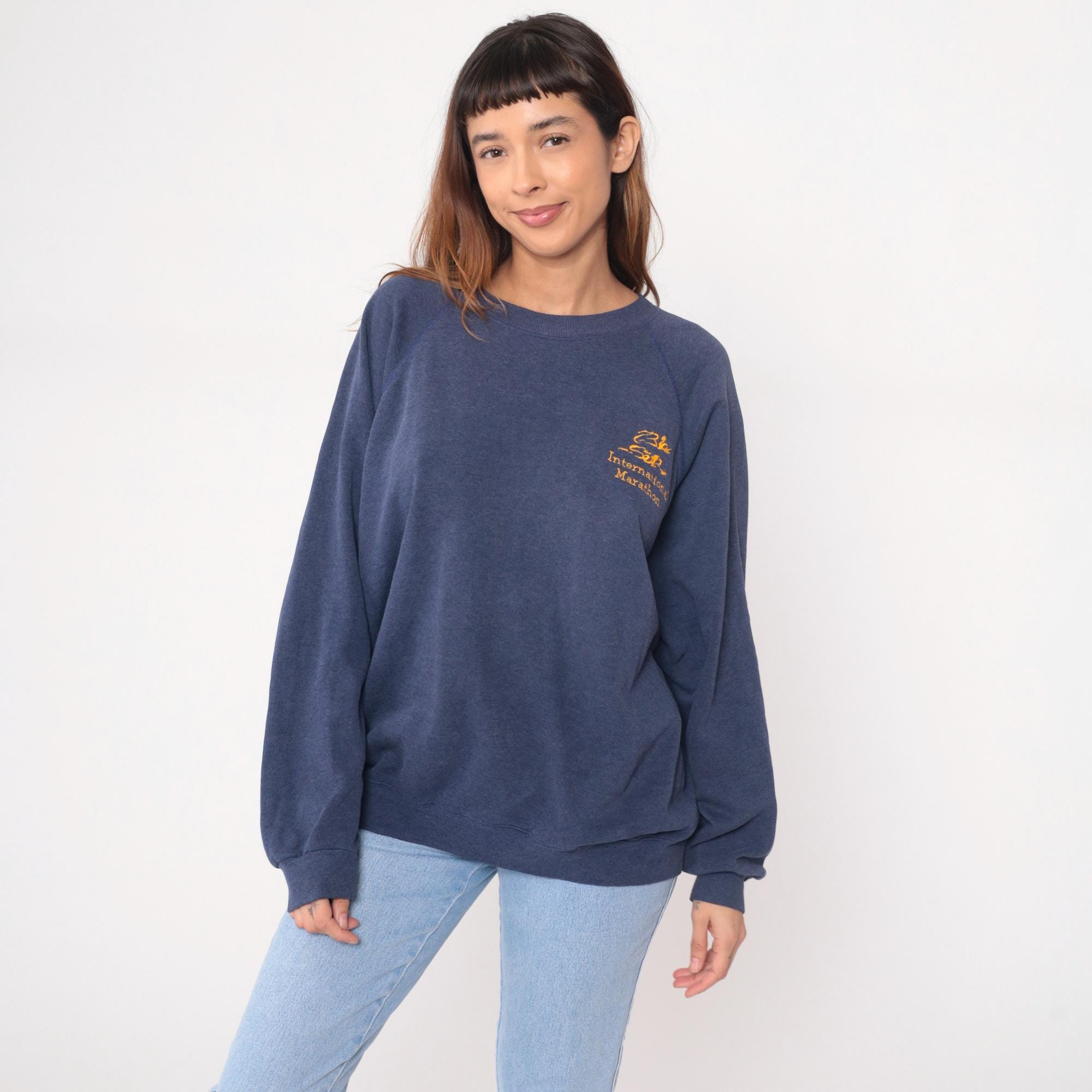 90s navy blue heathered sweatshirt from Hanes with embroidered Big Sur International Marathon design on the left chest in gold thread, featuring two runner figures. Raglan sleeves, crew neckline with ribbed collar, ribbed cuffs and hem.