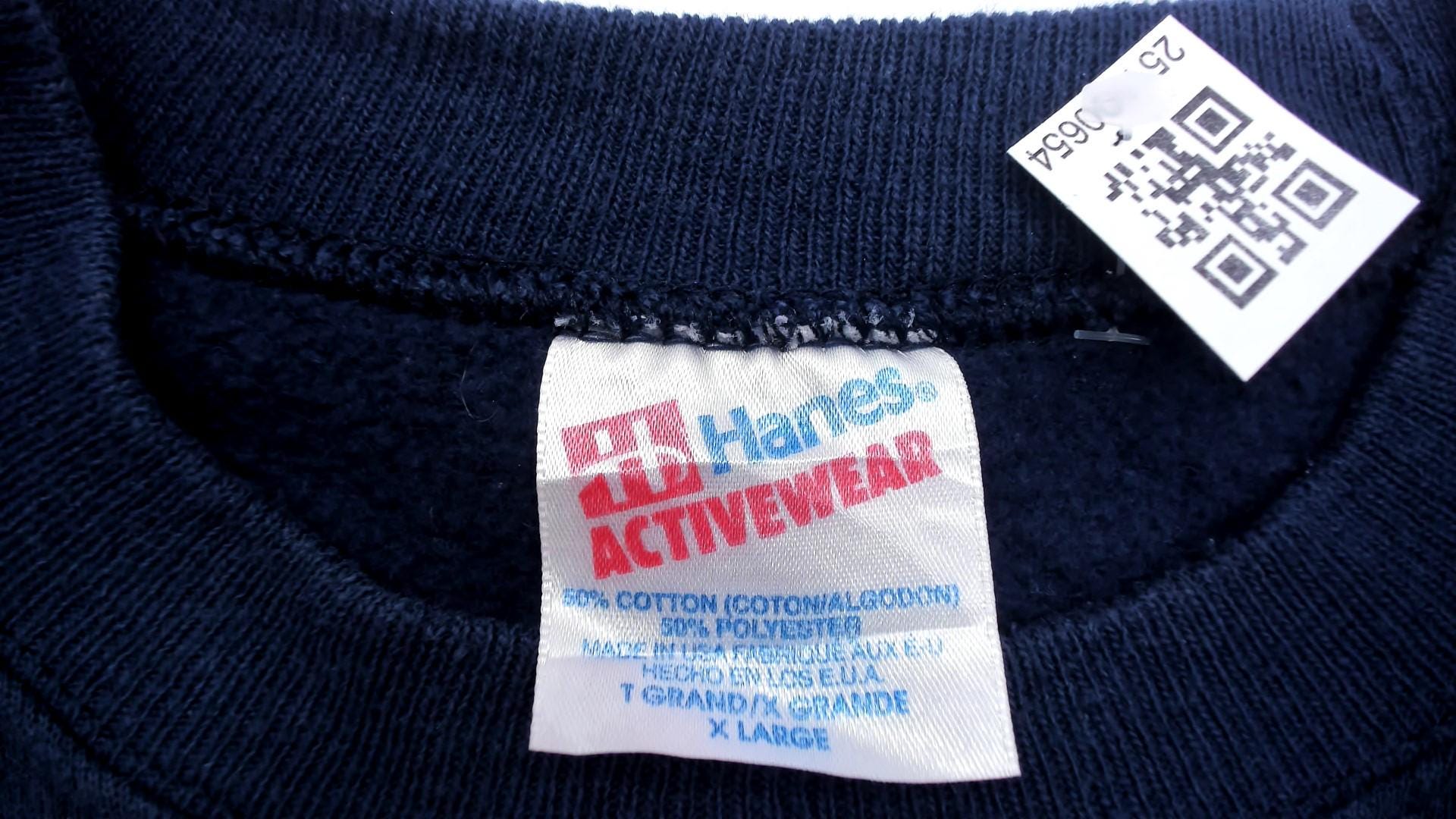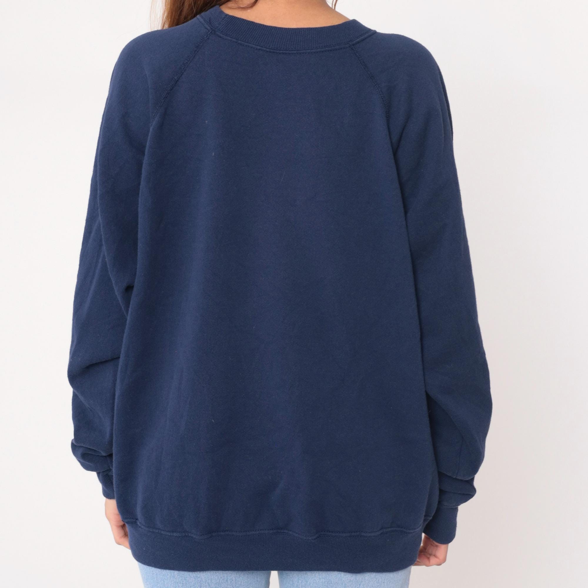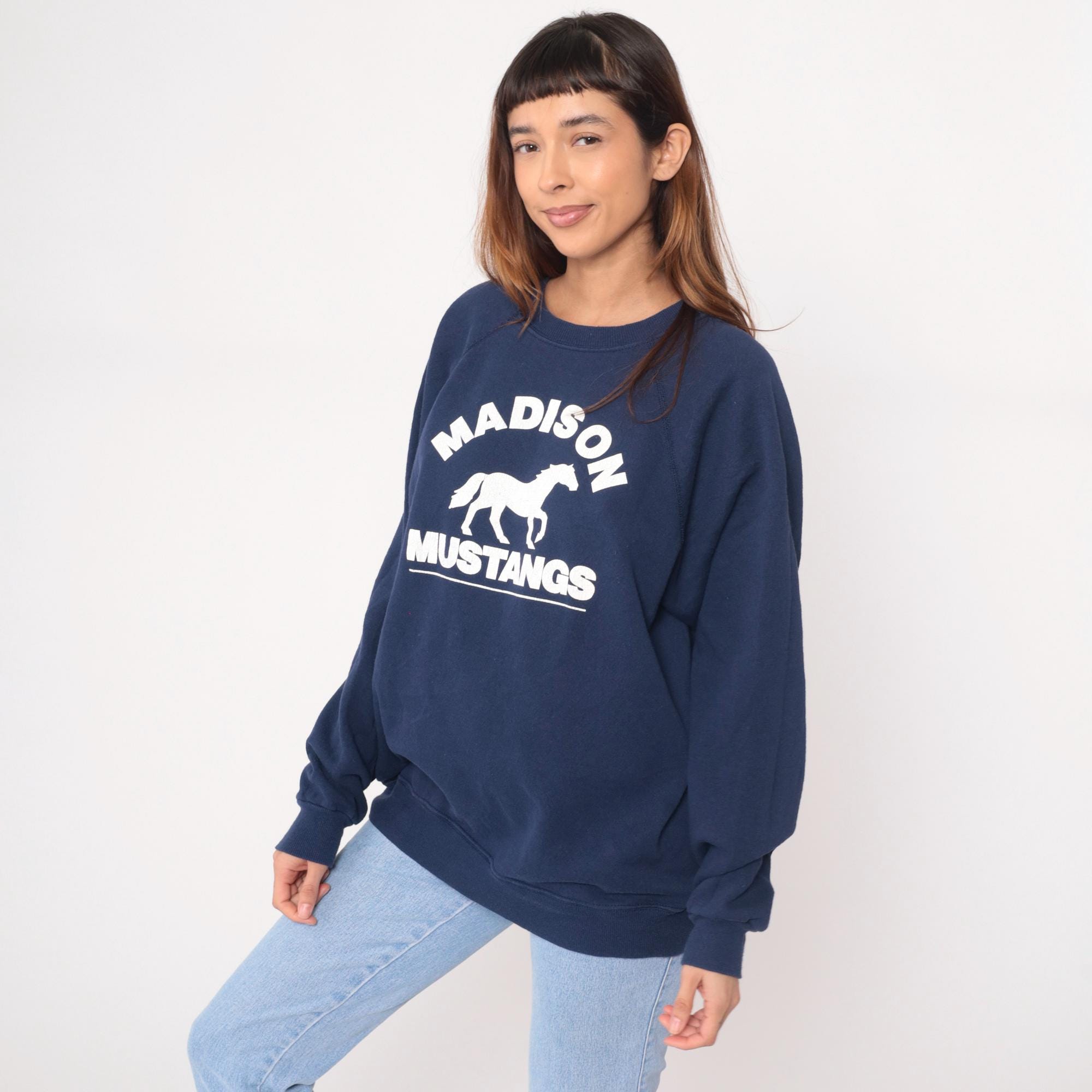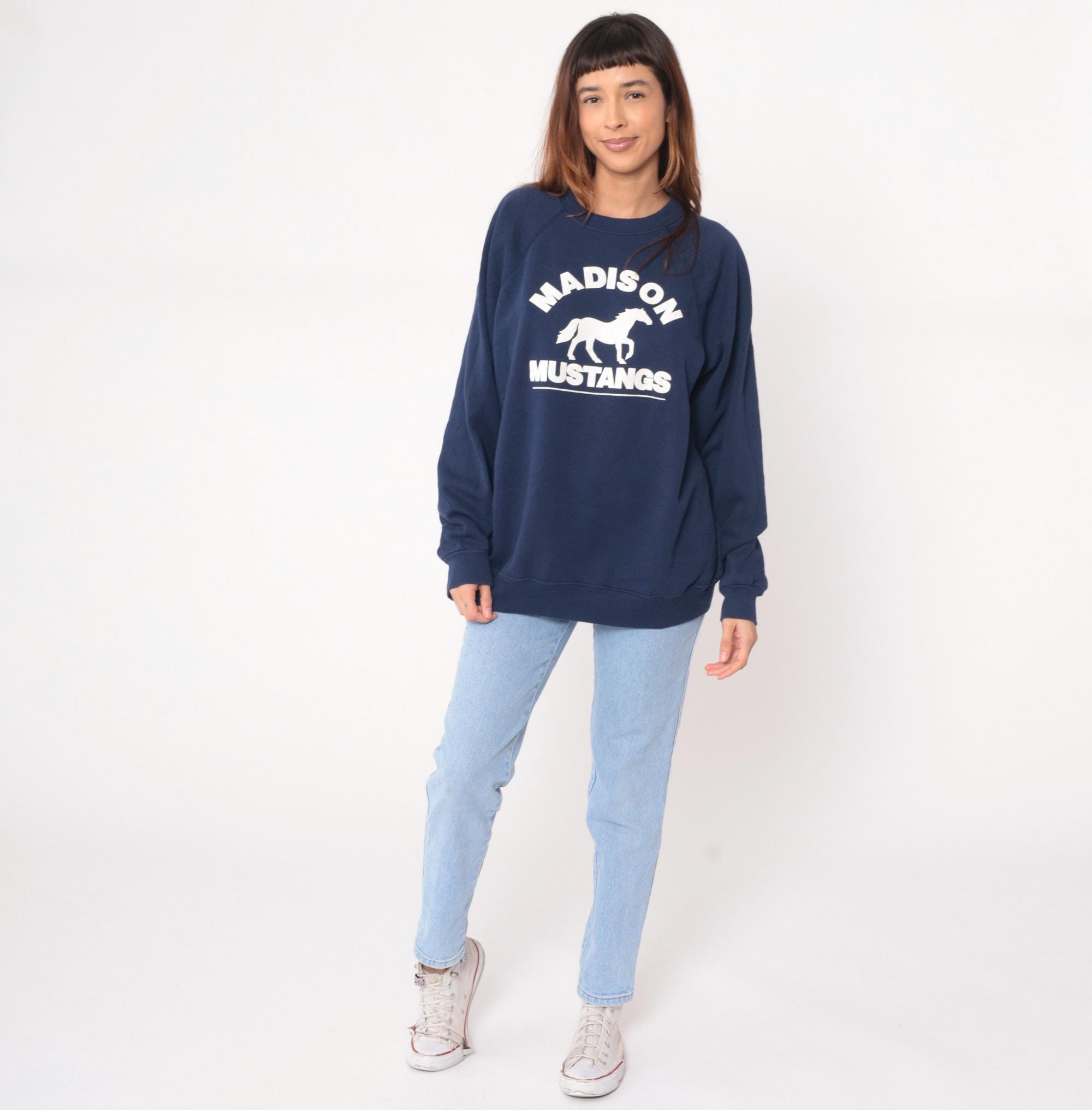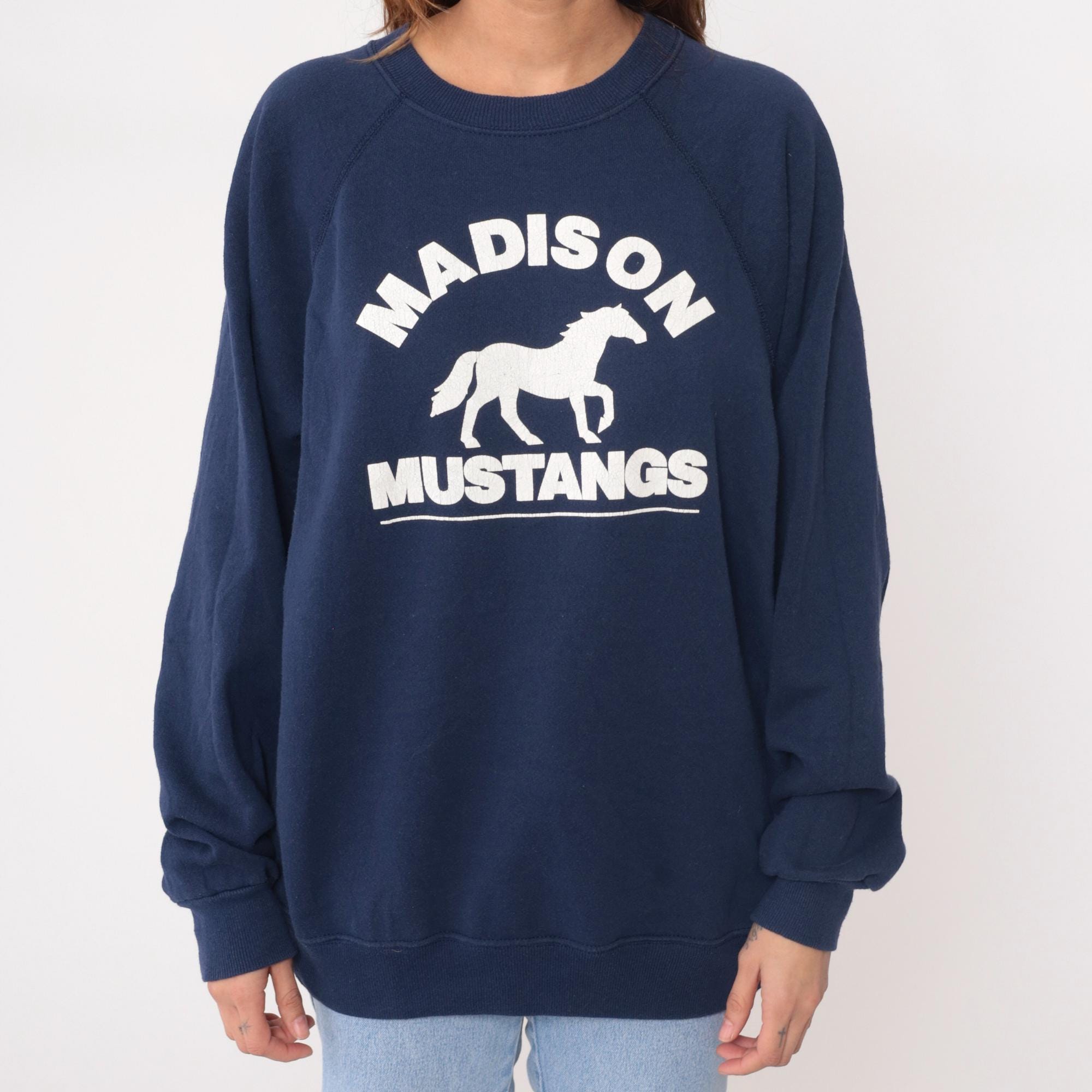 90s navy blue sweatshirt from Hanes with white Madison Mustangs graphic and horse silhouette across the chest. Crew neck with raglan sleeves and ribbed cuffs at collar, sleeves, and hem.