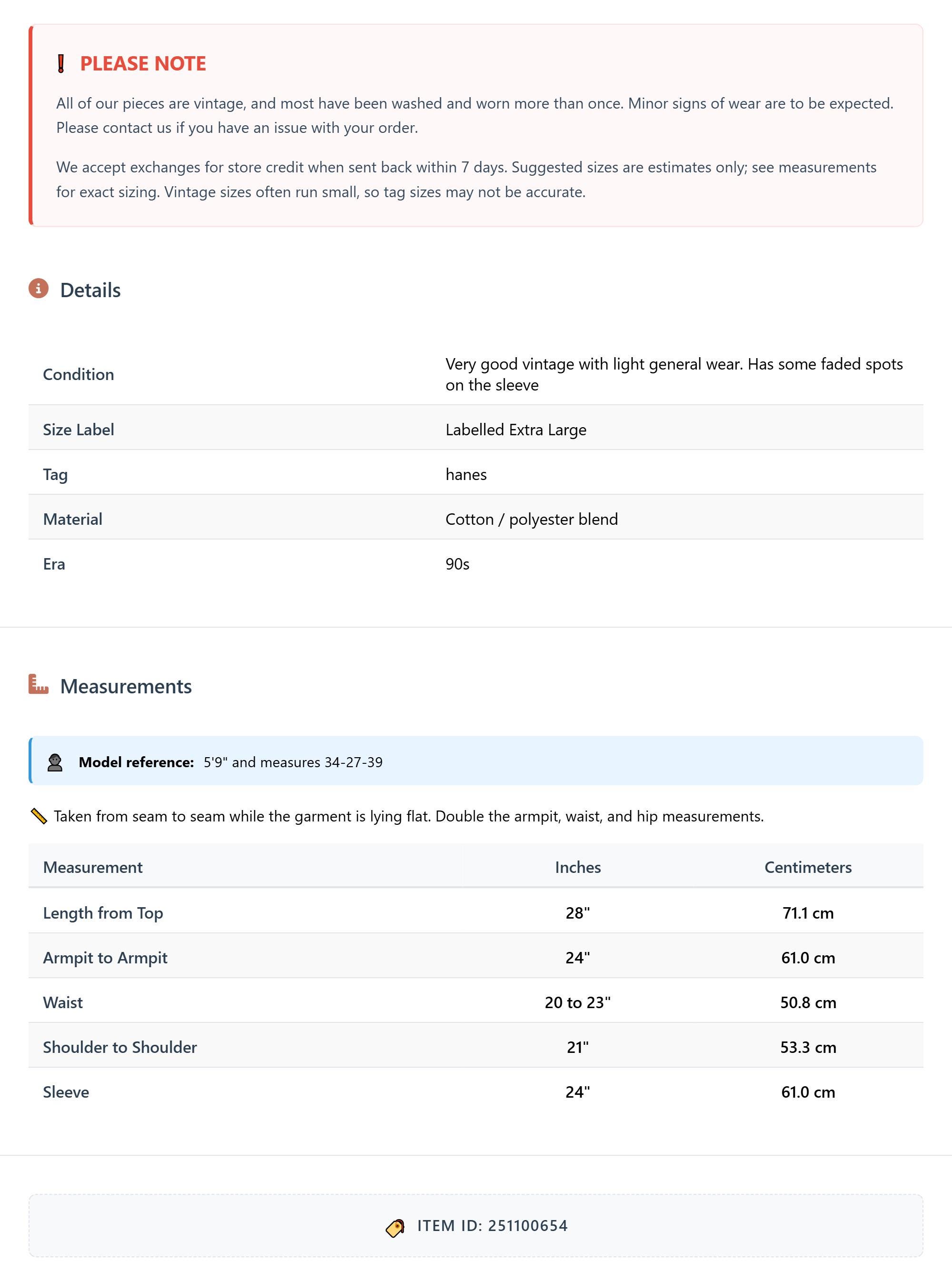 All of our pieces are vintage, and most have been washed and worn more than once. Minor signs of wear are to be expected. Please contact us if you have an issue with your order. We accept exchanges for store credit when sent back within 7 days.