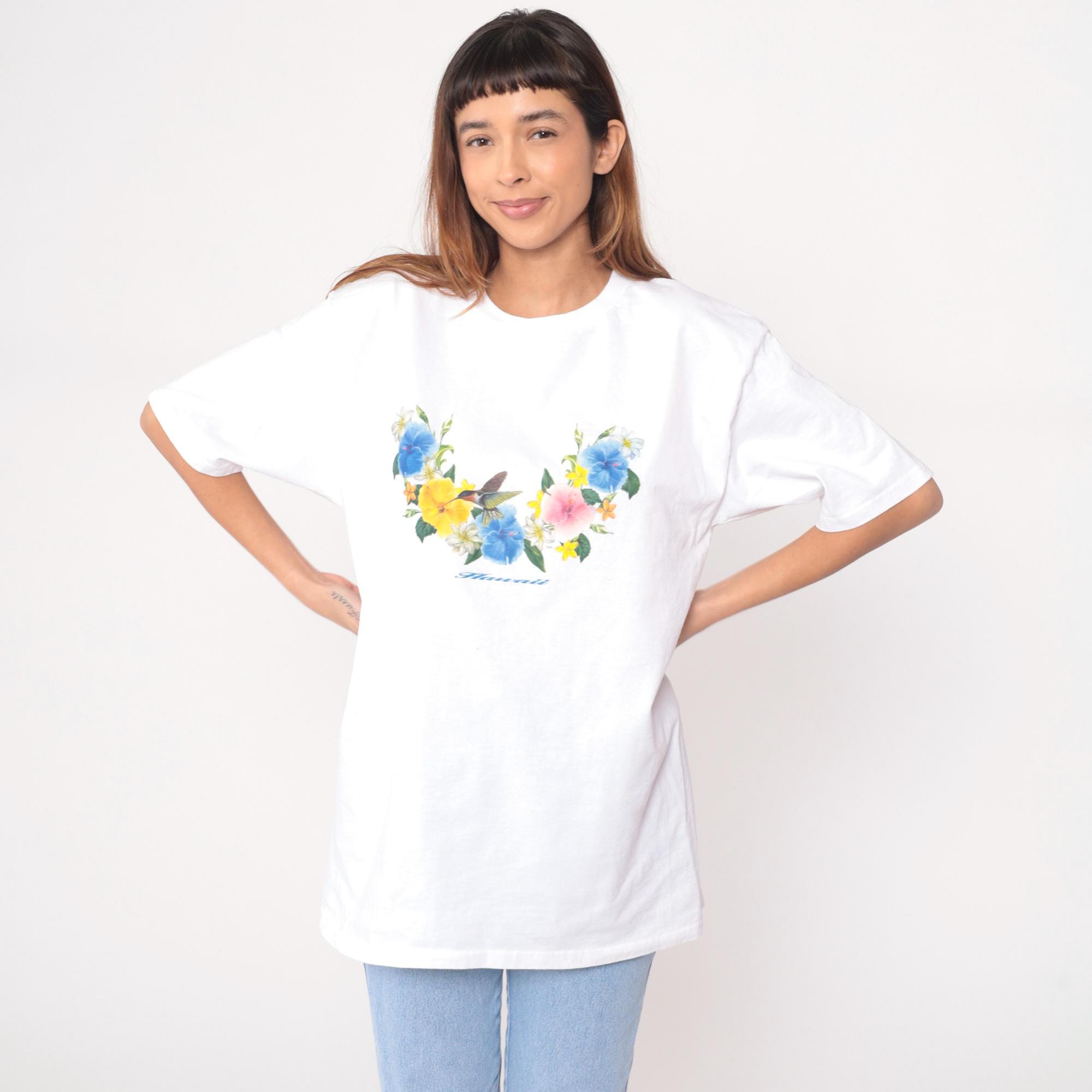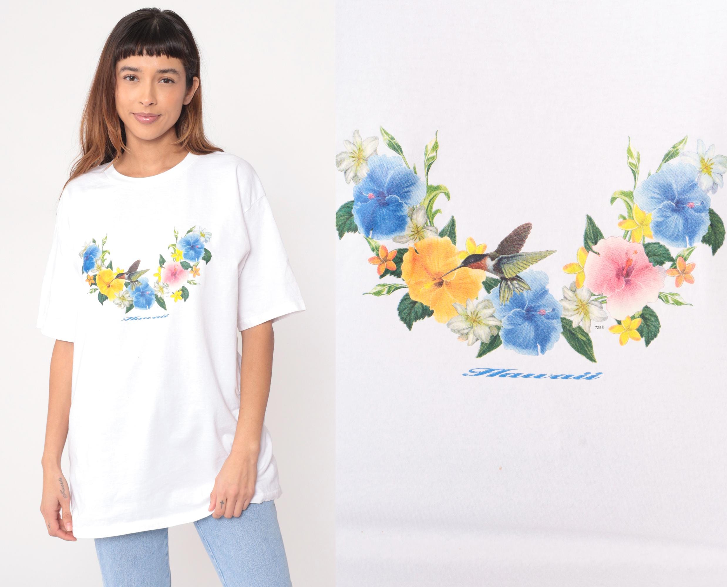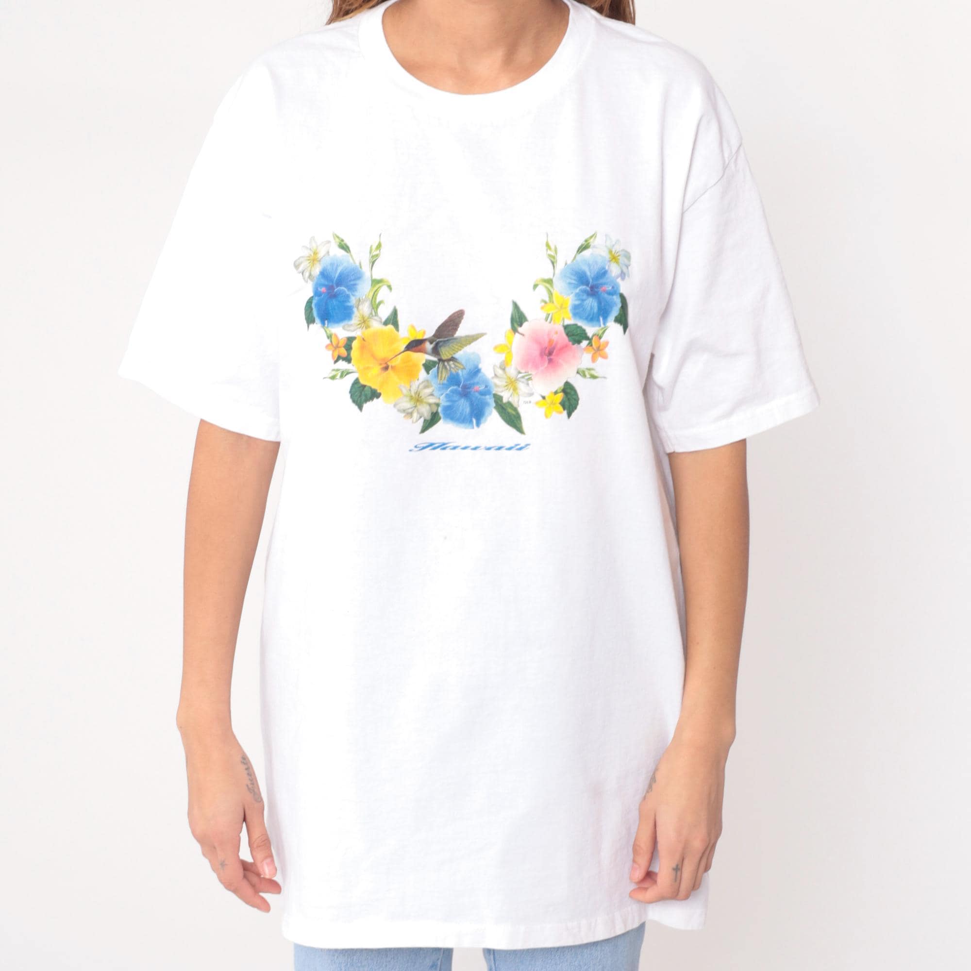 Y2K white Hawaiian graphic t-shirt from Wrangler with floral and hummingbird print across chest. Blue hibiscus flowers, yellow and pink blooms, white daisies, green leaves arranged around central hummingbird with "Hawaii" script text below.