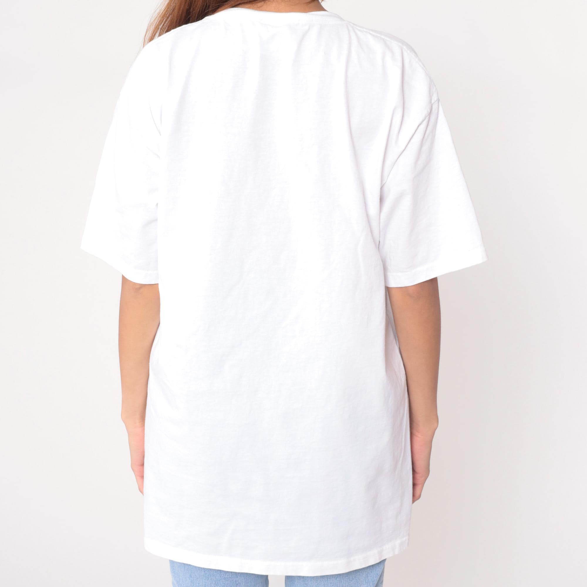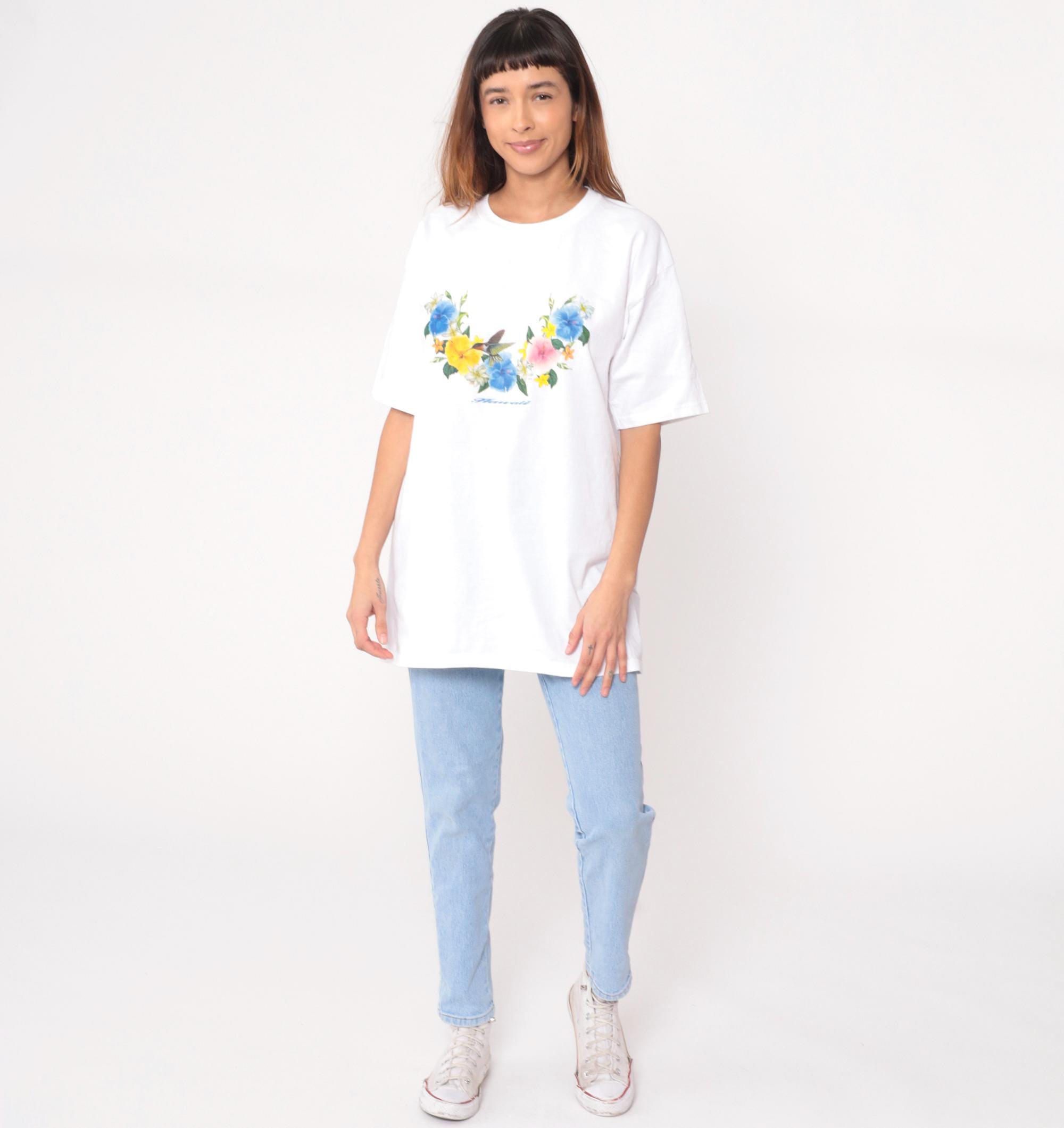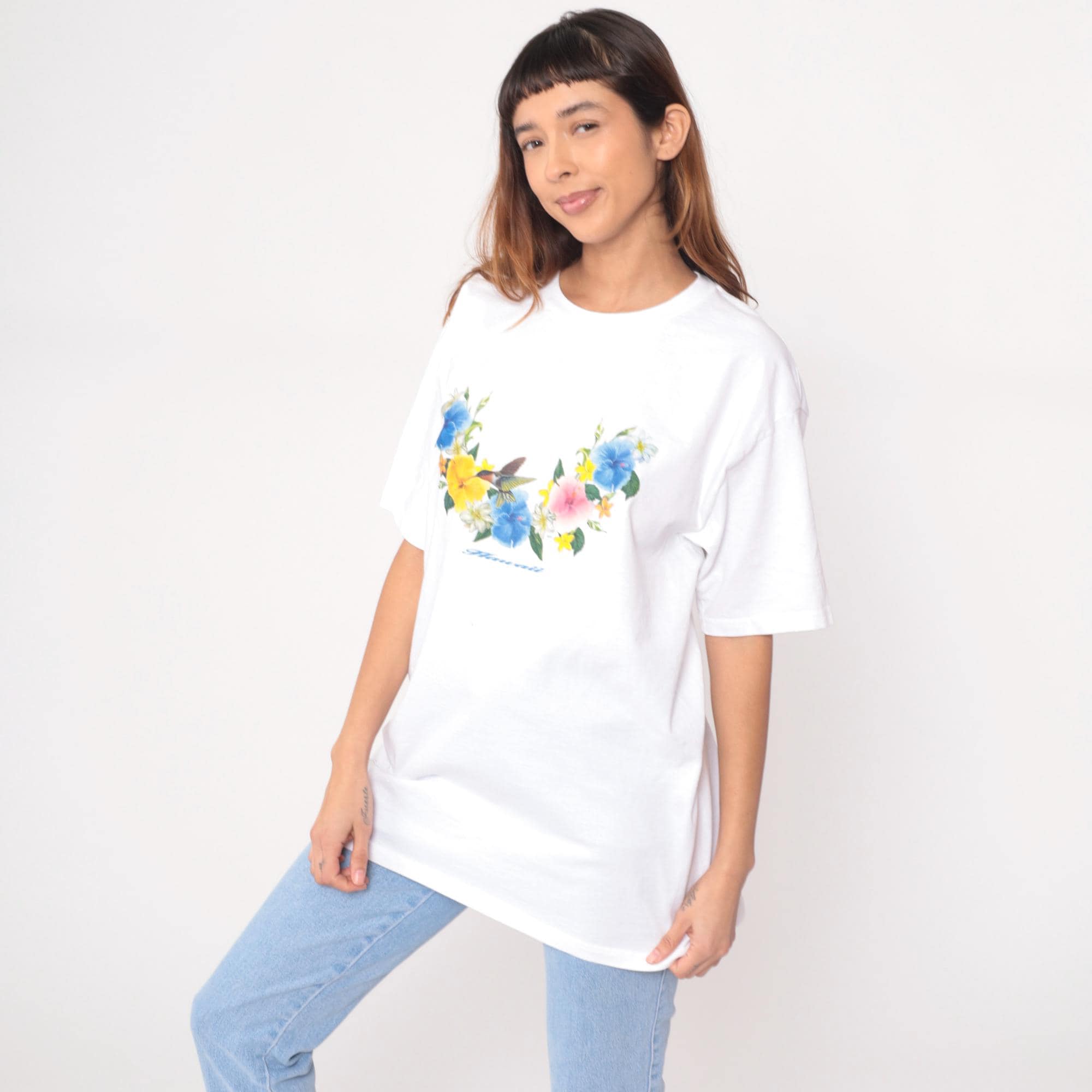 Y2K white Hawaiian graphic t-shirt from Wrangler with floral and hummingbird print across chest. Blue hibiscus flowers, yellow and pink blooms, white daisies, green leaves arranged around central hummingbird with "Hawaii" script text below.