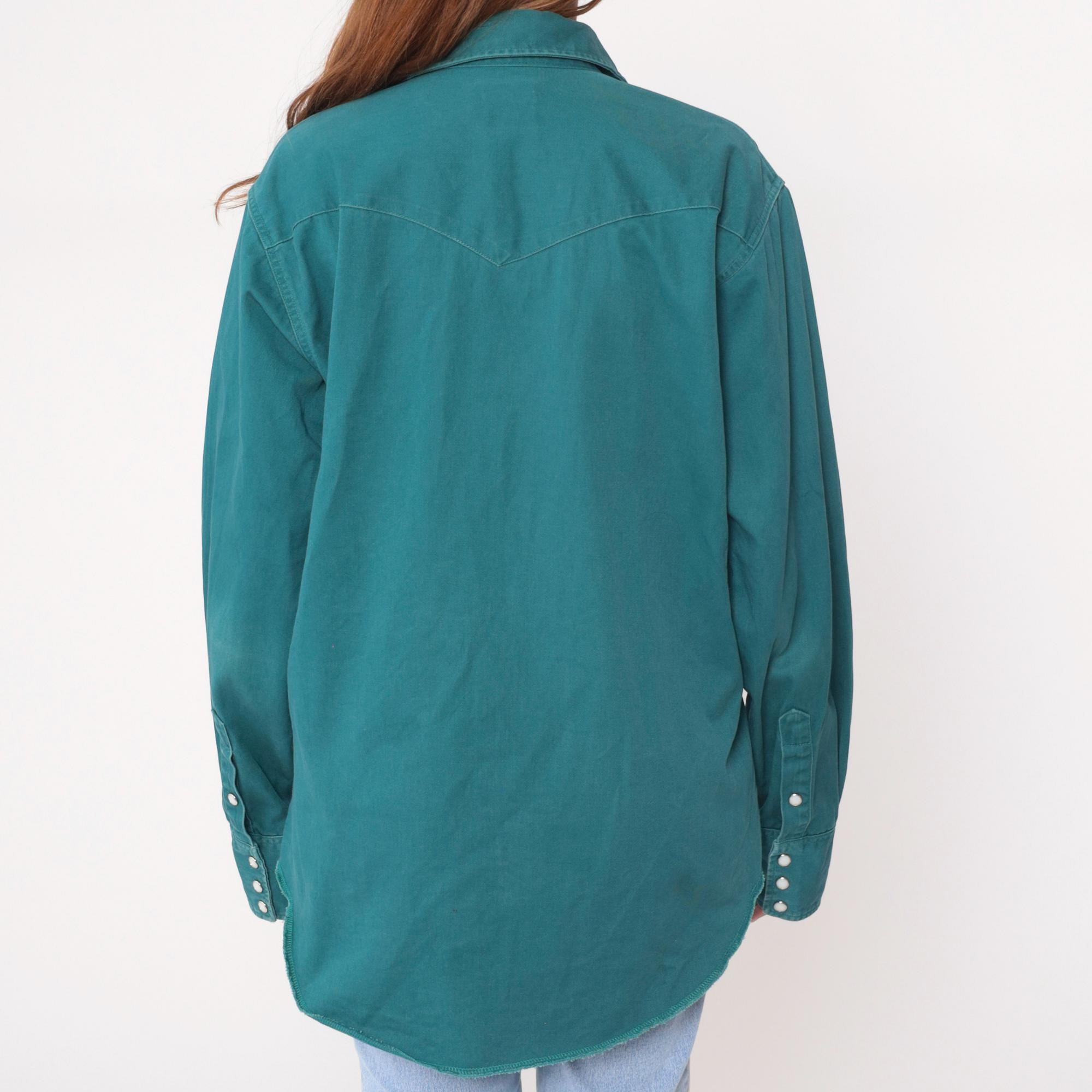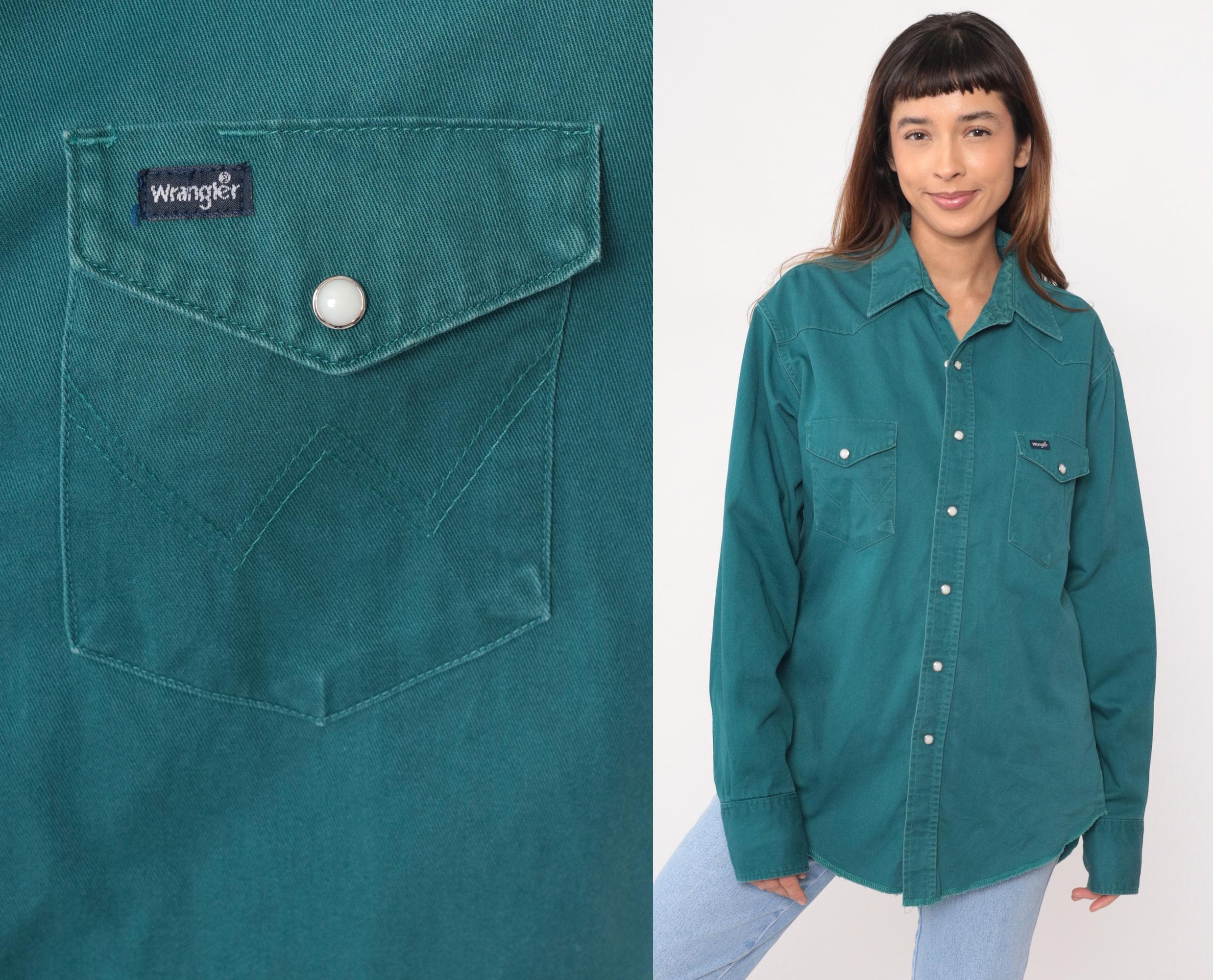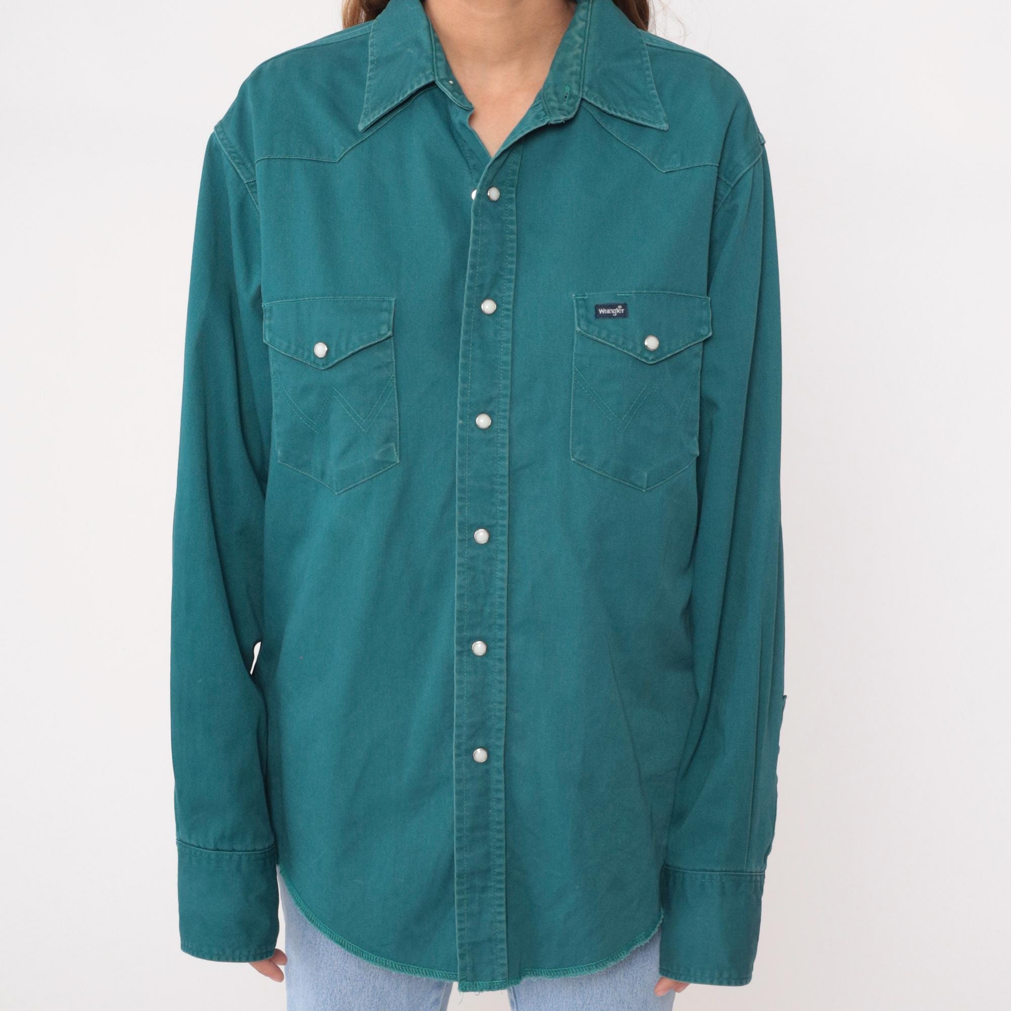 90s teal button-up shirt from Wrangler with western-style yoke stitching across the shoulders and back. Two chest pockets with pointed flaps and snap closures, matching snap cuffs on long sleeves, pearl snap front closure.