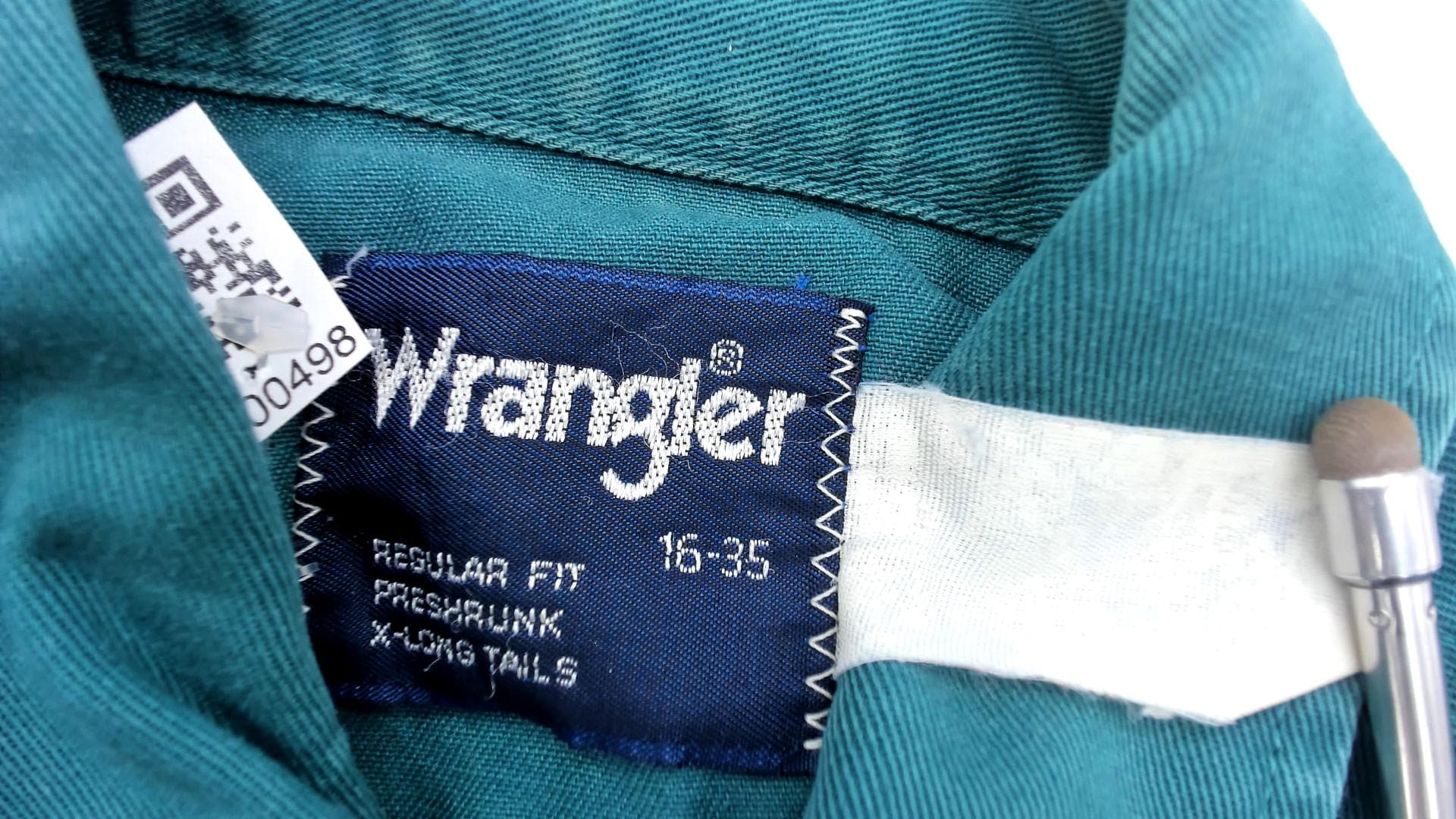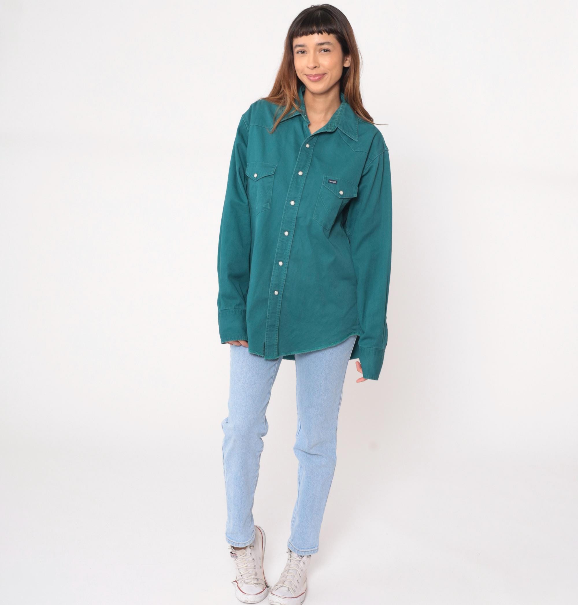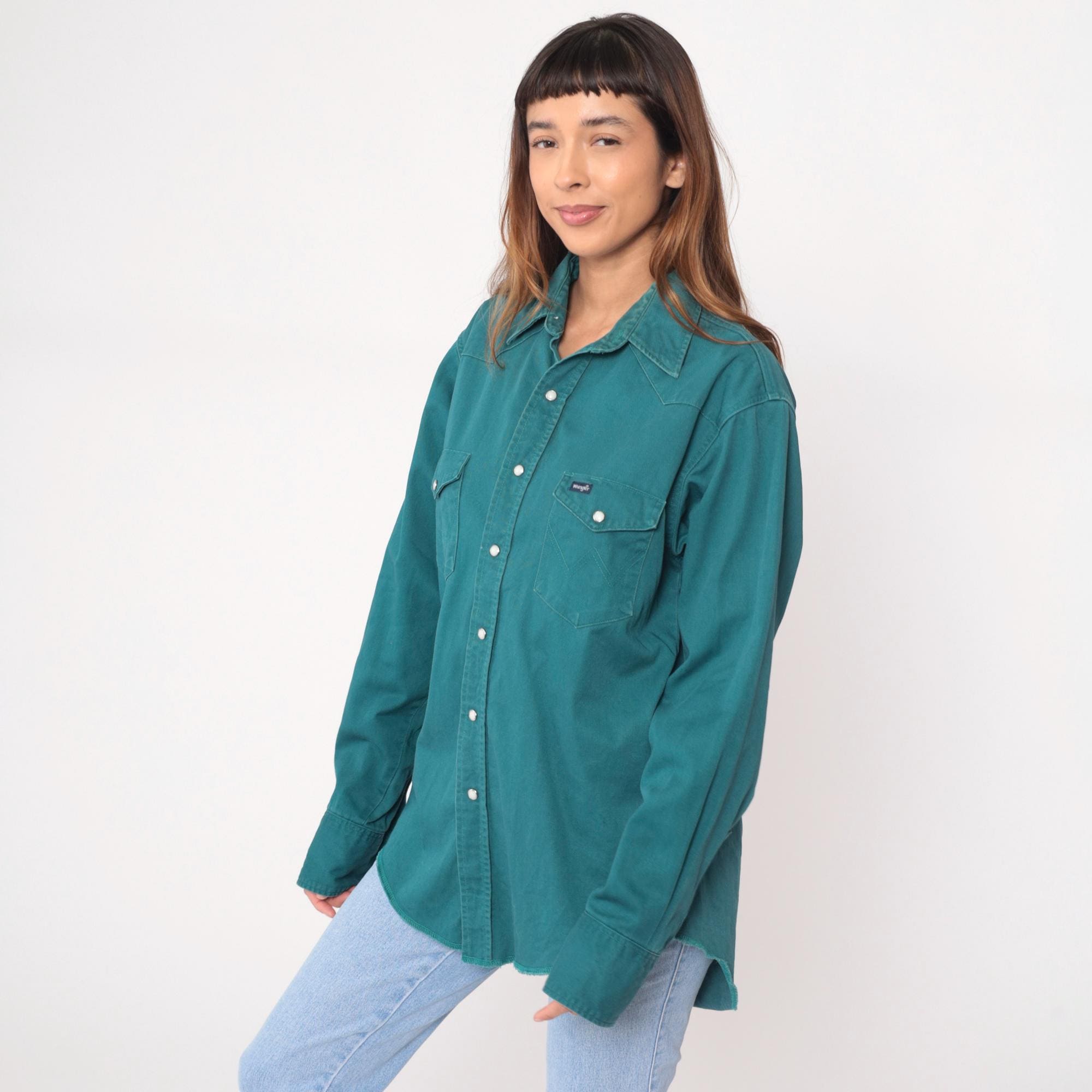 90s teal button-up shirt from Wrangler with western-style yoke stitching across the shoulders and back. Two chest pockets with pointed flaps and snap closures, matching snap cuffs on long sleeves, pearl snap front closure.