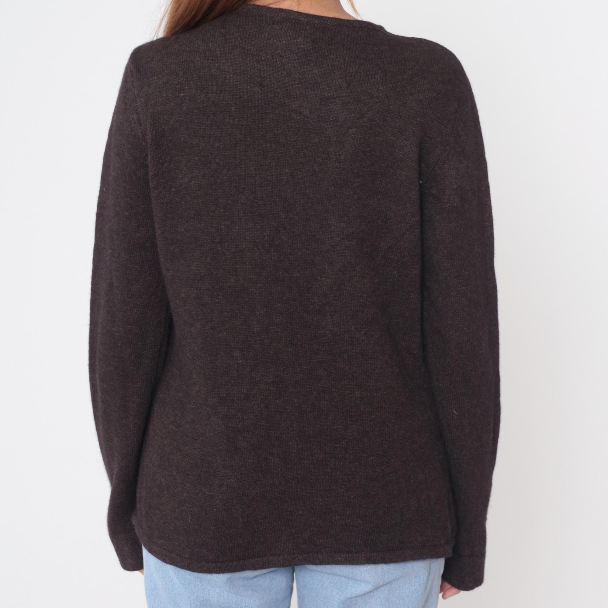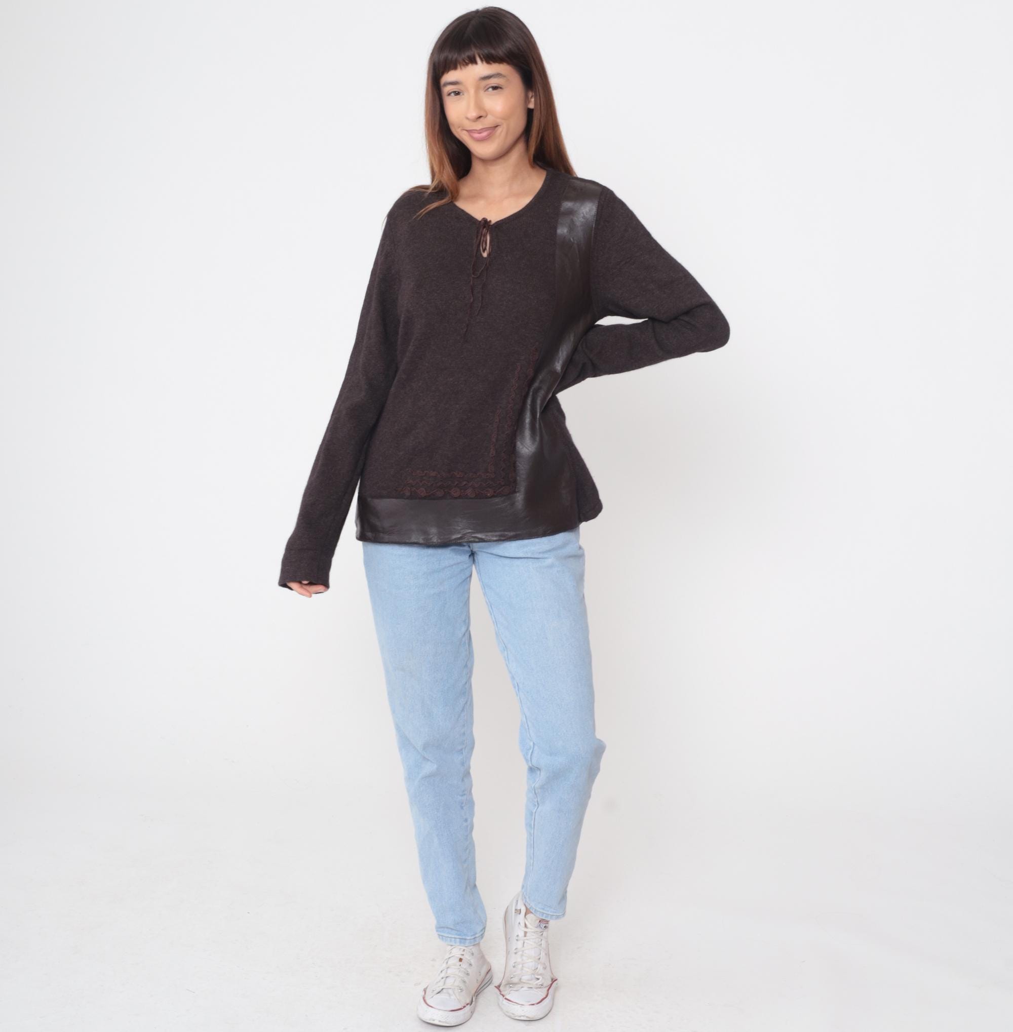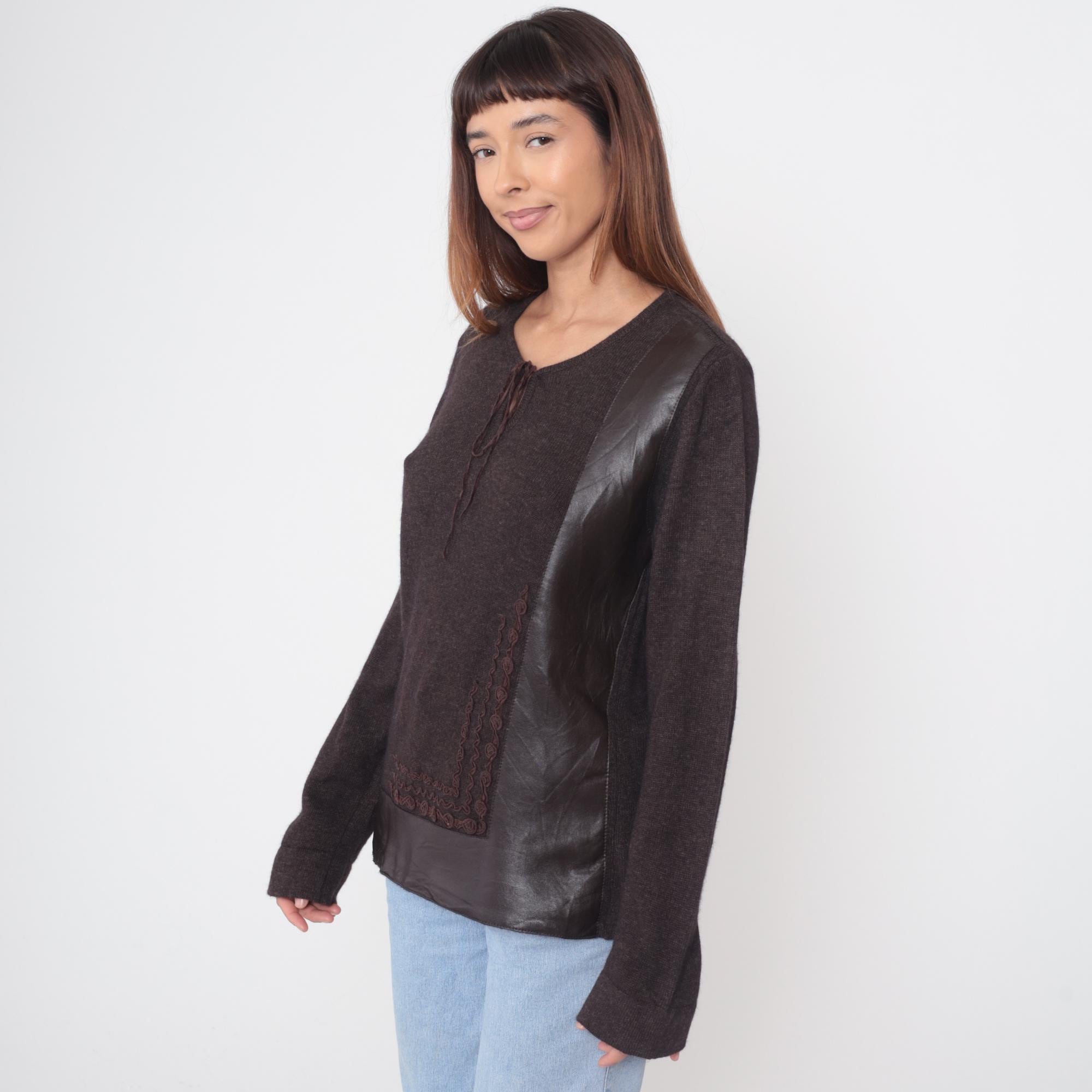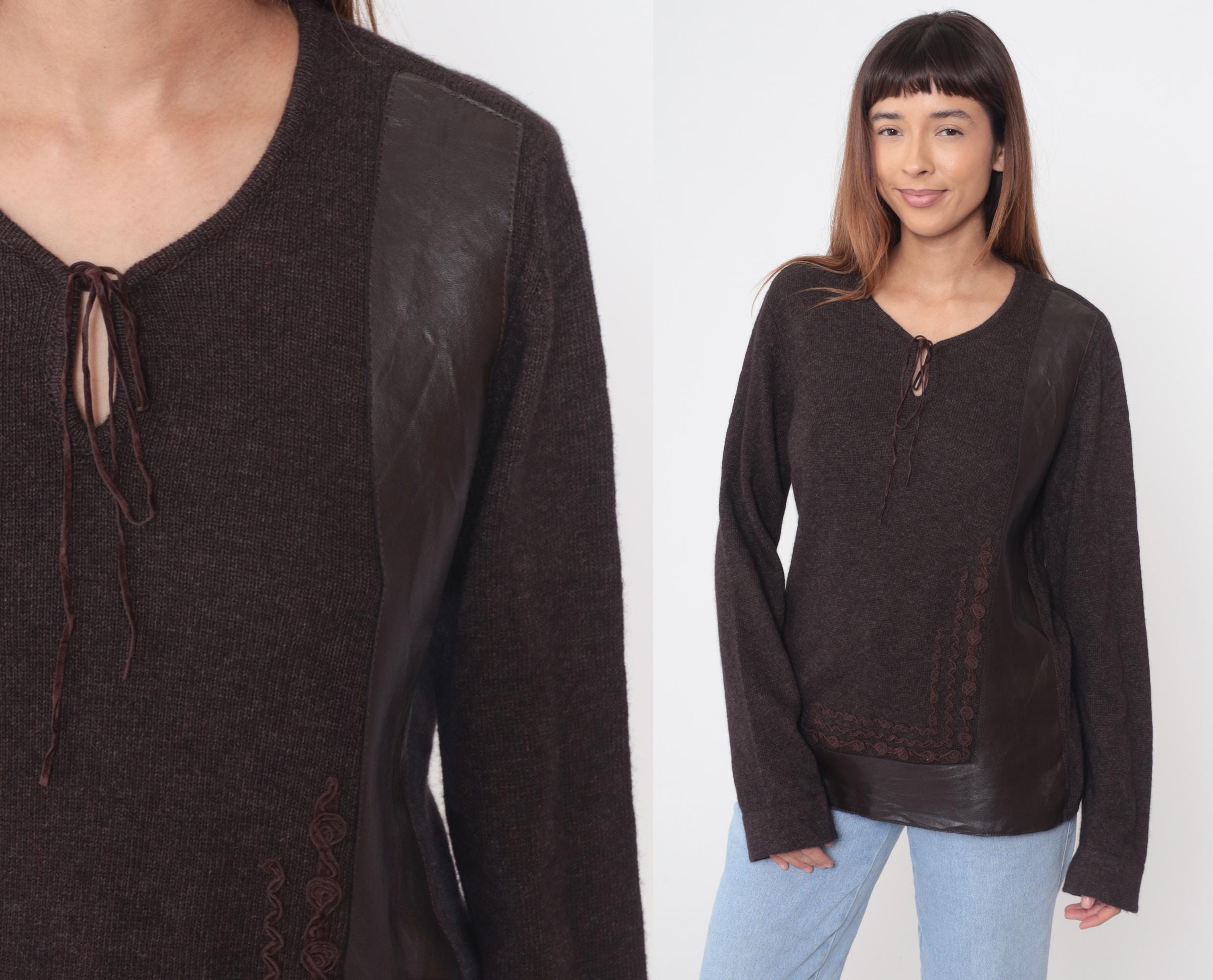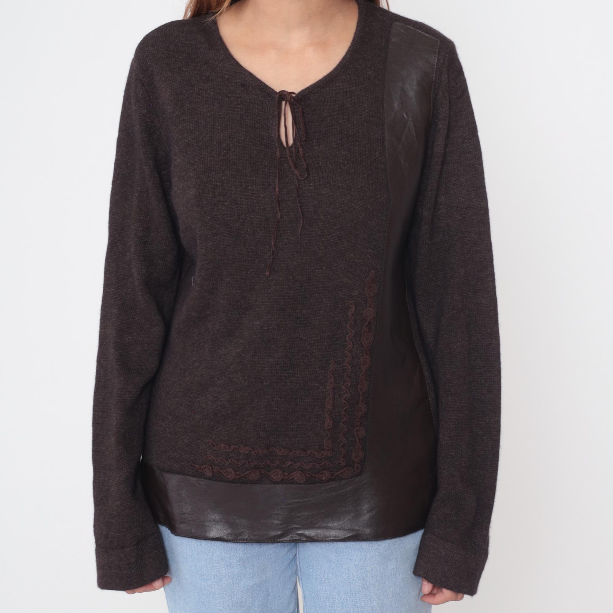 Y2K dark brown sweater from clorinda with V-neck and tie front closure. Embroidered braided trim down center front and along bottom hem, leather panel details at shoulders and lower band. Long sleeves. Merino wool, rayon, and nylon blend. Tagged size Large.