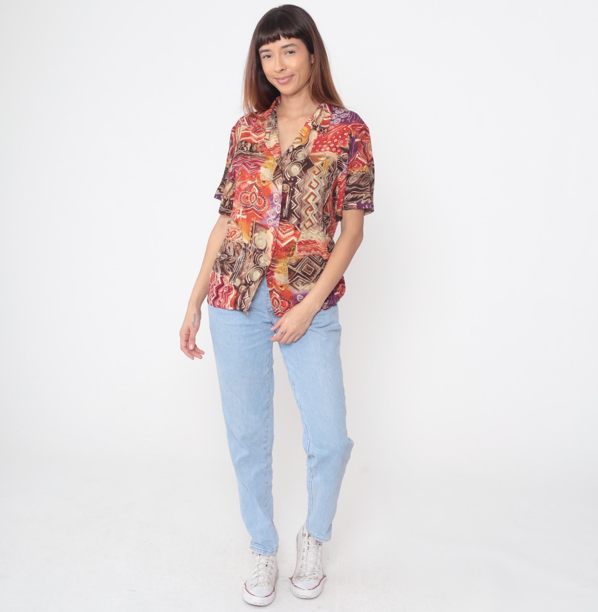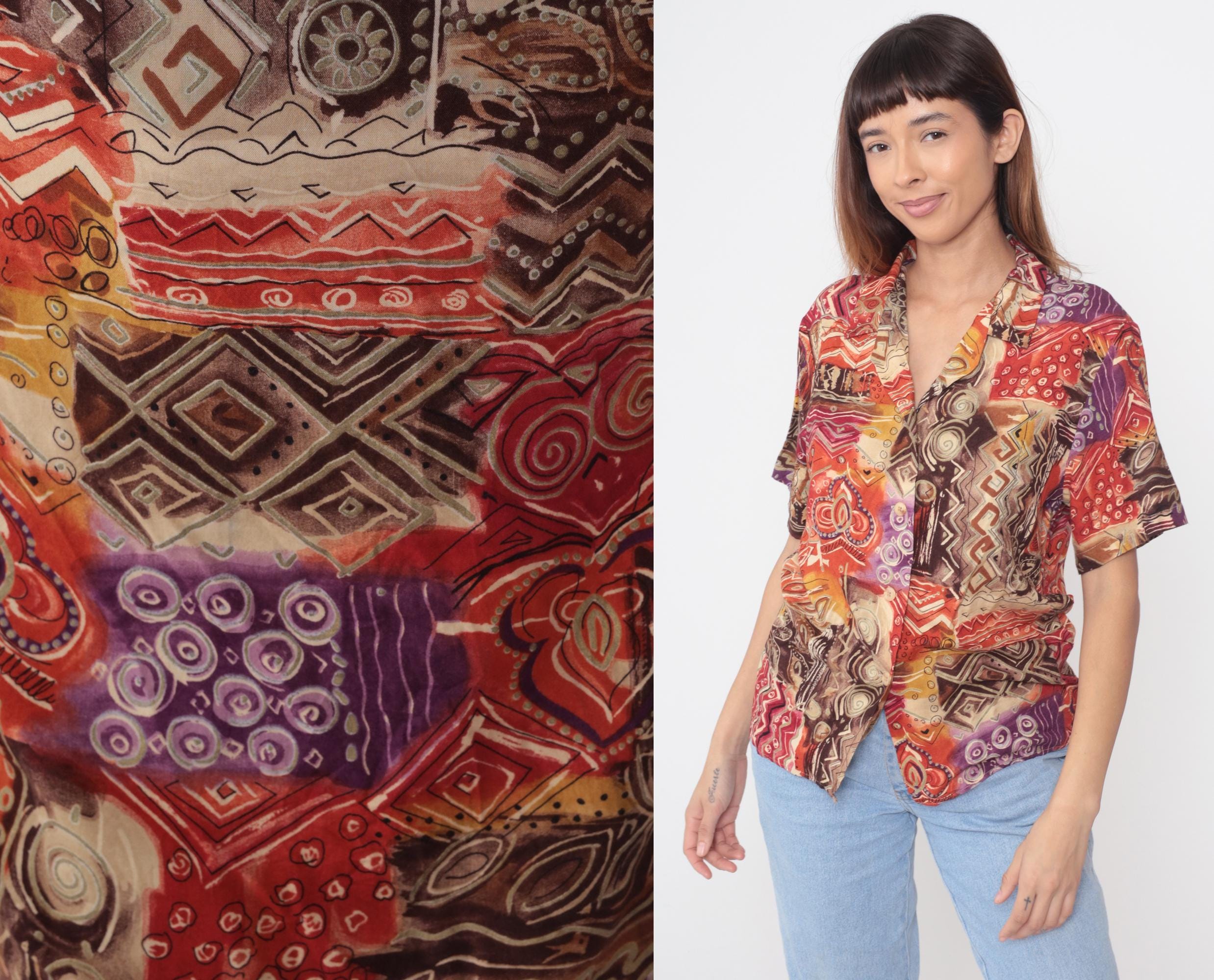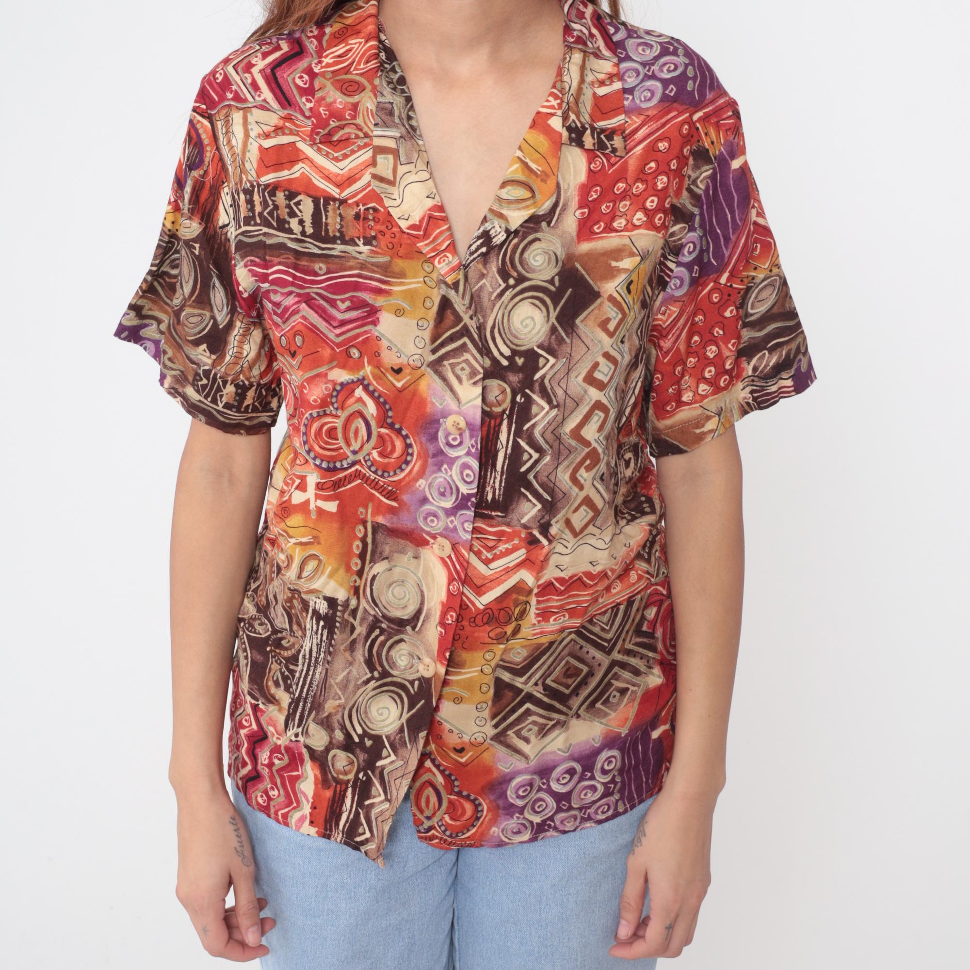90s abstract geometric print shirt from sag harbor with collared neckline and button front closure. Red, brown, purple, yellow, and cream pattern across the fabric featuring spirals, chevrons, zigzag lines, and dot motifs throughout. Short sleeves with relaxed fit silhouette.