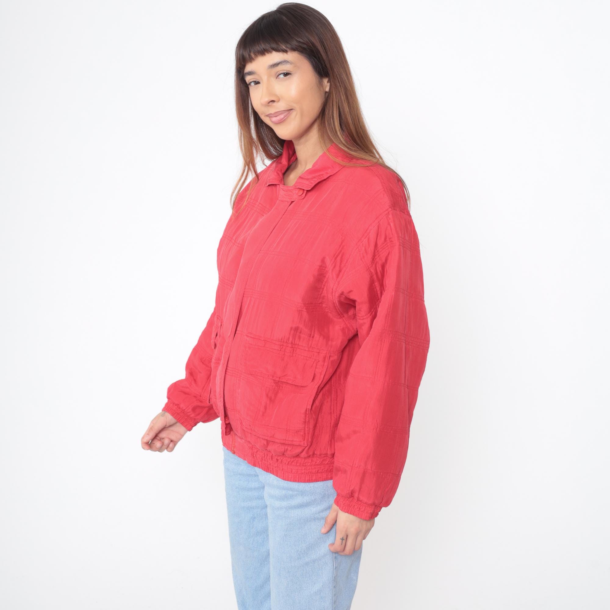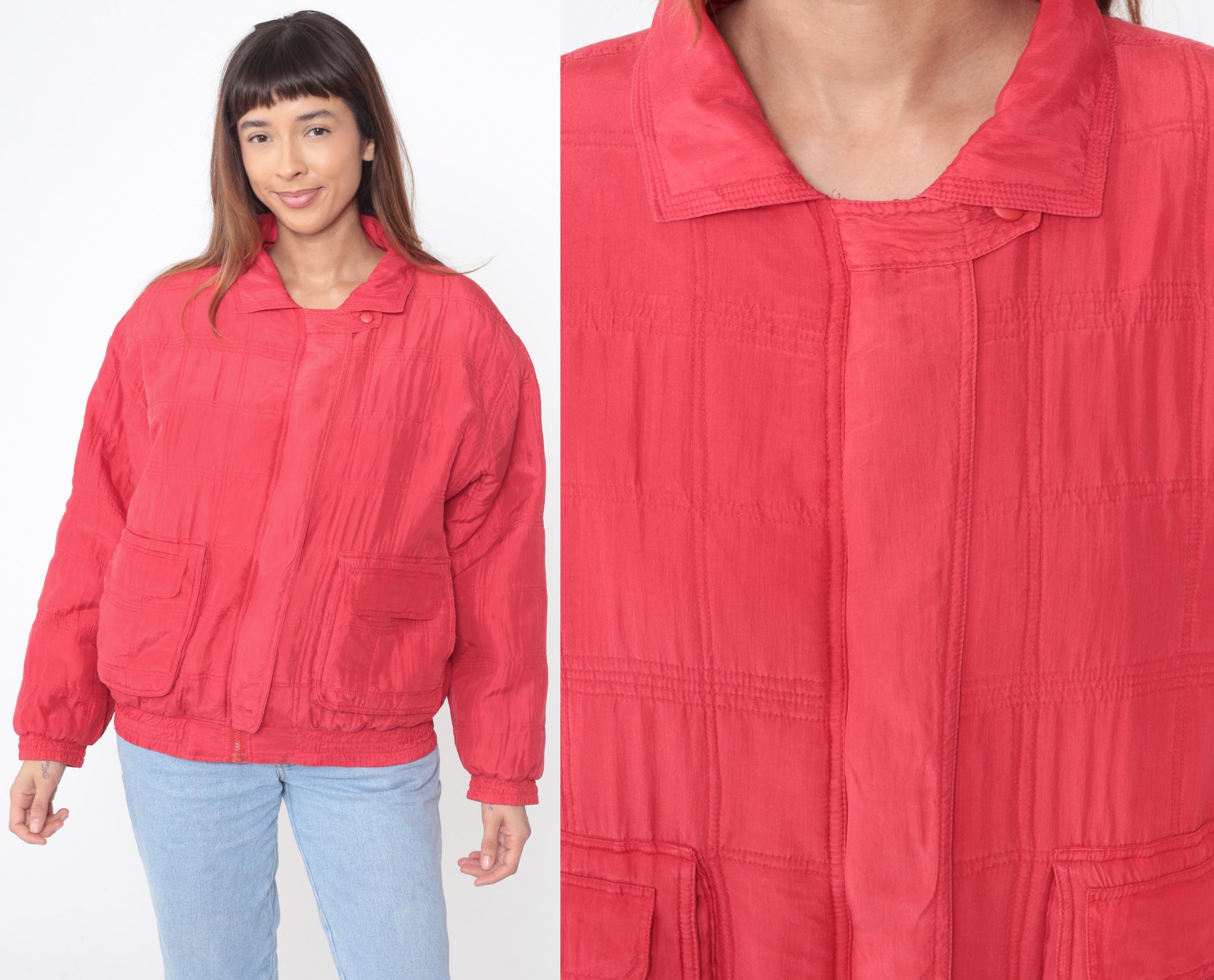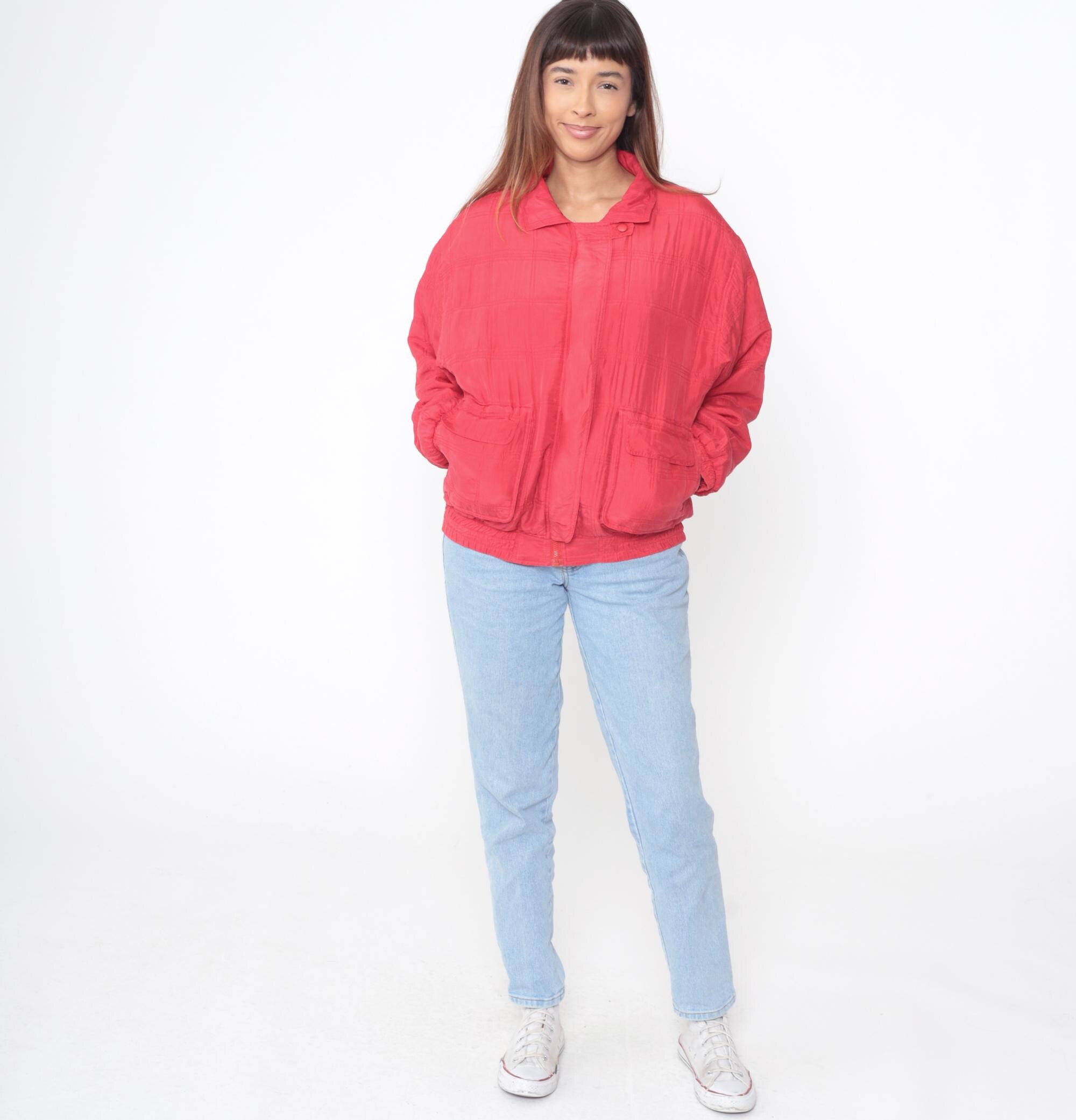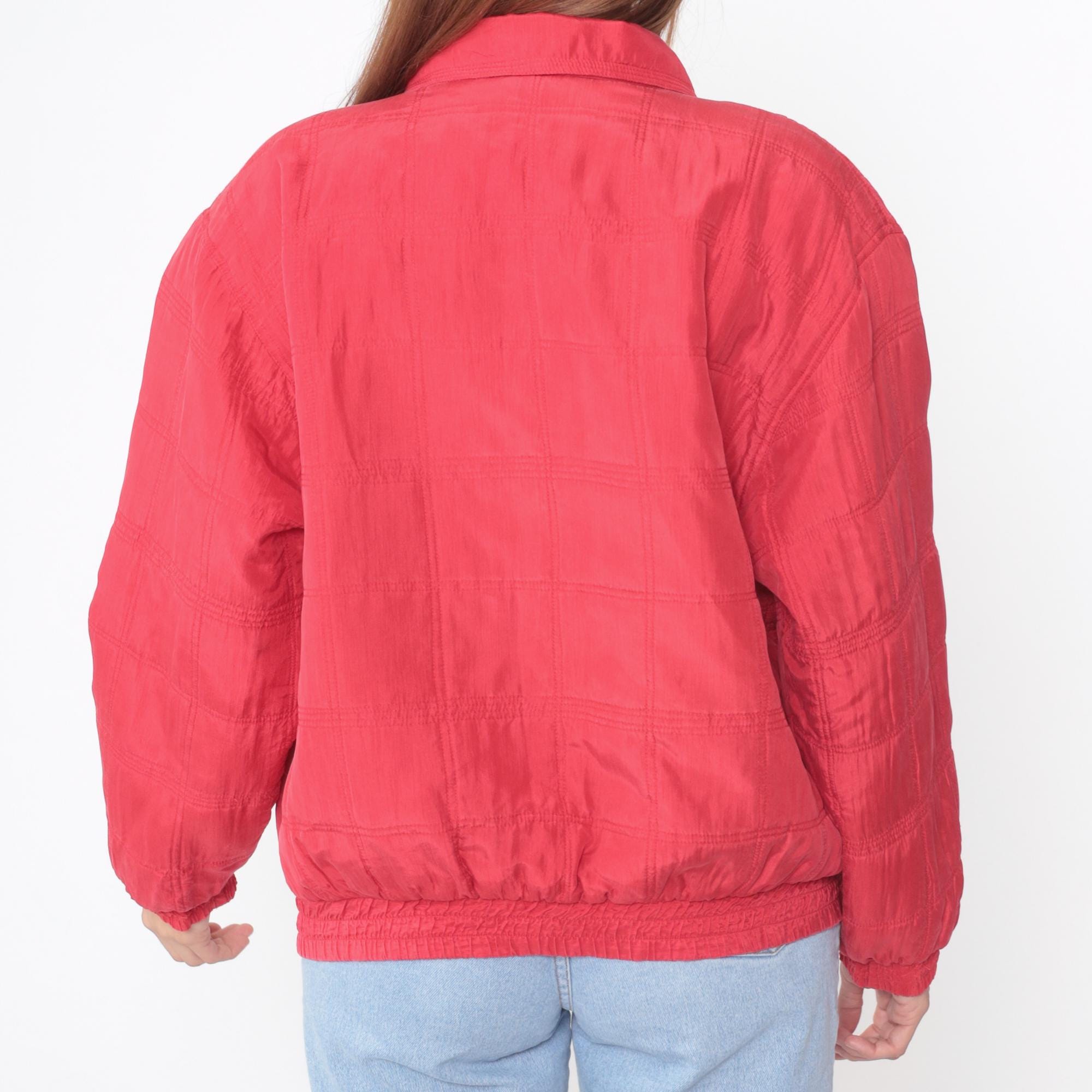 90s tomato red bomber jacket from Javon with quilted texture across the entire garment. Collared neckline, front zip closure, two patch pockets with flaps. Ribbed cuffs at wrists and waistband.