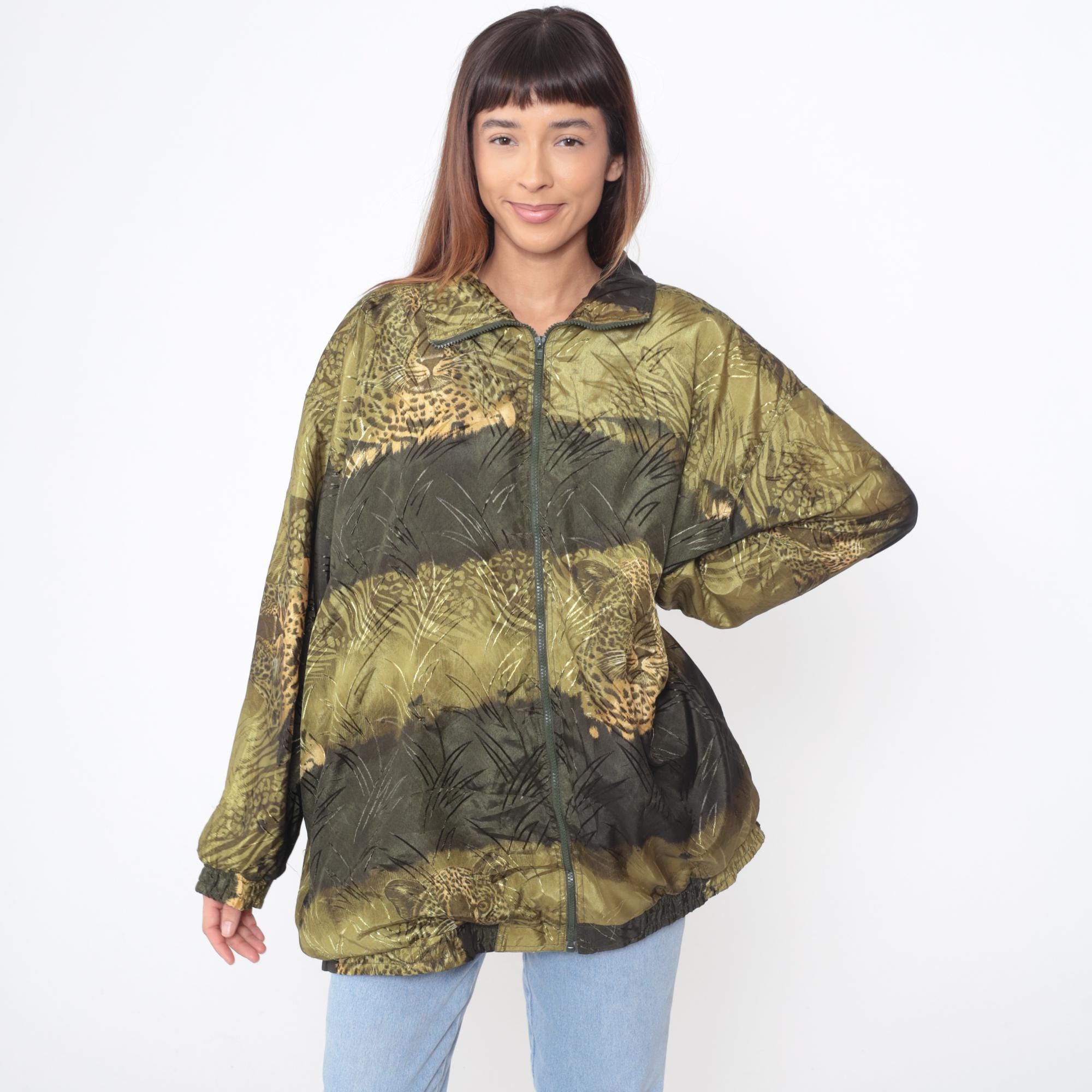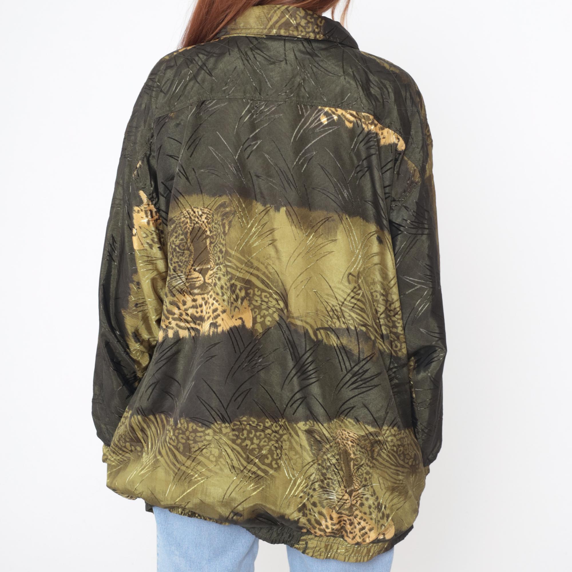 90s windbreaker jacket with leopard print and jungle grass scene across the fabric in olive green, gold, black, and tan. Full zip front closure, collared neckline, elastic cuffs and hem. Oversized, loose fit.