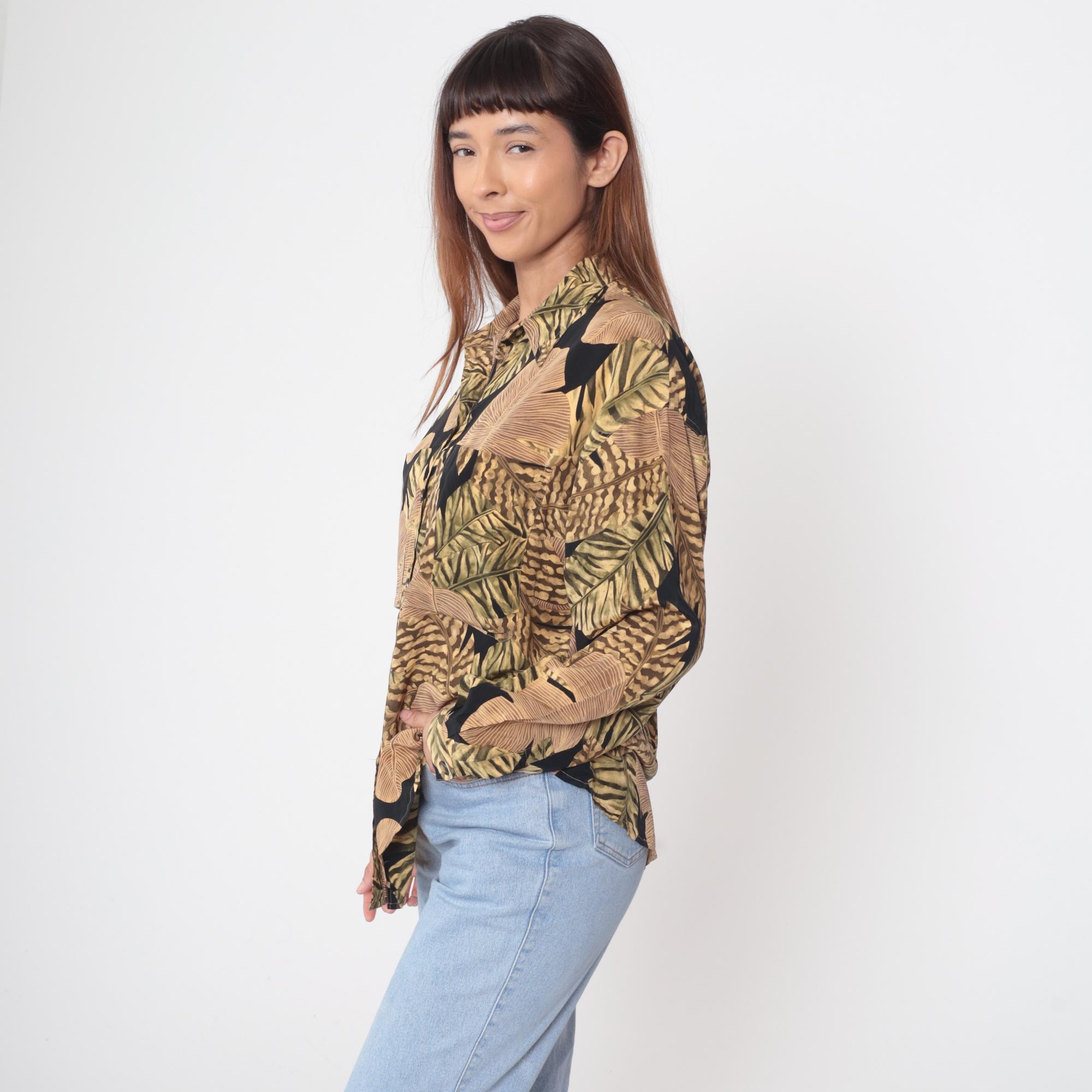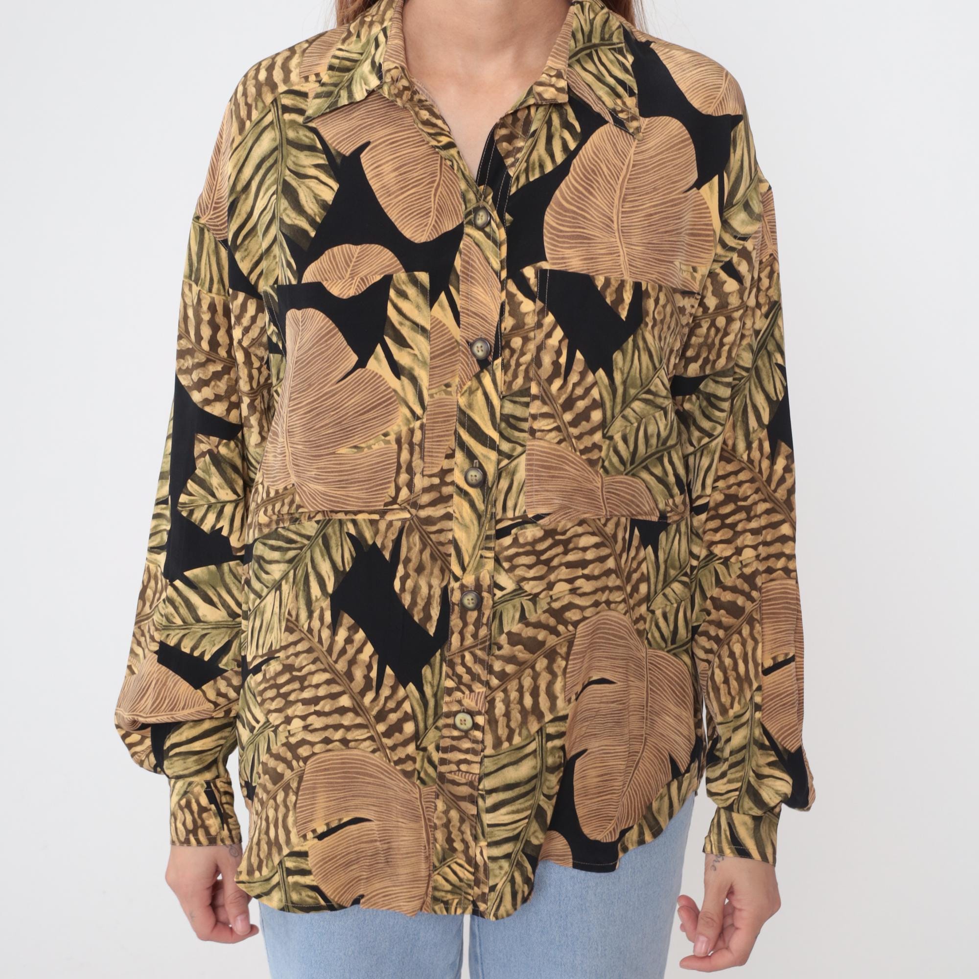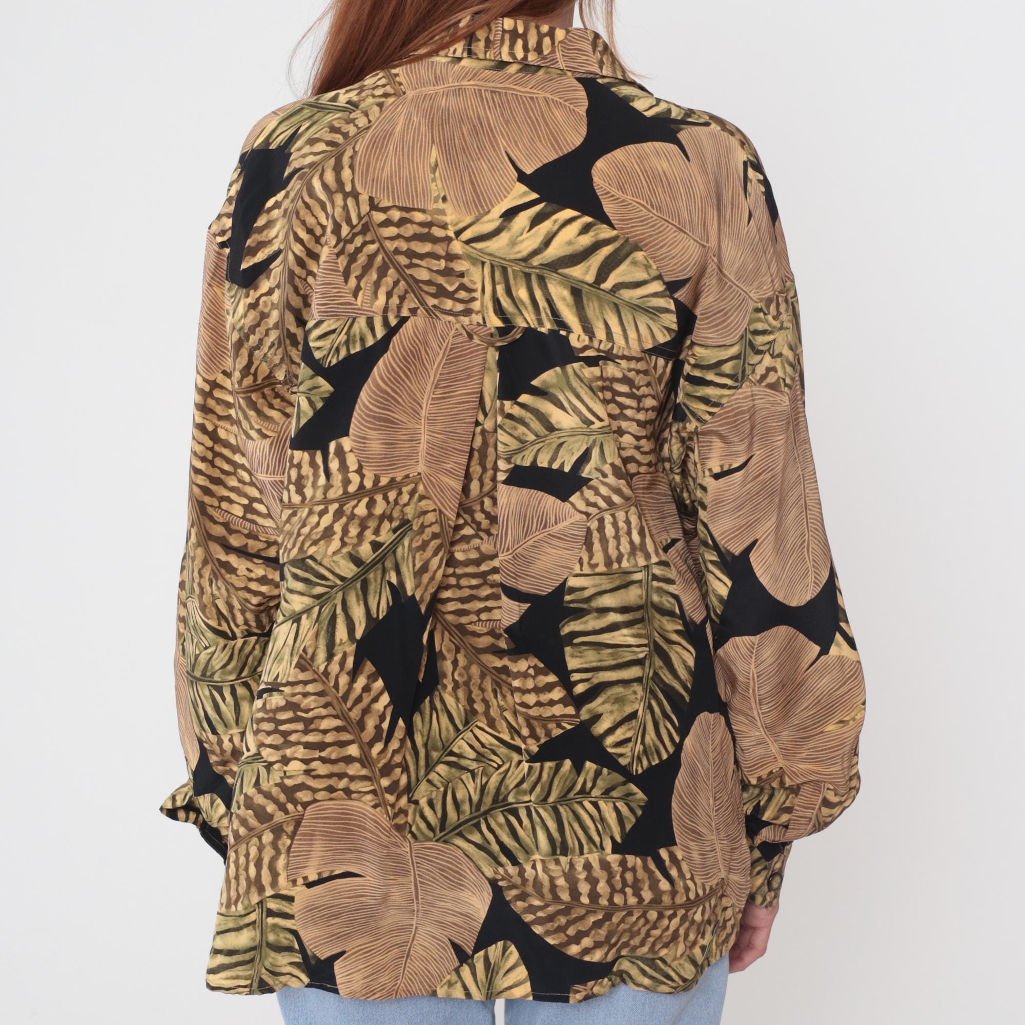 90s tropical leaf print blouse from Liz Claiborne with oversized fit and dropped shoulders. Black background with large-scale tan, brown, olive green, and yellow-green palm and monstera-style leaves across the fabric. Button front closure with collar, long sleeves with button cuffs. Silk.