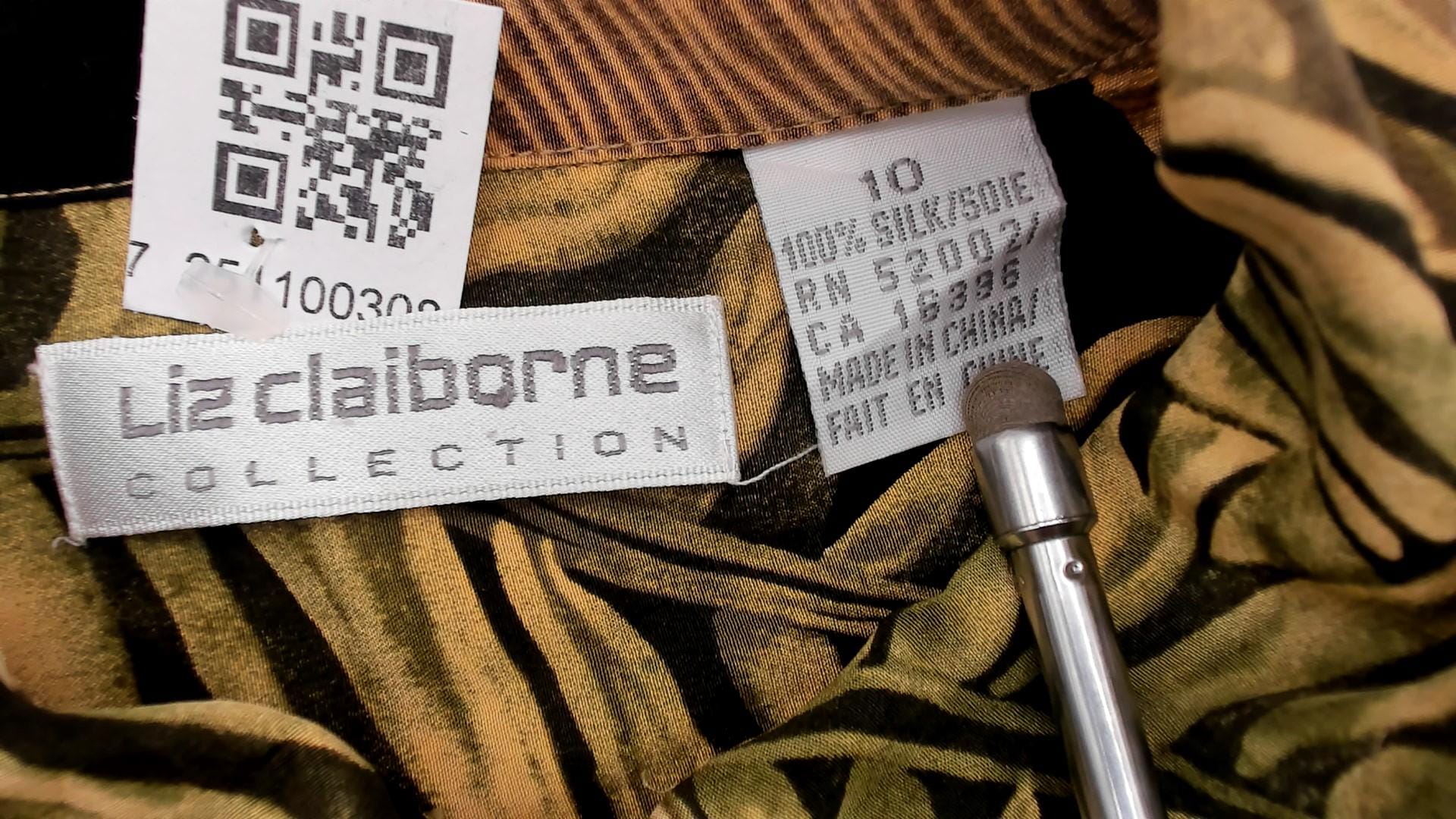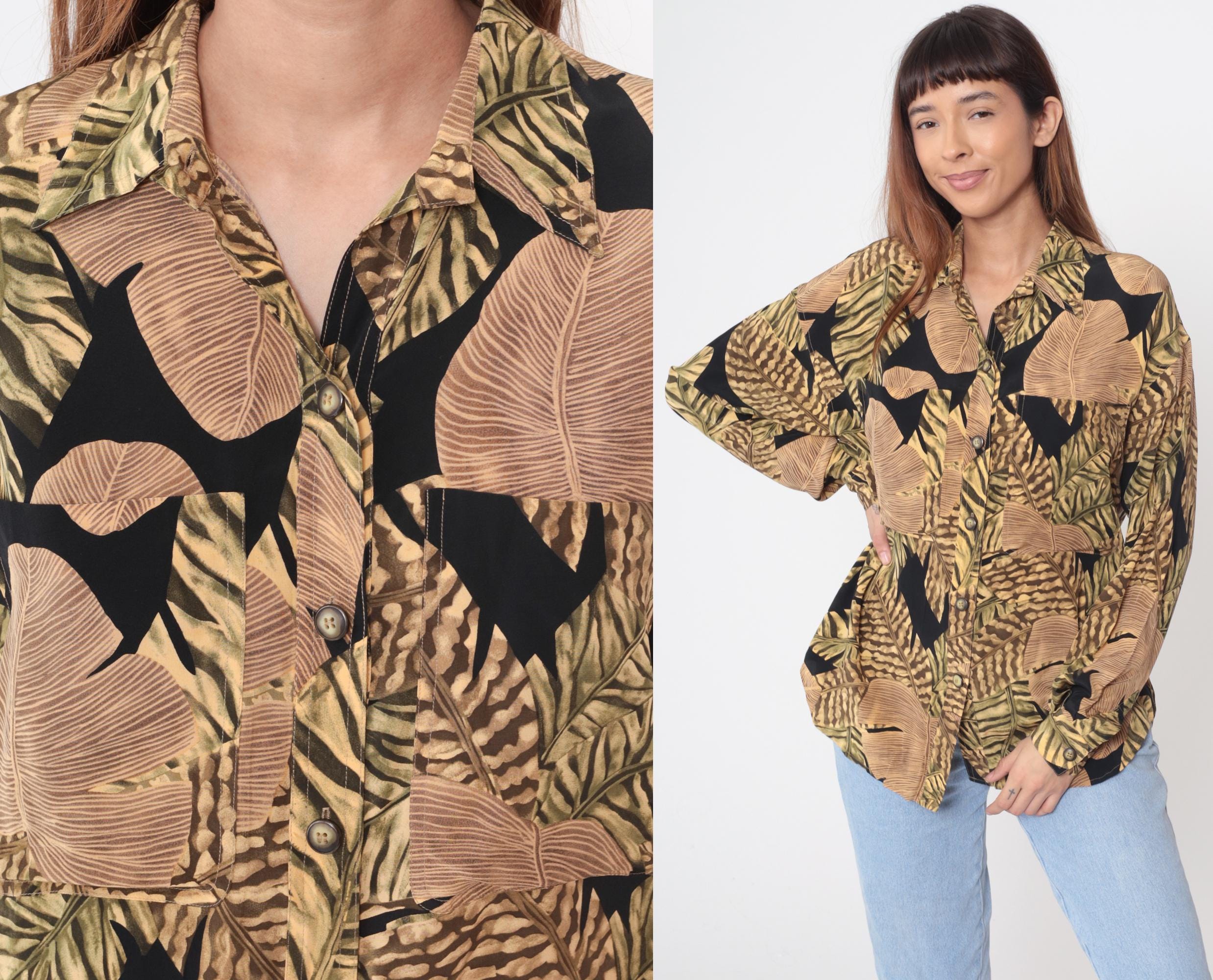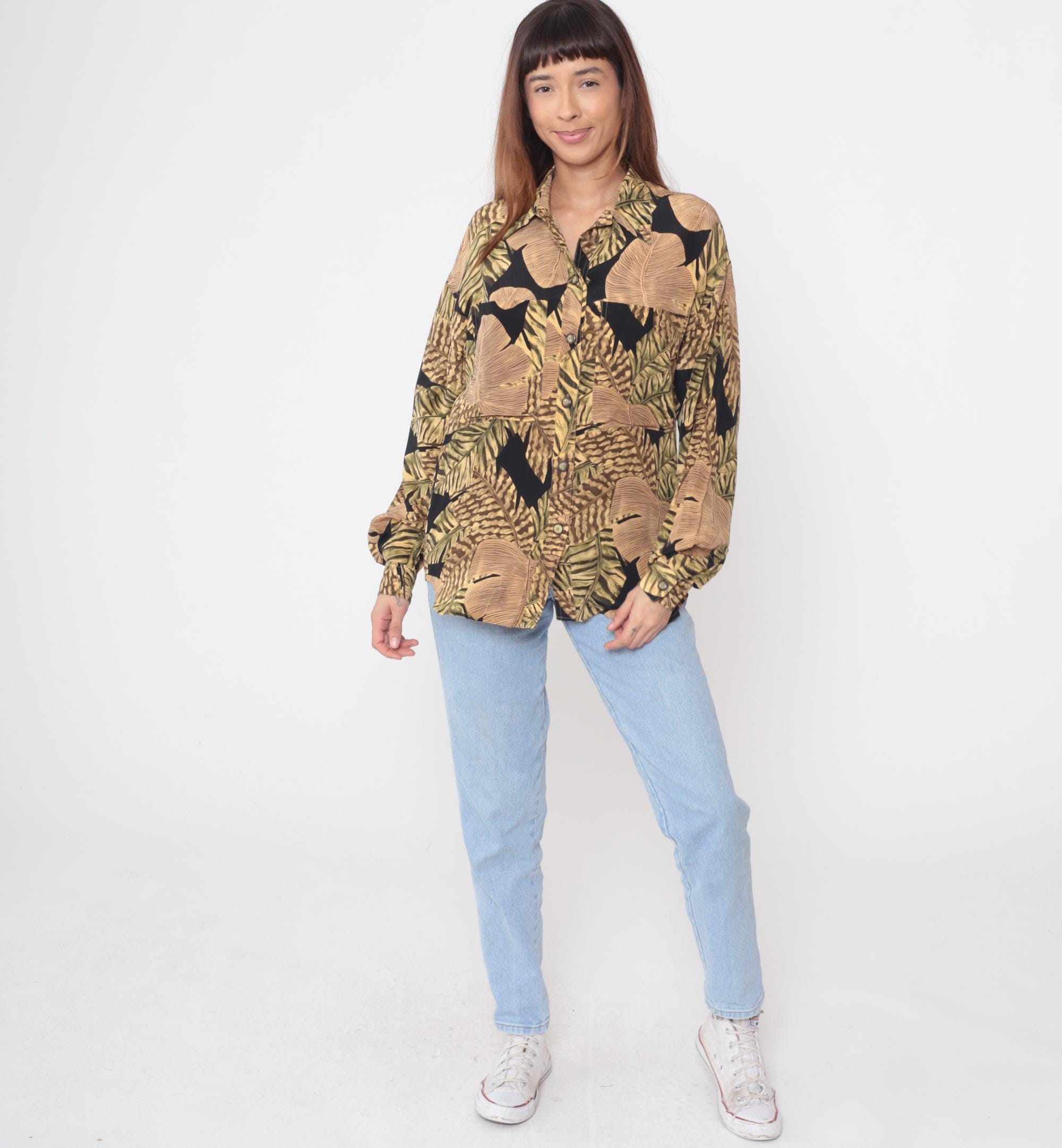 90s tropical leaf print blouse from Liz Claiborne with oversized fit and dropped shoulders. Black background with large-scale tan, brown, olive green, and yellow-green palm and monstera-style leaves across the fabric. Button front closure with collar, long sleeves with button cuffs. Silk.