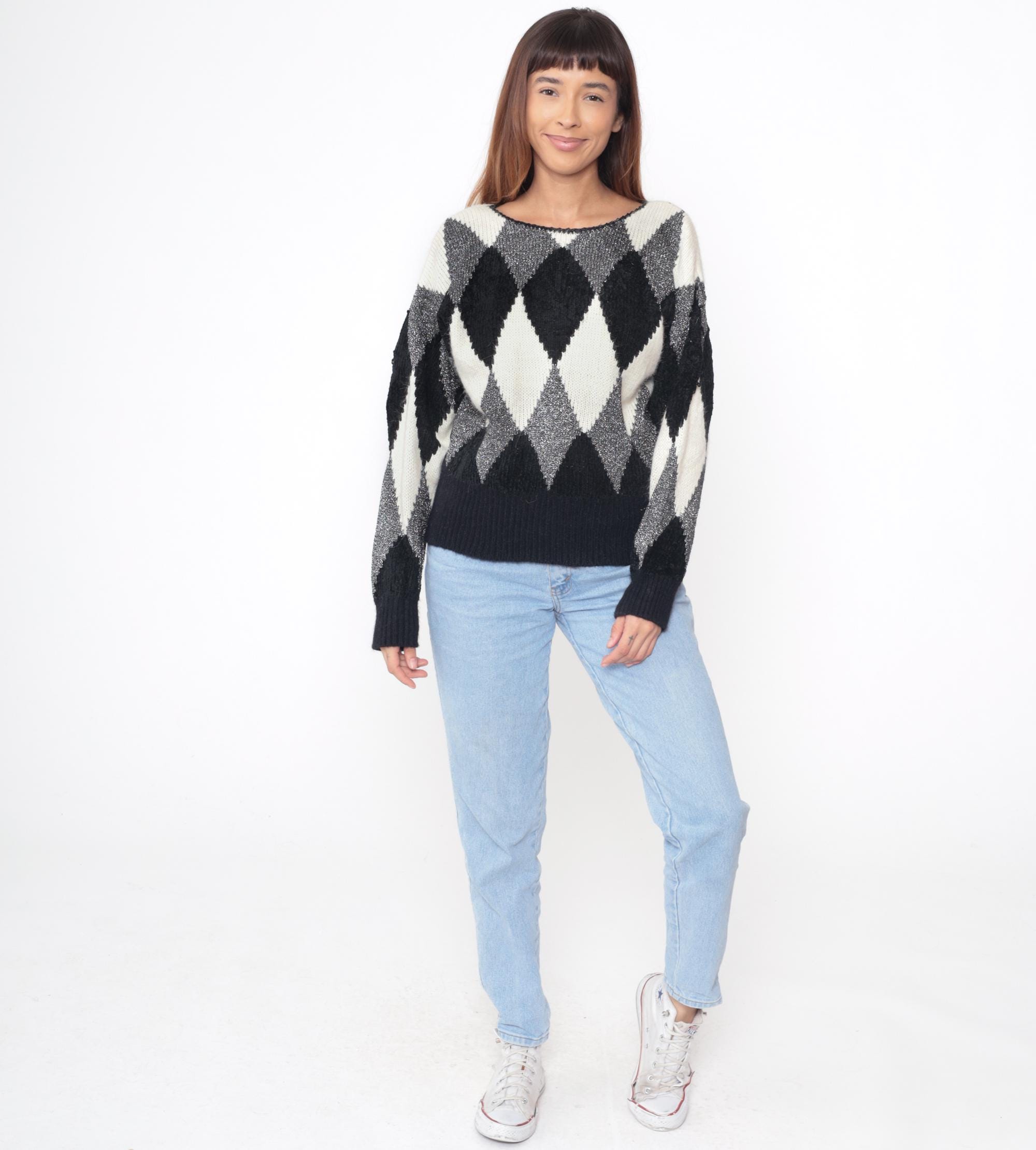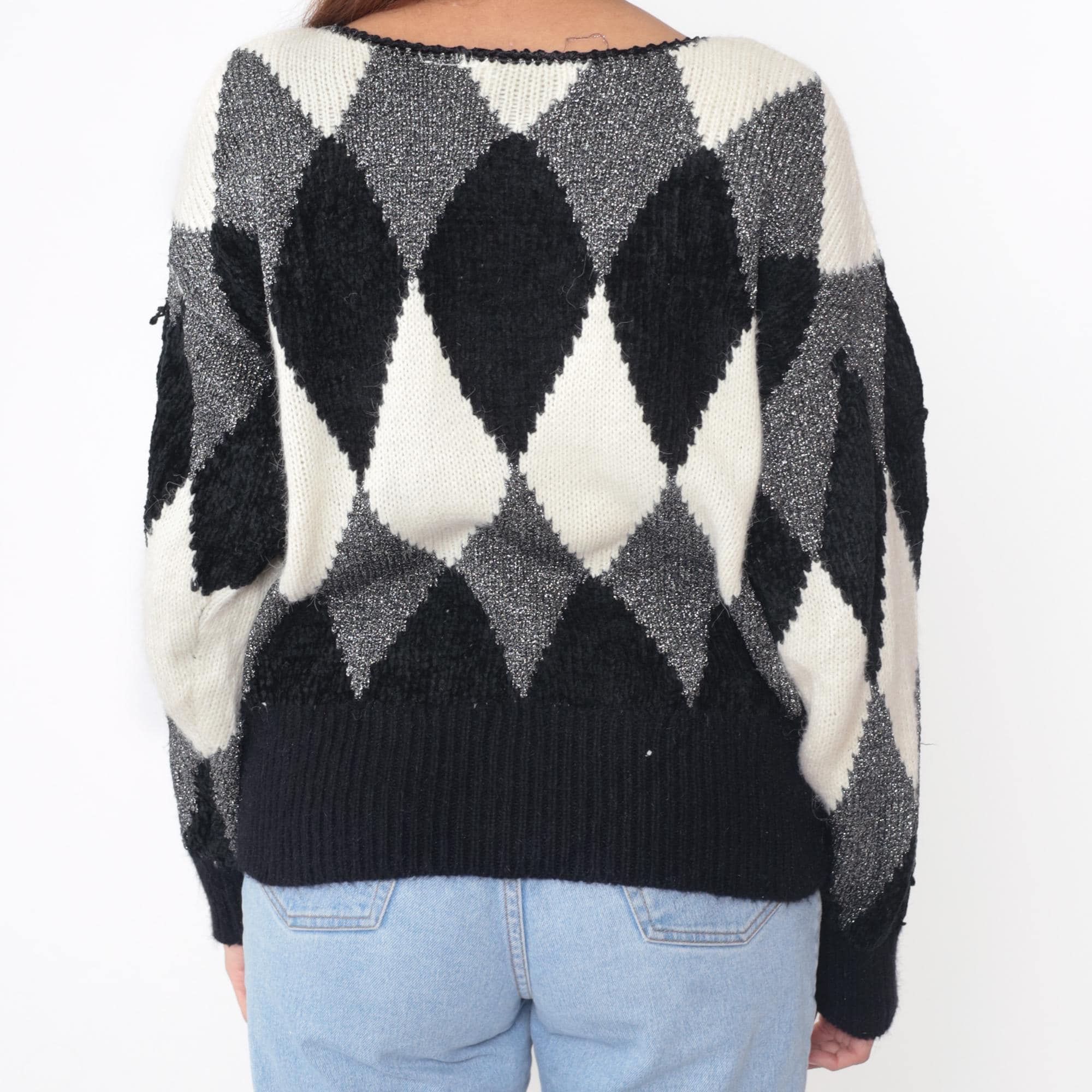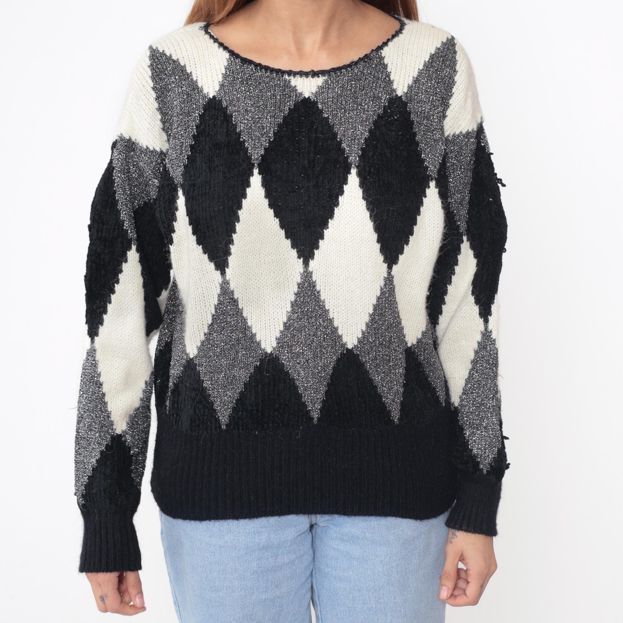 80s geometric sweater from liz claiborne with black, white, and silver metallic diamond harlequin pattern across the body. Crew neckline with ribbed trim, long sleeves with ribbed cuffs, ribbed hem. Textured chenille-style pile on black diamond sections contrasts with flat knit on white and metallic areas.