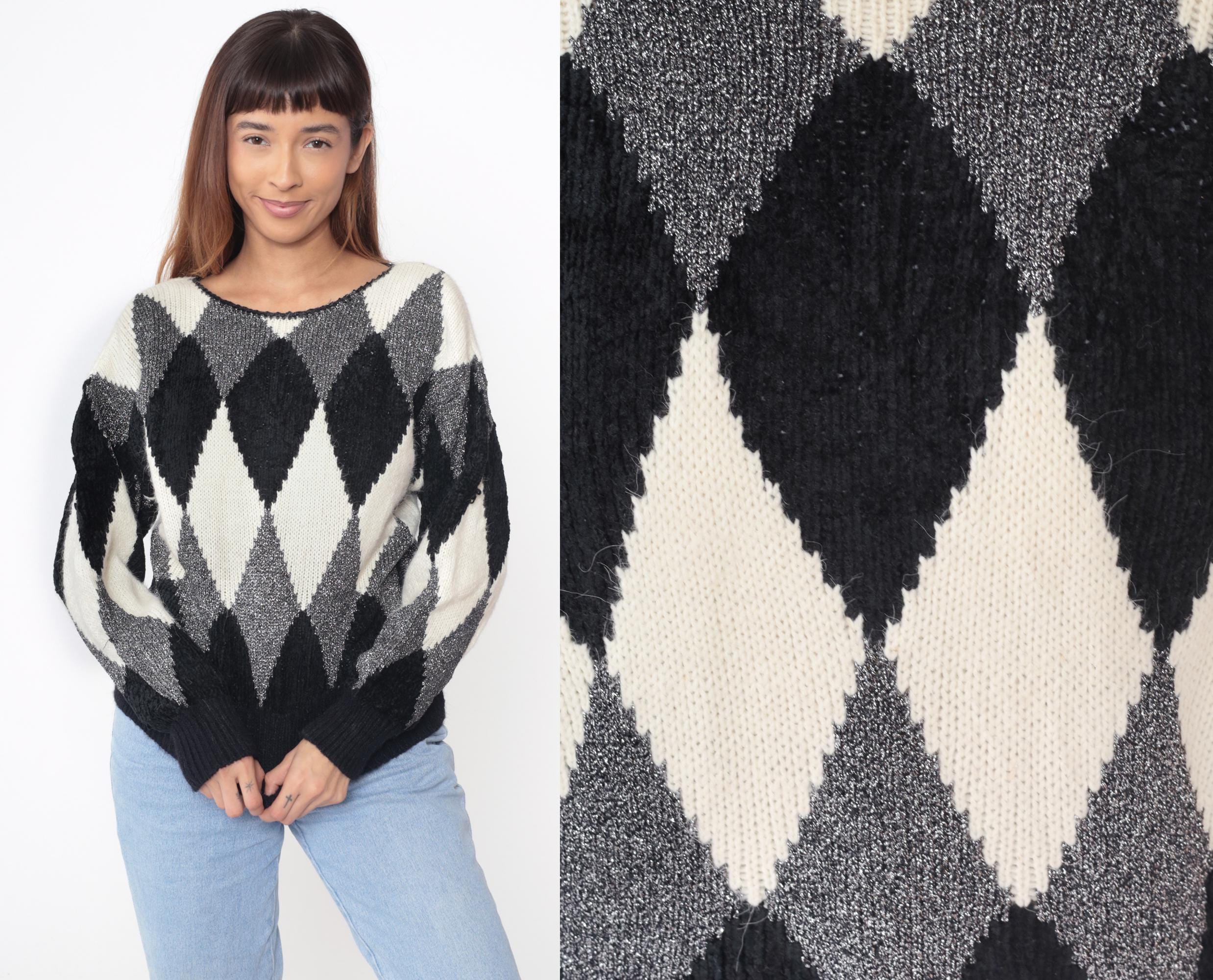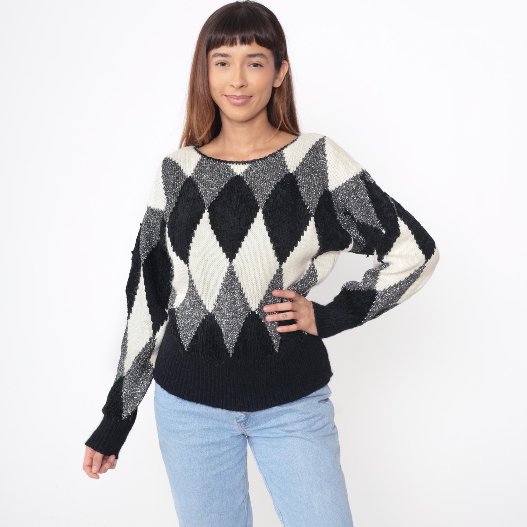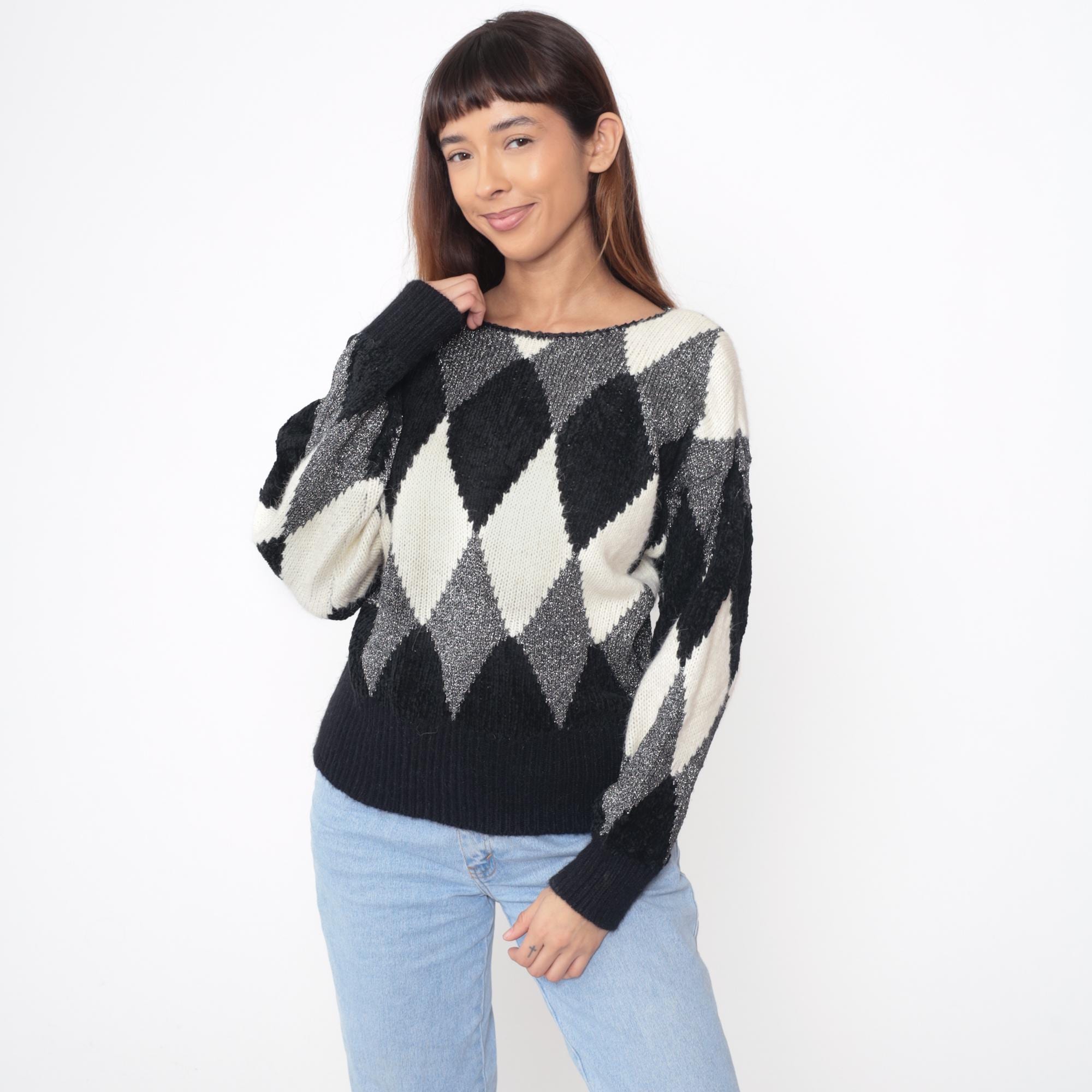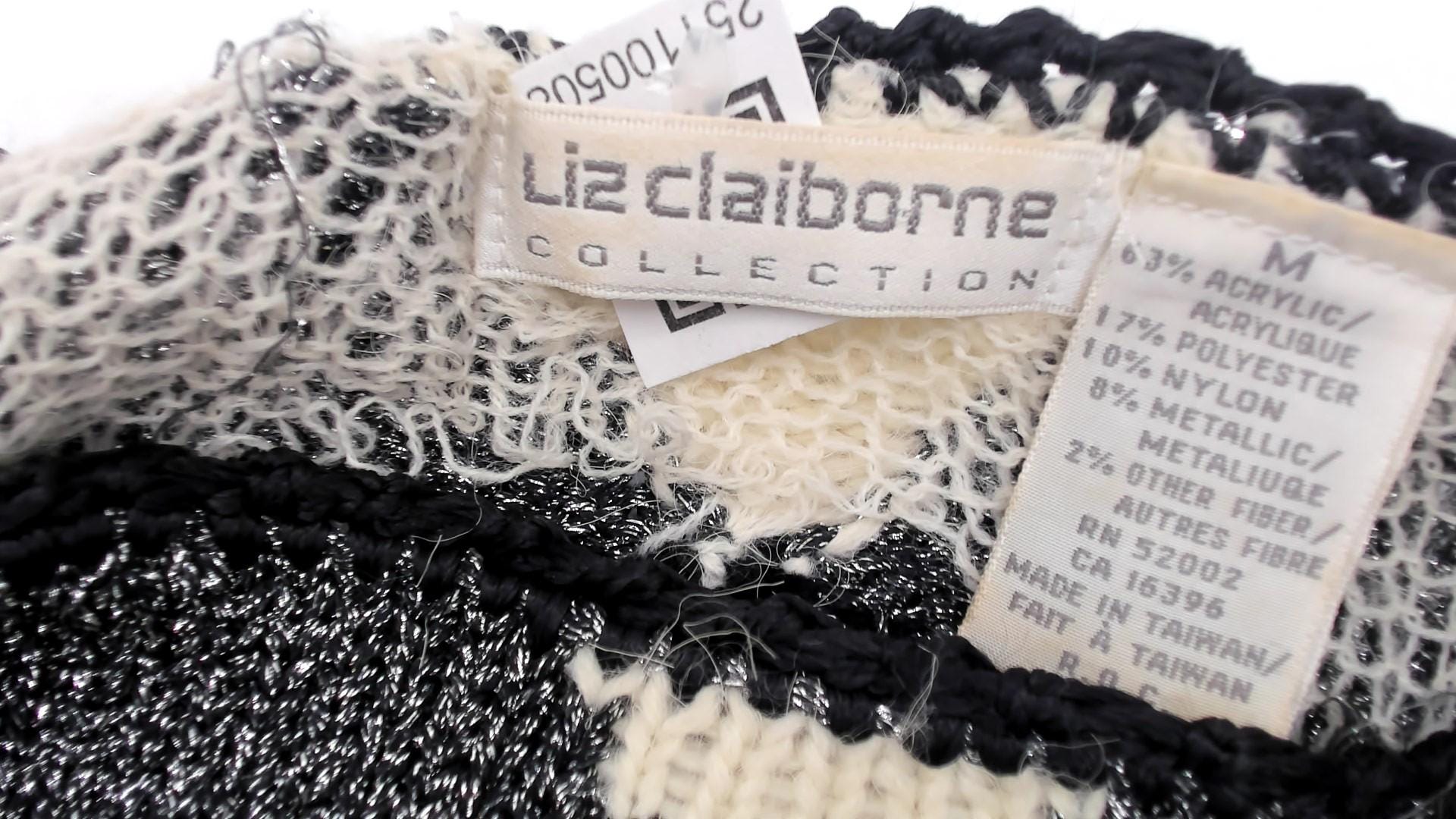 80s geometric sweater from liz claiborne with black, white, and silver metallic diamond harlequin pattern across the body. Crew neckline with ribbed trim, long sleeves with ribbed cuffs, ribbed hem. Textured chenille-style pile on black diamond sections contrasts with flat knit on white and metallic areas.