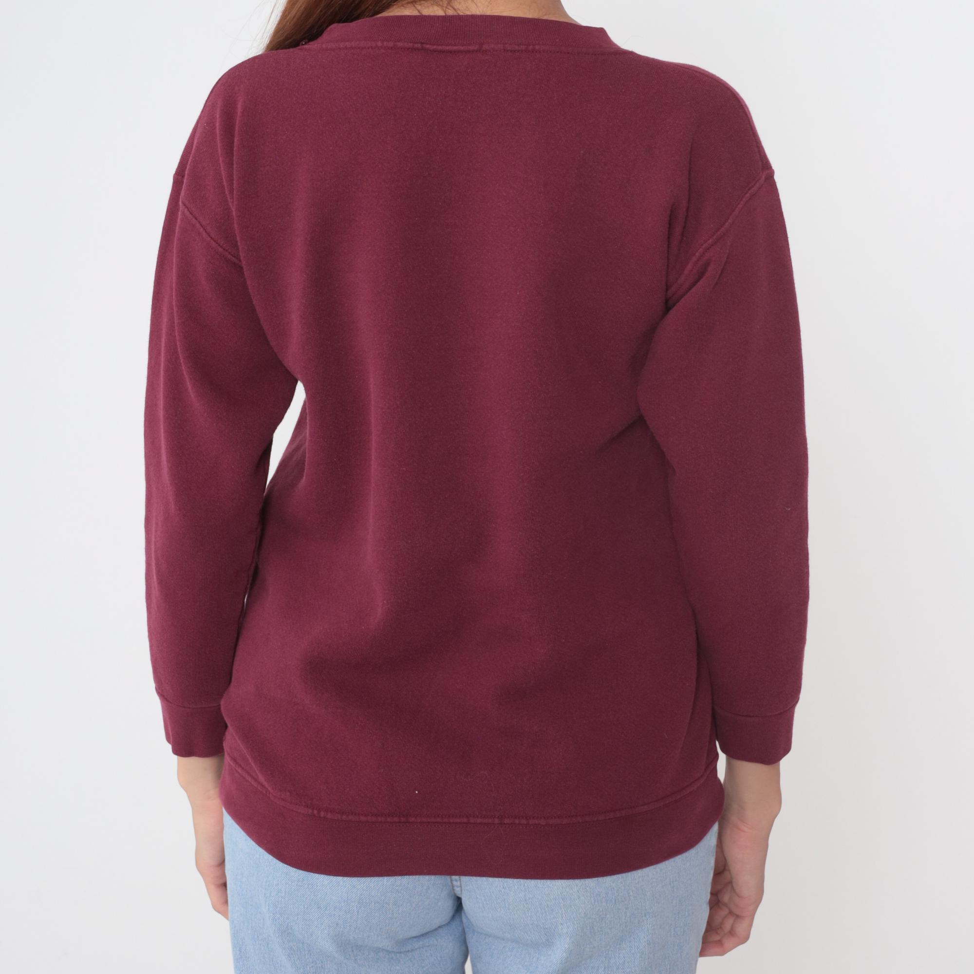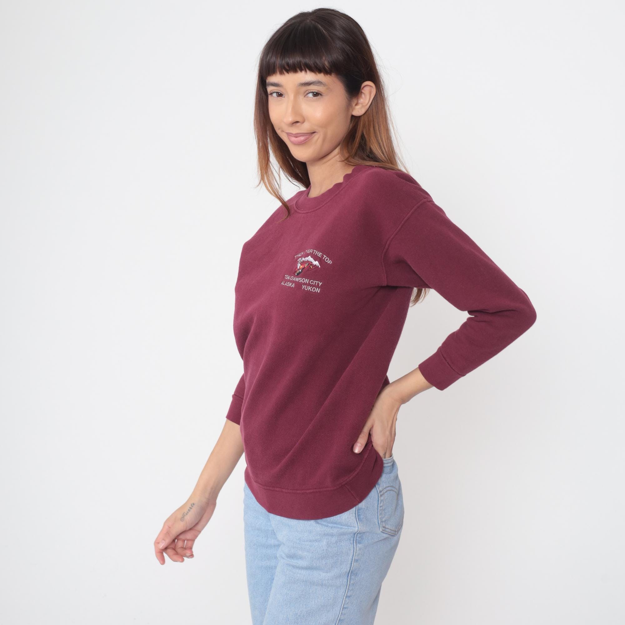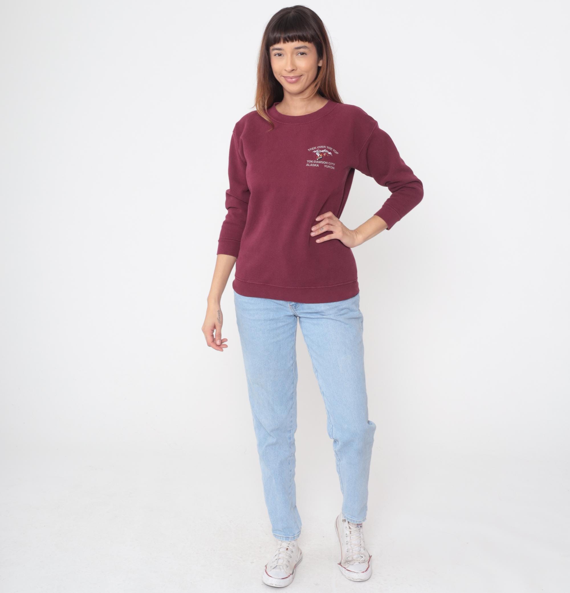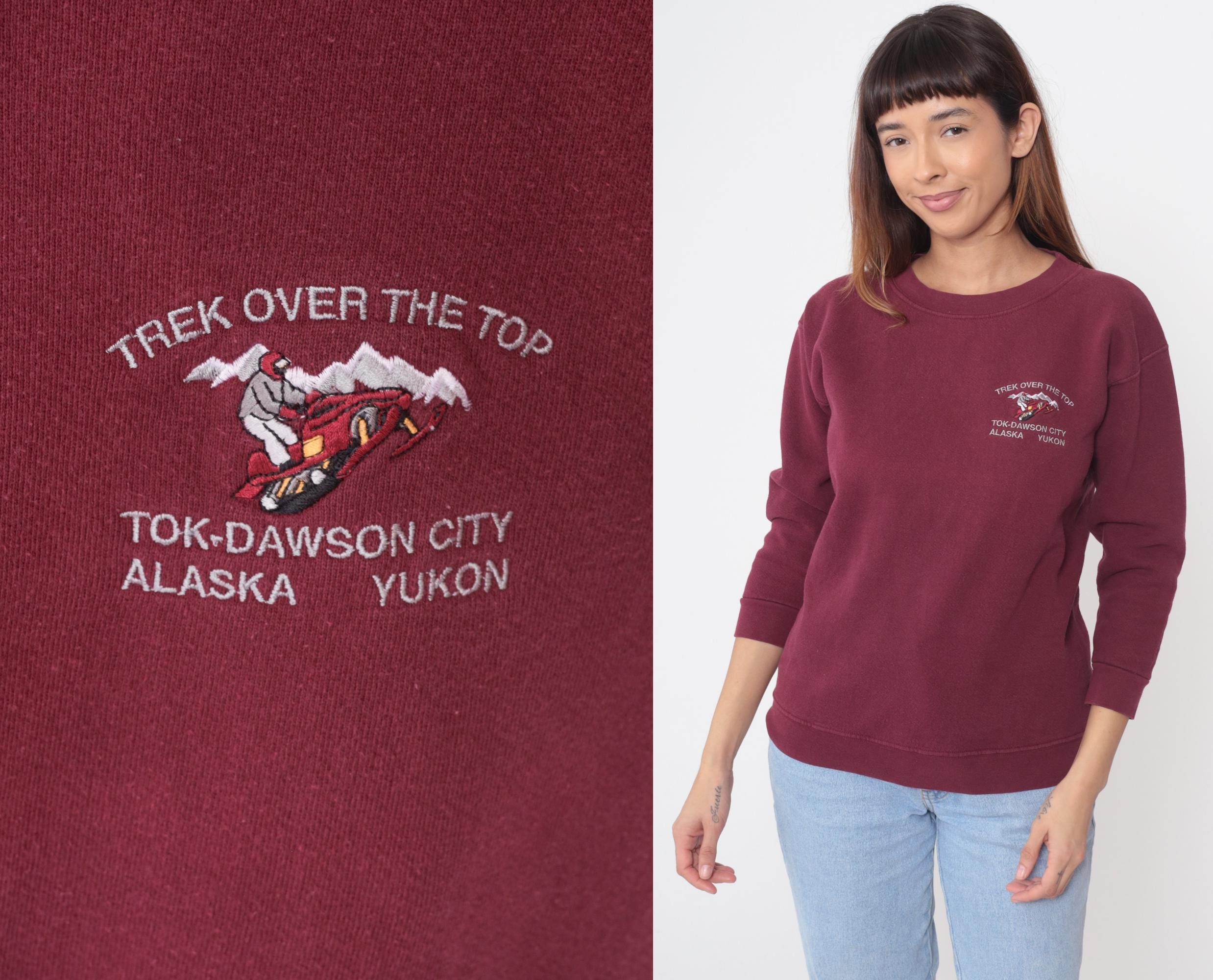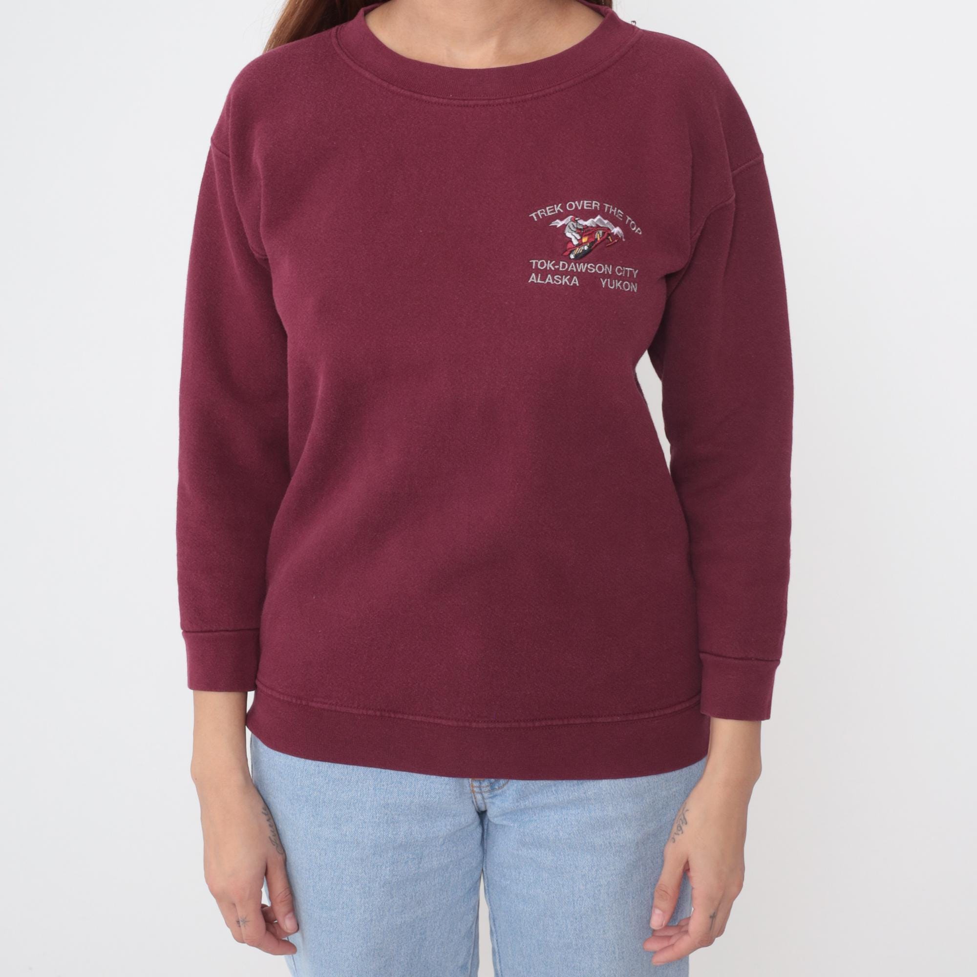 90s burgundy sweatshirt with embroidered design on left chest reading "Trek Over The Top" with dog sled graphic and mountain detail, text below reads "Tok-Dawson City Alaska Yukon". Crew neck with ribbed collar, long sleeves with ribbed cuffs, ribbed hem.