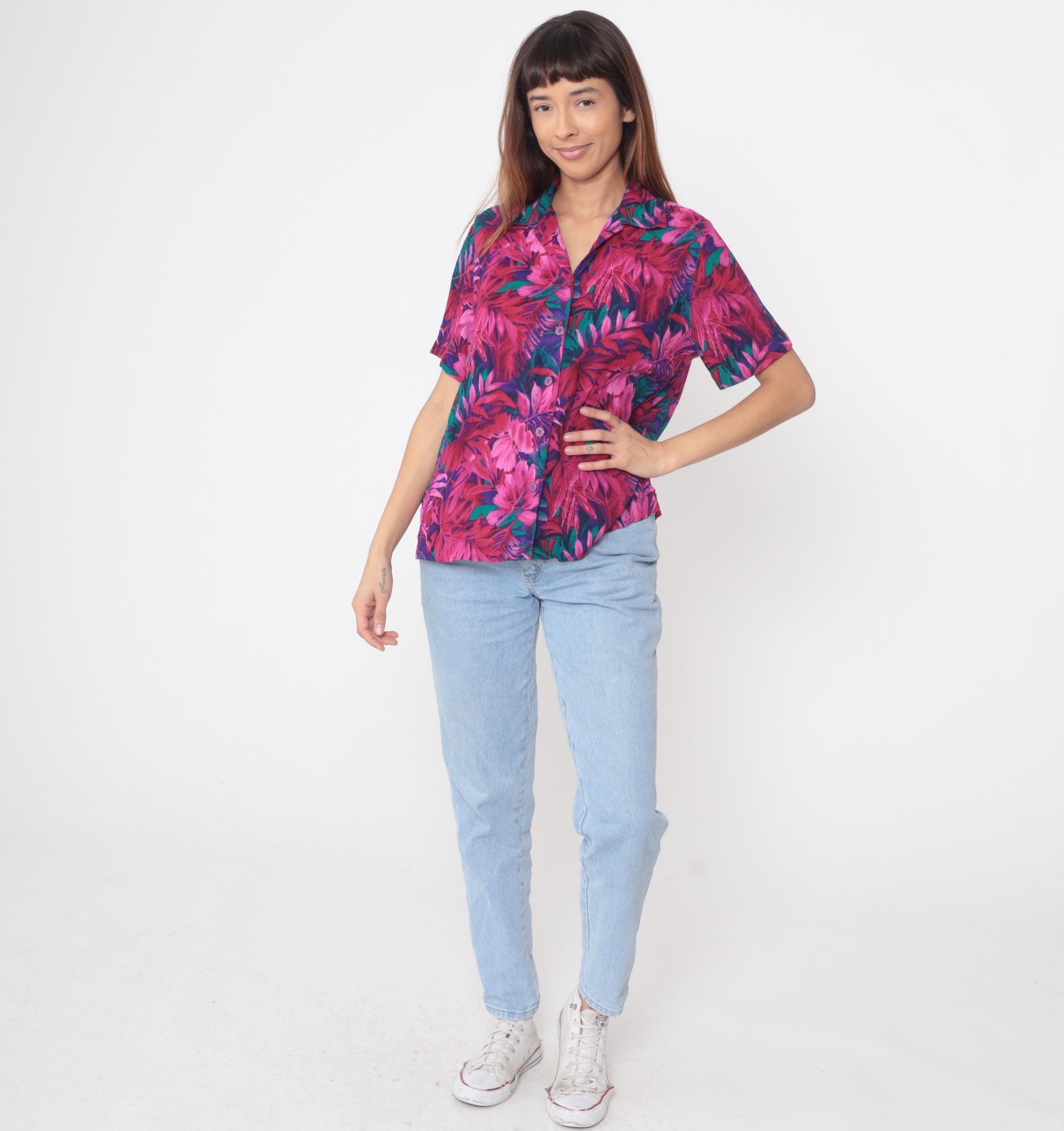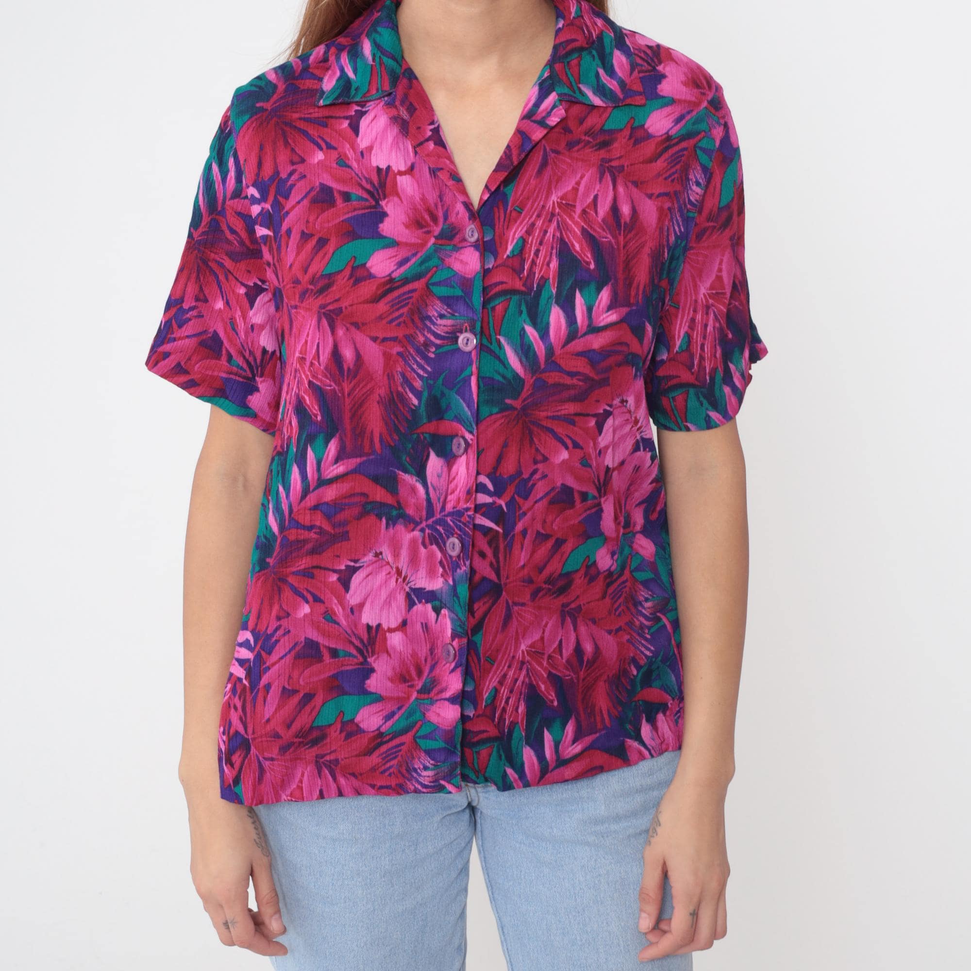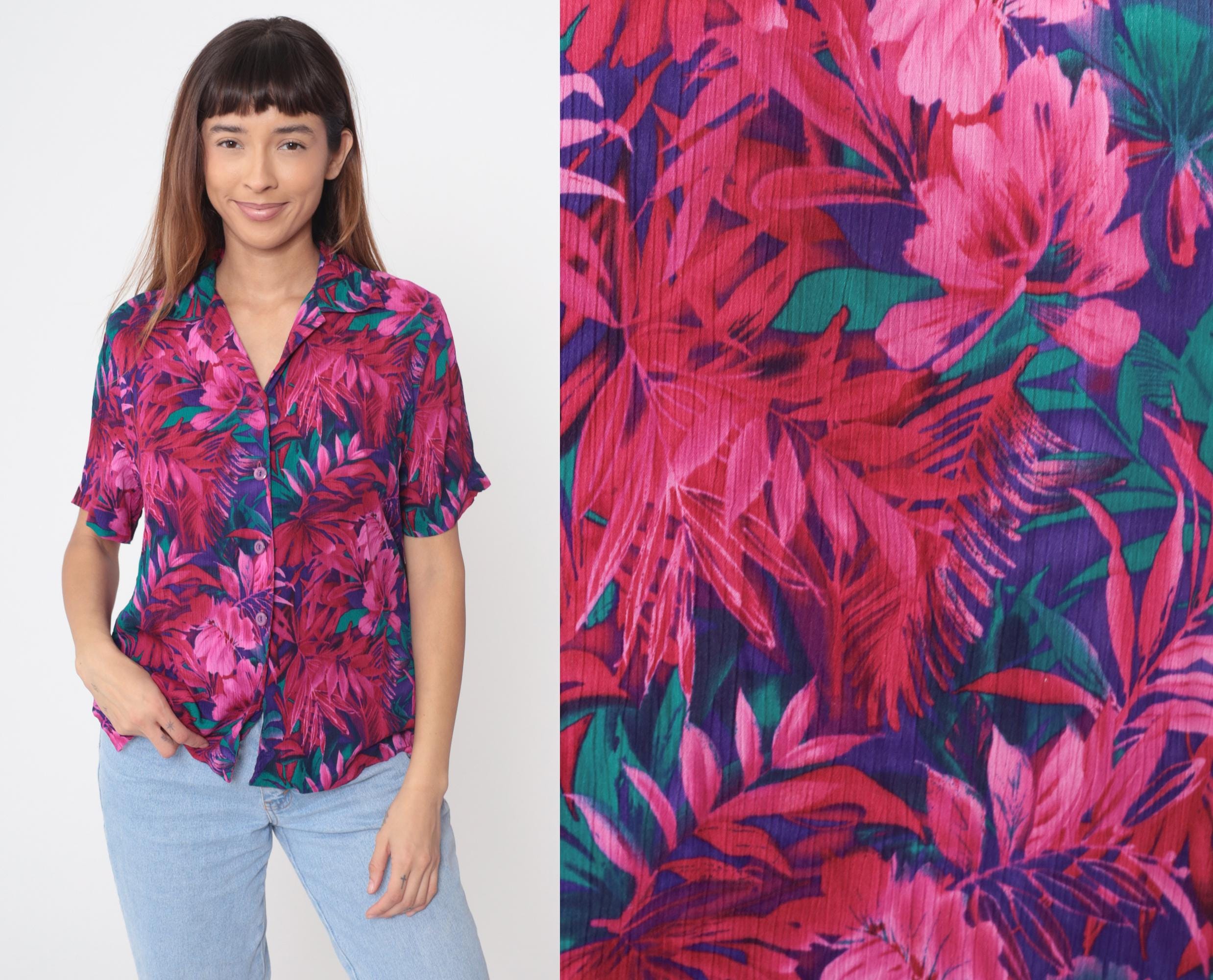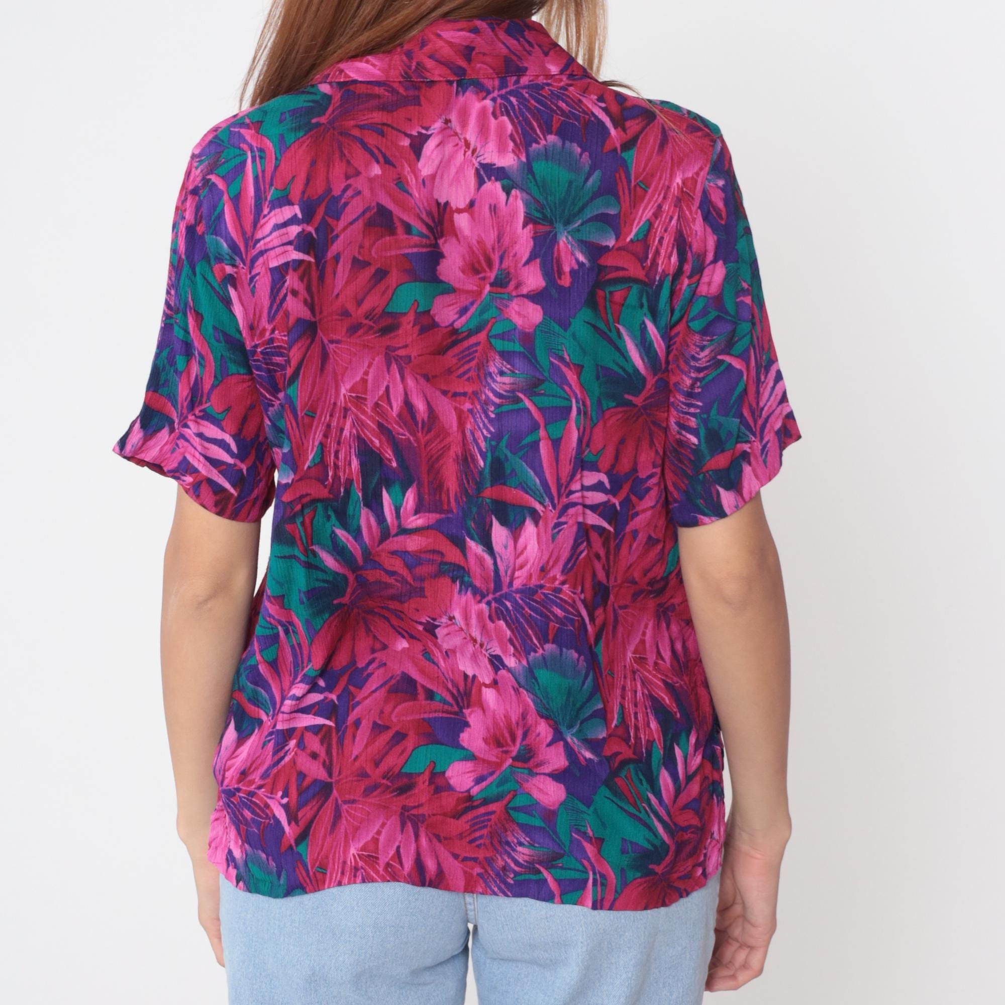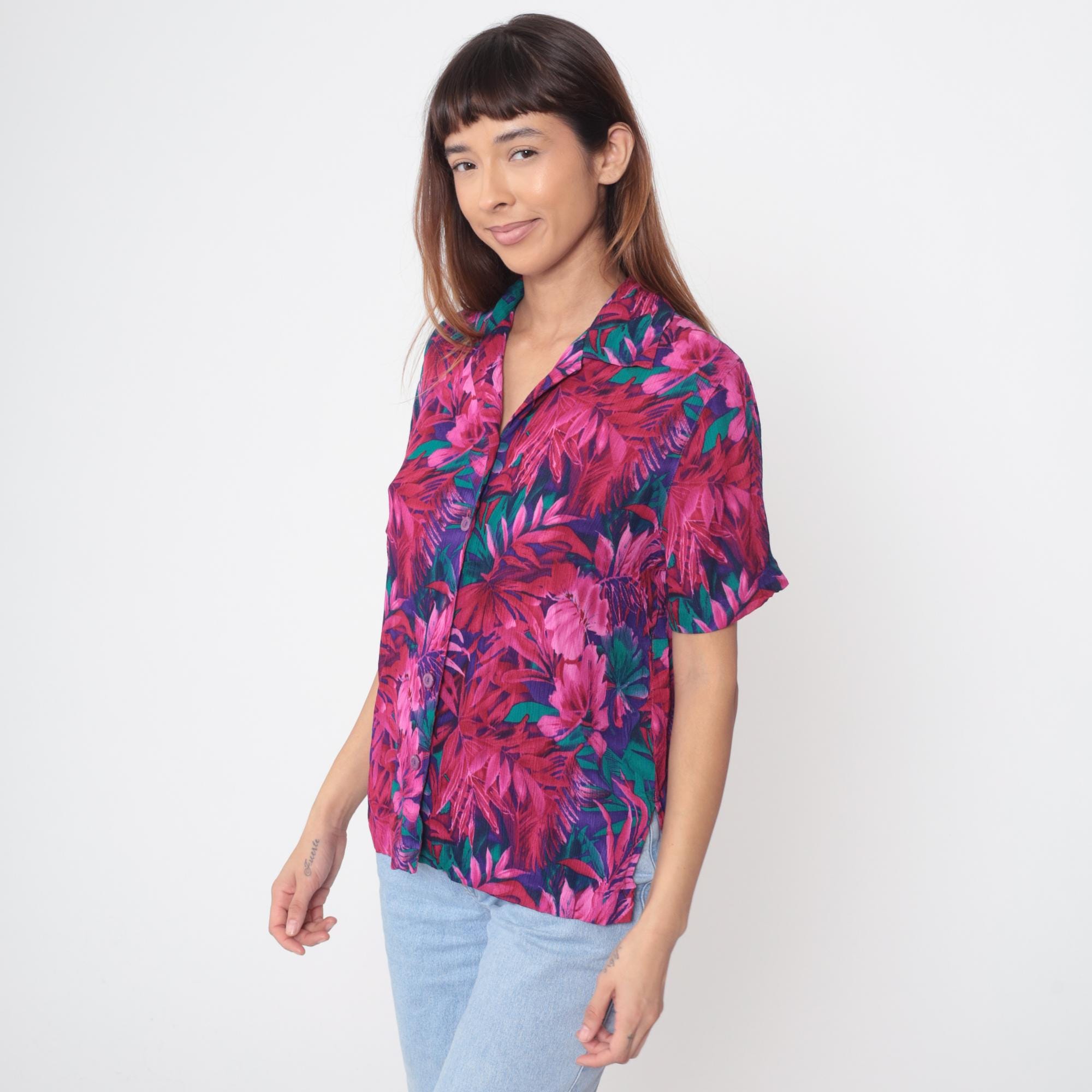 90s tropical floral button-up shirt in rayon with bold pink, fuchsia, red, green, and purple botanical print across the fabric. Notched collar, short sleeves with rolled cuffs, front button closure.