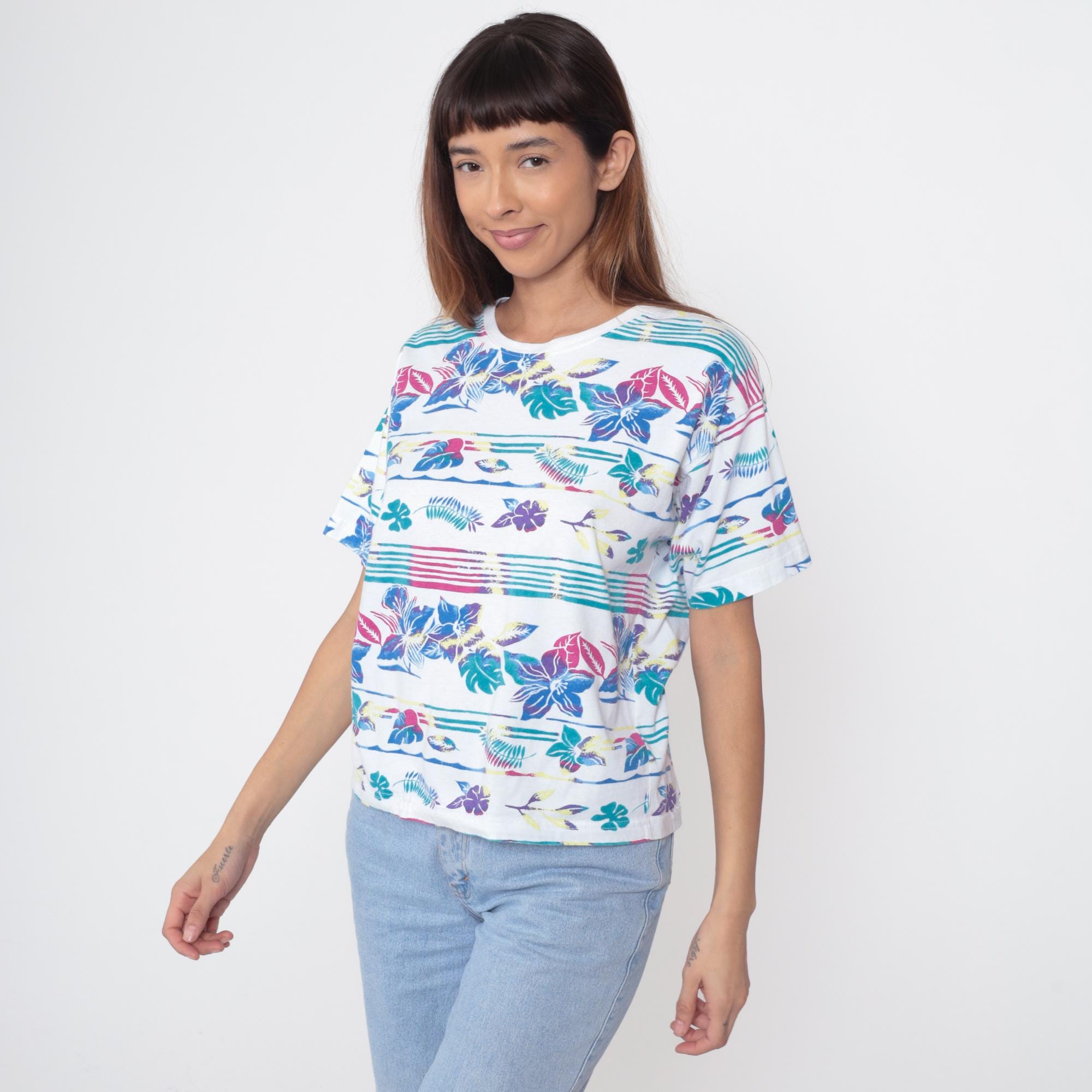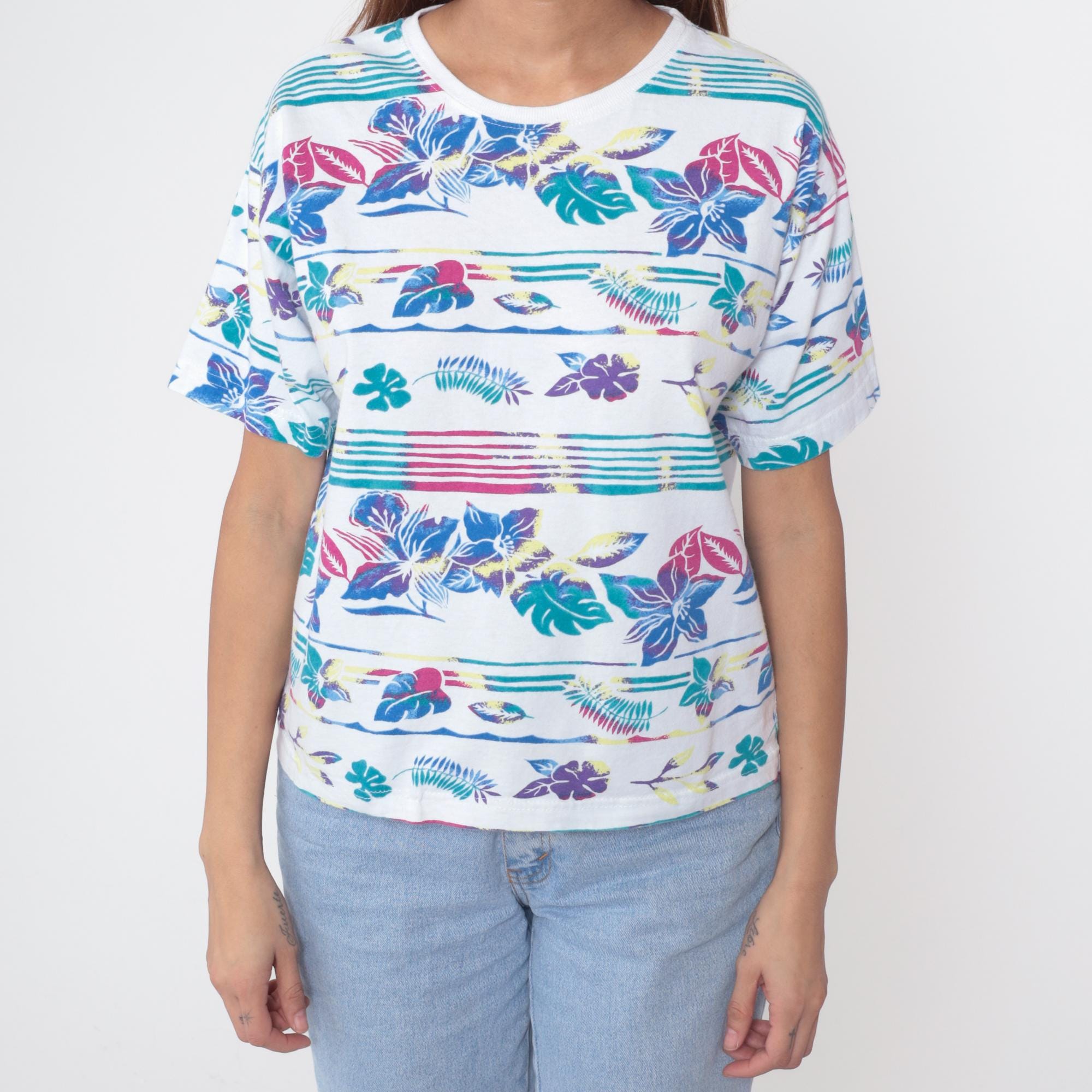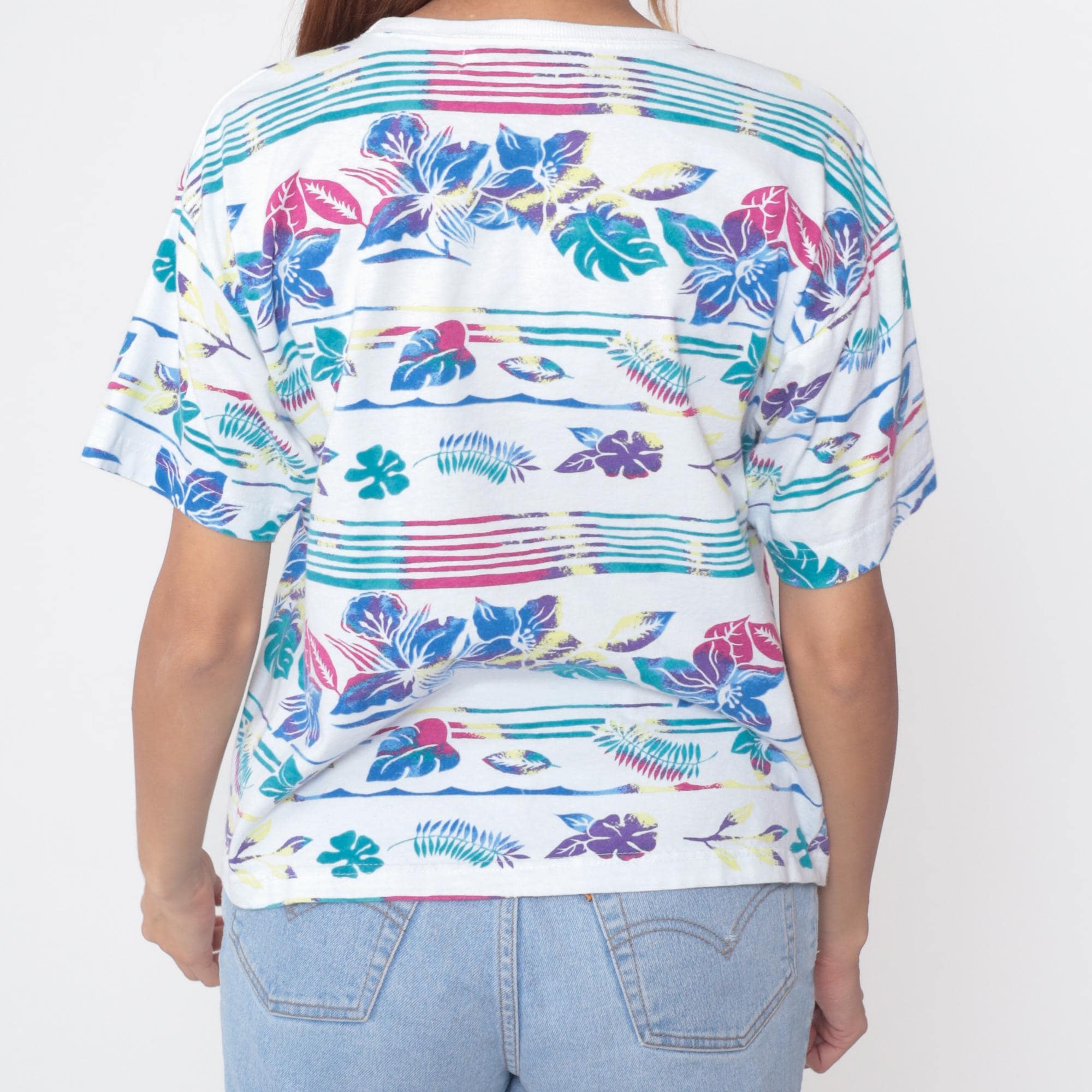 90s white t-shirt from Victoria Jones with tropical floral and stripe pattern. Turquoise, pink, purple, and yellow horizontal stripes with hibiscus flowers, monstera leaves, and palm fronds across the fabric.