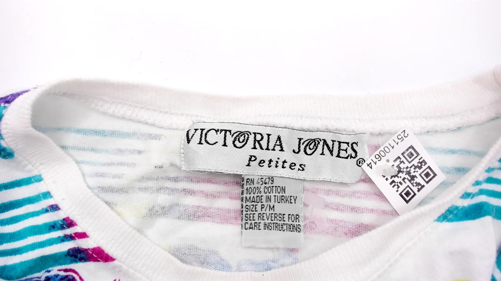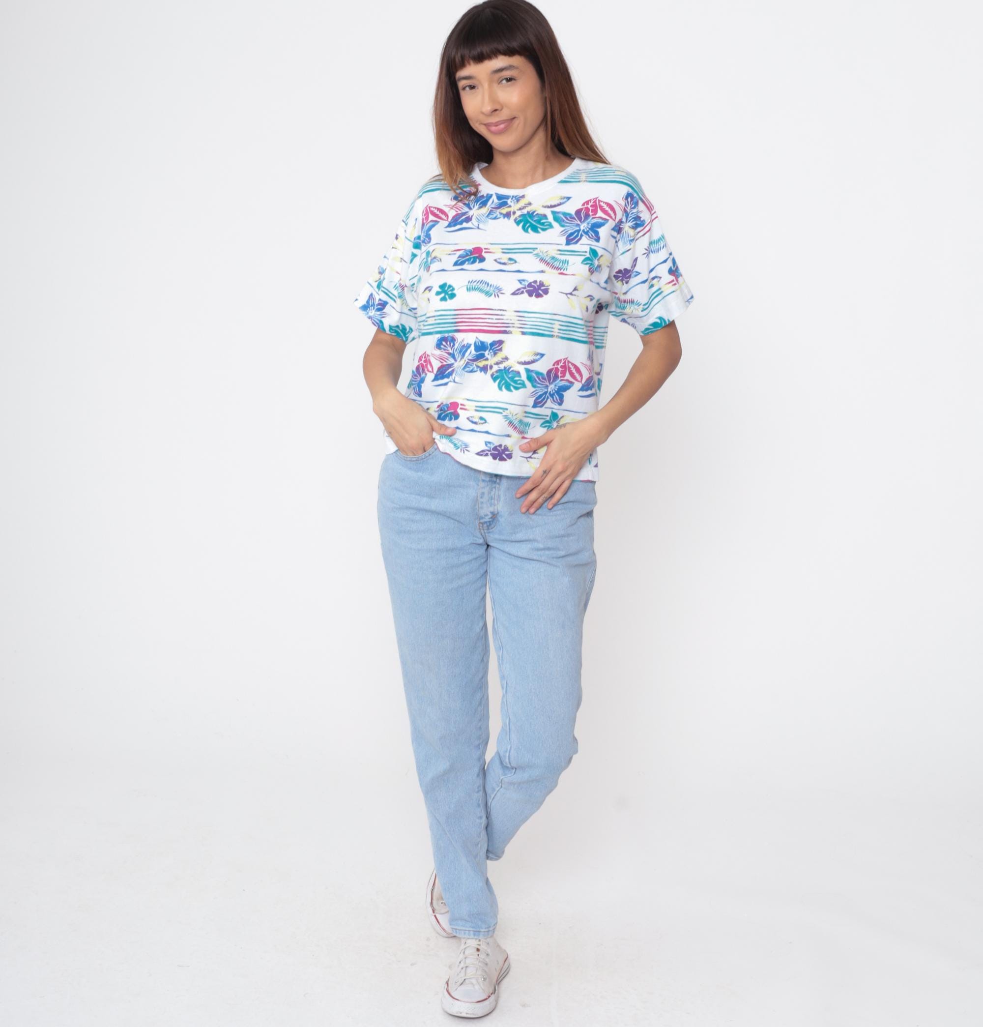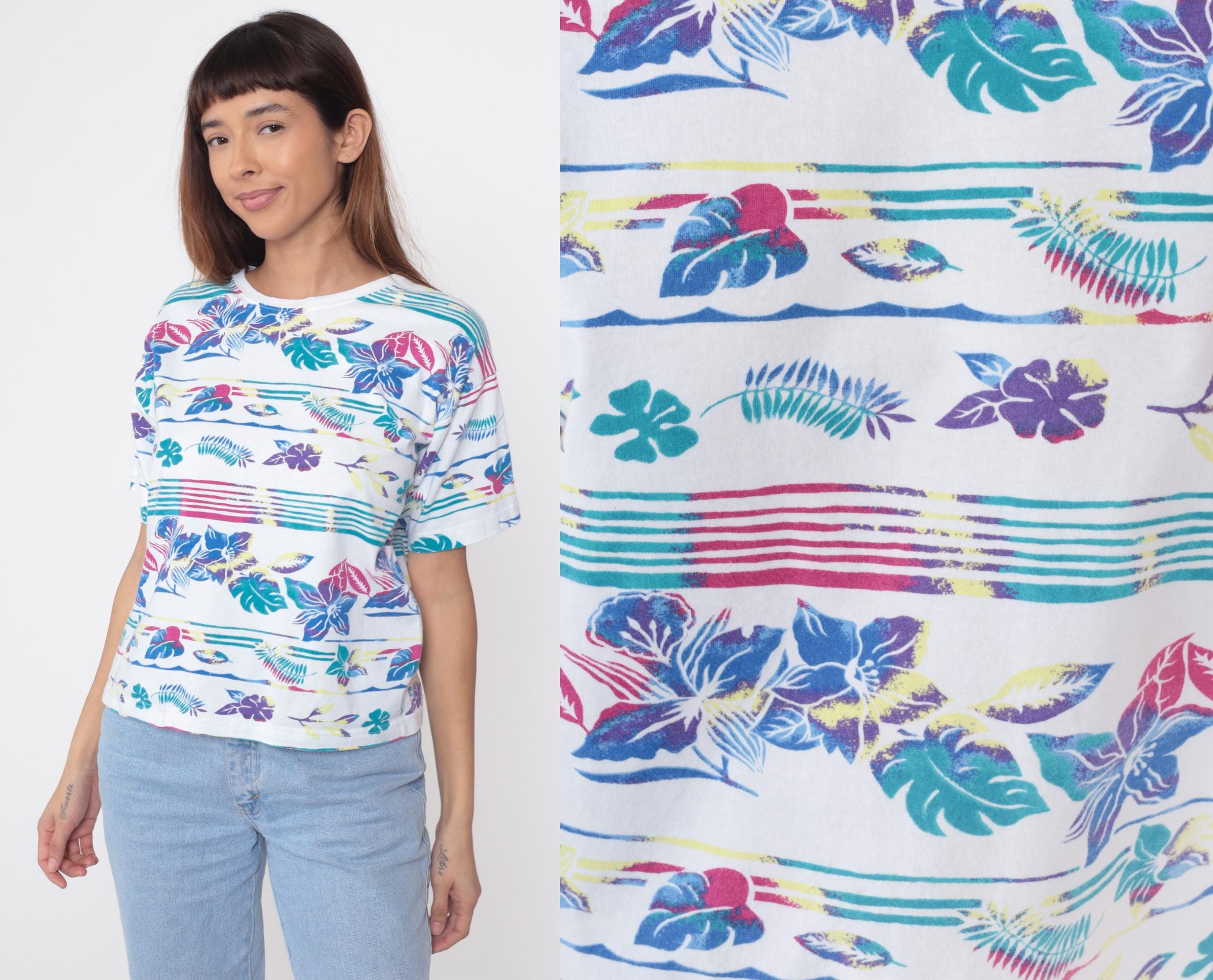 90s white t-shirt from Victoria Jones with tropical floral and stripe pattern. Turquoise, pink, purple, and yellow horizontal stripes with hibiscus flowers, monstera leaves, and palm fronds across the fabric.