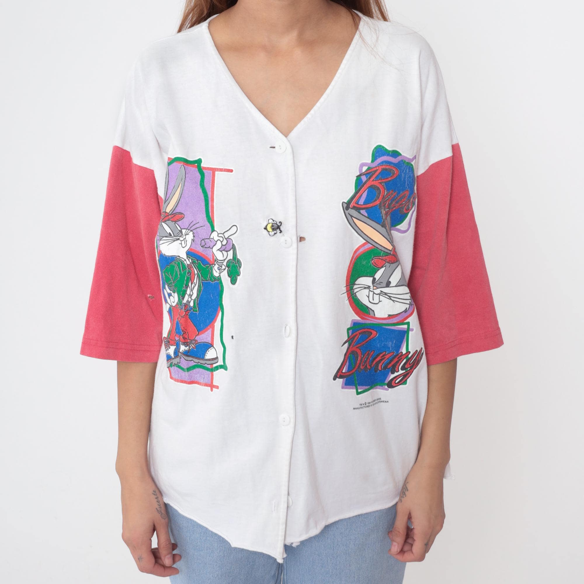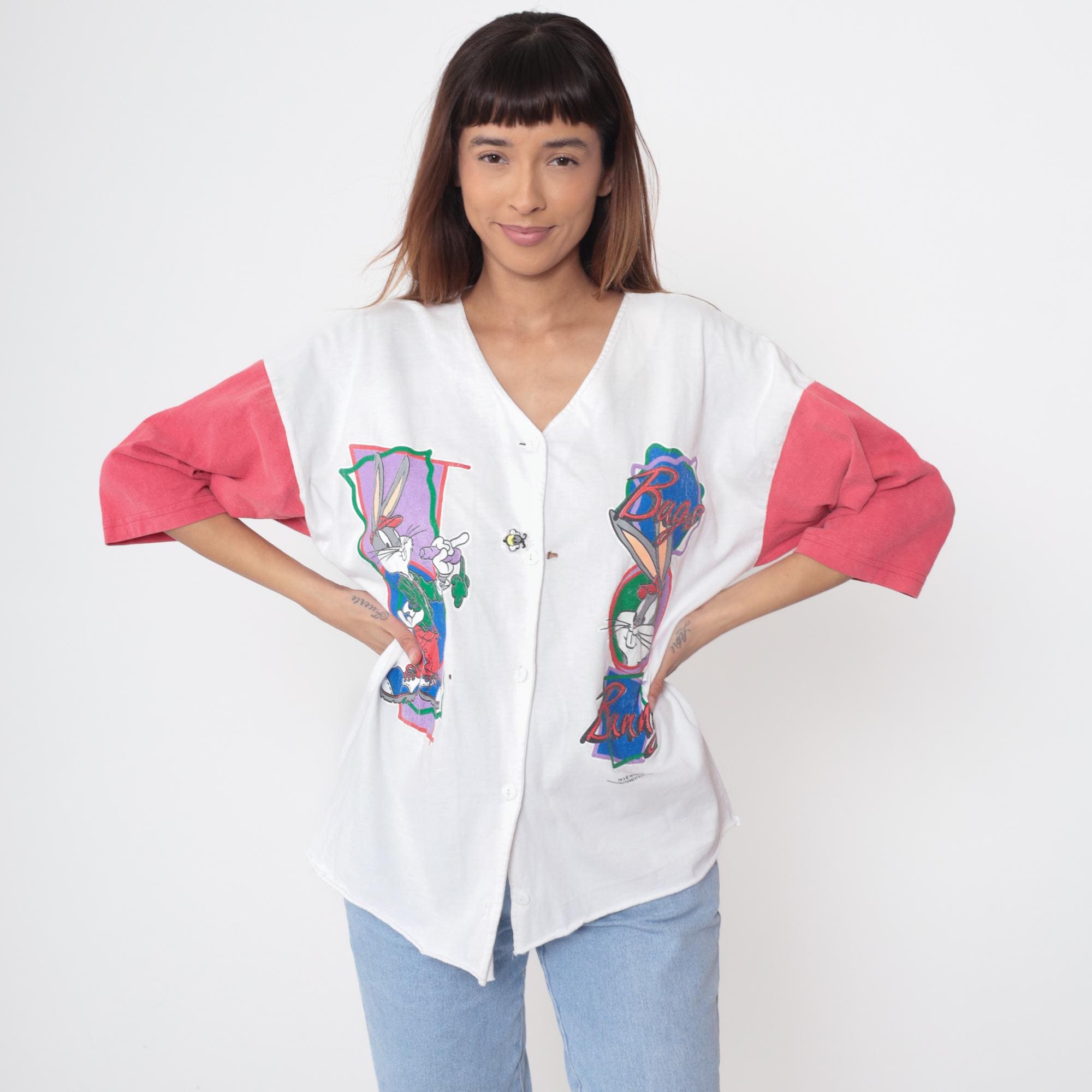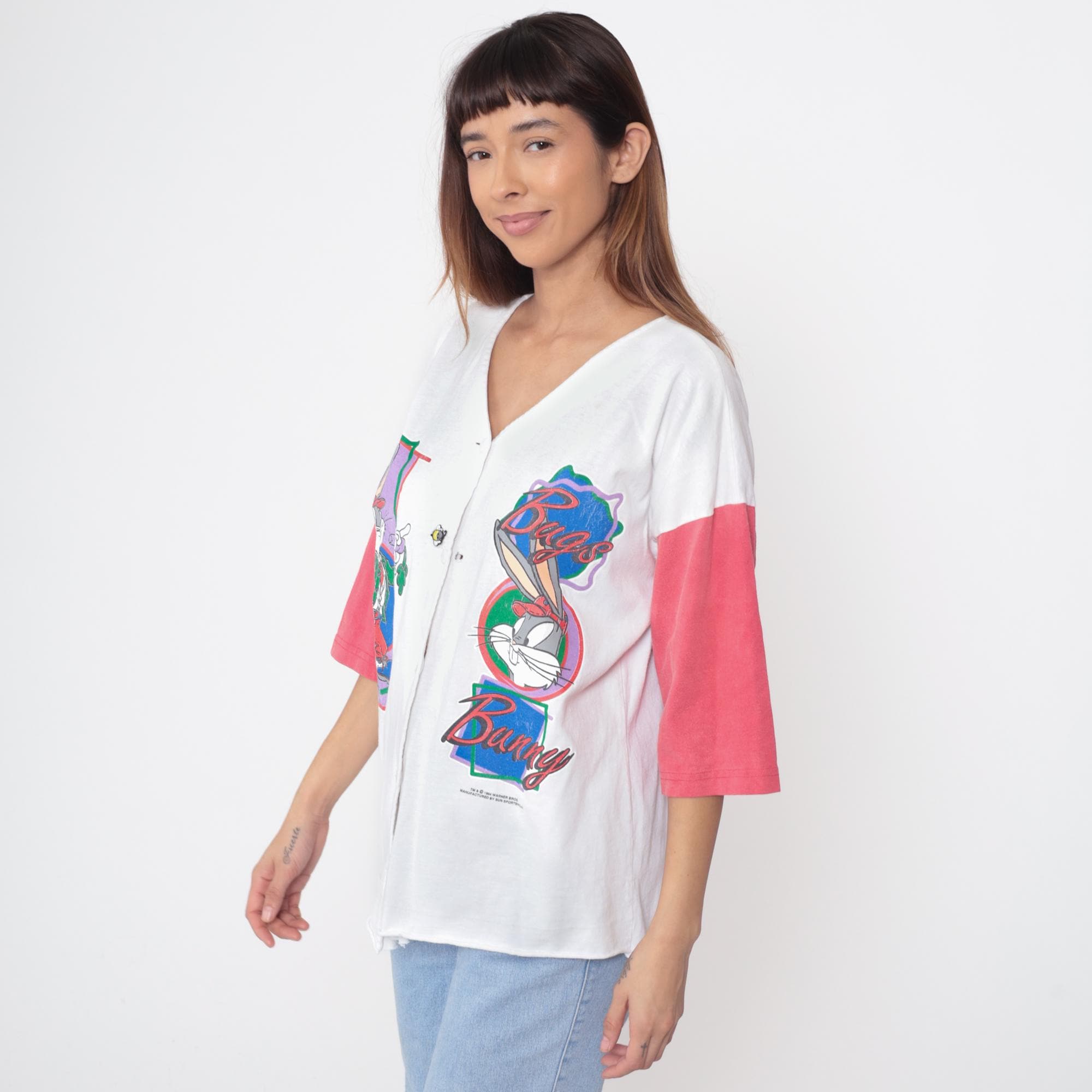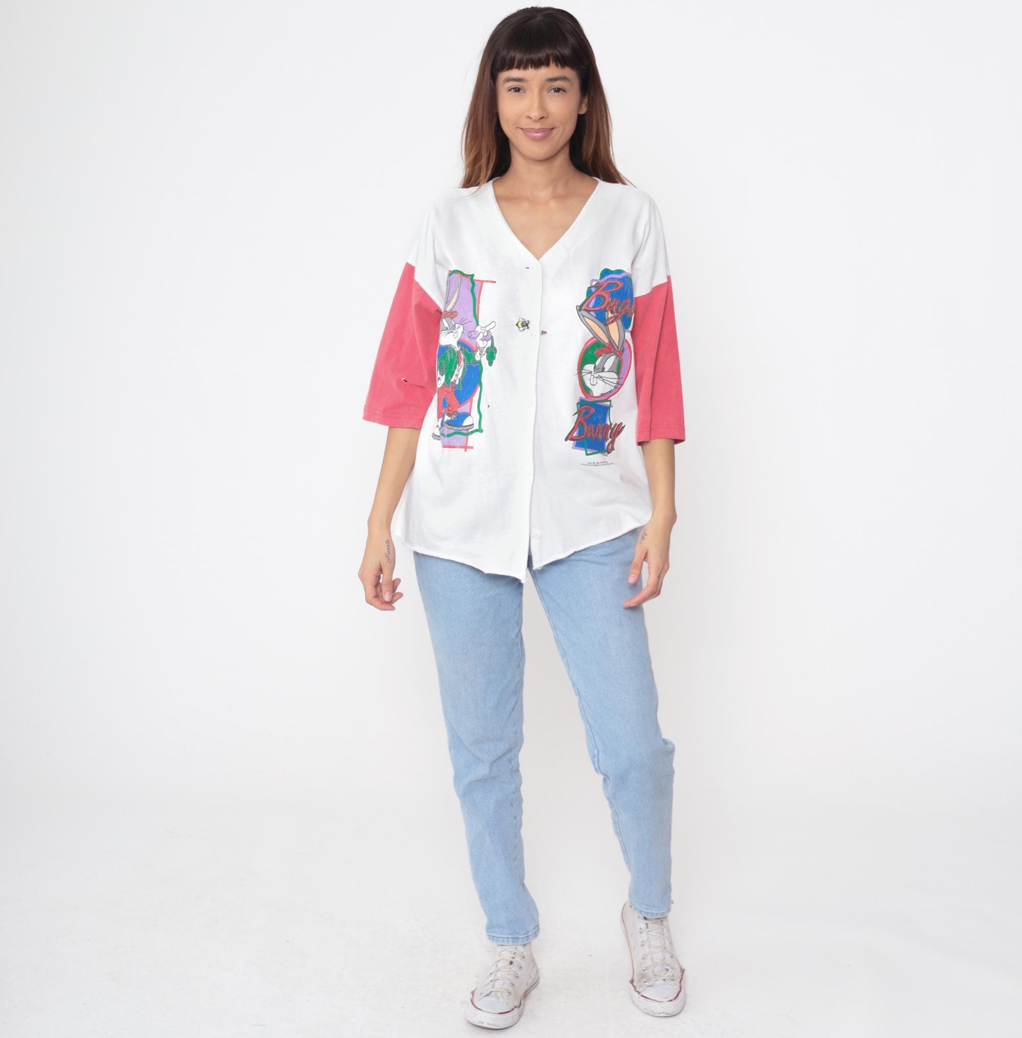 90s Looney Tunes baseball jersey in white cotton with pink color block sleeves and button front closure. Bugs Bunny graphics on front left and right sides with script "Bunny" text in blue, pink, green, and red. V-neck collar, three-quarter length sleeves.