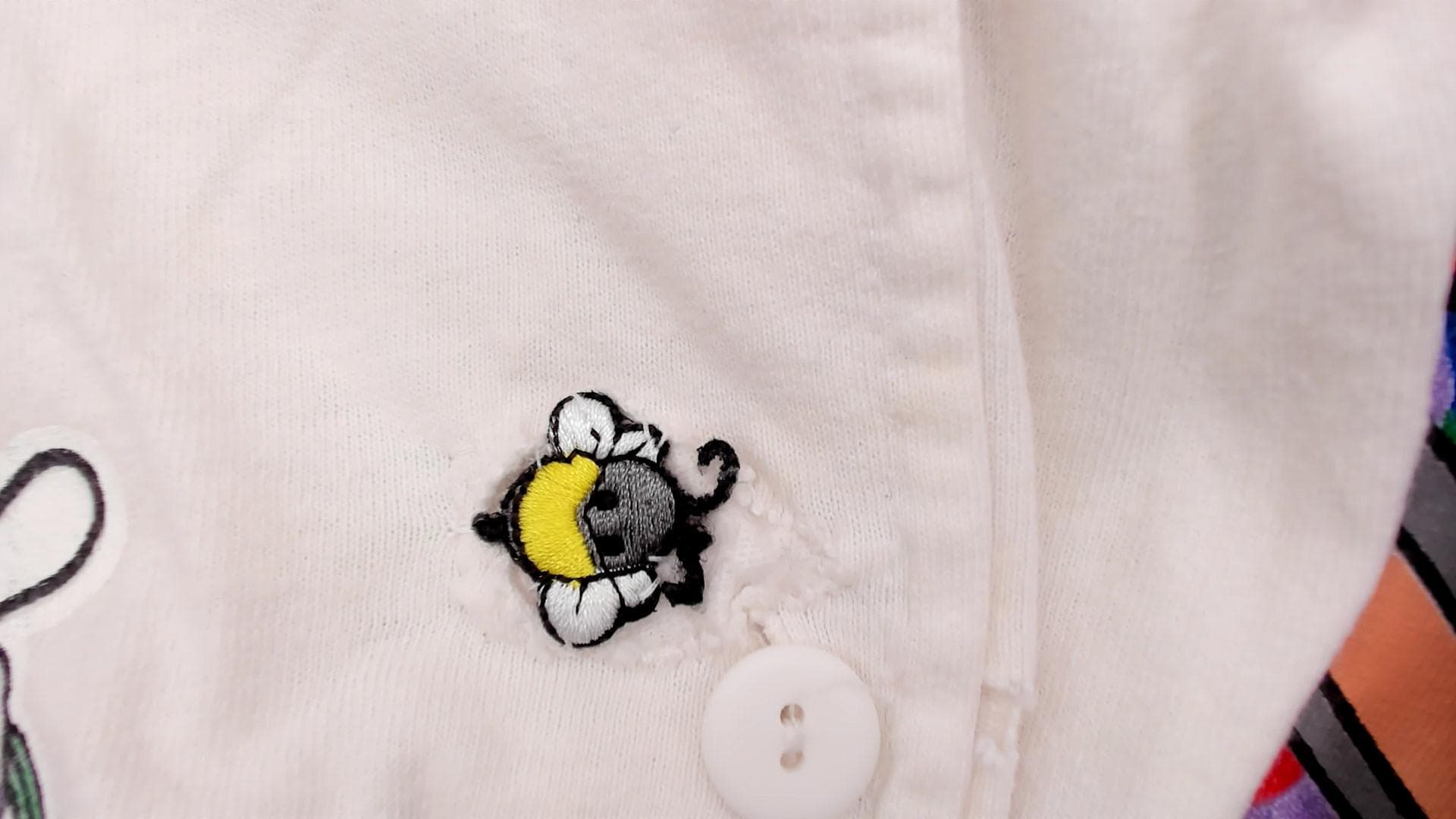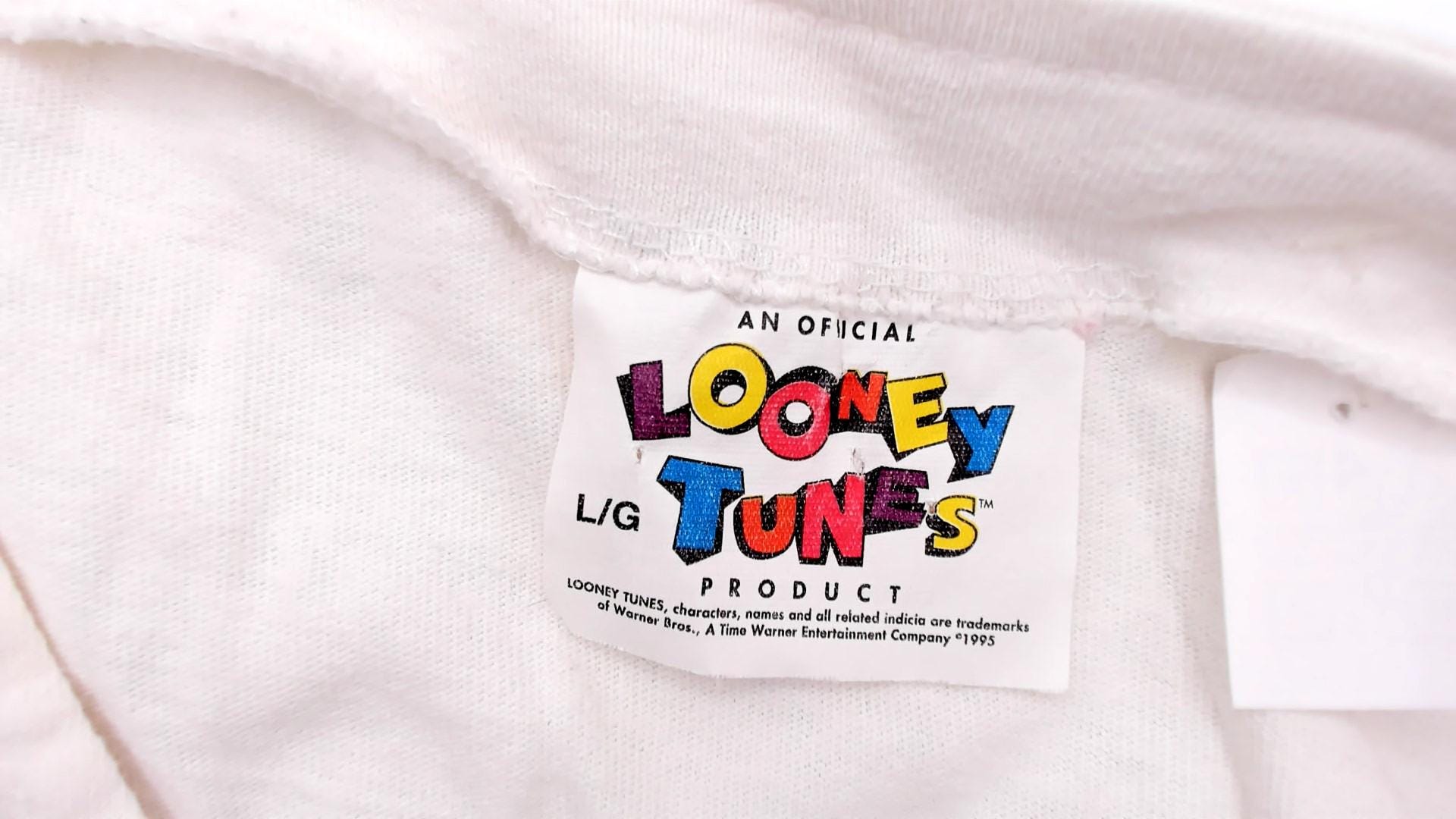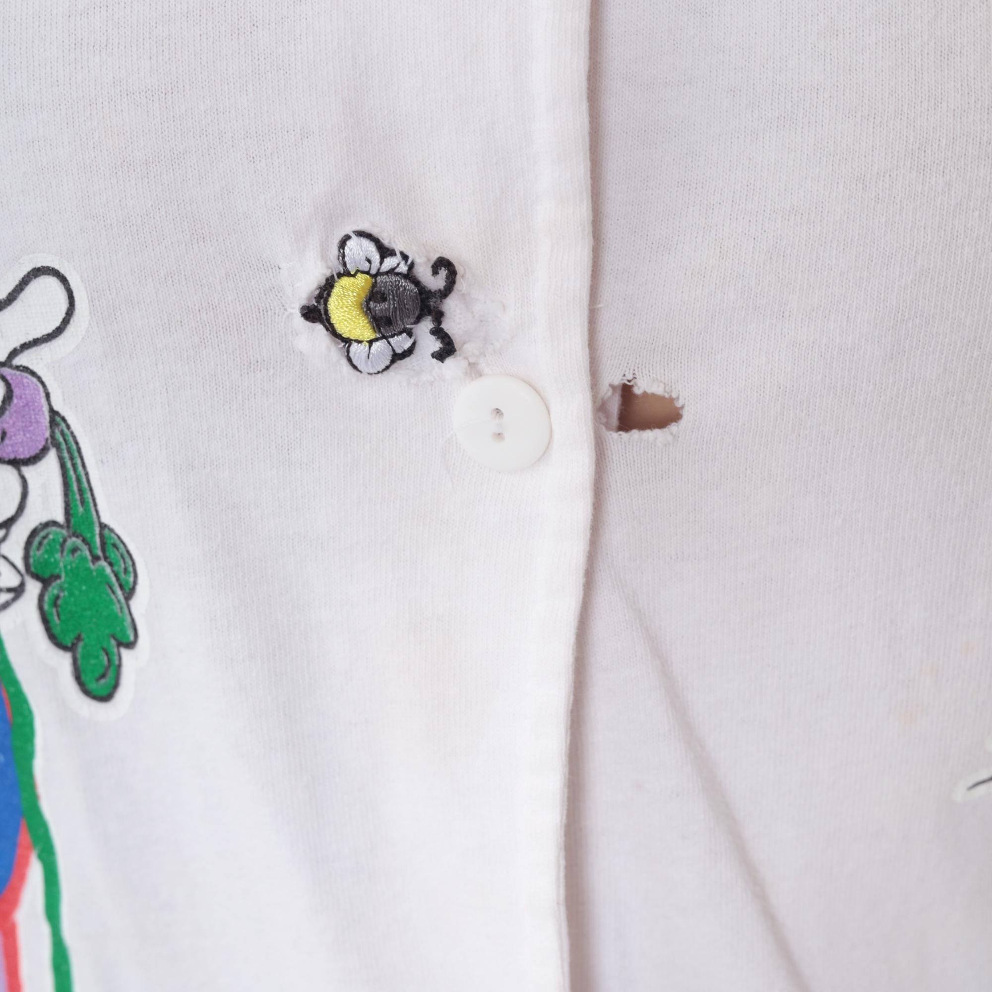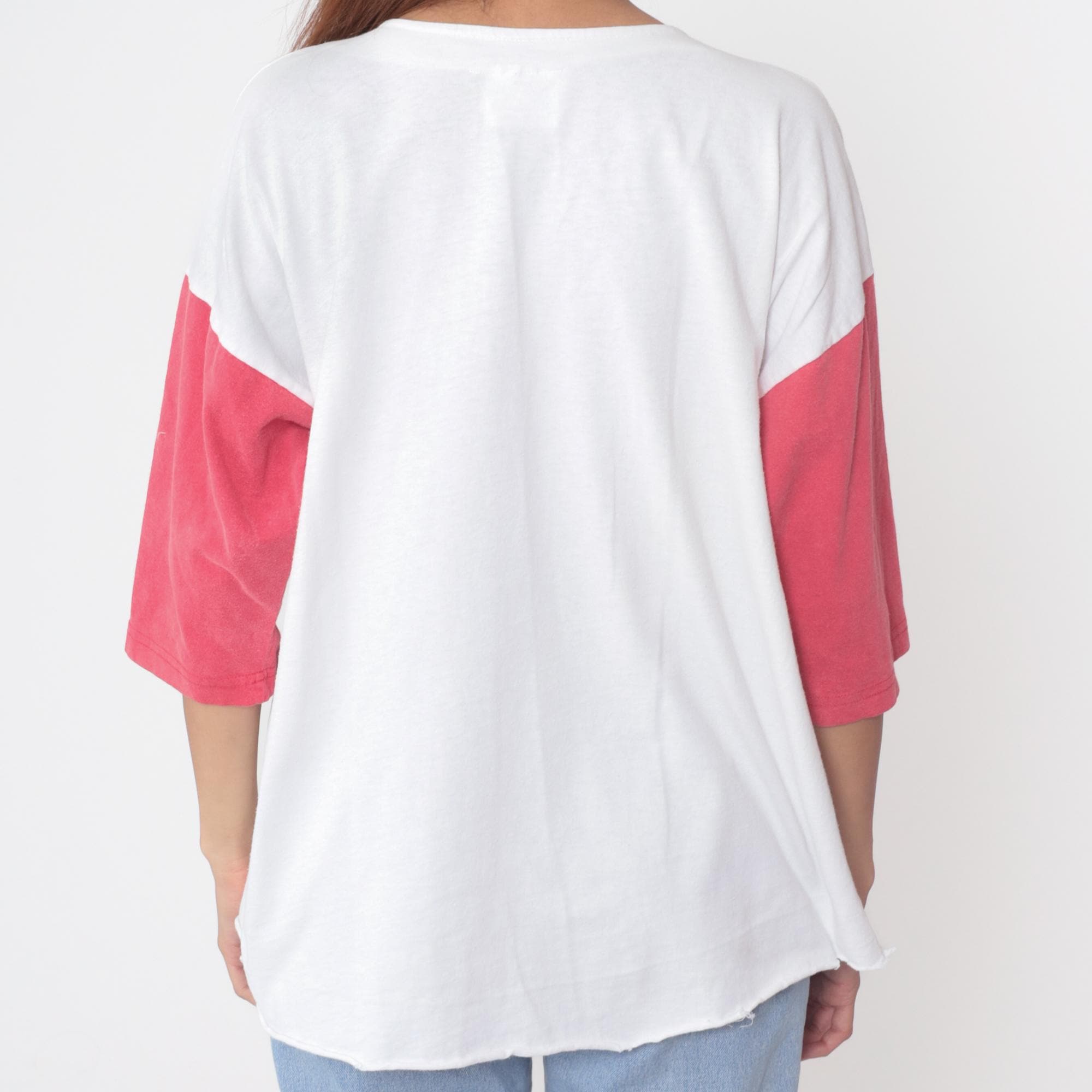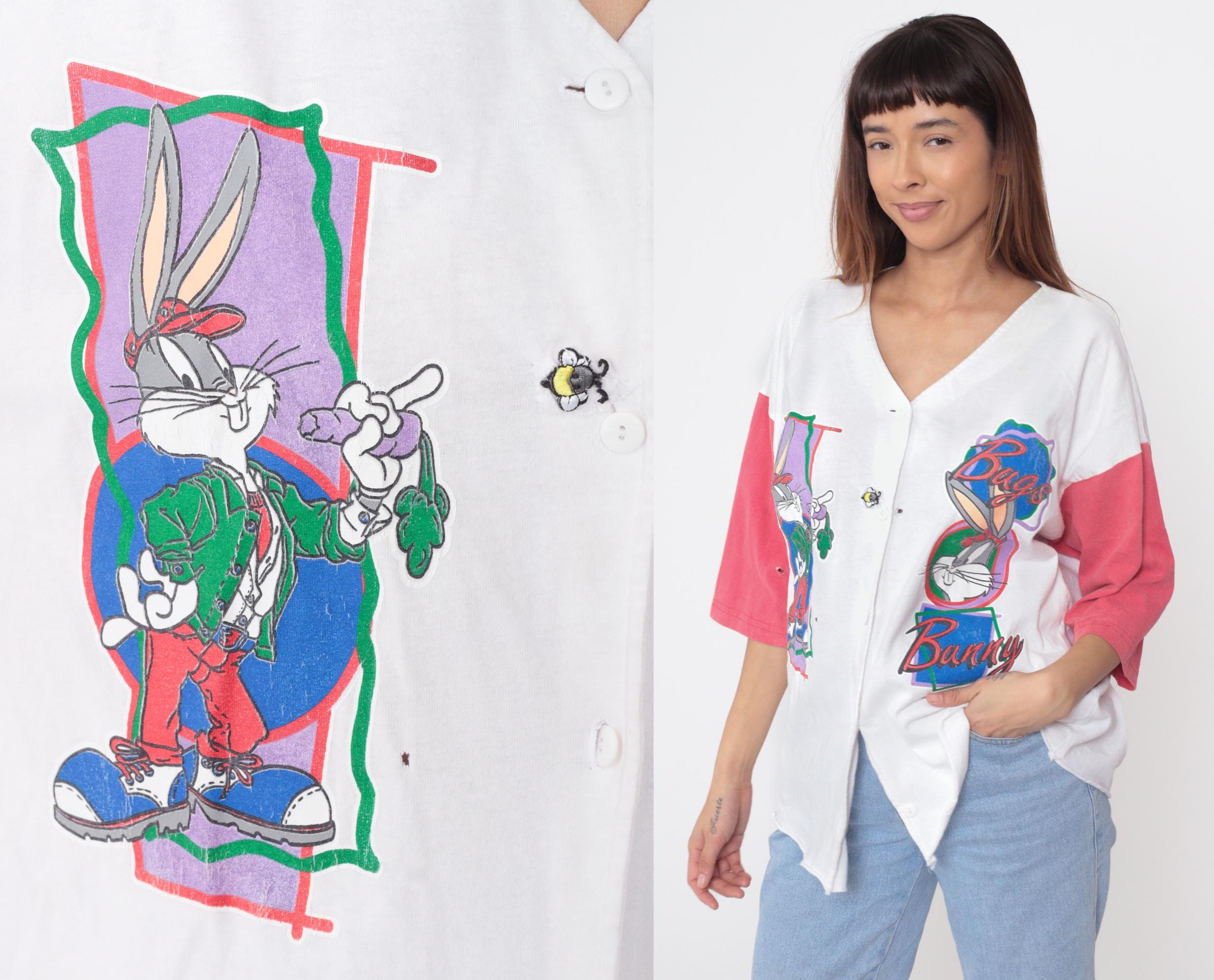 90s Looney Tunes baseball jersey in white cotton with pink color block sleeves and button front closure. Bugs Bunny graphics on front left and right sides with script "Bunny" text in blue, pink, green, and red. V-neck collar, three-quarter length sleeves.