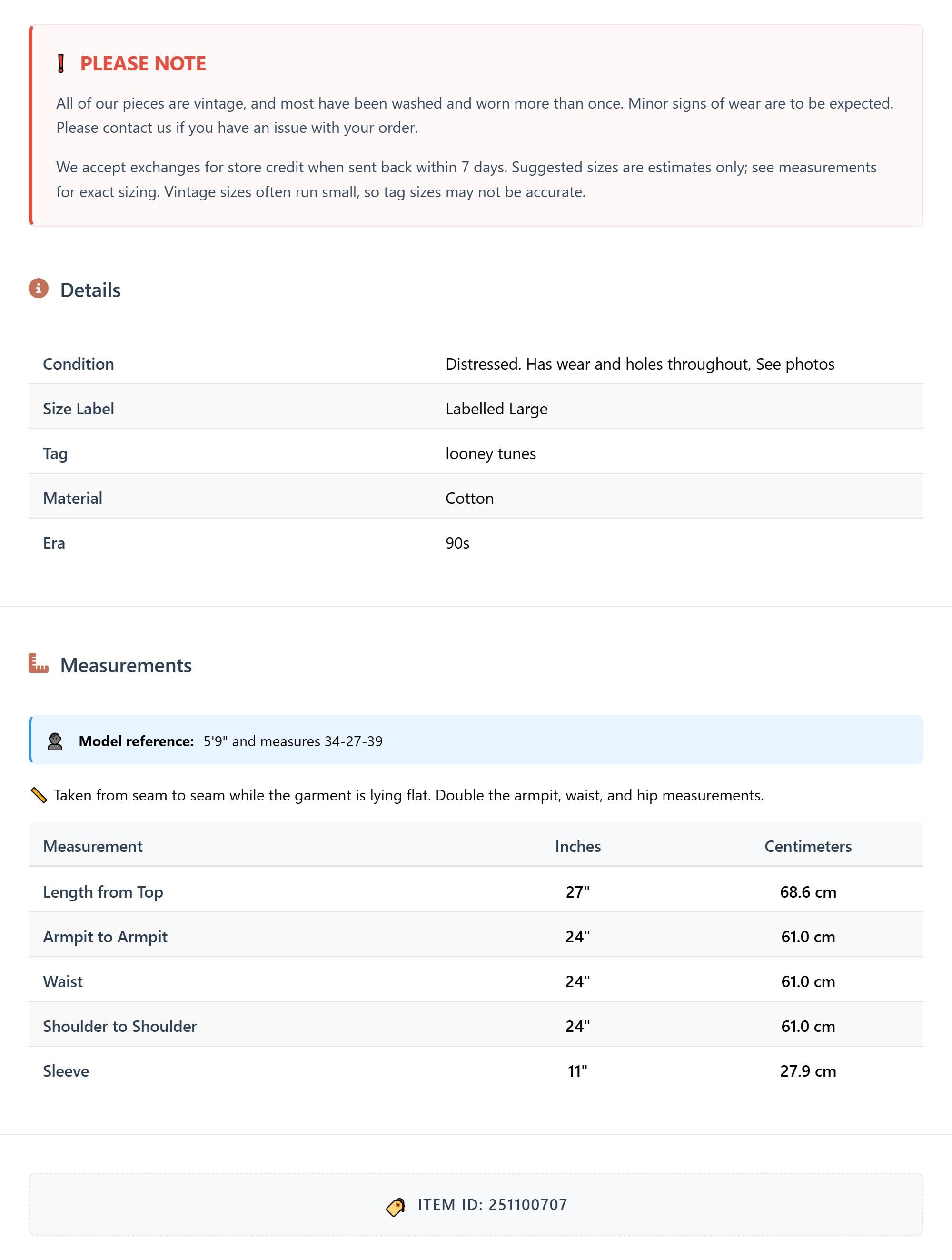 All of our pieces are vintage, and most have been washed and worn more than once. Minor signs of wear are to be expected. Please contact us if you have an issue with your order. We accept exchanges for store credit when sent back within 7 days.