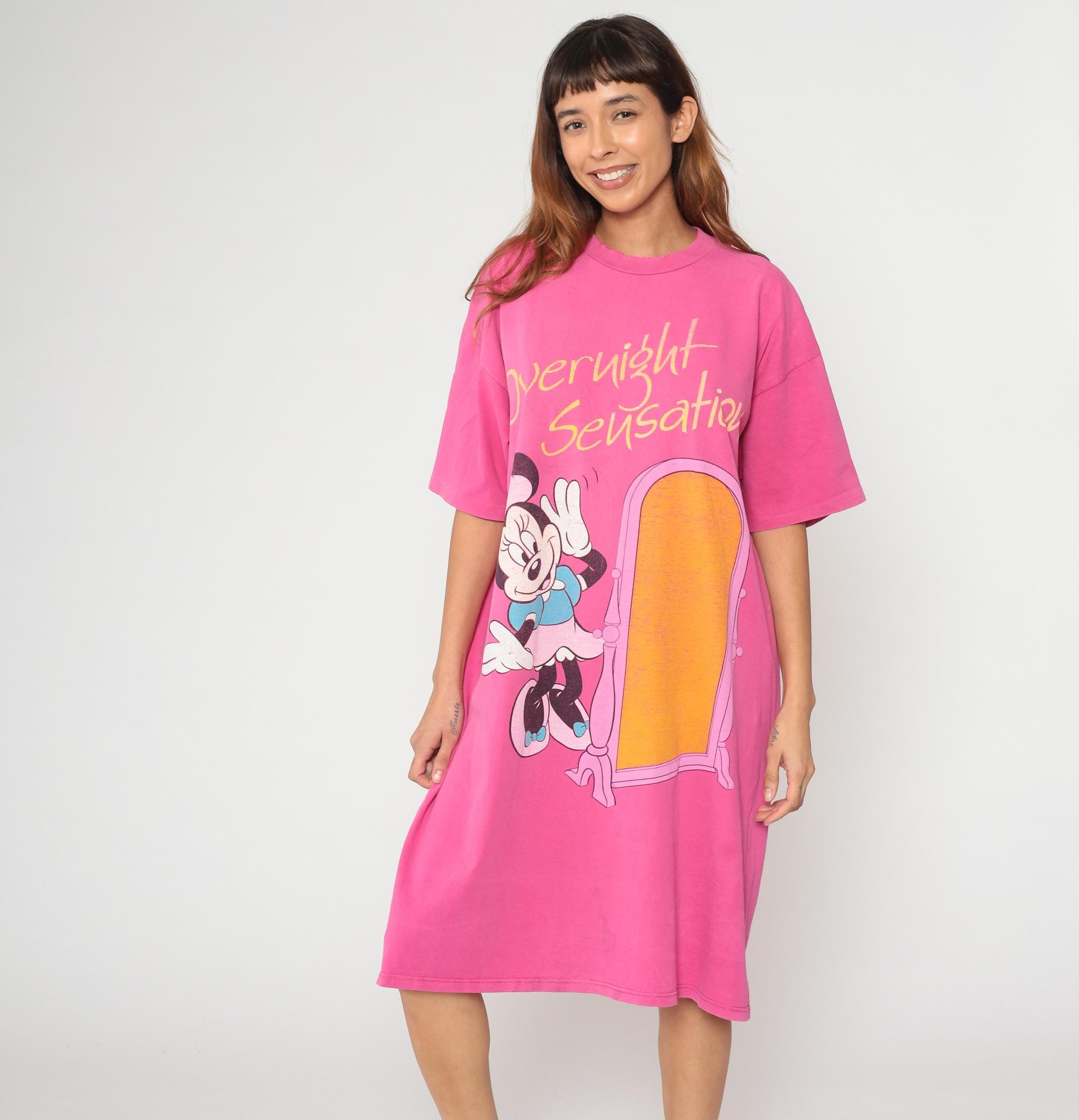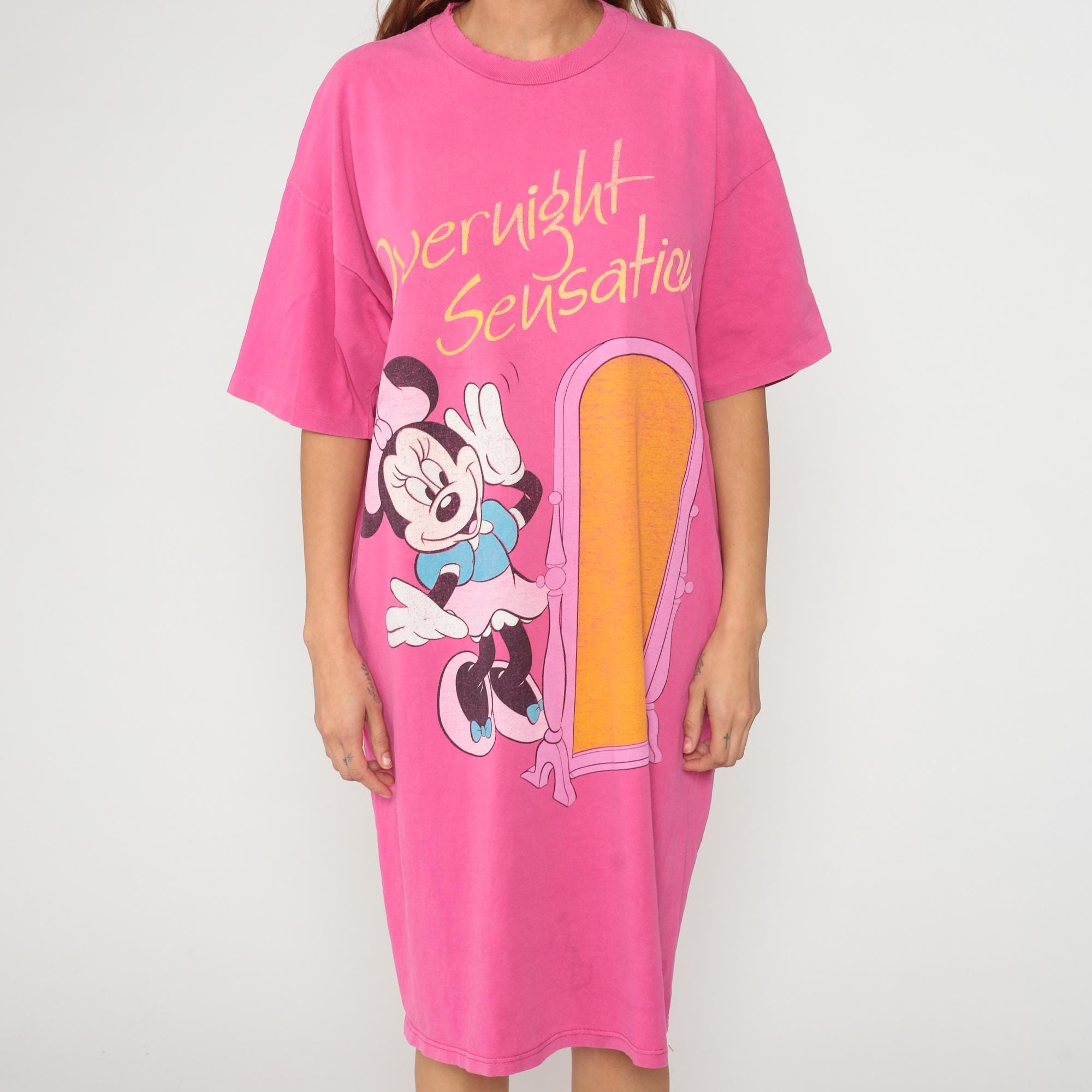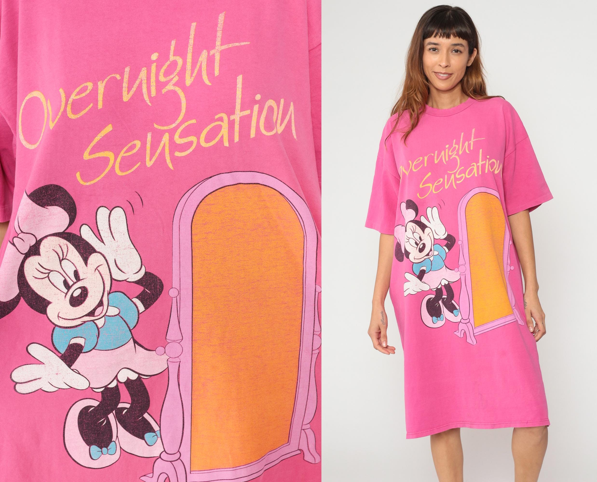 90s hot pink Minnie Mouse nightshirt from Disney Designs with graphic print on front and back. Front features "Overnight Sensation" text with Minnie looking at a mirror, back shows Minnie in a purple robe with hair curlers and beauty accessories. Oversized t-shirt dress construction with short sleeves and crew neckline.