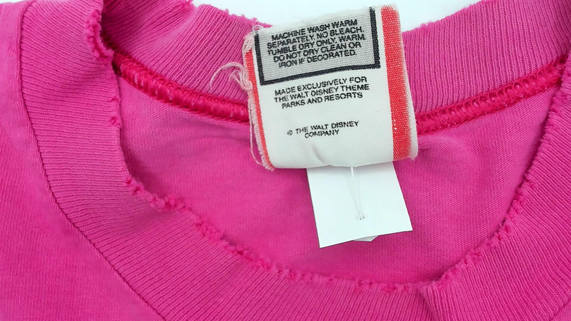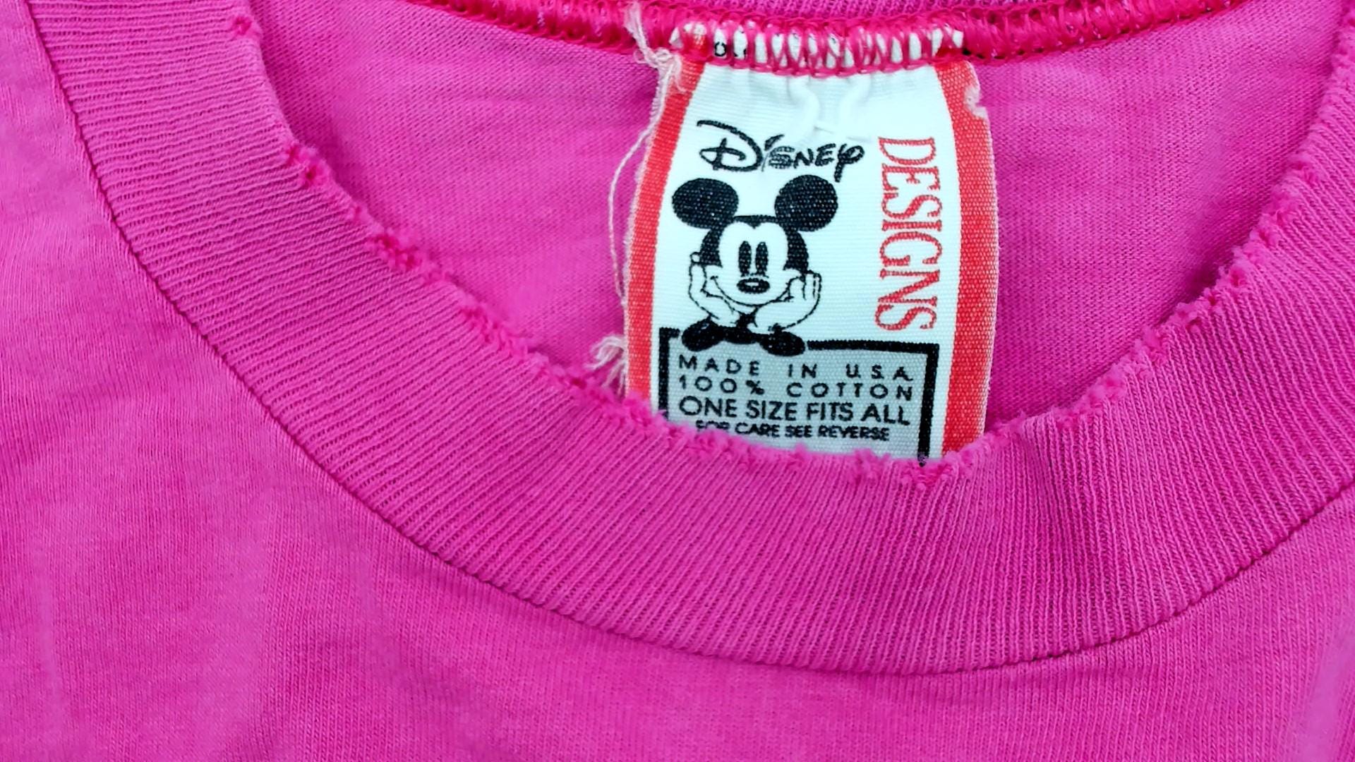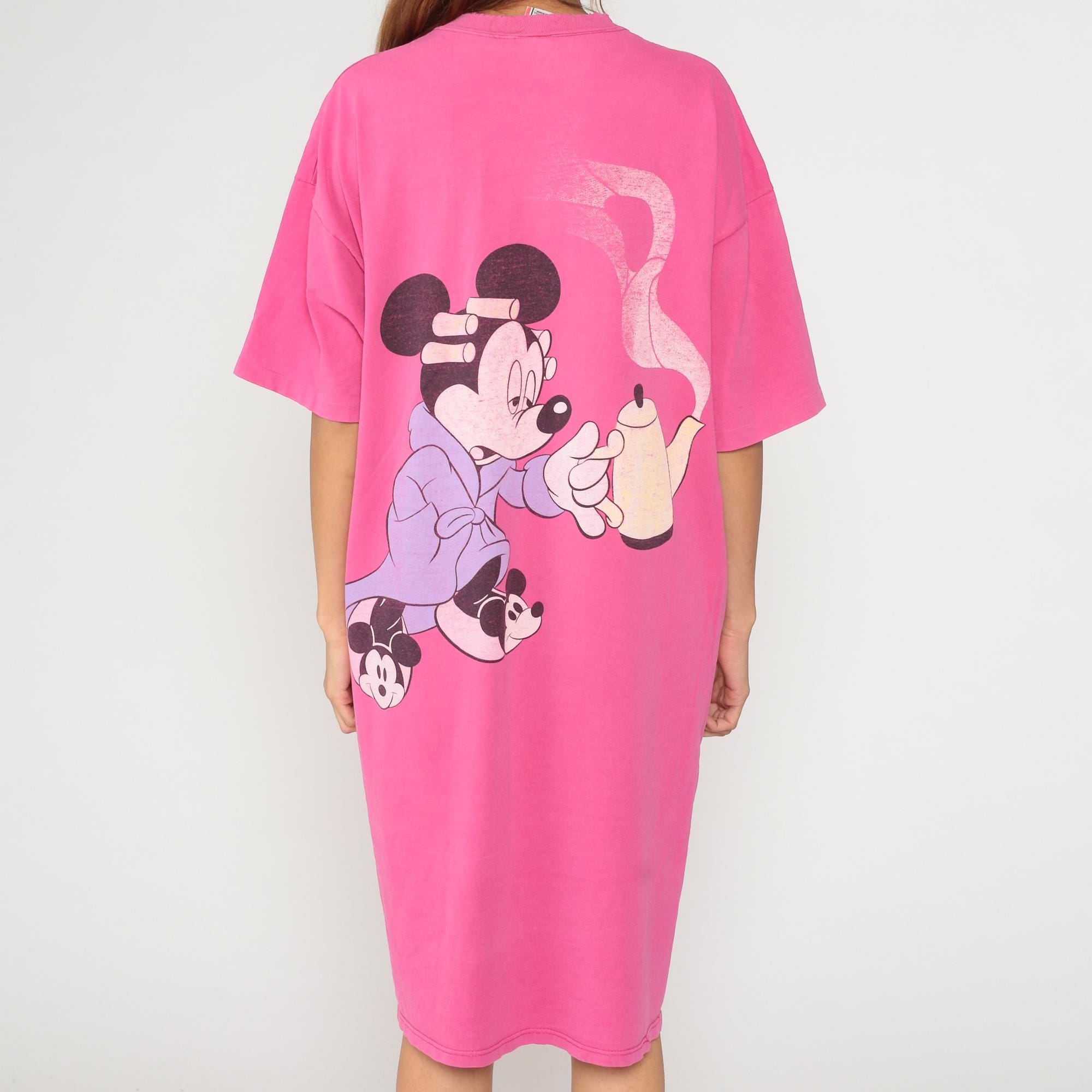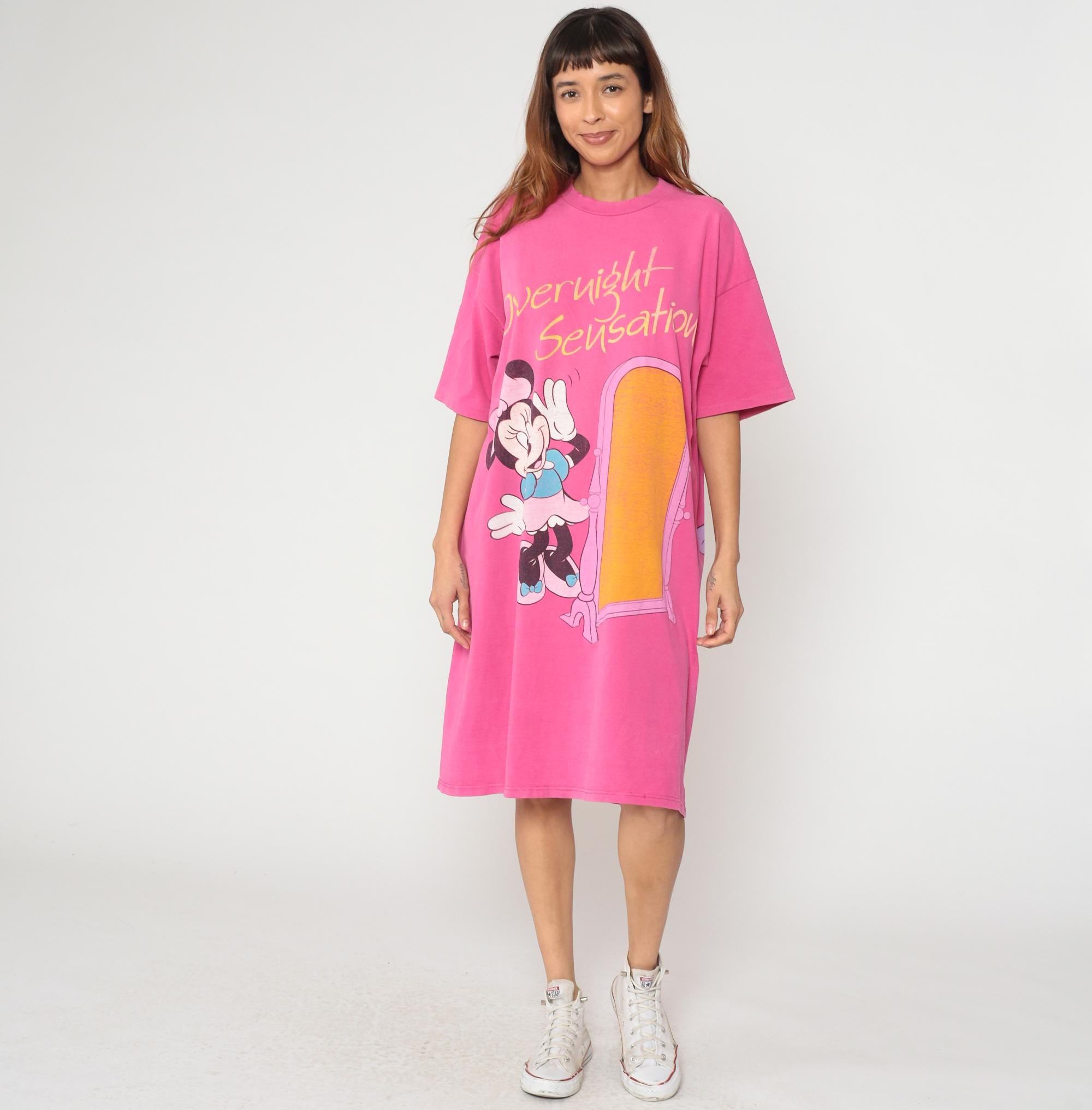 90s hot pink Minnie Mouse nightshirt from Disney Designs with graphic print on front and back. Front features "Overnight Sensation" text with Minnie looking at a mirror, back shows Minnie in a purple robe with hair curlers and beauty accessories. Oversized t-shirt dress construction with short sleeves and crew neckline.