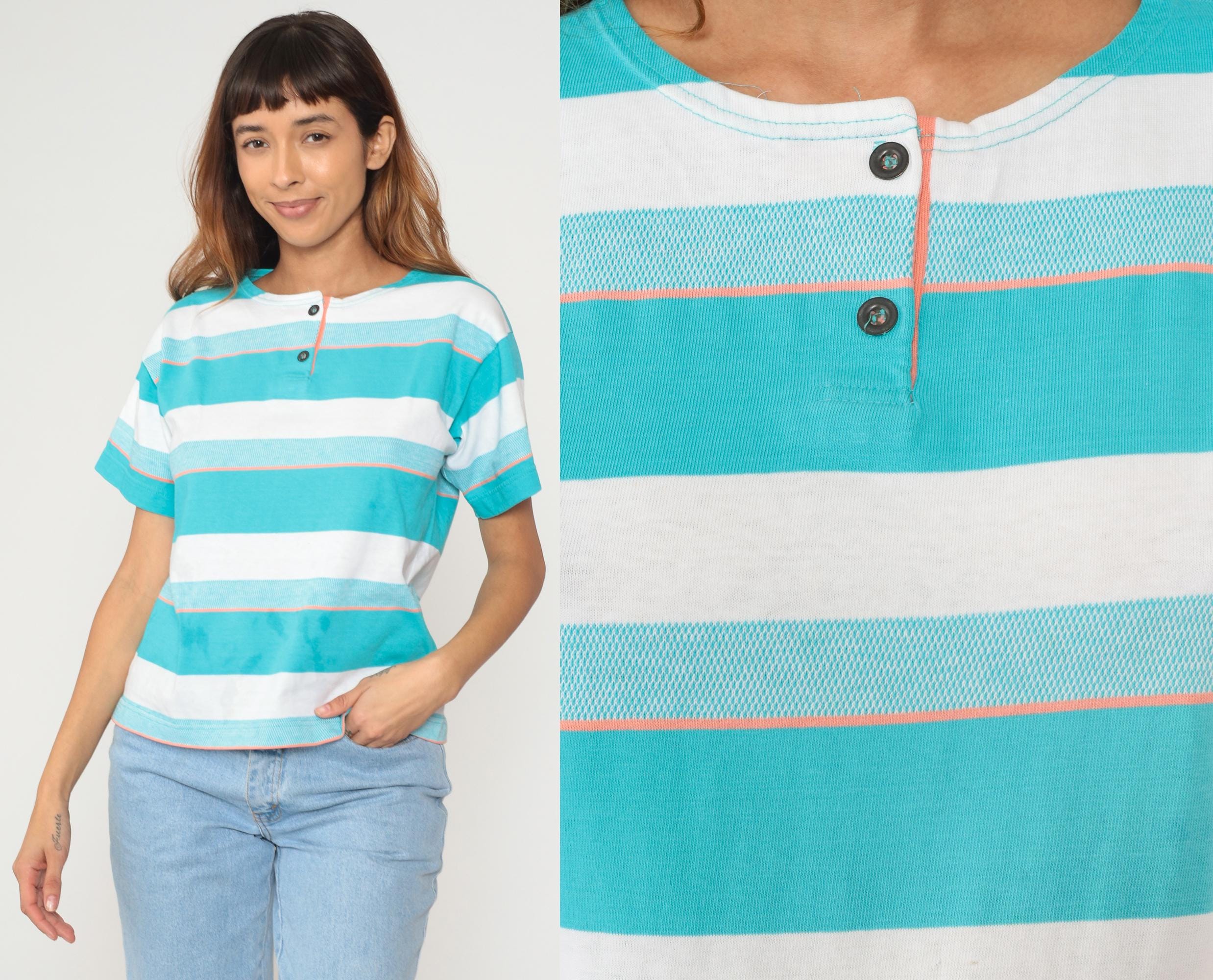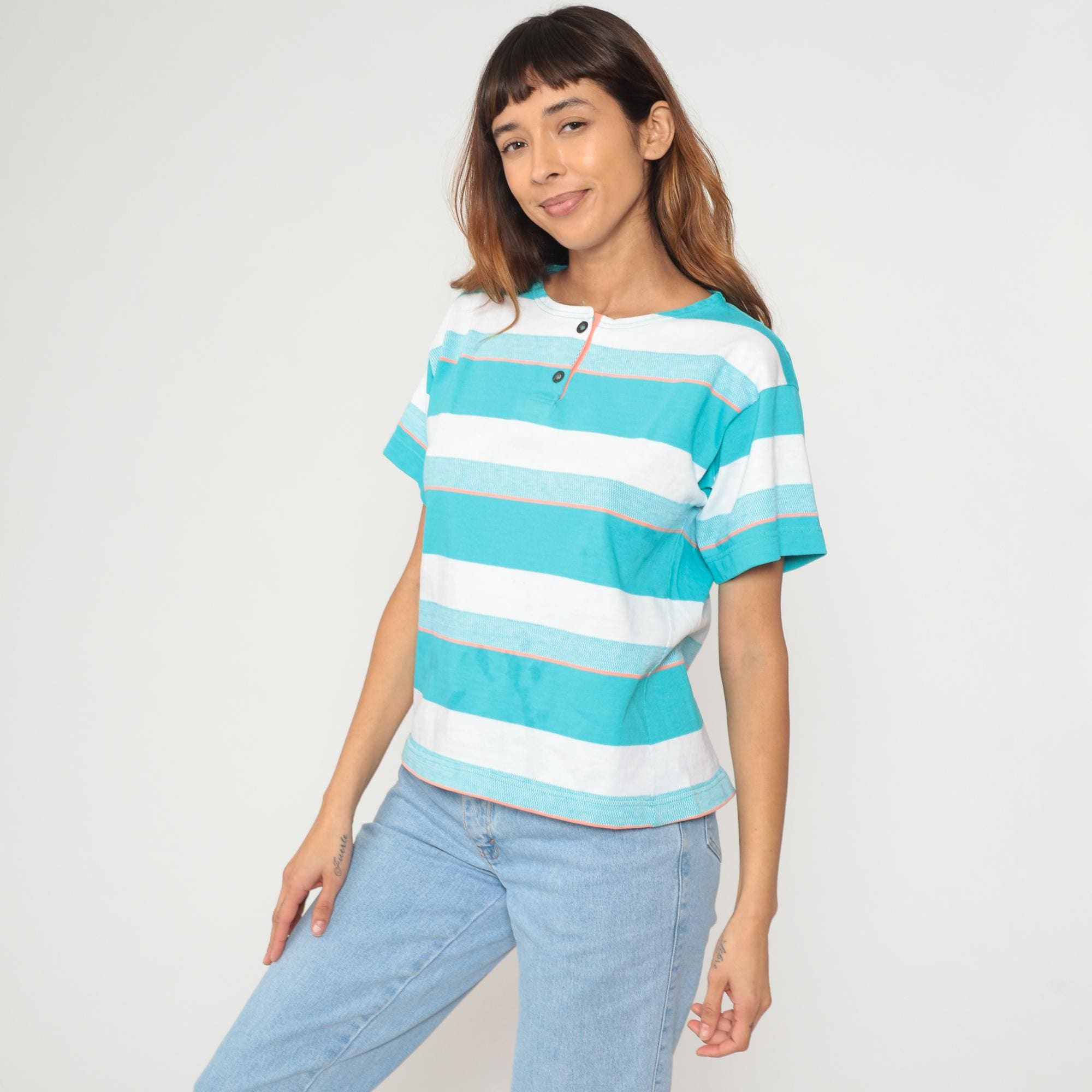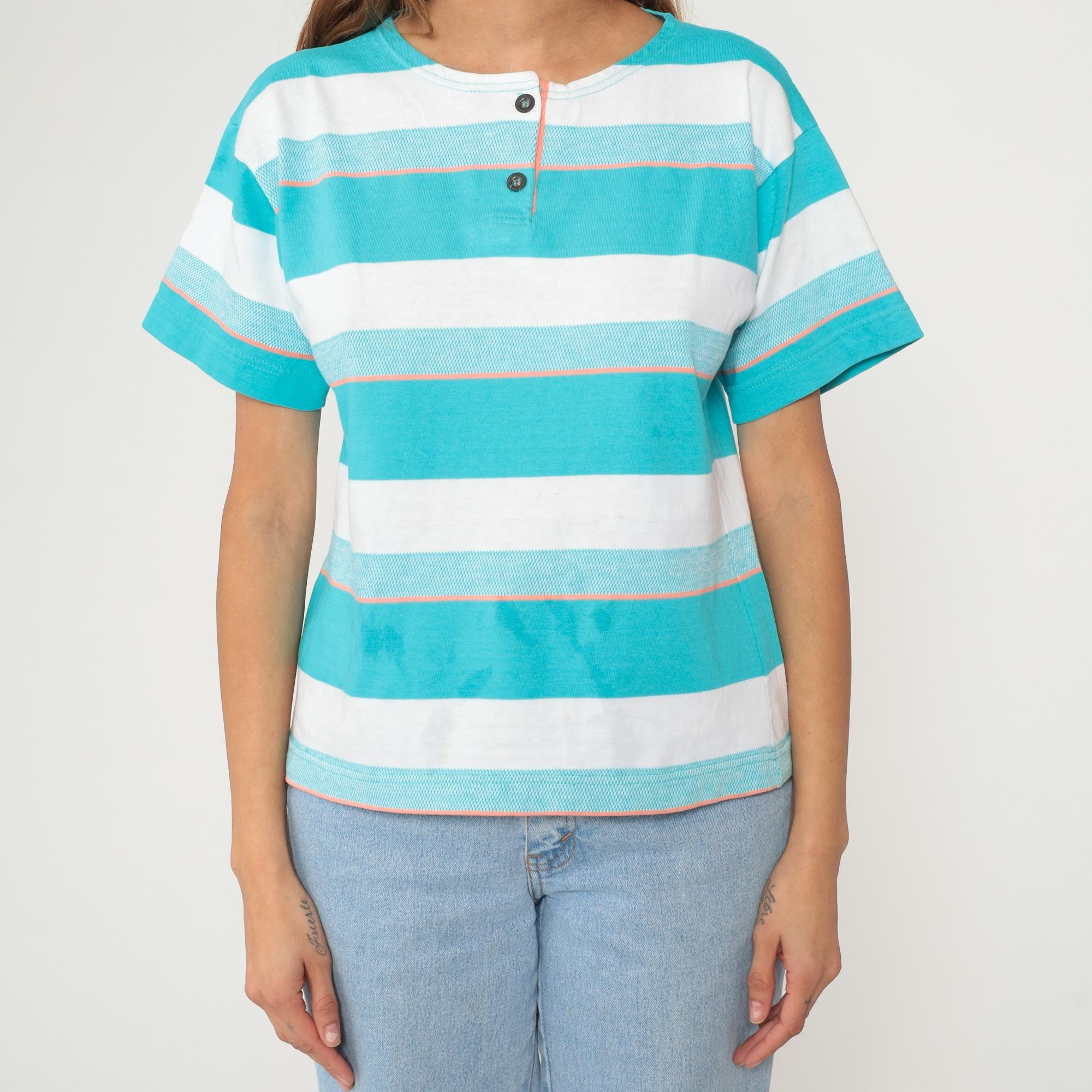 90s turquoise and white striped shirt from aileen with two-button henley neckline and short sleeves. Wide horizontal stripes in varying widths with thin orange pinstripes as accent lines throughout. Round collar and button placket at neck.