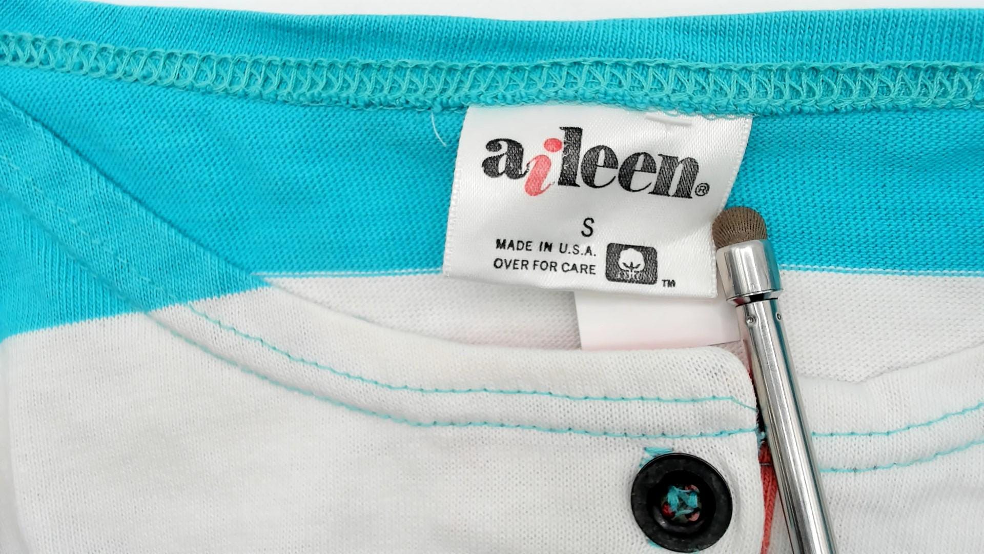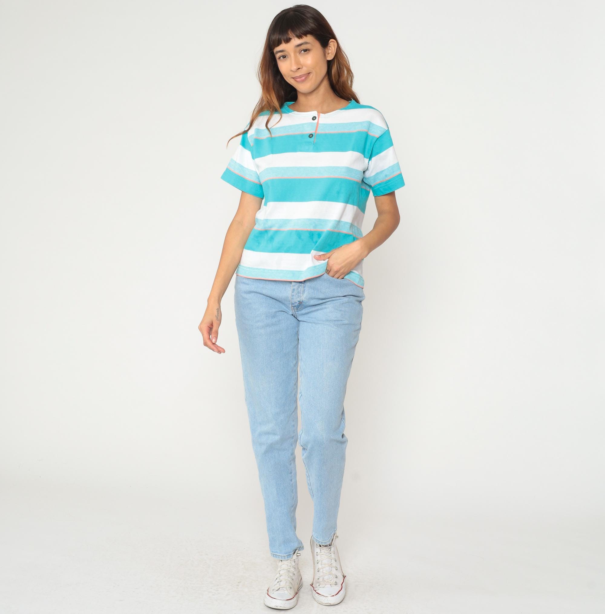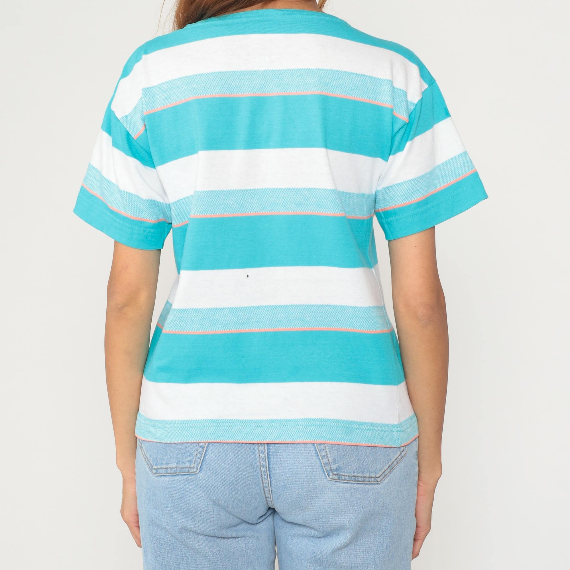 90s turquoise and white striped shirt from aileen with two-button henley neckline and short sleeves. Wide horizontal stripes in varying widths with thin orange pinstripes as accent lines throughout. Round collar and button placket at neck.