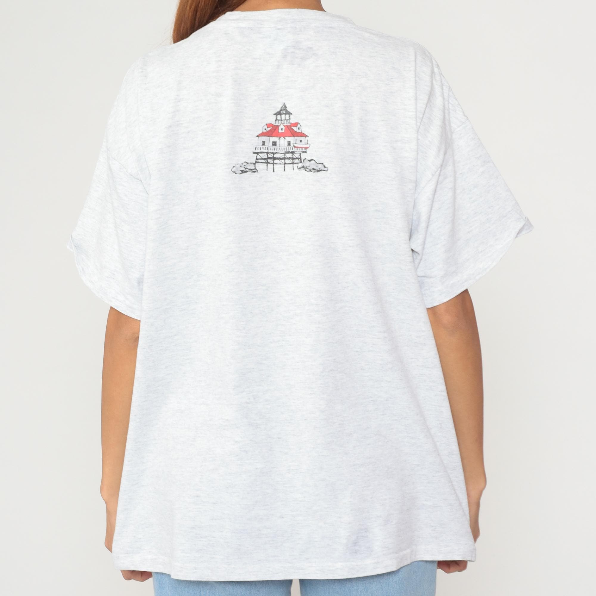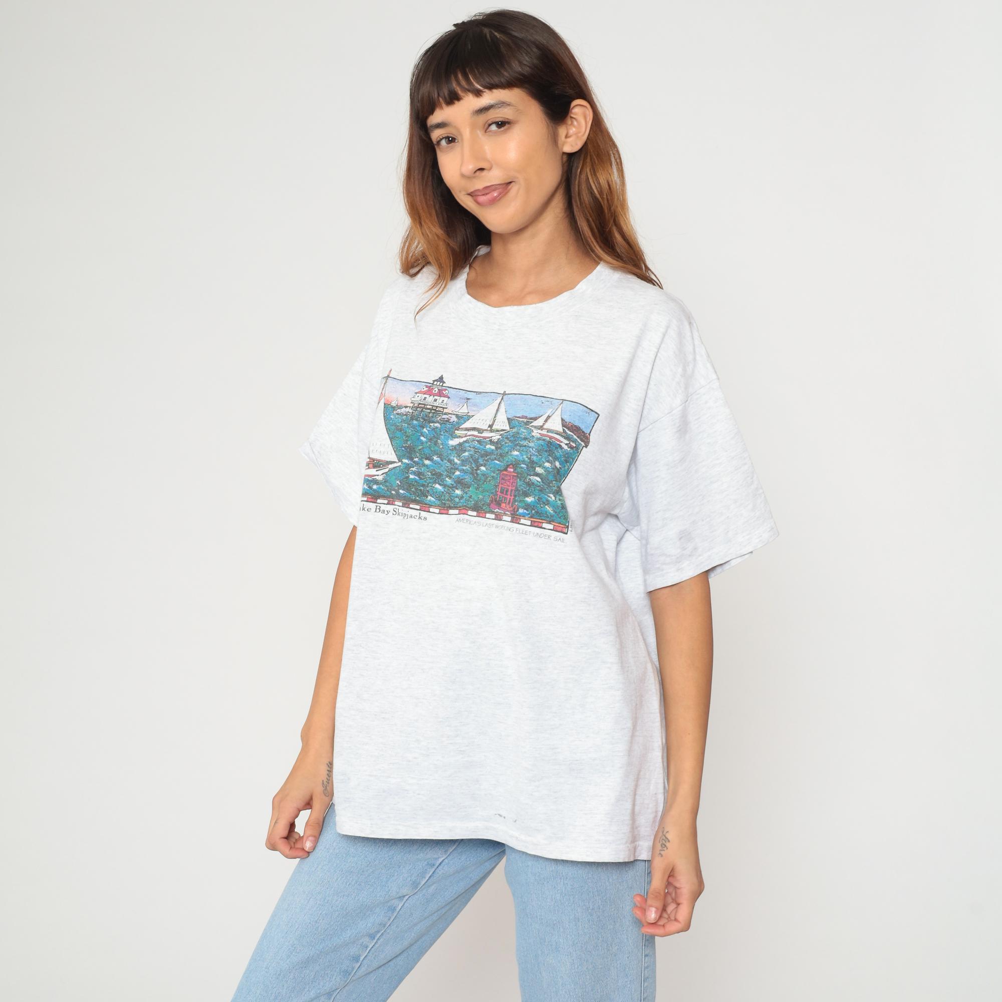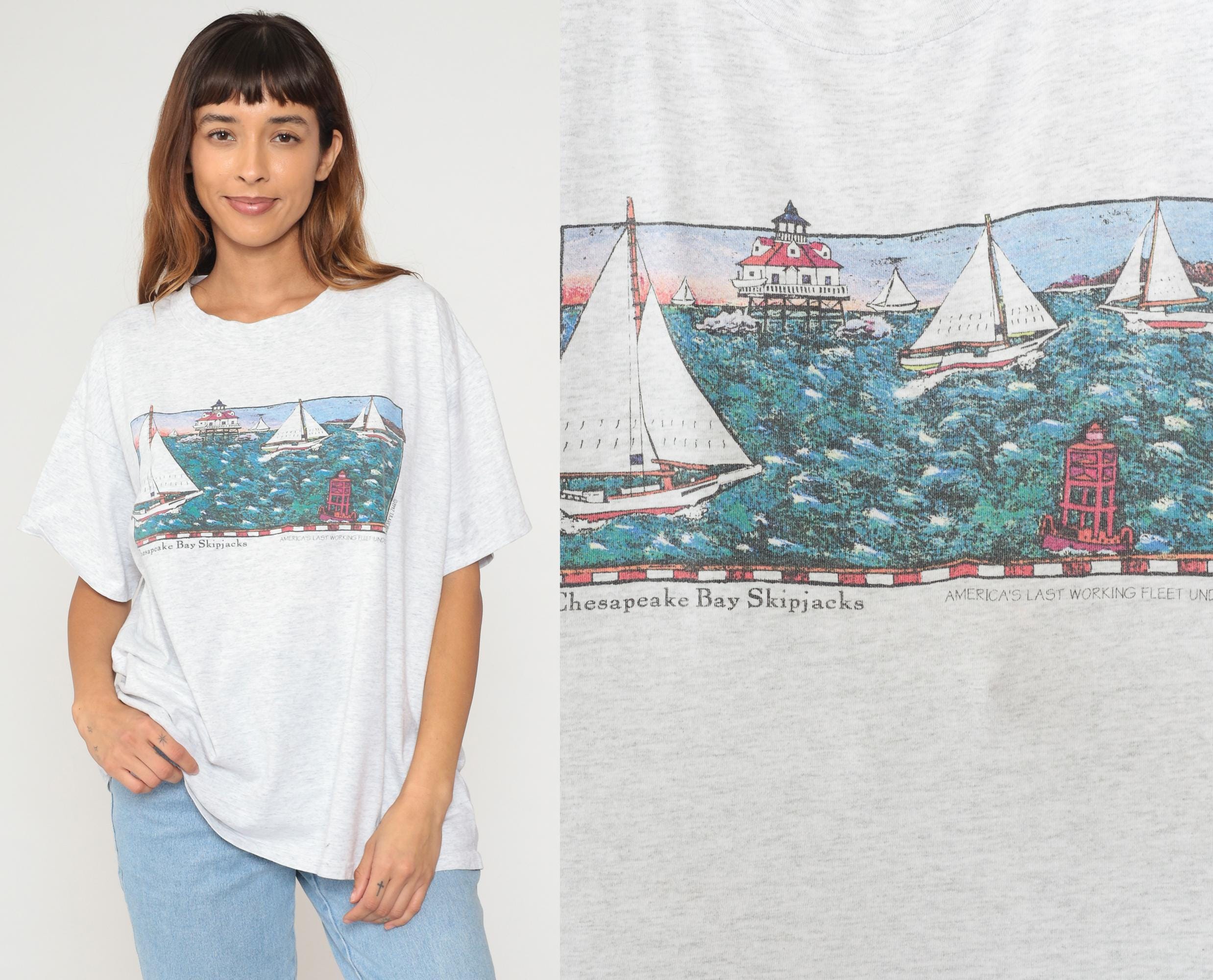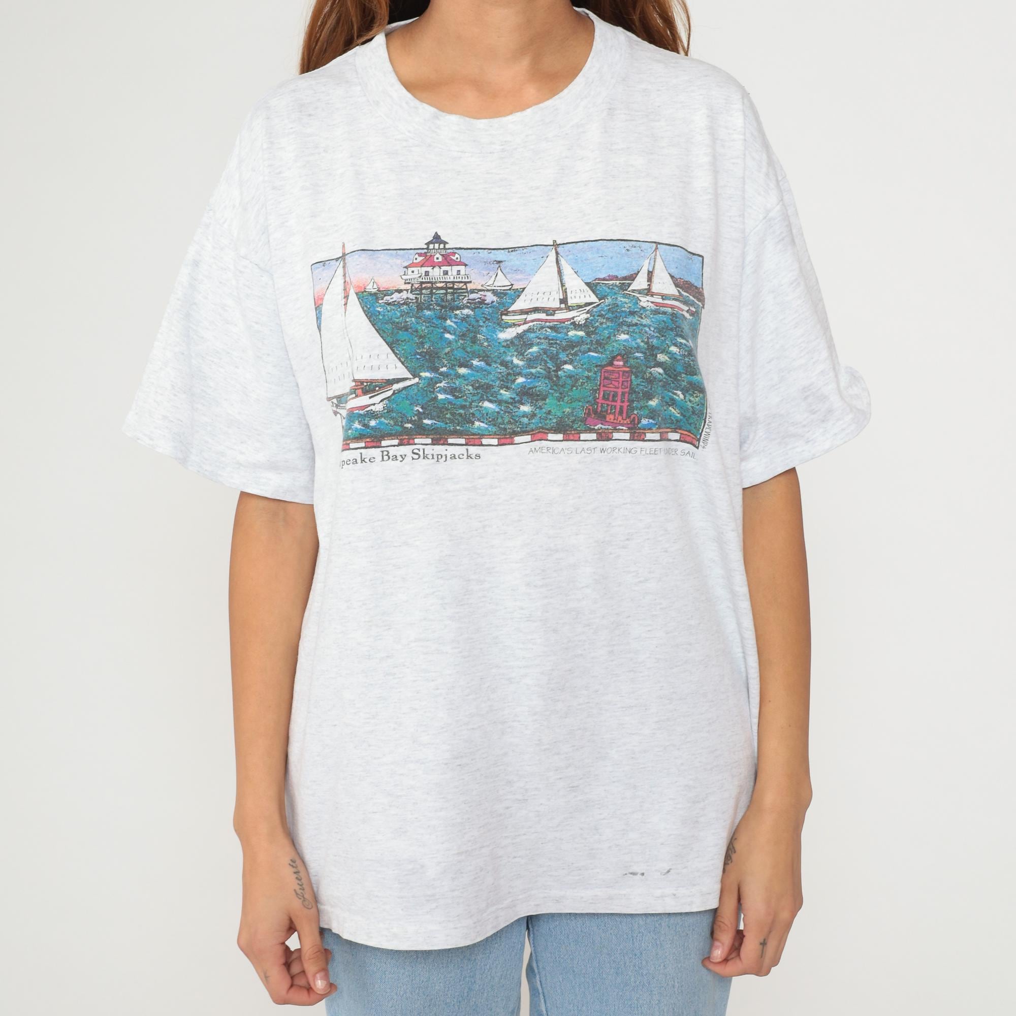 90s white heathered t-shirt from tradewinds with Chesapeake Bay Skipjacks graphic on front showing illustrated scene of sailboats, lighthouse with red roof, and buoy in teal water. Smaller lighthouse illustration on upper back. Crew neck and short sleeves in standard t-shirt construction.